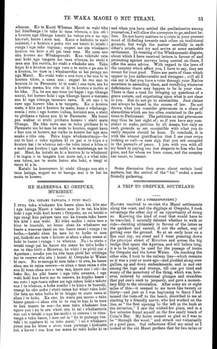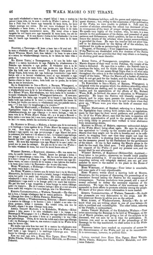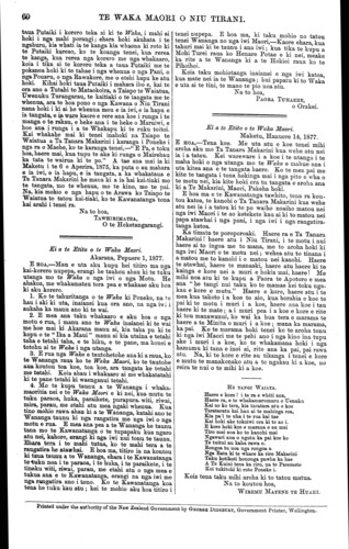 TE WAKA MAORI O NIU TIRANI. taua Putaiki i korero teka ai ki te Waka, i mahi ai hoki i nga mahi porangi; ehara hoki akuhata i te ngahuru, kia whati ia te kanga kia whaona ki roto ki te Putaiki kareao, ko te koanga tenei, kua rerea te kanga, kua rerea nga korero me nga whakaaro, koia i tika ai te korero teka a taua Putaiki me te pokanoa hoki ki te tahae i nga whenua o nga Pani, o nga Pouaru, o nga Rawakore, me o etehi hapu ke atu hoki. Kihai hoki taua Putaiki i mahara iho e, kai te ora ano a Tutahi te Mataokoira, a Taiapo te Waiatua, Uwenuku Turangarau, te kaitiaki o te tangata me te whenua, ara te hoa pono o nga Kawana o Niu Tirani nana hoki i ki ai he whenua mou e ia iwi, e ia hapu e ia tangata, e ia ware kaore e rere ana koe i runga i te manga o te rakau, e heke ana i te heke o Maruiwi, e hoe ana i runga i a te Whakapu ki te ruku toitoi. Kai whakahe mai ki tenei inahoki na Taiapo te Waiatua a Ta Tanara Makarini i karanga i Poneke i nga ra o Maehe, ko te karanga tenei,—" E Pa, e toku hoa, haere mai, kua tupu te ake ki runga o Mairehau ka tata te wairua ki te po." A tae ana mai ia ki Maketu i te 6 o Aperira, 1875, ka puta o au mahara e ia iwi, e ia hapu, e ia tangata, a ka whakataua e Ta Tanara Makarini he mana ki a ia hai kai-tiaki mo te tangata, mo te whenua, mo te kino, mo te pai. Na, kia mohio e nga hapu o te Arawa ko Taiapo te Waiatua to tatou kai-tiaki. ko te Kawanatanga tona kai arahi i tenei ra. Na to hoa, TAWHIRIMATEA, O te Heketangarangi. Ei a te Etita o te Waka Maori. Akarana, Pepuere 1, 1877. E HOA,—Mau e uta aku kupu hei titiro ma nga kai-korero nupepa, erangi he tauhou ahau ki te tuku utanga mo te Waka o nga iwi o nga Motu. He ahakoa, me whakamatau tera pea e whakaae aku hoa ki aku korero. 1. Ko te tahuritanga o te Waka ki Poneke, na te hau i aki ki uta, inaianei kua ora ano, na nga iwi i aukaha ka manu ano ki te wai. 2. E mea ana taku whakaaro e aku hoa o nga motu e rua, i manu ano te Waka inaianei ki te wai me hoe mai ki Akarana manu ai, kia taka pu ki te kopu o te " Ika a Maui " manu ai kia utaina e tetahi taha e tetahi taha, e te hiku, e te pane, ma konei e totohu ai te Waka i nga utanga. 3. E rua nga Waka e tautohetohe ana ki a raua, ko te Wananga raua ko te Waka Maori, ko te tautohe aua koutou toa koe, toa koe, ara tangata ke tetahi me tetahi. Koia ahau i whakaaro ai me whakatatahi ki te pane tetahi ki waenganui tetahi. 4. Mo te kupu taunu a te Wananga i whaka- maoritia nei e te Waka Maori e ki nei, kua mutu te tuku paraoa, huka, paraikete, purapura, witi, riwai, mira, parau, me etahi atu mea ngaki whenua. Kua tino mohio rawa ahau ki a te Wananga, katahi ano te Wananga taunu ki nga rangatira me nga iwi o nga motu e rua. E mea ana pea a te Wananga he taunu tana mo te Kawanatanga o te tupapaku kua ngaro atu nei, kahore, erangi ki nga iwi nui tonu te taunu. Ehara tera i te mahi tutua, ko te mahi tera a te rangatira he atawhai. E hoa ma, titiro ia na koutou ki tama taunu a te Wananga, ehara i te Kawanatanga te tuku noa i te paraoa, i te huka, i te paraikete, i te tinaku witi, riwai, parau, me etahi atu o nga mea e tukua ana e te Kawanatanga, erangi na nga iwi me nga rangatira ano i tono. Ko te Kawanatanga koa tena he tuku kau atu; kei te mohio aku hoa titiro i tenei nupepa. E hoa ma, ki taku mohio no tatou tenei Wananga no nga iwi Maori,—Kaore ehara, kua tahuri mai ki te taunu i ana iwi; kua tika te kupu a Mohi Turei raua ko Henare Potae e ki nei, meake ka rite a te Wananga ki a te Hokioi raua ko te Pihoihoi. Koia taku mohiotanga inaianei e nga iwi katoa, kua mate nei ia te Wananga; hui papatu ki to Waka e uta ai te tini, te mano te pio noa atu. Na to hoa, PAORA TUHAERE, o Orakei. Ki a te Etita o te Waka Maori. Maketu, Hanuere 14, 1877. E HOA,—Tena koe. Me uta atu e koe tenei mihi aroha aku mo Ta Tanara Makarini kua wehe atu nei ia i a tatou. Kei wareware i a koe i te utanga i te maha hoki o nga utanga mo te Waka e mahue ana i uta kitea ana e te tangata haere. Ko te mea pai me kite te tangata i tona hokinga mai i nga pito e wha o te motu nei, kia kite hoki era tu tangata e aroha ana ki a Te Makarini, Maori, Pakeha hoki, E hoa ma e te Kawanatanga tawhito, tena ra kou- tou katoa, te kanohi o Ta Tanara Makarini kua wehe atu nei ia i a tatou ki te po waiho noaiho matou nei nga iwi Maori i te ao ketekete kau ai ki to matou nei papa atawhai i nga pani, i nga iwi i nga rangatira- tanga katoa. Ka timata te poroporoaki. Haere ra e Ta Tanara Makarini! haere atu i Niu Tirani, i te motu i nui haere ai to ingoa me to mana, me to aroha hoki ki nga iwi Maori o te motu nei; wehea atu to tinana i a matou me to kanohi i o matou nei kanohi. Haere te atawhai, haere te manaaki, haere atu haere ki te kainga e kore nei a muri e hokia mai, haere! Me mihi noa atu ki te kupu a Paora te Apotoro e mea ana " he tangi nui taku ko te mamae kei toku nga- kau e kore e mutu." Haere e koro, haere atu i te mea kua takoto i a koe te aio, kua horahia e koe te pai ki te motu i muri i a koe, haere ana koe i tau haere ki te mate; a i muri pea i a koe e kore e rite ki tou manawanui, ko wai ka hua tera e marama te haere a te Minita o muri i a koe ; mana ka marama, ka pai. Ko te marama hoki tenei ko te aroha tonu ki nga iwi Maori me te pehi ano i nga kino ina tupu ake i muri i a koe, ko te whakamana hoki i nga hamumu ki tana e inoi ai, rite ana ka pai, pai rawa atu. Na, ki te kore e rite au tikanga i tenei e kore e mutu te manakonako atu a te ngakau ki a koe, no reira te nui o te mihi ki a koe. HE TANGI WAIATA. Haere e koro ! i te ra e whiti aua, Haere ra, e te whakamarumaru o Uenuku Kai ao ko tera, kia taratara atu e koe Tarataratu kai hau ai te mahinga roa, Kia pai te uha i te rua kai tae Kai hoki ake tokoiwi ora ki te ao i. E kore hoki koe e maraua e au mai Tiro mai ana ko to kanohi mai Ngawari ana o ngutu ka pai koe ko Te tuitui au kaha rawa e. Rongoa tu noa nga rongoa a Nga Rata ki te whare ka riro Makarini Taku kotikoti hononga pawha ka hae A Te Kuini tena ka riro, na te Paremete Koi tukituki ki roto 