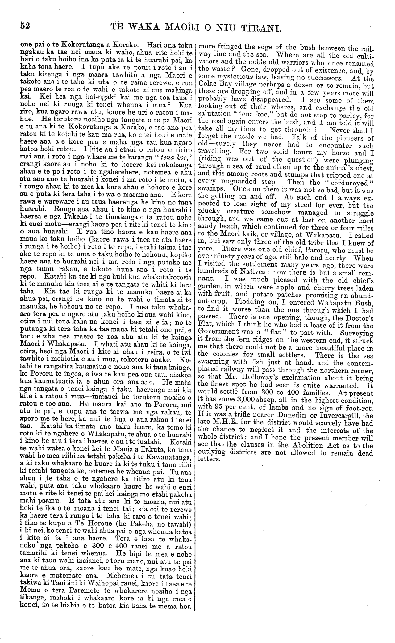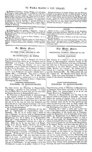 TE WAKA MAORI O NIU TIRANI. Ko RUTENE te UAMOTU, o Orutua, Waiapu, a ki mai ana ko te Wananga e tukua noatia ana ki a ia, kaore ia e pai ana; kaua e puta ki a ia tena nupepa; engari me tika atu ki ona tangata anake e pai ana, e hongi ana o ratou ihu ki ana korero. He nui te kino o ana korero mo te Makarini, ara o taua nupepa, a ko te ki tenei a Rutene mo taua nupepa, " O te kapu ano o te waewae tae noa ki te mahunga he patunga kautanga, he karawarawa, he whiunga, kua pirau ; kihai i takaia, kihai i horoia, kihai ano hoki i whakangawaritia ki te hinu."—Ihaia I Upoko, 6 Wharangi. HE TANGATA MATE. Ko TIPENE te POU, tino rangatira o Ngatinahe. I mate ki te Kohekohe, Waikato, i te 25 o Tihema, 1876, ona tau ka 67. He hoa piri pono ia ki a te Kuini mo ana ture—he tangata whakapono tonu ia. Ko HENARE WEETI. I mato ki Okete, Waikato, i te 5 o Hanuere, 1877, ona tau e 37. Ko HARATA NGAMAKO, tamahine aroha nui a Puihi Reihana Terewai, mokopuna hoki a Paora Tuhaere, rangatira o Ngati- whatua. I mate ki Taurewarewa, Waikato, i te 15 o Hanuere, 1877. TE WAKA MAORI. PO NEKE, TUREI, PEPUERE 27, 1877. TE POOTITANGA KI NEPIA. I TE Taitei, te 15 o nga ra o Pepuere nei, ka tu ki Nepia te pootitanga mema mo te Paremete, ara hei whakakapi i te turanga o Ta Tanara Makarini kua mate nei. Tokorima nga Pakeha i tu mai i taua pootitanga—ara, ko Tatana, ko Piukanana, ko Tipene, ko Rori, ko te Koroneho. Ko te Tatana te tangata i tino tu, e 23 te pahikatanga ake o nga pooti i riro i a ia i a te Piukanana ana pooti—inahoki 819 i a Tatana, 296 i a Piukanana. Nga pooti i a Tipene 123, i a te Koroneho 13 tonu. Ko te Rori, nana ano ia i whakamutu, i mahue noa i a ia te tauwhai- nga ki taua mahi. Hari ana te taone o Nepia katoa i te rongonga ku atu a Tatana. NIKORIMA TE RANGINOHOIHO. Ko tenei korero mo Nikorima te Ranginohoiho, o Taranaki, i panuitia ra tona matenga i te Nama 19 o te Waka Maori, he mea tuhi mai na toua tama, na Tamati Kaweora te Ranginohoiho, ara:—. Ko Nikorima te Ranginohoiho te whakamutunga o nga tangata tawhito o enei iwi o Taranaki. No mua atu ia i te taenga mai o Kapene Kuku ki tenei motu ; e maharatia ana e matou tera pea e tata atu ona tau ki te rua rau, ina hoki kua kaumatua noa atu ia ka kite ia i nga kaipuke timatanga i tae mai ki tenei motu—ko ta ratou ingoa mo taua mea i reira ai, ko te Tereatupaengaroa. He kaumatua rangatira a Nikorima, he toa ano hoki no Ngatihaumia no Ngatiruahine, hapu o Taranaki. He uri no te Aonui, nana i karihi te niho o Taranaki; he uri ano hoki no Tutepupurangi raua ko Ruakorero, tuku iho ki a Tuhakararo, ki a te Rangiirunga, ki a Tu te Raina, ki a Rangimahihi. Tana ope i haere timatanga ai ia, ko te ope a te Rangiirunga i Patupohue, tokorua ona i patu ai i reira. Muri iho ko te ope ano hoki a te Rangii- runga, ki te Ahoroa, Waipui, tokotoru ona tangata i reira. I reira ano hoki ia i te parekura i te Rewarewa, nana i hopu a Takarangi, rangatira o Ngamotu, he wahine tetehi. I pahure mai a Nikor- ima i te hinganga o Taranaki i te parekura i Tawhiri Keketai. E rua nga tao i tu ki a ia, na Whakataka tetahi, na Tihau tetahi. He tete tara whai, be mea puhi ki te kura. I werohia mai i tona tuara puta rawa i tona kopu, kaore ia i mate. Tera hoki tetahi ope nui ua Ngatiruanui, na Ngatiawa, i huaki ki tona pa ki Pukekohatu ; ko nga tangata o te pa kua riro katoa ki te mahi, ko ia anake i mahue ki te pa, RUTENE te UAMOTU, of Orutua, Waiapu, says the Wananga is posted to him against his will; he does not want it; let it be sent to those only to whom its words are welcome. He has read its vicious attacks upon the late Sir Donald McLean, and, he says, " From the sole of the foot even unto the head there is no soundness in it; but wounds, and bruises, and putrifying sores; they have not been closed, neither bound up, neither mollified with ointment."— Isaiah, i., 6. DEATHS. TIPENE TE Pou, a chief of Ngatinahe, at the Kohekohe, Waikato, on the 25th December, 1876, aged 67 years. He was a loyal subject of the Queen, a supporter of the law, and a con- sistent Christian. HENARE WEETI, at Okete, Waikato, on the 5th of January, 1S77, aged 37 years. HAEATA NGAMAKO, the much-loved daughter of Puihi Rei- hana Terewai, and grand-child of Paora Tuhaere, chief of Ngatiwhatua. She died at Taurewarewa, Waikato, on the 15th of January, 1877. THE WAKA MAORI. ——«.——. WELLINGTON, TUESDAY, FEBRUARY 27, 1877. NAPIER ELECTION. THE election of a member to fill the seat in the House of Representatives rendered vacant by the death of Sir Donald McLean took place on Thursday, the 15th day of February instant. There were five candidates in the field—Messrs. Sutton, Buchanan, Tiffen, Rhodes, and Colenso. Mr. Sutton was re- turned by a majority of 23—he having polled 319, and Mr. Buchanan 296. Mr. Tiffen polled 123, and Mr. Colenso 13. Mr. Rhodes retired from the con- test. There were great rejoicings in Napier on the result of the election becoming known. NIKORIMA TE RANGINOHOIHO. THE following notice of Nikorima te Ranginohoiho, of Taranaki, whose death was noted in No. 19 of the Waka Maori, was communicated to us by his son Tamati Kaweora te Rangmohoiho :— Nikorima te Ranginohoiho was the last of the ancient chiefs of the tribes of Taranaki. He lived before the coming of Captain Cook to this island; and we arc of opinion that he must have been nearly two hundred years old, for he was a grown-up man when the first ships were seen on these coasts—the name which was then given to them (the ships) was the Tereatupaengaroa (sailors of the horizon). Nikorima was a chief by birth, and a great war- rior of the Ngatihaumia and Ngaruahine hapus. Ho was a descendant of the Aonui, also of Tutepupu- rangi and Ruakorero, and of those later chiefs, Tuha- kararo, te Rangiirunga, Tu te Raina, and Rangima- hihi. The first war expedition in which he took a part was that under the Rangiirunga ai Patupohue, where he himself killed two men. The next expedi- tion which he joined was also led by the 