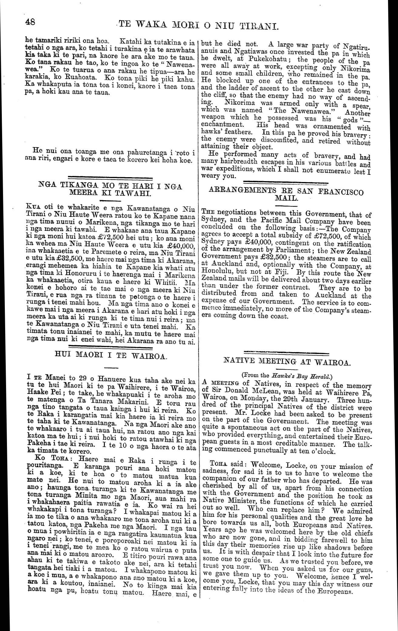 48 TE WAKA MORI O NIU TIRANI. he tamariki ririki ona hoa. Katahi ka tutakina e ia tetahi o nga ara, ko tetahi i turakina e ia te arawhata kia taka ki te pari, na kaore he ara ake mo te taua. Ko tana rakau he tao, ko te ingoa ko te " Nawena- wea." Ko te tuarua o ana rakau he tipua—ara he karakia, ko Ruahoata. Ko tona piki he piki kahu. Ka whakaputa ia tona toa i konei, kaore i taea tona pa, a hoki kau ana te taua. He nui ona toanga me ona pahuretanga i roto i ana riri, engari e kore e taea te korero kei hoha koe. NGA TIKANGA MO TE HARI I NGA MEERA KI TAWAHI. KUA oti te whakarite e nga Kawanatanga o Niu Tirani o Niu Haute Weera ratou ko te Kapane nana nga tima nunui o Marikena, nga tikanga mo te hari i nga meera ki tawahi. E whakaae ana taua Kapane ki nga moni hui katoa £'/2,500 hei utu; ko aua moni ka wehea ma Niu Haute Weera e utu kia £40,000, ina whakaaetia e te Paremete o reira, ma Niu Tirani e utu kia £32,500, me haere mai nga tima ki Akarana, erangi mehemea ka hiahia te Kapane kia whati atu nga tima ki Honoruru i te haerenga mai i Marikena ka whakaaetia, otira kaua e haere ki Whitii. Ma konei e hohoro ai te tae mai o nga meera ki Niu Tirani, e rua nga ra tinana te potonga o te haere i runga i tenei mahi hou. Ma nga tima ano o konei e kawe mai i nga meera i Akarana e hari atu hoki i nga meera ka uta ai ki runga ki te tima nui i reira; ma te Kawanatanga o Niu Tirani e uta tenei mahi. Ka timata tonu inaianei te mahi, ka mutu te haere mai nga tima nui ki enei wahi, hei Akarana ra ano tu ai. HUI MAORI I TE WAIROA. I TE Manei to 29 o Hanuere kua taha ake nei ka tu te hui Maori ki te pa Waihirere, i te Wairoa, Haake Pei; te take, he whakapuaki i te aroha mo te matenga o Ta Tanara Makarini. E toru rau nga tino tangata o taua kainga i hui ki reira. Ko te Raka i karangatia mai kia haere ia ki reira mo te taha ki te Kawanatanga. Na nga Maori ake ano te whakaaro i tu ai taua hui, na ratou ano nga kai katoa ma te hui; i nui hoki to ratou atawhai ki nga Pakeha i tae ki reira. I te 10 o nga haora o te ata ka timata te korero. Ko TOHA : Haere mai e Raka i runga i te pouritanga. E karanga pouri ana hoki matou ki a koe, ki te hoa o to matou matua kua mate nei. He nui to matou aroha ki a ia ake ano; haunga tona turanga ki te Kawanatanga me tona turanga Minita mo nga Maori, aua mahi ra i whakahaera paitia rawatia e ia. Ko wai ra hei whakakapi i tona turanga? I whakapai matou ki a ia mo te tika o ana whakaaro me tona aroha nui ki a tatou katoa, nga Pakeha me nga Maori. I nga tau o mua i powhiritia ia e nga rangatira kaumatua kua ngaro nei; ko tenei, e poroporoaki nei matou ki ia i tenei rangi, me te mea ko o ratou wairua e puta ana mai ki o matou aroaro. E titiro pouri rawa ana ahau ki te takiwa e takoto ake nei, ara ki tetahi tangata hei tiaki i a matou. I whakapono matou ki a koe i mua, a e whakapono ana ano matou ki a koe, ara ki a koutou, inaianei. No to kiinga mai kia hoatu nga pu, hoatu tonu matou. Haere mai, e but he died not. A large war party of Ngatiru- anuis and Ngatiawas once invested the pa in which he dwelt, at Pukekohatu; the people of the pa were all away at work, excepting only Nikorima and some small children, who remained in the pa. He blocked up one of the entrances to the pa, and the ladder of ascent to the other he cast down the cliff, so that the enemy had no way of ascend- ing. Nikorima was armed only with a spear, which was named "The Nawenawea." Another weapon which he possessed was his " gods "— enchantment. His head was ornamented with hawks' feathers. In this pa he proved his bravery: the enemy were discomfited, and retired without attaining their object. He performed many acts of bravery, and had many hairbreadth escapes in his various battles and war expeditions, which I shall not enumerate lest I weary you. \_\_\_\_\_\_\_\_\_\_\_\_\_\_\_\_ ARRANGEMENTS RE SAN FRANCISCO MAIL. THE negotiations between this Government, that of Sydney, and the Pacific Mail Company have been concluded on the following basis:—The Company agrees to accept a total subsidy of £72,500, of which Sydney pays £40,000, contingent on the ratification of the arrangement by Parliament; the New Zealand Government pays £32,500; the steamers are to call at Auckland and, optionally with the Company, at Honolulu, but not at Fiji. By this route the New Zealand mails will be delivered about two days earlier than under the former contract. They are to be distributed from and taken to Auckland at the expense of our Government. The service is to com- mence immediately, no more of the Company's steam- ers coming down the coast. NATIVE MEETING AT WAIROA. (From the Hawke's Bay Herald.) A MEETING of Natives, in respect of the memory of Sir Donald McLean, was held at Waihirere Pa, Wairoa, on Monday, the 29th January. Three hun- dred of the principal Natives of the district were present. Mr. Locke had been asked to be present on the part of the Government. The meeting was quite a spontaneous act on the part of the Natives, who provided everything, and entertained their Euro- pean guests in a most creditable manner. The talk- ing commenced punctually at ten o'clock. TOHA said: Welcome, Locke, on your mission of sadness, for sad it is to us to have to welcome the companion of our father who has departed. He was cherished by all of us, apart from his connection with the Government and the position he took as Native Minister, the functions of which he carried out so well. Who can replace him ? We admired him for his personal qualities and the great love he bore towards us all, both Europeans and Natives. Tears ago he was welcomed here by the old chiefs who are now gone, and in bidding farewell to him this day their memories rise up like shadows before us. It is with despair that I look into the future for some one to guide us. As we trusted yon before, we trust you now. When you asked us for our guns, we gave them up to you. Welcome, hence I wel- come you, Locke, that you may this day witness our entering fully in