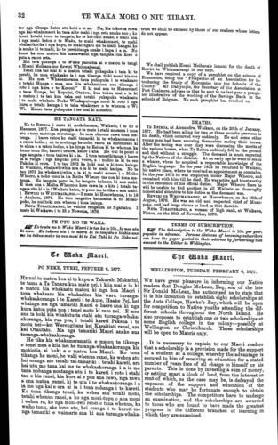 32 TE WAKA MORI O NIU TIRANI. mo nga tikanga katoa atu hoki o te ao. Na, kia tokorua rawa nga kai-whakamaori ka taea ai te mahi i nga reta anake ano; ko tenei, kotahi tonu te tangata, ko te kai-tuhi anake, e mahi ana i nga mahi katoa o te Waka, te mahi whakamaori, te mahi whakatikatika i nga kupu, te mahi ngaro me te mahi hangai, ko ia anake ki te mahi, ko te perehitanga anake i hapa i a ia. No konei ka mea matou kia manawanui nga tangata ina kore e puta a ratou reta. Hei tera putanga o te Waka panuitia ai e matou te tangi a Hoani Meihana mo Rewiri Whiumairangi. Tenei kua tae mai ki a matou tetahi pukapuka i taia ki te perehi, he mea whakaako ia i nga tikanga tiaki moni kia toe ai. He mea " Whakamarama taua pukapuka i te whakaaro a tetahi Hunga e mea ana kia whakaakona aua tikanga i roto i nga kura o te Koroni." E ki mai ana te Hekeretari o taua Hunga, kei Koputai, Otakou, kua tukua mai e ia ki a matou i te tau kua taha nei tetahi pukapuka whakaatu i te mahi whakatu Peeke Whakaputunga moni ki roto i nga kura o tetahi kainga i te taha whakararo o te whenua o Wi Wi. Kaore taua pukapuka i tae mai ki a matou. HE TANGATA MATE. Ko te REIROA i mate ki Arekehanara, Waikato, i te 20 o Hanuere, 1877. Kua paangia ia e te mate i etahi marama i mua atu o tona matenga rawatanga—he mea ohorere rawa tona ma- tenga. I haere ratou ko etahi tamariki ki te whakaomaoma i a ratou hoiho; no te mutunga ka noho ratou ka korerorero ki te ahua o a ratou hoiho, a ka hinga te Reiroa ki te whenua, ka hemo tonu iho, kaore i oraora, kaore i aha. He nui te pouri o nga tangata o tona takiwa ki a ia. I tona tamarikitanga i haere ia ki runga i nga kaipuke patu weera, a i mohio ia ki te reo Pakeha ki reira. I te tau 1872 ka hoki mai ia ki tona kainga ki Waikato, whakawhiwhia ana a ia ki te mahi katipa. No te tau 1873 ka whakawhiwhia a ia ki te mahi aorere i a Meiha Wheoro, a noho tonu ia i a Meiha Wheoro tae noa ki tona ma- tenga. He tangata pono ia, he tangata kakama ki ana mahi. E mea ana a Meiha Wheoro e kore rawa ia e kite i tetahi ta- ngata rite ki a ia i Waikato katoa, te pono me te tika o ana mahi. REWIRI te WHIUMAIRANGI.—I mate ki Horowhenua, i te 18 o Akuhata, 1876. He tino rangatira kaumatua ia no Muau- poko, he nui hoki ona whenua i taua kainga. NETA TORAITERANGI, he wahine rangatira no Ngaitahu. I mate ki Waikawa i te 25 o Nowema, 1876. TE UTU MO TE WAKA. Ko te utu mo te Waka Maori i te tau ka te 10s., he mea utu ki mua. Ka tukuna atu i te meera ki te tangata e hiahia ana me ka tukua mai e ia aua moni ki te Kai Tuhi ki Po Neke nei. TE WAKA MAORI. PO NEKE, TUREI, PEPUERE 6, 1877. HE nui to matou koa ki te kupu a Takurahi Makarini, te tama a Ta Tanara kua mate nei, i kiia mai e ia ki a matou kia whakaatu matou ki nga hoa Maori i tona whakaaro kia whakaritea kia waru turanga- whakaakoranga i te Kareti i te Aute, Haake Pei, hei whainga ma nga tamariki Maori e haere ana ki nga kura katoa puta noa i tenei motu ki raro nei. E mea ana ia hoki kia whakaturia etahi atu turanga-whaka- akoranga, kia rua pea, i tetahi kareti Pakeha i te motu nei—kei Werengitana kei Karaitiati ranei, ara kei Otautahi. Ma nga tamariki Maori anake aua turanga-whakaakoranga. He tika kia whakamaramatia e matou te tikanga o tenei mea e kiia nei he turanga-whakaakoranga, kia mohiotia ai hoki e o matou hoa Maori. Ko tona tikanga he moni, he wahi whenua ranei, ka wehea atu hei oranga mo tetahi tai-tamariki i tetahi kareti, ara hei utu mo tana kai me te whakaakoranga i a ia me tana nohanga noatanga atu i te kareti i roto i etahi tau e hia ranei, kia kore ai e pau ana rawa, nga rawa a ona matua ranei, ki te utu i te whakaakoranga i a ia me nga kai e ora ai ia i tona nohanga i te kareti. Ko tona tikanga tenei, ka wehea atu tetahi moni, tetahi whenua ranei, a ko nga moni-tupu o aua moni i wehea ra, ko nga moni-reti ranei o taua whenua, ka waiho tonu, ake tonu atu, hei oranga i te kareti mo nga tamariki e waimarie ana ki aua turanga-whaka- trust we shall be excused by those of our readers whose letters do not appear. We shall publish Hoani Meihana's lament for the death of Rewiri te Whiumairangi in our next. We have received a copy of a pamphlet on the science of Economics, being the " Prospectus of an Association for in- troducing the Study of Economics into the Schools of the Colony." Mr Dalrymple, the Secretary of the Association at Port Chalmers, advises us that he sent to us last year a pamph- let illustrative of the working of the Savings Bank in the schools of Belgium. No such pamphlet has reached us. DEATHS. TE REIROA, at Alexandra, Waikato, on the 20th of January, 1877. He had been ailing for two or three months previous to his death, which occurred very suddenly. He and some other young men had been amusing themselves racing their horses. After the racing was over they were discussing the merits of the various horses, when Te Reiroa suddenly fell to the ground and died without a struggle. The deceased is much regretted by the Natives of the district. At an early age he went to sea in a whaler, where he acquired a respectable knowledge of the English language. In the year 3872 he returned to Waikato, his native place, where he received an appointment as constable. In the year 1873 he was employed under Major Wheoro, and remained with him till he died. He was active and trustworthy in the execution of his offcial duties. Major Wheoro fears he will be unable to find another in all Waikato so thoroughly honest and attentive to his duties as the deceased was. REWIRI TE WHIUMAIRANGI, at Horowhenua, on the 18th of August, 1876. He was an old and respected chief of Muau- poko, and had large claims to land in that district. NETA TORAITERANGI, a woman of high rank, at Waikawa, Picton, on the 25th of November, 1876. TERMS OF SUBSCRIPTION. The Subscription to the Waka Maori is 10s. per year, payable in advance. Persons desirous of becoming subscribers can have the paper posted to their address by forwarding that amount to the Editor in Wellington. THE