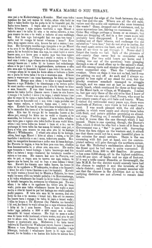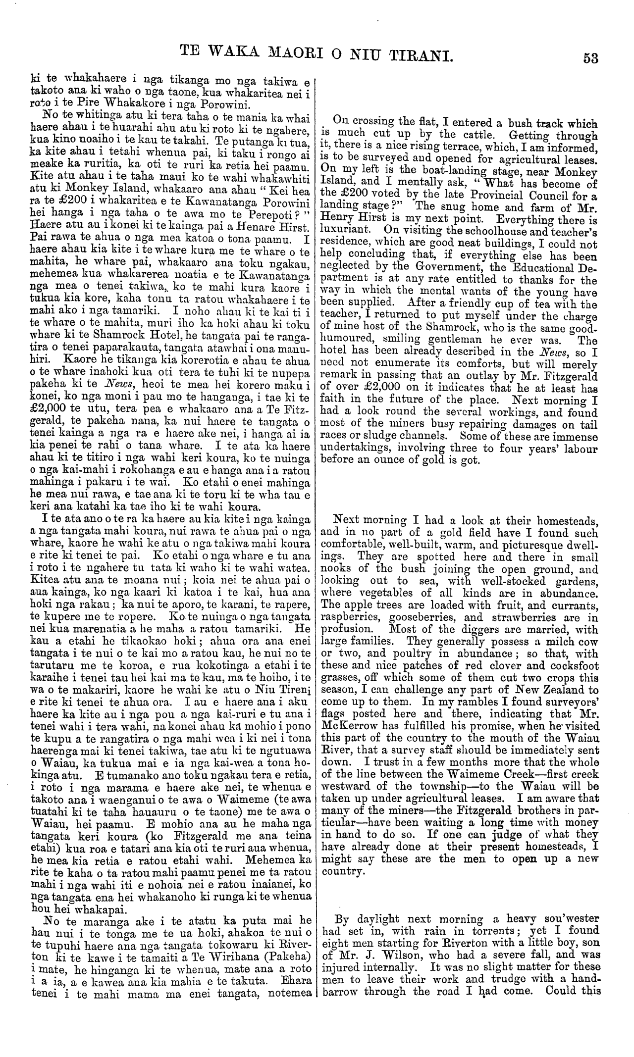 TE WAKA MAORI O NIU TIRANI. ki te whakahaere i nga tikanga mo nga takiwa e takoto ana ki waho o nga taone, kua whakaritea nei i roto i te Pire Whakakore i nga Porowini. No te whitinga atu ki tera taha o te mania ka whai haere ahau i te huarahi ahu atu ki roto ki te ngahere, kua kino noaiho i te kau te takahi. Te putanga ki tua, ka kite ahau i tetahi whenua pai, ki taku i rongo ai meake ka ruritia, ka oti te ruri ka retia hei paamu. Kite atu ahau i te taha maui ko te wahi whakawhiti atu ki Monkey Island, whakaaro aua ahau " Kei hea ra te £200 i whakaritea e te Kawanatanga Porowini hei hanga i nga taha o te awa mo te Perepoti ? " Haere atu au i konei ki te kainga pai a Henare Hirst. Pai rawa te ahua o nga mea katoa o tona paamu. I haere ahau kia kite i te whare kura me te whare o te mahita, he whare pai, whakaaro ana toku ngakau, mehemea kua whakarerea noatia e te Kawanatanga nga mea o tenei takiwa, ko te mahi kura kaore i tukua kia kore, kaha tonu ta ratou whakahaere i te mahi ako i nga tamariki. I noho ahau ki te kai ti i te whare o te mahita, muri iho ka hoki ahau ki toku whare ki te Shamrock Hotel, he tangata pai te ranga- tira o tenei paparakauta, tangata atawhai i ona manu- hiri. Kaore he tikanga kia korerotia e ahau te ahua o te whare inahoki kua oti tera te tuhi ki te nupepa pakeha ki te News, heoi te mea hei korero maku i konei, ko nga moni i pau mo te hanganga, i tae ki te £2,000 te utu, tera pea e whakaaro ana a Te Fitz- gerald, te pakeha nana, ka nui haere te tangata o tenei kainga a nga ra e haere ake nei, i hanga ai ia kia penei te rahi o tana whare. I te ata ka haere ahau ki te titiro i nga wahi keri koura, ko te nuinga o nga kai-mahi i rokohanga e au e hanga ana i a ratou mahinga i pakaru i te wai. Ko etahi o enei mahinga he mea nui rawa, e tae ana ki te toru ki te wha tau e keri ana katahi ka tae iho ki te wahi koura. I te ata ano o te ra ka haere au kia kite i nga kainga a nga tangata mahi koura, nui rawa te ahua pai o nga whare, kaore he wahi ke atu o nga takiwa mahi koura e rite ki tenei te pai. Ko etahi o nga whare e tu ana i roto i te ngahere tu tata ki waho ki te wahi watea. Kitea atu ana te moana nui koia nei te ahua pai o aua kainga, ko nga kaari ki katoa i te kai, hua ana hoki nga rakau ; ka nui te aporo, te karani, te rapere, te kupere me te ropere. Ko te nuinga o nga tangata nei kua marenatia a he maha a ratou tamariki. He kau a etahi he tikaokao hoki; ahua ora ana enei tangata i te nui o te kai mo a ratou kau, he nui no te tarutaru me te koroa, e rua kokotinga a etahi i te karaihe i tenei tau hei kai ma te kau, ma te hoiho, i te wa o te makariri, kaore he wahi ke atu o Niu Tireni e rite ki tenei te ahua ora. I au e haere ana i aku haere ka kite au i nga pou a nga kai-ruri e tu ana i tenei wahi i tera wahi, na konei ahau ka mohio i pono te kupu a te rangatira o nga mahi wea i ki nei i tona haerenga mai ki tenei takiwa, tae atu ki te ngutuawa o Waiau, ka tukua mai e ia nga kai-wea a tona ho- kinga atu. E tumanako ano toku ngakau tera e retia, i roto i nga marama e haere ake nei, te whenua e takoto ana i waenganui o te awa o Waimeme (te awa tuatahi ki te taha hauauru o te taone) me te awa o Waiau, hei paamu. E mohio ana au he maha nga tangata keri koura (ko Fitzgerald rae ana teina etahi) kua roa e tatari ana kia oti te ruri aua whenua, he mea kia retia e ratou etahi wahi. Mehemea ka rite te kaha o ta ratou mahi paamu penei me ta ratou mahi i nga wahi iti e nohoia nei e ratou inaianei, ko nga tangata ena hei whakanoho ki runga ki te whenua hou hei whakapai. No te maranga ake i te atatu ka puta mai ne hau nui i te tonga me te ua hoki, ahakoa te nui o te tupuhi haere ana nga tangata tokowaru ki River- ton ki te kawe i te tamaiti a Te Wirihana (Pakeha) i mate, he hinganga ki te whenua, mate ana a roto i a ia, a e kawea ana kia mahia e te takuta. Ehara tenei i te mahi mama ma enei tangata, notemea On crossing the flat, I entered a bush track which is much cut up by the cattle. Getting through it, there is a nice rising terrace, which, I am informed, is to be surveyed and opened for agricultural leases. On my left is the boat-landing stage, near Monkey Island, and I mentally ask, " What has become of the £200 voted by the late Provincial Council for a landing stage ?" The snug home and farm of Mr. Henry Hirst is my next point. Everything there is luxuriant. On visiting the schoolhouse and teacher's residence, which are good neat buildings, I could not help concluding that, if everything else has been neglected by the Government, the Educational De- partment is at any rate entitled to thanks for the way in which the mental wants of the young have been supplied. After a friendly cup of tea with the teacher, I returned to put myself under the charge of mine host of the Shamrock, who is the same good- humoured, smiling gentleman he ever was. The hotel has been already described in the News, so I need not enumerate its comforts, but will merely remark in passing that an outlay by Mr. Fitzgerald of over £2,000 on it indicates that he at least has faith in the future of the place. Next morning I bad a look round the several workings, and found most of the miners busy repairing damages on tail races or sludge channels. Some of these are immense undertakings, involving three to four years' labour before an ounce of gold is got. Next morning I had a look at their homesteads, and in no part of a gold field have I found such comfortable, well-built, warm, and picturesque dwell- ings. They are spotted here and there in small nooks of the bush joining the open ground, and looking out to sea, with well-stocked gardens, where vegetables of all kinds are in abundance. The apple trees are loaded with fruit, and currants, raspberries, gooseberries, and strawberries are in profusion. Most of the diggers are married, with large families. They generally possess a milch cow or two, and poultry in abundance; so that, with these and nice patches of red clover and cocksfoot grasses, off whi