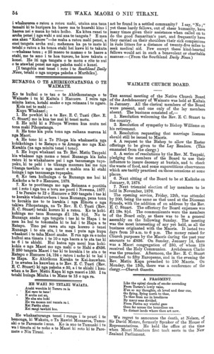 54 TE WAKA MAORI O NIU TIRANI. i whakarerea e ratou a ratou mahi, utaina ana taua tamaiti ki te huripara ka haere ma te huarahi kino i haerea nei e maua ko taku hoiho. Ka kitea ranei te aroha penei i nga wahi e nui ana te tangata ? E mea ana ahau " Kahore "—he maha a ratou mahi penei, a enei tangata aroha nui; mehemea ka pa te mate ki tetahi o ratou a ka tonoa etahi hei kawe ki te takuta —whakaae tonu ; e 25 maero te mamao o te haere a etahi, me te amo i te hoa turoro, he kore takuta o konei. He iti nga tangata o te motu e rite te nui o te atawhai penei me nga pakeha mahi o konei. [I tangohia mai tenei i roto i te Southland Daily News, tetahi o nga nupepa pakeha o Murihiku]. RUNANGA O TE AHIRIKONATANGA O TE WAIMATE. Ko te huihui o te tau o te Ahirikonatanga o te Waimate i tu ki Kaitaia i Hanuere. I reira nga minita katoa, kotahi anake o nga reimana i te ngaro. Koia nei te mahi:— Kupu Whakaari; 1. He powhiri ki a te Rev. E. C. Tuati (Rev. E. C. Stuart) mo ia kua tae mai ki tenei motu. 2. He mihi ki a Pihopa Wiremu kua mutu nei tona mahi Pihopatanga. 3. He tono kia puta tonu nga raihana marena ki nga Maori. 4. He tono ki a Te Pihopa kia whakaaetia nga kohikohinga i te Ratapu o te Aranga mo nga Kai- Karakia (na nga minita tenei i tono). 5. He kupu whakaari na Te Rev. Matiu Taupaki kia whakaae nga mema o tenei Runanga kia kaha ratou ki te whakahaere pai i nga tanumanga tupa- paku, ki te pehi i te tikanga maumau kai me nga tikanga tawhito o nga maori e mahia ana ki etahi kainga i nga tanumanga tupapaku. 6. Ko tera huihuinga o te Runanga me hui ki Kaikohe a te 9 o Hanuere, 1878. 7. Ko te pootitanga mo nga Reimana e pootitia nei i roto i nga tau e toru me pooti i Nowema, 1877. I te Paraire te 12 o Hanuere e 200 tangata i tae ki te karakia whakatuwhera i taua Runanga, pena tonu te karakia me to te karakia i nga Hinota o nga takiwa Pihopatanga, na Te Rev. E. C. Tuati (Rev. E. C. Stuart) tetahi korero ki a ratou. Ko te kohi- kohinga mo taua Runanga £1 19s. 8½d. No te Runanga anake nga tangata i tae ki te Hapa i te mea ka hui te tokomaha ki te kai i te Hapa a te Ratapu. Tino pai rawa atu nga korero o tenei Runanga i to era atu, i te mea i puta nga kupu whaakari i te taha Maori anake. E rua nga ra e noho huihui ana timata i te 10 o nga haora a te ata tae ki te 6 i te ahiahi. Hui katoa nga moni kua kohi- kohia e nga Maori mo nga mahi o te Hahi e £836. E 250 tangata Maori i tae ki te karakia i te ata o te Ratapu o Hanuere 14,124 e ratou i noho ki te kai i te Hapa. Ko Ahirikona Karaka te Kai-kauwhau. I te awatea ka kauwhau a te Rev. E. C. Tuati (Rev. E. C. Stuart) ki nga pakeha e 50, a i te ahiahi i kau- whau a te Rev. Matiu Kapa ki nga maori e 150. I tu tetahi huinga Minita i te Mane te 15 o nga ra. KE WAHI NO TETAHI WAIATA. Anahi werohia ki Tararu ra ia ' Kei raro te tane! • E aroha nei au, Me aha atu hoki He wa moana nui nanaia ra i. Kei Paritu ahau Kei rangi tawhiti koe. He whakaaturanga tenei i runga i te pouri i te hemonga, ki Wakatu, o Ta Rawiri Moanaroa, Tumu- aki o te Paremete i mua. Ko ia ano te Tumuaki i te wa i timata ai te noho a te Maori ki roto ki te Pare- mete o Niu Tirani. act be found in a settled community? I say, "No; yet these hardy fellows, out of sheer humanity, have many times given their assistance when called on to do the good Samaritan's part, and frequently have they carried on their shoulders their sick companions in rude litters for a distance of twenty-five miles to seek medical aid. Pew except these kind-hearted fellows would act in such a benevolent or charitable manner.—(From the Southland Daily News.) WAIMATE CHURCH BOARD. THE annual meeting of the Native Church Board of the Archdeaconry of Waimate was held at Kaitaia in January. All the clerical members of the Board were present, and one only of the lay members absent. The business consisted of,— 1. Resolution welcoming the Rev. E. C. Stuart to the country. 2. Resolution of sympathy to Bishop Williams on his retirement. 3. Resolution requesting that marriage licenses should still be issued to Maoris. 4. A request to the Bishop to allow the Easter offerings to be given to the Lay Readers. (This emanated from the clergy.) 5. A series of resolutions by the Rev. M. Taupaki, pledging the members of the Board to use their influence to insure decency at burials, and to check the waste of food, and some superstitious observances which are tacitly practised on those occasions at some places. 6. Next sitting of the Board to be at Kaikohe on January, 9, 1878. 7. Next triennial election of lay members to be held in November, 1876. The opening service, Friday, 12th, was attended by 200, being the same as that used at the Diocesan Synods, with the addition of an address by the Rev. E. C. Stuart. The offertory for Board expenses was £1 19s. 8½d. The communicants were the members of the Board only, as there was to be a general assembly on the following Sunday. The meeting was the most interesting of any yet held, as all the business originated with the Maoris. It lasted two days from 10 a.m. to 6 p.m. The money raised for Church purposes by the Maoris during the past year amounts to £836. On Sunday, January 14, there was a Maori congregation of 250, of whom 124 received the Holy Communion. Archdeacon Clarke was the preacher. Afternoon, the Rev. E. C. Stuart preached to fifty Europeans, and in the evening the Rev. Matiu Kapa preached to 150 Maoris. On Monday, the 15th, there was a conference of the clergy.—Church Gazette. A FRAGMENT. Like the spiral clouds of smoke ascending From Tararu's lowly vales, E'en so my thoughts, oh loved and dear one, Go flying, flying north to thee, To thee from me in loneliness By many seas divided. From Paritu my wistful gaze Goes far across the boundless sea To distant lands where thou art now. We regret to announce the death, at Nelson, of Sir David Monro, formerly Speaker of the House of Representatives. He held the office at the time when Maori Members first took seats in the New 