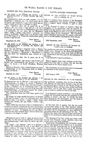 TE WAKA MAORI O NIU TIRANI. KOMITI MO NGA TIKANGA MAORI. KO TE KUPU A TE KOMITI MO RUNGA I TE PUKAPUKA-INOI A HOANI ENOKA ME ONA HOA 10. HE pukapuka-inoi tenei na etahi tangata o te iwi Rangitane e whakaatu ana i to ratou pouri mo te utunga ki nga tangata ke o nga moni e puta ana mo ratou i tetahi porowhita ko Pukatea te ingoa. Kua whakahaua ahau, kia ki penei atu ki te Whare:—Ko nga kupu a nga kai-inoi e ki nei i whakaritea aua porowhita e whakahuatia ana i roto i te pukapuka inoi mo ratou ake mo Rangitane kihai i mana i runga i nga korero i rangona i te aroaro o te Komiti. Koia i kore ai te Komiti e kaha ki te whai kupu ki te Whare kia whakaarohia paitia te tono a nga kai-inoi. JOHN BRYCE, Hepetema 12,1876.Tumuaki. KO TE KUPU A TE KOMITI MO RUNGA I TE PUKAPUKA-INOI A RAWIRI TE WANUI ME ONA HOA 14. E KI ana nga kai-inoi i tangohia hetia e Takuta Petatone i a ratou, tetahi whenua tona nui 18,600 eka kei waenganui o Manawatu o Rangitikei a e inoi ana ratou kia whakahokia taua whenua ki a ratou. Kua whakahaua ahau kia ki penei atu ki te Whare :— E kitea ana i runga i nga korero i taea te tiki e te komiti i ata whakarangona nga tikanga o ta ratou tono i te aroaro o te Kooti Whakawa Whenua Maori. Kahore te Komiti e kite i tetahi huarahi ma ratou i whakaarohia ai kia whakarerea ketia te whaka- taunga a te Kooti. JOHN BRYCE, Akuhata 15,1876.Tumuaki. KO TE KUPU A TE KOMITI MO RUNGA I TE PUKAPUKA-INOI A WI TE WHEORO. E WHAKAPUAKI ana te Kai-inoi i tona pouri mo te whakahaerenga o te raina o te rerewe o Waikato i runga i tetahi urupa tawhito tapu rawa kei Taupiri i te awa o Waikato, mo te whakatunga hoki i nga whare maha ki reira e tono ana hoki ia kia tere tonu te whakaputanga, o te Karauna karaati hei whaka- tuturu i tona take ki taua whenua. Kua whakahaua ahau kia whai kupu penei ki te whare:— Mo runga i te kupu tuatahi kua kitea e te Komiti e tika ana te kupu i roto i te pukapuka-inoi; kua haere te raina o te rerewe i runga i tetahi urupa tawhito kua hurahia ake nga wheua o etahi o nga tupapaku. Otira e kitea ana kua kore e taea te whakarere ke i te raina o te rerewe notemea he nui rawa atu te moni e pau e nui hoki te raruraru ki te tiki i nga kirikiri hei whakaoti i te raina. E whakaae ana ano nga Maori e ahua he ana ratou inahoki kihai i tere ta ratou tono i mua atu o te otinga o te mahi. Mehemea ka kawea ketia te raina ka pau te moni neke ake i te wha mano pauna (£4,000), ka kino hoki nga kopikopikonga o taua raina ka ikeike nga piki- tanga. No runga i enei tikanga i kore ai te Komiti e marama kia whakaarohia te tono a nga Maori kia kaua e pokanoa ki runga ki taua urupa; engari e kitea aua i te korero a Mr. Knorpp i te aroaro o te Komiti kahore be tikanga e peka ke atu ai te rerewe ki runga ki taua whenua, e mea ana te Komiti me taiepa taua urupa me tiaki atu ranei kei pokanoa te tangata ki reira ; me whakahaere ranei i tetahi NATIVE AFFAIRS COMMITTEE. REPORT ON THE PETITION OF HOANI ENOKA AND 10 OTHERS (No. 1). THIS is a petition from members of the Rangitane tribes, complaining that moneys accruing to them from a reserve called Pukatea is paid to other people. I am directed to report as follows:—That the allegation of the petitioners, that the reserves re- ferred to in the petition were made for the exclusive benfit of the Rangitane tribe, is not borne out by the evidence taken by the Committee. The Committee cannot therefore recommend the prayer of the peti- tion to the favourable consideration of the House. 12th September, 1876. JOHN BRYCE, Chairman. REPORT OF THE PETITION OF RAWIRI TE WANUI AND 14. OTHERS. THE petitioners state that a block of land containing 18,600 acres, situated in the Manawatu-Rangitikei District, was unjustly taken from them by the late Dr. Featherston, and they pray for the restoration of the same. I am directed to report as follows:— That it appears, from such evidence as the Com mittee have been able to obtain, that the case wag fully heard at the Native Lands Court. The Committee do not see their way to recommend an alteration of the Court's decision. 15th August, 1876. JOHN BRYCE, Chairman. REPORT ON THE PETITION OF WI TE WHEORO. THE petitioner complains that the line of the Wai- kato Railway has been taken through a very old and sacred burial-place situate at the Taupiri Grorge, on the Waikato River, and that many houses have been built there, and he asks that a grant may issue at once in order to confirm his title to the land. I am directed to report as follows:—As to the first subject, the Committee find that the allegation in the petition is correct: the line of railway has been taken through an old burial-place, and the bones of some of the dead have been disturbed. At the same time it appears that the line could not have been taken in any other direction without very much increased expense, and without subjecting the Public Works Department to great difficulty in procuring ballast for the ballasting of the line. The Natives also admit that they have been somewhat to blame in not pushing the matter before the work was done. • The changing of the line would now entail a cost of over four thousand pounds (£4,000), with a line of bad curves and steep gradients. Under these circumstances, the Committee cannot see how the request of the Natives as to non-inter- ference with the burial-ground can be entertained; "but as it appears, from the evidence of Mr. Knorpp, that no necessity exists for any further trespass on the burial-ground for railway purposes, the Com- mittee recommend that it should be fenced or other- wise protected from further trespass, and such other action be taken us will show to the Natives con-