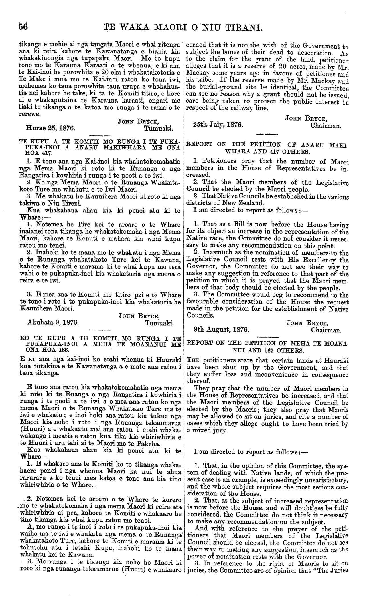 56 TE WAKA MAORI O NIU TIRANI. tikanga e mohio ai nga tangata Maori e whai ritenga ana ki reira kahore te Kawanatanga e hiahia kia whakakinongia nga tupapaku Maori. Mo te kupu tono mo te Karauna Karaati o te whenua, e ki ana te Kai-inoi he porowhita e 20 eka i whakatakotoria e Te Make i mua mo te Kai-inoi ratou ko tona iwi, mehemea ko taua porowhita taua urupa e whakahua- tia nei kahore he take, ki ta te Komiti titiro, e kore ai e whakaputaina te Karauna karaati, engari me tiaki te tikanga o te katoa mo runga i te raina o te rerewe. JOHN BRYCE, Hurae 25,1876.Tumuaki. TE KUPU A TE KOMITI MO RUNGA I TE PUKA- PUKA-INOI A ANARU MAKlWHARA ME ONA HOA 417. 1. E tono ana nga Kai-inoi kia whakatokomahatia nga Mema Maori ki roto ki te Runanga o nga Rangatira i kowhiria i runga i te pooti a te iwi. 2. Ko nga Mema Maori o te Runanga Whakata- koto Ture me whakatu e te Iwi Maori. 3. Me whakatu he Kaunihera Maori ki roto ki nga takiwa o Niu Tireni. Kua whakahaua ahau kia ki penei atu ki te Whare : — 1. Notemea he Pire kei te aroaro o te Whare inaianei tona tikanga he whakatokomaha i nga Mema Maori, kahore te Komiti e mahara kia whai kupu ratou mo tenei. 2. Inahoki ko te inana mo te whakatu i nga Mema o te Runanga whakatakoto Ture kei te Kawana, kahore te Komiti e marama ki te whai kupu mo tera wahi o te pukapuka-inoi kia whakaturia nga mema o reira e te iwi. 3. E mea ana te Komiti me titiro pai e te Whare te tono i roto i te pukapuka-inoi kia whakaturia he Kaunihera Maori. JOHN BRYCE, Akuhata 9, 1876.Tumuaki. KO TE KUPU A TE KOMITI MO RUNGA I TE PUKAPUKA-INOI A MEHA TE MOANANUI ME ONA HOA 166. E KI ana nga kai-inoi ko etahi whenua ki Hauraki kua tutakina e te Kawanatanga a e mate ana ratou i taua tikanga. E tono ana ratou kia whakatokomahatia nga mema ki roto ki te Ruanga o nga Rangatira i kowhiria i runga i te pooti a te iwi a e mea aua ratou ko nga mema Maori o te Runanga Whakatako Ture ma te iwi e whakatu ; e inoi hoki ana ratou kia tukua nga Maori kia noho i roto i nga Runanga tekaumarua (Huuri) a e whakaatu mai ana ratou i etahi whaka- wakanga i meatia e ratou kua tika kia whiriwhiria e te Huuri i uru tahi ai te Maori me te Pakeha. Kua whakahaua ahau kia ki penei atu ki te Whare — 1. E whakaro ana te Komiti ko te tikanga whaka- haere penei i nga whenua Maori ka nui te ahua raruraru a ko tenei mea katoa e tono ana kia tino whiriwhiria e te Whare. . 2. Notemea kei te aroaro o te Whare te korero mo te whakatokomaha i nga mema Maori ki reira ata whiriwhiria ai pea, kahore te Komiti e whakaaro he tino tikanga kia whai kupu ratou mo tenei. A, mo runga i te inoi i roto i te pukapuka-inoi kia waiho ma te iwi e whakatu nga mema o te Runanga whakatakoto Ture, kahore te Komiti e marama ki te tohutohu atu i tetahi Kupu, inahoki ko te mana whakatu kei te Kawana. 3. Mo runga, i te tikanga kia noho he Maori ki roto ki nga runanga tekaumarua (Huuri) e whakaaro cerned that it is not the wish of the Government to subject the bones of their dead to desecration. As to the claim for the grant of the land, petitioner alleges that it is a reserve of 20 acres, made by Mr. Mackay some years ago in favour of petitioner and his tribe. If the reserve made by Mr. Mackay and the burial-ground site be identical, the Committee can see no reason why a grant should not be issued, care being taken to protect the public interest in respect of the railway line. 25th July, 1876. JOHN BRYCE, Chairman. REPORT ON THE PETITION OF ANARU MAKI WHARA AND 417 OTHERS. 1. Petitioners pray that the number of Maori members in the House of Representatives be in- creased. 2. That the Maori members of the Legislative Council be elected by the Maori people. 3. That Native Councils be established in the various districts of New Zealand. I am directed to report as follows :— 1. That as a Bill is now before the House having for its object an increase in the representation of the Native race, the Committee do not consider it neces- sary to make any recommendation ou this point; 2. Inasmuch as the nomination of members to the Legislative Council rests with His Excellency the Governor, the Committee do not see their way to make any suggestion in reference to that part of the petition in which it is prayed that the Maori mem- bers of that body should be elected by the people. 3. The Committee would beg to recommend to the favourable consideration of the House the request made in the petition for the establishment of Native Councils. JOHN BRYCE, 9th August, 1876.Chairman. REPORT ON THE PETITION OF MEHA TE MOANA- NUI AND 165 OTHERS. THE petitioners state that certain lands at Hauraki have been shut up by the Government, and that they suffer loss and inconvenience in consequence thereof. They pray that the number of Maori members in the House of Representatives be increased, and that the Maori members of the Legislative Council be elected by the Maoris; they also pray that Maoris may be allowed to sit on juries, and cite a number of cases which they allege ought to have been tried by a mixed jury. I am directed to report as follows:— 1. That, in the opinion of this Committee, the sys- tem of dealing with Native lands, of which the pre- sent case is an example, is exceedingly unsatisfactory, and the whole subject requires the most serious con- sideration of the House. 2. That, as the subject of increased representation is now before the House, and will doubtless be fully considered, the Committee do not think it necessary to make any recommendation on the subject. And with reference to the prayer of the peti- tioners that Maori members of the Legislative Council should be elected, the Committee do not see their way to making any suggestion, inasmuch as the power of nomination rests with the Governor. 3. In reference to the right of Maoris to sit on juries, the Committee are of opinion that "The Juries