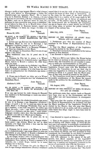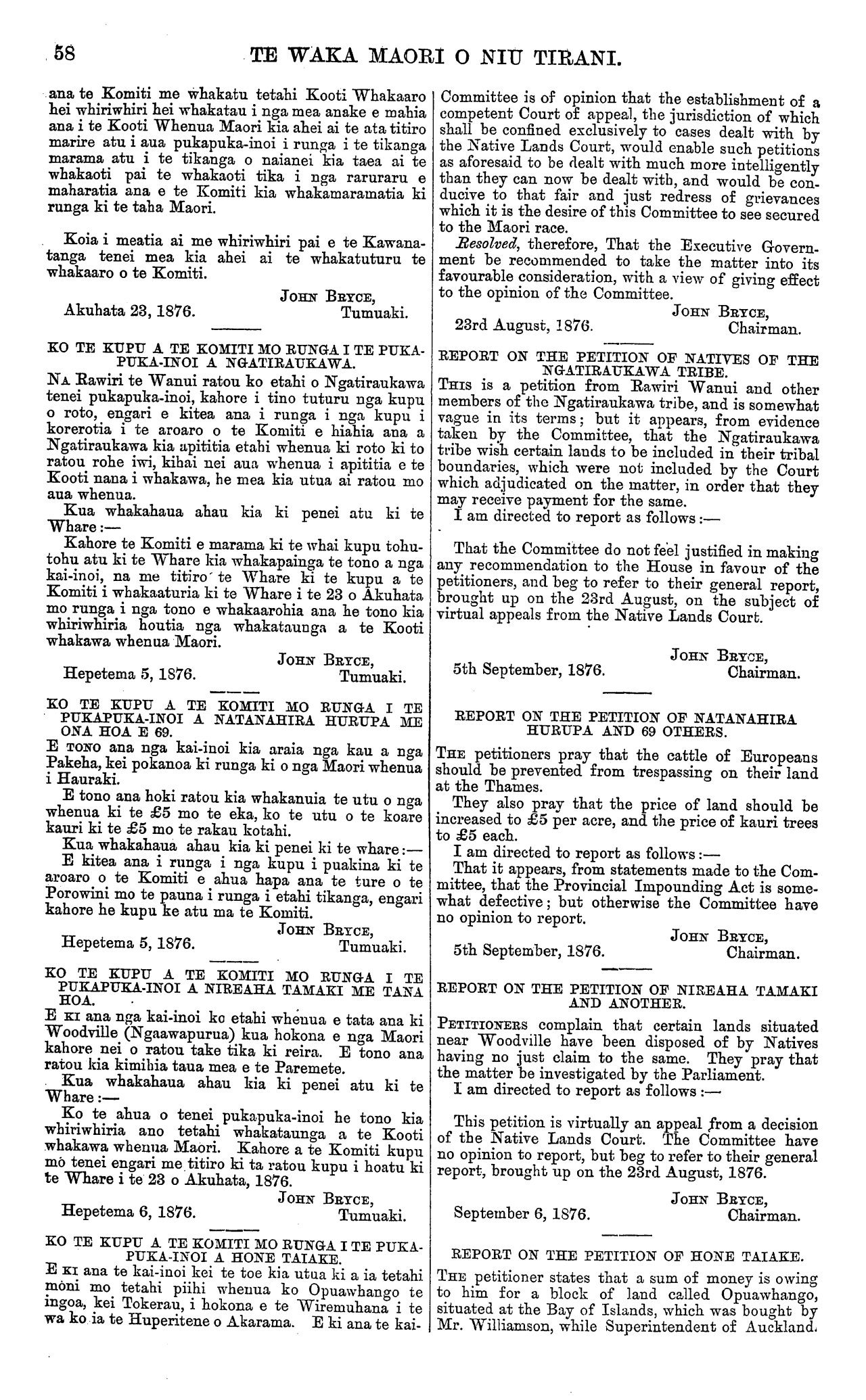 TE WAKA MAORI O NIU TIRANI. ana te Komiti me whakatu tetahi Kooti Whakaaro hei whiriwhiri hei whakatau i nga mea anake e mahia ana i te Kooti Whenua Maori kia ahei ai te ata titiro marire atu i aua pukapuka-inoi i runga i te tikanga marama atu i te tikanga o naianei kia taea ai te whakaoti pai te whakaoti tika i nga raruraru e maharatia ana e te Komiti kia whakamaramatia ki runga ki te taha Maori. Koia i meatia ai me whiriwhiri pai e te Kawana- tanga tenei mea kia ahei ai te whakatuturu te whakaaro o te Komiti. JOHN BRYCE, Akuhata 23,1876.Tumuaki. KO TE KUPU A TE KOMITI MO RUNGA I TE PUKA- PUKA-INOI A NGATIRAUKAWA. NA Rawiri te Wanui ratou ko etahi o Ngatiraukawa tenei pukapuka-inoi, kahore i tino tuturu nga kupu o roto, engari e kitea ana i runga i nga kupu i korerotia i te aroaro o te Komiti e hiahia ana a Ngatiraukawa kia apititia etahi whenua ki roto ki to ratou rohe iwi, kihai nei aua whenua i apititia e te Kooti nana i whakawa, he mea kia utua ai ratou mo aua whenua. Kua whakahaua ahau kia ki penei atu ki te Whare:— Kahore te Komiti e marama ki te whai kupu tohu- tohu atu ki te Whare kia whakapainga te tono a nga kai-inoi, na me titiro te Whare ki te kupu a te Komiti i whakaaturia ki te Whare i te 23 o Akuhata mo runga i nga tono e whakaarohia ana he tono kia whiriwhiria houtia nga whakataunga a te Kooti whakawa whenua Maori. JOHN BRYCE, Hepetema 5,1876.Tumuaki. KO TE KUPU A TE KOMITI MO RUNGA I TE PUKAPUKA-INOI A NATANAHIRA HURUPA ME ONA HOA E 69. E TONO ana nga kai-inoi kia araia nga kau a nga Pakeha, kei pokanoa ki runga ki o nga Maori whenua i Hauraki. E tono ana hoki ratou kia whakanuia te utu o nga whenua ki te £5 mo te eka, ko te utu o te koare kauri ki te £5 mo te rakau kotahi. Kua whakahaua ahau kia ki penei ki te whare:— E kitea ana i runga i nga kupu i puakina ki te aroaro o te Komiti e ahua hapa ana te ture o te Porowini mo te pauna i runga i etahi tikanga, engari kahore he kupu ke atu ma te Komiti. JOHN BRYCE, Hepetema 5, 1876.Tumuaki. KO TE KUPU A TE KOMITI MO RUNGA I TE PUKAPUKA-INOI A NIREAHA TAMAKI ME TANA HOA. E KI ana nga kai-inoi ko etahi whenua e tata ana ki Woodville (Ngaawapurua) kua hokona e nga Maori kahore nei o ratou take tika ki reira. E tono ana ratou kia kimihia taua mea e te Paremete. Kua whakahaua ahau kia ki penei atu ki te Whare:— Ko te ahua o tenei pukapuka-inoi he tono kia whiriwhiria ano tetahi whakataunga a te Kooti whakawa whenua Maori. Kahore a te Komiti kupu mo tenei engari me. titiro ki ta ratou kupu i hoatu ki te Whare i te 23 o Akuhata, 1876. JOHN BRYCE, Hepetema 6, 1876.Tumuaki. KO TE KUPU A TE KOMITI MO RUNGA I TE PUKA- PUKA-INOI A HONE TAIAKE. E KI ana te kai-inoi kei te toe kia utua ki a ia tetahi moni mo tetahi piihi whenua ko Opuawhango te ingoa, kei Tokerau, i hokona e te Wiremuhana i te wa ko ia te Huperitene o Akarama. E ki ana te kai- Committee is of opinion that the establishment of a competent Court of appeal, the jurisdiction of which shall be confined exclusively to cases dealt with by the Native Lands Court, would enable such petitions as aforesaid to be dealt with much more intelligently than they can now be dealt with, and would be con- ducive to that fair and just redress of grievances which it is the desire of this Committee to see secured to the Maori race. Resolved, therefore, That the Executive Govern- ment be recommended to take the matter into its favourable consideration, with a view of giving effect to the opinion of the Committee. JOHN BRYCE, 23rd August, 1876.Chairman. REPORT ON THE PETITION OF NATIVES OF THE NGATIRAUKAWA TRIBE. THIS is a petition from Rawiri Wanui and other members of the Ngatiraukawa tribe, and is somewhat vague in its terms; but it appears, from evidence taken by the Committee, that the Ngatiraukawa tribe wish certain lands to be included in their tribal boundaries, which were not included by the Court which adjudicated on the matter, in order that they may receive payment for the same. I am directed to report as follows:— That the Committee do not feel justified in making any recommendation to the House in favour of the petitioners, and beg to refer to their general report, brought up on the 23rd August, on the subject of virtual appeals from the Native Lands Court. JOHN BRYCE, 5th September, 1876.Chairman. REPORT ON THE PETITION OF NATANAHIRA HURUPA AND 69 OTHERS. THE petitioners pray that the cattle of Europeans should be prevented from trespassing on their land at the Thames. They also pray that the price of land should be increased to £5 per acre, and the price of kauri trees to £5 each. I am directed to report as follows:— That it appears, from statements made to the Com- mittee, that the Provincial Impounding Act is some- what defective; but otherwise the Committee have no opinion to report. JOHN BRYCE, 5th September, 1876.Chairman. REPORT ON THE PETITION OF NIREAHA TAMAKI AND ANOTHER. PETITIONERS complain that certain lands situated near Woodville have been disposed of by Natives having no just claim to the same. They pray that the matter be investigated by the Parliament. I am directed to report as follows :— This petition is virtually an appeal from a decision of the Native Lands Court. The Committee have no opinion to report, but beg to refer to their general report, brought up on the 23rd August, 1876. JOHN BRYCE, September 6, 1876.Chairman. REPORT ON THE PETITION OF HONE TAIAKE. THE petitioner states that a sum of money is owing to him for a block of land called Opuawhango, situated at the Bay of Islands, which was bought by Mr. Williamson, while Superintendent of Auckland.