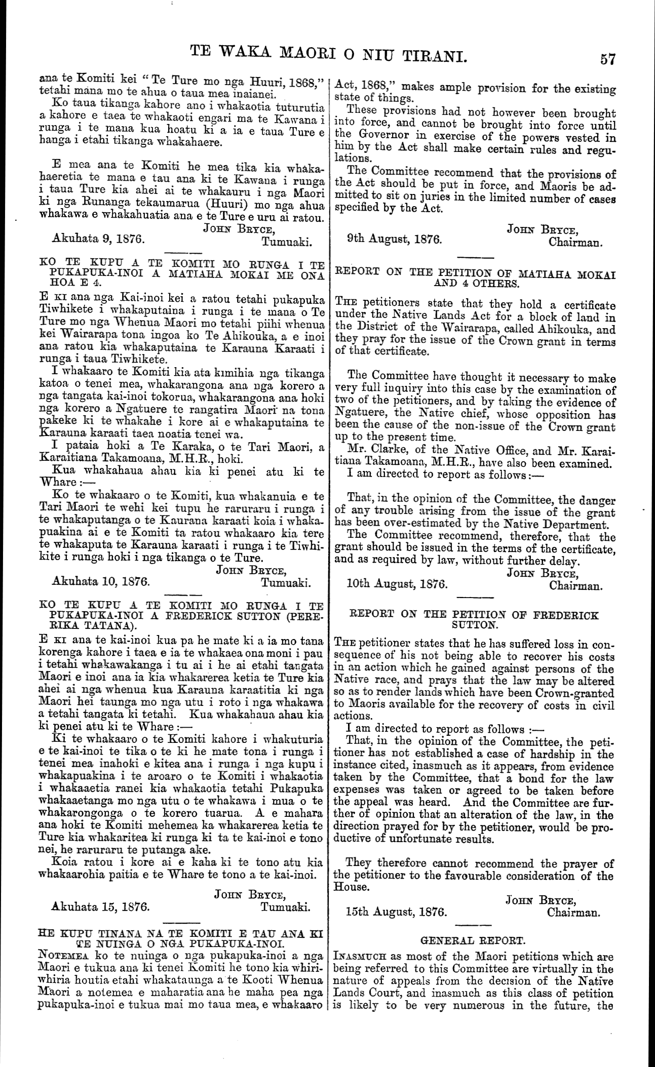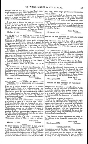 TE WAKA MAORI O NIU TIRANI. 57 ana te Komiti kei " Te Ture mo nga Huuri, 1868," tetahi mana mo te ahua o taua mea inaianei. Ko taua tikanga kahore ano i whakaotia tuturutia a kahore e taea te whakaoti engari ma te Kawana i runga i te mana kua hoatu ki a ia e taua Ture e hanga i etahi tikanga whakahaere. E mea ana te Komiti he mea tika kia whaka- haeretia te mana e tau ana ki te Kawana i runga i taua Ture kia ahei ai te whakauru i nga Maori ki nga Runanga tekaumarua (Huuri) mo nga ahua whakawa e whakahuatia ana e te Ture e uru ai ratou. JOHN BRYCE, Akuhata 9, 1876.Tumuaki. KO TE KUPU A TE KOMITI MO RUNGA I TE PUKAPUKA-INOI A MATIAHA MOKAI ME ONA HOA E 4. E KI ana nga Kai-inoi kei a ratou tetahi pukapuka Tiwhikete i whakaputaina i runga i te inana o Te Ture mo nga Whenua Maori mo tetahi piihi whenua kei Wairarapa tona ingoa ko Te Ahikouka, a e inoi ana ratou kia whakaputaina te Karauna Karaati i runga i taua Tiwhikete. I whakaaro te Komiti kia ata kimihia nga tikanga katoa o tenei mea, whakarangona ana nga korero a nga tangata kai-inoi tokorua, whakarangona ana hoki nga korero a Ngatuere te rangatira Maori" na tona pakeke ki te whakahe i kore ai e whakaputaina te Karauna karaati taea noatia tenei wa. I pataia hoki a Te Karaka, o te Tari Maori, a Karaitiana Takamoana, M.H.R., hold. Kua whakahaua ahau kia ki penei atu ki te Whare:— Ko te whakaaro o te Komiti, kua whakanuia e te Tari Maori te wehi kei tupu he raruraru i runga i te whakaputanga o te Kaurana karaati koia i whaka, puakina ai e te Komiti ta ratou whakaaro kia tere te whakaputa te Karauna karaati i runga i te Tiwhi- kite i runga hoki i nga tikanga o te Ture. JOHN BRYCE, Akuhata 10, 1876.Tumuaki. KO TE KUPU A TE KOMITI MO RUNGA I TE PUKAPUKA-INOI A FREDERICK SUTTON (PERE- RIKA TATANA). E KI ana te kai-inoi kua pa he mate ki a ia mo tana korenga kahore i taea e ia te whakaea ona moni i pau i tetahi whakawakanga i tu ai i he ai etahi tangata Maori e inoi ana ia kia whakarerea ketia te Ture kia ahei ai nga whenua kua Karauna karaatitia ki nga Maori hei taunga mo nga utu i roto i nga whakawa a tetahi tangata ki tetahi. Kua whakahaua ahau kia ki penei atu ki te Whare :— Ki te whakaaro o te Komiti kahore i whakaturia e te kai-inoi te tika o te ki he mate tona i runga i tenei mea inahoki e kitea ana i runga i nga kupu i whakapuakina i te aroaro o te Komiti i whakaotia i whakaaetia ranei kia whakaotia tetahi Pukapuka whakaaetanga mo nga utu o te whakawa i mua o te whakarongonga o te korero tuarua. A e mahara ana hoki te Komiti mehemea ka whakarerea ketia te Ture kia whakaritea ki runga ki ta te kai-inoi e tono nei, he raruraru te putanga ake. Koia ratou i kore ai e kaha ki te tono atu kia whakaarohia paitia e te Whare te tono a te kai-inoi. JOHN BRYCE, Akuhata 15, 1876.Tumuaki. HE KUPU TINANA NA TE KOMITI E TAU ANA KI TE NUINGA O NGA PUKAPUKA-INOI. NOTEMEA ko te nuinga o nga pukapuka-inoi a nga Maori e tukua ana ki tenei Komiti he tono kia whiri- whiria houtia etahi whakataunga a te Kooti Whenua Maori a notemea e maharatia ana he maha pea nga pukapuka-inoi e tukua mai mo taua mea, e whakaaro Act, 1868," makes ample provision for the existing state of things. These provisions had not however been brought into force, and cannot be brought into force until the Governor in exercise of the powers vested in him by the Act shall make certain rules and regu- lations. The Committee recommend that the provisions of the Act should be put in force, and Maoris be ad- mitted to sit on juries in the limited number of cases specified by the Act. JOHN BRYCE, 9th August, 1876.Chairman. REPORT ON THE PETITION OF MATIAHA MOKAI AND 4 OTHERS. THE petitioners state that they hold a certificate under the Native Lands Act for a block of land in the District of the Wairarapa, called Ahikouka, and they pray for the issue of the Crown grant in terms of that certificate. The Committee have thought it necessary to make very full inquiry into this case by the examination of two of the petitioners, and by taking the evidence of Ngatuere, the Native chief, whose opposition has been the cause of the non-issue of the Crown grant up to the present time. Mr. Clarke, of the Native Office, and Mr. Karai- tiana Takamoana, M.H.R., have also been examined. I am directed to report as follows:— That, in the opinion of the Committee, the danger of any trouble arising from the issue of the grant has been over-estimated by the Native Department. The Committee recommend, therefore, that the grant should be issued in the terms of the certificate, and as required by law, without further delay. JOHN BRYCE, 10th August, 1876.Chairman. REPORT ON THE PETITION OP FREDERICK SUTTON. THE petitioner states that he has suffered loss in con- sequence of his not being able to recover his costs in an action which he gained against persons of the Native race, and prays that the law may be altered so as to render lands which have been Crown-granted to Maoris available for the recovery of costs in civil actions. I am directed to report as follows :— That, in the opinion of the Committee, the peti- tioner has not established a case of hardship in the instance cited, inasmuch as it appears, from evidence taken by the Committee, that a bond for the law expenses was taken or agreed to be taken before the appeal was heard. And the Committee are fur- ther of opinion that an alteration of the law, in the direction prayed for by the petitioner, would be pro- ductive of unfortunate results. They therefore cannot recommend the prayer of the petitioner to the favourable consideration of the House. JOHN BRYCE, 15th August, 1876.Chairman. GENERAL REPORT. INASMUCH as most of the Maori petitions which are being referred to this Committee are virtually in the nature of appeals from the decision of the Native Lands Court, and inasmuch as this class of petition is likely to be very numerous in the future, the