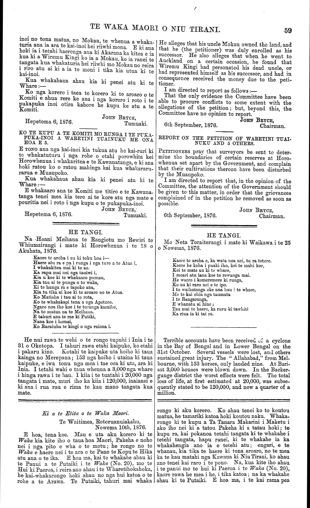 TE WAKA MAORI O NIU TIRANI. 59 inoi no tona matua, no Mokau, te whenua a whaka- turia ana ia ara te \\kai-inoi hei riiwhi mona. E ki aua hoki ia i tetahi haerenga ana ki Akarana ka kitea e ia kua ki a Wiremu Kingi ko ia a Mokau, ko ia ranei te tangata kua whakaturia hei riiwhi mo Mokau no reira i riro atu ai ki a ia te moni i tika kia utua ki te kai-inoi. Kua whakahana ahau kia ki penei atu ki te Whare:— Ko nga korero i taea te korero ki te aroaro o te Komiti e ahua rere ke ana i nga korero i roto i te pukapuka inoi otira kahore he kupu ke atu a te Komiti. JOHN BRYCE, Hepetema 6,1876.Tumuaki. KO TE KUPU A TE KOMITI MO RUNGA I TE PUKA- PUKA-INOI A WARETINI TUAINUKU ME ONA HOA E 5. E TONO ana nga kai-inoi kia tukua atu he kai-ruri ki te whakatuturu i nga rohe o etahi porowhita kei Horowhenua i whakaritea e te Kawanatanga, e ki ana hoki ratou ko o ratou mahinga kai kua whakararu- rarua e Muaupoko. Kua whakahaua ahau kia ki penei atu ki te Whare:— E whakaaro ana te Komiti me titiro e te Kawana- tanga tenei mea kia tere ai te kore atu nga mate e pouritia nei i roto i nga kupu o te pukapuka-inoi. JOHN BRYCE Hepetema 6, 1876.Tumuaki. HE TANGI. Na -Hoani Meihana te Rangiotu mo Rewiri te Whiumairangi i mate ki Horowhenua i te 18 o Akuhata, 1876. Kaore te aroha i au ki toku hoa i— Haere atu ra e pa i runga i nga ture a te Atua i, I whakakitea mai ki te ao. Ka rapu mai nei nga tauiwi i, Kia u koe ki te whakaaro pumau, Kia tau ai te punga o to waka, Ki te hunga ra e tapoko ana, Kia tu tika ai koe ki te aroaro no te Atua. Ko Matiaha i tau ai te rota, Ko te whakakapi tena a nga Apotoro. Ngaro noa iho koe i te turanga karaihe, Na to matua ua te Meihana. E tahuri ana te rae ki Putiki, Nana koe i homai, Ko Raraiuha te kingi o nga raiona i. He nui rawa te wehi o te rongo tupuhi i Inia i te 31 o Oketopa. I tahuri rawa etahi kaipuke, ko etahi i pakaru kino. Kotahi te kaipuke uta hoiho ki taua kainga no Merepana; 153 nga hoiho i utaina ki taua kaipuke, e iwa tonu nga mea i tae ora ki uta, ara ki Inia. I tetahi wahi o taua whenua a 3,000 nga whare i hinga rawa i te hau. I kiia i te tuatahi i 20,000 nga tangata i mate, muri iho ka kiia i 120,000, inaianei e ki ana i rua rau e rima te kau mano tangata kua mate. Ki a te Etita o te Waka, Maori. Te Waitimea, Rotoruanuiakahu, Nowema 10th, 1876. E hoa, tena koe. Mau e uta aku korero ki te Waka kia kite iho o taua hoa Maori, Pakeha e noho nei i nga pito e wha o te motu; he rongo no te Waka e haere nei i te ara o te Pane te Kopu te Hika atu ana o te ika. E hoa ma, kai te whakahe ahau ki te Panui a te Putaiki i te Waka (No. 20), mo te Hui ki Paeroa, i reira ano ahau i te Wharetihokahoka, he kai-whakarongo hoki ahau no nga hui katoa o te rohe a te Arawa. Te Putaiki, tahuri mai whaka He alleges that his uncle Mokau owned the land, and that he (the petitioner) was duly enrolled as his successor. He also alleges that when he went to Auckland on a certain occasion, he found that Wiremu Kingi had personated his dead uncle, or had represented himself as his successor, and had in consequence received the money due to the peti- tioner. I am directed to report as follows:— That the only evidence the Committee have been able to procure conflicts to some extent with the allegations of the petition; but, beyond this, the Committee have no opinion to report. JOHN BRYCE, 6th September, 1876.Chairman. REPORT ON THE PETITION OF WARETINI TUA- NUKU AND 5 OTHERS. PETITIONERS pray that surveyors be sent to deter- mine the boundaries of certain reserves at Horo- whenua set apart by the Govermnent, and complain that their cultivations thereon have been disturbed by the Muaupoko. I am directed to report that, in the opinion of the Committee, the attention of the Government should be given to this matter, in order that the grievances complained of in the petition be removed as soon as possible. JOHN BRYCE, 6th September, 1876.Chairman. HE TANGI. Mo Neta Toraiterangi i mate ki Waikawa i te 25 o Nowema, 1876. Kaore te aroha e, ka wata noa nei, tu ra tetere. Kaore he koha i puaki iho, kei te mahi koe, Kei te mate au ki te whare, I moari atu iana koe te rewanga mai. He waero i komeremere ki runga, Ko au ki raro nei e te ipo. I to waihotanga oke ana hau i. te whare, Me te kai ohia nga taumata I te Rangaranga, E whanatu ai hine ; Tau mai te haere, ka ruru ki tawhiti Ka riua ia ki tai ra. Terrible accounts have been received of a cyclone in the Bay of Bengal and in Lower Bengal on the 31st October. Several vessels were lost, and others sustained great injury. The " Allahabad," from Mel- bourne, with 153 horses, only landed nine. At Bari- sat 3,000 houses were blown down. In the Backer- gunge district the worst effects were felt. The total loss of life, at first estimated at 20,000, was subse- quently stated to be 120,000, and now a quarter of a million. rongo ki aku korero. Ko ahau tenei ko to koutou matua, he tamariki katoa hoki koutou naku. Whaka- rongo ki te kupu a Ta Tanara Makarini i Maketu i ako iho nei ki a tatou Pakeha ki a tatau hoki; te kupu ra, kai pokanoa tetahi tangata ki te whakahe i tetehi tangata, hapu ranei, ki te whakahe ia ka whakahengia ano ia e tetehi atu; engari, e te whanau, kia tika te haere ki tona aroaro, no te mea ka te kau matahi nga Kawana ki Niu Tirani, ko ahau ano tenei kai raro i te pono. Na, kua kite iho ahau i te panui mo te hui ki Paeroa i te Waka (No. 20), kaore rawa he mea i he, i tika katoa; na ka whakahe ahau ki te Putaiki. E hoa ma, i te kai rama pea