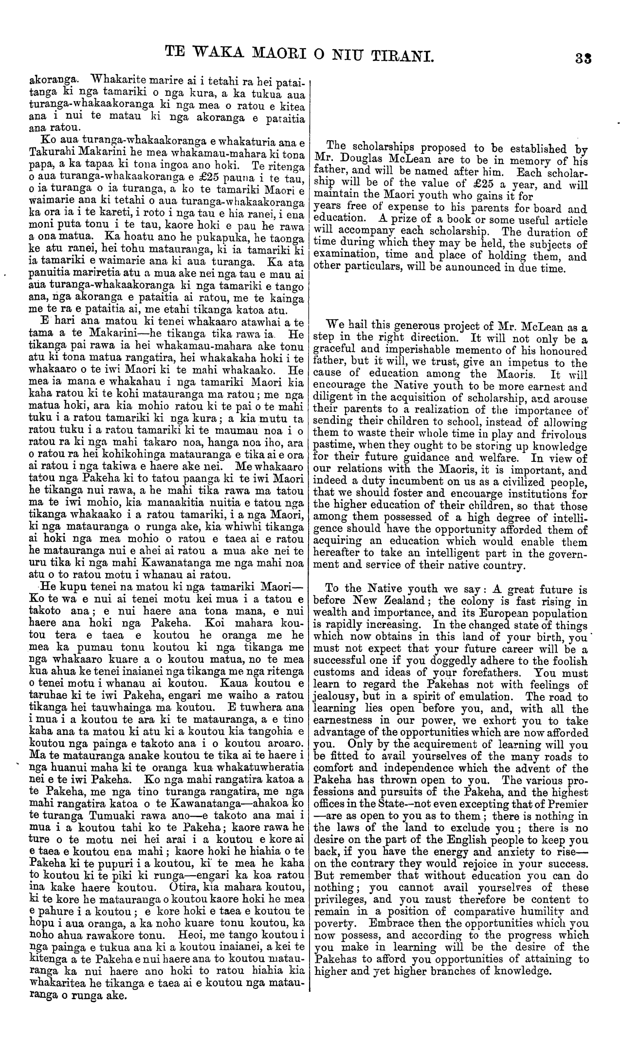 TE WAKA MAORI O NIU TIRANI. akoranga. Whakarite marire ai i tetahi ra hei patai- tanga ki nga tamariki o nga kura, a ka tukua aua turanga-whakaakoranga ki nga mea o ratou e kitea ana i nui te matau ki nga akoranga e pataitia ana ratou. Ko aua turanga-whakaakoranga e whakaturia ana e Takurahi Makarini he mea whakamau-mahara ki tona papa, a ka tapaa ki tona ingoa ano hoki. Te ritenga o aua turanga-whakaakoranga e £25 pauna i te tau, o ia turanga o ia turanga, a ko te tamariki Maori e waimarie ana ki tetahi o aua turanga-whakaakoranga ka ora ia i te kareti, i roto i nga tau e hia ranei, i ena moni puta tonu i te tau, kaore hoki e pau he rawa a ona matua. Ka hoatu ano he pukapuka, he taonga ke atu ranei, hei tohu matauranga, ki ia tamariki ki ia tamariki e waimarie ana ki aua turanga. Ka ata panuitia mariretia atu a mua ake nei nga tau e mau ai aua turanga-whakaakoranga ki nga tamariki e tango ana, nga akoranga e pataitia ai ratou, me te kainga me te ra e pataitia ai, me etahi tikanga katoa atu. E hari ana matou ki tenei whakaaro atawhai a te tama a te Makarini—he tikanga tika rawa ia. He tikanga pai rawa ia hei whakamau-mahara ake tonu atu ki tona matua rangatira, hei whakakaha hoki i te whakaaro o te iwi Maori ki te mahi whakaako. He mea ia mana e whakahau i nga tamariki Maori kia kaha ratou ki te kohi matauranga ma ratou; me nga matua hoki, ara kia mohio ratou ki te pai o te mahi tuku i a ratou tamariki ki nga kura; a kia mutu ta ratou tuku i a ratou tamariki ki te maumau noa i o ratou ra ki nga mahi takaro noa, hanga noa iho, ara o ratou ra hei kohikohinga matauranga e tika ai e ora ai ratou i nga takiwa e haere ake nei. Me whakaaro tatou nga Pakeha ki to tatou paanga ki te iwi Maori he tikanga nui rawa, a he mahi tika rawa ma tatou ma te iwi mohio, kia manaakitia nuitia e tatou nga tikanga whakaako i a ratou tamariki, i a nga Maori, ki nga matauranga o runga ake, kia whiwhi tikanga ai hoki nga mea mohio o ratou e taea ai e ratou he matauranga nui e ahei ai ratou a mua ake nei te uru tika ki nga mahi Kawanatanga me nga mahi noa atu o to ratou motu i whanau ai ratou. He kupu tenei na matou ki nga tamariki Maori— Ko te wa e nui ai tenei motu kei mua i a tatou e takoto ana; e nui haere ana tona mana, e nui haere ana hoki nga Pakeha. Koi mahara kou- tou tera e taea e koutou he oranga me he mea ka pumau tonu koutou ki nga tikanga me nga whakaaro kuare a o koutou matua, no te mea kua ahua ke tenei inaianei nga tikanga me nga ritenga o tenei motu i whanau ai koutou. Kaua koutou e taruhae ki te iwi Pakeha, engari me waiho a ratou tikanga hei tauwhainga ma koutou. E tuwhera ana i mua i a koutou te ara ki te matauranga, a e tino kaha ana ta matou ki atu ki a koutou kia tangohia e koutou nga painga e takoto ana i o koutou aroaro. Ma te matauranga anake koutou te tika ai te haere i nga huanui maha ki te oranga kua whakatuwheratia nei e te iwi Pakeha. Ko nga mahi rangatira katoa a te Pakeha, me nga tino turanga rangatira, me nga mahi rangatira katoa o te Kawanatanga—ahakoa ko te turanga Tumuaki rawa ano—e takoto ana mai i mua i a koutou tahi ko te Pakeha; kaore rawa he ture o te motu nei hei arai i a koutou e kore ai e taea e koutou ena mahi ; kaore hoki he hiahia o te Pakeha ki te pupuri i a koutou, ki te mea he kaha to koutou ki te piki ki runga—engari ka koa ratou ina kake haere koutou. Otira, kia mahara koutou, ki te kore he matauranga o koutou kaore hoki he mea e pahure i a koutou ; e kore hoki e taea e koutou te hopu i aua oranga, a ka noho kuare tonu koutou, ka noho ahua rawakore tonu. Heoi, me tango koutou i nga painga e tukua ana ki a koutou inaianei, a kei te kitenga a te Pakeha e nui haere ana to koutou matau- ranga ka nui haere ano hoki to ratou hiahia kia whakaritea he tikanga e taea ai e koutou nga matau- ranga o runga ake. The scholarships proposed to be established by Mr. Douglas McLean are to be in memory of his father, and will be named after him. Each scholar- ship will be of the value of £25 a year, and will maintain the Maori youth who gains it for years free of expense to his parents for board and education. A prize of a book or some useful article will accompany each scholarship. The duration of time during which they may be held, the subjects of examination, time and place of holding them, and other particulars, will be announced in due time. We hail this generous project of Mr. McLean as a step in the right direction. It will not only be a graceful and imperishable memento of his honoured father, but it will, we trust, give an impetus to the cause of education among the Maoris. It will encourage the Native youth to be more earnest and diligent in the acquisition of scholarship, and arouse ;heir parents to a realization of the importance of sending their children to school, instead of allowing them to waste their whole time in play and frivolous pastime, when they ought to be storing up knowledge for their future guidance and welfare. In view of our relations with the Maoris, it is important, and indeed a duty incumbent on us as a civilized people, that we should foster and encouarge institutions for the higher education of their children, so that those among them possessed of a high degree of intelli- gence should have the opportunity afforded them of acquiring an education which would enable them hereafter to take an intelligent part in the govern- ment and service of their native country. To the Native youth we say: A great future is before New Zealand; the colony is fast rising in wealth and importance, and its European population is rapidly increasing. In the changed state of things which now obtains in this land of your birth, you must not expect that your future career will be a successful one if you doggedly adhere to the foolish customs and ideas of your forefathers. Tou must learn to regard the Pakehas not with feelings of jealousy, but in a spirit of emulation. The road to learning lies open before you, and, with all the earnestness in our power, we exho