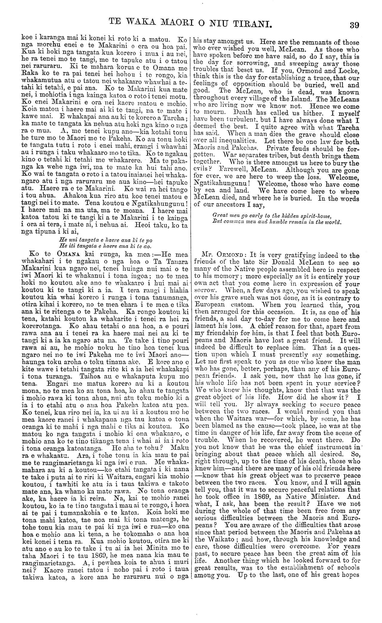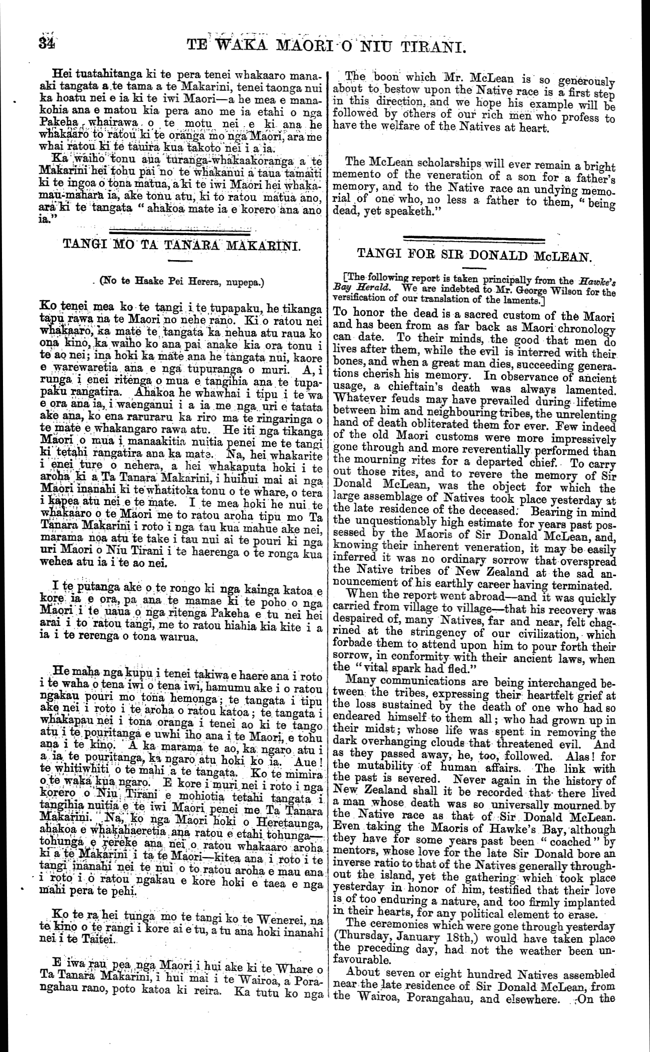 TE WAKA MAORI O NIU TIRANI. Hei tuatahitanga ki te pera tenei whakaaro mana- aki tangata a te tama a te Makarini, tenei taonga nui ka hoatu nei e ia ki te iwi Maori—a he mea e mana- kohia ana e matou kia pera ano me ia etahi o nga Pakeha whairawa - o te motu nei e ki ana he whakaaro to ratou ki te oranga mo nga Maori ara me whai ratou ki te tauira kua takoto nei i a ia. Ka waiho tonu aua turanga-whakakoranga a te Makarini hei tohu pai no te whakanui a taua tamaiti ki te ingoa 6 tona matua, aki te iwi Maori hei whaka- mau-mahara ia, ake tonu atu, ki to ratou matua ano, ara ki te tangata " ahakoa mate ia e korero ana ano TANGI MO TA TANARA MAKARINI. . (No te Haake Pei Herara, nupepa.) Ko tenei, mea ko te tangi i. te tupapaku, he tikanga tapu rawa na te Maori no nehe rangi. Ki o ratou nei whakaaro, ka mate te tangata ta nehua atu raua ko ona kino, ka waiho ko ana pai anake kia ora tonu i te ao nei; ina hoki ka mate ana he tangata nui, kaore e warewaretia ana e nga" tupuranga o muri. A, i runga i enei ritenga o mua e tangihia ana te tupa- paku rangatira. Ahakoa he whawhai i tipu i te wa e ora ana ia, i waenganui i a ia me nga. uri e tatata ake ana, ko ena raruraru ka riro ma te ringaringa o te mate e whakangaro rawa atu. He iti nga tikanga Maori o mua i manaakitia nuitia penei me te tangi ki tetahi rangatira ana ka mate. Na, hei whakarite i enei ture o nehera, a hei whakaputa hoki i te aroha ki a Ta Tanara Makarini, i huihui mai ai nga Maori inanahi ki te whatitoka tonu o te whare, o tera i kapea atu nei e te mate. I te mea hoki he nui te whakaaro o te Maori me to ratou aroha tipu mo Ta Tanara Makarini i roto i nga tau kua mahue ake nei, marama noa atu te take i tau nui ai te pouri ki nga uri Maori o Niu Tirani i te haerenga o te ronga kua wehea atu ia i te ao nei. I te putanga ake o te rongo ki nga kainga katoa e kore ia e ora, pa ana te mamae ki te poho o nga Maori i te uaua o nga ritenga Pakeha e tu nei hei arai i to ratou tangi, me to ratou hiahia kia kite i a ia i te rerenga o tona wairua. He maha nga kupu i tenei takiwa e haere ana i roto i te waha o tena iwi o tena iwi, hamumu ake i o ratou ngakau pouri mo toina hemonga; te tangata i tipu ake nei i roto i te aroha o ratou katoa; te. tangata i whakapau nei i tona oranga i tenei ao ki te tango atu te pouritanga e uwhi iho ana i te Maori, e tohu ana i te kino! A ka marama, te ao, ka: ngaro atu i a ia te pouritanga, ka ngaro atu hoki ko ia. Aue ! te whitiwhiti 6 te mahi a te tangata. Ko te mimira o te waka kua ngaro. E kore i muri nei i roto i nga korero o Niu Tirani e mohiotia tetahi tangata i tangihia nuitia e te iwi Maori penei me Ta Tanara Makarini. Na ko nga Maori hoki o Heretaunga, ahakoa e whakahaeretia ana ratou e etahi, tohunga-—. tohunga e rereke ana. nei o ratou whakaaro aroha ki a Makarini i ta te Maori kitea ana i roto i te tangi, inanahi nei te nui o to ratou aroha e mau ana: i roto i o ratou ngakau e kore hoki e taea e nga mahi pera te pehi. Ko te ra, hei tunga mo te tangi ko te Wenerei, na te kino o te rangi i kore ai e tu, atu ana hoki inanahi nei i te Taitei. E iwa rau pea nga Maori i hui ake ki te Whare o Ta Tanara Makarini, i hui mai i te Wairoa, a Pora- ngahau rano, poto katoa ki reira. Ka tutu ko nga The boon which Mr. McLean is so generously about to bestow upon the Native race is a first step in this direction, and we hope his example will be followed by others of our rich men who profess to have the welfare of the Natives at heart. The McLean scholarships will ever remain a bright memento of the veneration of a son for a father's memory, and to the Native race an undying memo- rial of one who, no less a father to them, " being dead, yet speaketh." TANGI FOR SIR DONALD McLEAN. [The following report is taken principally from the Bay Herald. We are indebted to Mr. George Wilson for the versification of our translation of the laments.] To honor the dead is a sacred custom of the Maori and has been from as far back as Maori chronology can date. To their minds, the good that men do lives after them, while the evil is interred with their bones, and when a great man dies, succeeding genera. tions cherish his memory. In observance of ancient usage, a chieftain's death was always lamented. Whatever feuds may have prevailed during lifetime between him and neighbouring tribes, the unrelenting hand of death obliterated them for ever. Few indeed of the old Maori customs were more impressively gone through and more reverentially performed than the mourning rites for a departed chief. To carry out those rites, and to revere the memory of Sir Donald McLean, was the object for which the large assemblage of Natives took place yesterday at the late residence of the deceased: Bearing in mind the unquestionably high estimate for years past pos- sessed by the Maoris of Sir Donald McLean, and, knowing their inherent veneration, it may be easily inferred it was no ordinary sorrow that overspread the Native tribes of New Zealand at the sad an- nouncement of his earthly career having terminated. When the report went abroad — and it was quickly carried from village to village— that his recovery was despaired of, many Natives, far and near, felt chag- rined at the stringency of our civilization, which forbade them to attend upon him to pour forth their sorrow, in conformity with their ancient laws, when the "vital spark had fled." Many communications are being interchanged be- tween: the tribes, expressing their heartfelt grief at the loss sustained by the death of one who had eo endeared himself to them all ; who had grown up in their midst ; whose life was spent in removing the dark overhanging clouds that threatened evil. And as they passed away, he, too, followed. Alas ! for the mutability of human affairs. The link with the past is severed. Never again in the history of New Zealand shall it be recorded that there lived a man whose death was so universally mourned by the Native race as that of Sir Donald McLean. Even taking the Ma