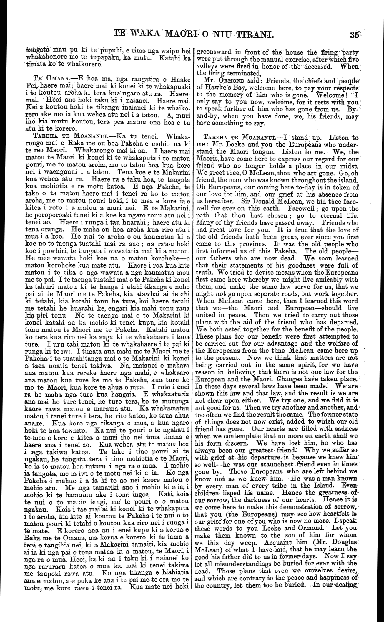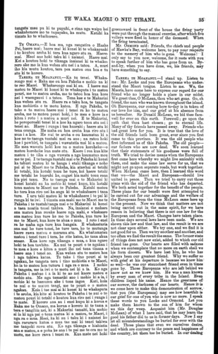 TE WAKA MAORI O NIU TIRANI. tangata mau pu ki te pupuhi, e rima nga waipu hei whakahonore mo te tupapaku, ka mutu. Katahi ka timata ko te whaikorero. TE OMANA.—E hoa ma, nga rangatira o Haake Pei, haere mai; haere mai ki konei ki te whakapuaki i to koutou aroha ki tera kua ngaro atu ra. Haere- mai. Heoi ano hoki taku ki i naianei. Haere mai. Kei a koutou hoki te tikanga inaianei ki te whaiko- rero ake mo ia kua wehea atu nei i a tatou. A, muri iho kia mutu koutou, tera pea matou ona hoa e tu atu ki te korero. TAREHA. TE MOANANUI.—Ka tu tenei. Whaka- rongo mai e Raka me ou hoa Pakeha e mohio na ki te reo Maori. Whakarongo mai ki au. I haere mai matou te Maori ki konei ki te whakaputa i to matou pouri, me to matou aroha, mo to tatou hoa kua kore nei i waenganui i a tatou. Tena koe e te Makarini kua wehea atu ra. Haere ra e taku hoa, te tangata kua mohiotia e te motu katoa. E nga Pakeha, te take o ta matou haere mai i tenei ra ko to matou aroha, me to matou pouri hoki, i te mea e kore ia e kitea i roto i a matou a muri nei. E te Makarini, he poroporoaki tenei ki a koe ka ngaro tonu atu nei i tenei ao. Haere i runga i tau huarahi; haere atu ki tena oranga. He maha ou hoa aroha kua riro atu i mua i a koe. He nui te aroha o ou kaumatua ki a koe no to taenga tuatahi mai ra ano ; na ratou hoki koe i powhiri, te tangata i wawatatia mai ki a matou. He mea wawata hoki koe na o matou koroheke—o matou koroheke kua mate atu. Kaore i roa kua kite matou i te tika o nga wawata a nga kaumatua mou me to pai. I te taenga tuatahi mai o te Pakeha ki konei ka tahuri matou ki te hanga i etahi tikanga e noho pai ai te Maori me te Pakeha, kia atawhai ai tetahi ki tetahi, kia kotahi tonu he ture, koi haere tetahi me tetahi he huarahi ke, engari kia mahi tonu raua kia piri tonu. No te taenga mai o te Makarini ki konei katahi au ka inoino ki tenei kupu, kia kotahi tonu matou te Maori rae te Pakeha. Katahi matou ko tera kua riro nei ka anga ki te whakahaere i taua ture. I uru tahi matou ki te whakahaere i te pai ki runga ki te iwi. 1 timata aua mahi mo te Maori me te Pakeha i te tuatahitanga mai o te Makarini ki konei a taea noatia tenei takiwa. Na, inaianei e mahara ana matou kua rereke haere nga mahi, e whakaaro ana matou kua ture ke mo te Pakeha, kua ture ke mo te Maori, kua kore te ahua o mua. I roto i enei ra he maha nga ture kua hangaia. E whakaaturia ana mai he ture tenei, he ture tera, ko te mutunga kaore rawa matou e marama atu. Ka whakamatau matou i tenei ture i tera, he rite katoa, ko taua ahua anake. Kua kore nga tikanga o mua, a kua ngaro hoki te hoa tawhito. Ka nui te pouri o te ngakau i te mea e kore e kitea a muri iho nei tona tinana e haere ana i tenei ao. Kua wehea atu to matou hoa i nga takiwa katoa. Te take i tino pouri ai te ngakau, he tangata tera i tino mohiotia e te Maori, ko ia to matou hoa tuturu i nga ra o mua. I mohio ia tangata, me ia iwi o te motu nei ki a ia. Ko nga Pakeha i mahue i a ia ki te ao nei kaore matou e mohio atu. Me nga tamariki ano i mohio ki a ia, i mohio ki te hamumu ake i tona ingoa Kati, koia te nui o to matou tangi, me te pouri o o matou ngakau. Koia i tae mai ai ki konei ki te whakaputa i te aroha, kia kite ai koutou te Pakeha i te nui o to matou pouri ki tetahi o koutou kua riro nei i runga i te mate. E korero ana au i enei kupu ki a korua e Raka me te Omana, ma korua e korero ki te tama a tera e tangihia) nei, ki a Makarini tamaiti, kia mohio ai ia ki nga pai o tona matua ki a matou, te Maori, i nga ra o mua. Heoi, ka ki au i taku ki i naianei ko nga raruraru katoa o mua tae mai ki tenei takiwa me taupoki rawa atu. Ko nga tikanga e hiahiatia ana e matou, a e poka ke ana i te pai me te ora mo te motu, me kore rawa i tenei ra. Kua mate nei hoki greensward in front of the house the firing party were put through the manual exercise, after which five volleys were fired in honor of the deceased: When the firing terminated, Mr. ORMOND said: Friends, the chiefs and people of Hawke's Bay, welcome here, to pay your respects to the memory of him who is gone. Welcome ! I only say to you now, welcome, for it rests With you to speak further of him who has gone from us. By- and-by, when you have done, we, his friends, may- have something to say. TAREHA TE MOANANUI.—I stand up. Listen to me: Mr. Locke and you the Europeans who under- stand the Maori tongue. Listen to me. We, the Maoris, have come here to express our regard for our friend who no longer holds a place in our midst. We greet thee, O McLean, thou who art gone. Go, oh friend, the man who was known throughout the island. Oh Europeans, our coming here to-day is in token of our love for him, and our grief at his absence from us hereafter. Sir Donald McLean, we bid thee fare- well for ever on this earth. Farewell; go upon the path that thou hast chosen; go to eternal life. Many of thy friends have passed away. Friends who had great love for you. It is true that the love of the old friends hath been great, ever since you first came to this province. It was the old people who first informed us of this Pakeha. The old people— our fathers who are now dead. We soon learned that their statements of his goodness were full of truth. We tried to devise means when the Europeans first came here whereby we might live amicably with them, and make the same law serve for us, that we might not go upon separate roads, but work together. When McLean came here, then I learned this word that we—the Maori and European—should live united in peace. Then we tried to carry out those plans with the aid of the friend who has departed. We both acted together for the benefit of the people. These plans for our benefit were first attempted to be carried out for our advantage and the welfare of the Europeans from the time McLean came here up to the present. Now we think that matters are not being carried out in the same spirit, for we have reason in believing that there is not one law for the European and the Maori. Changes have taken place I