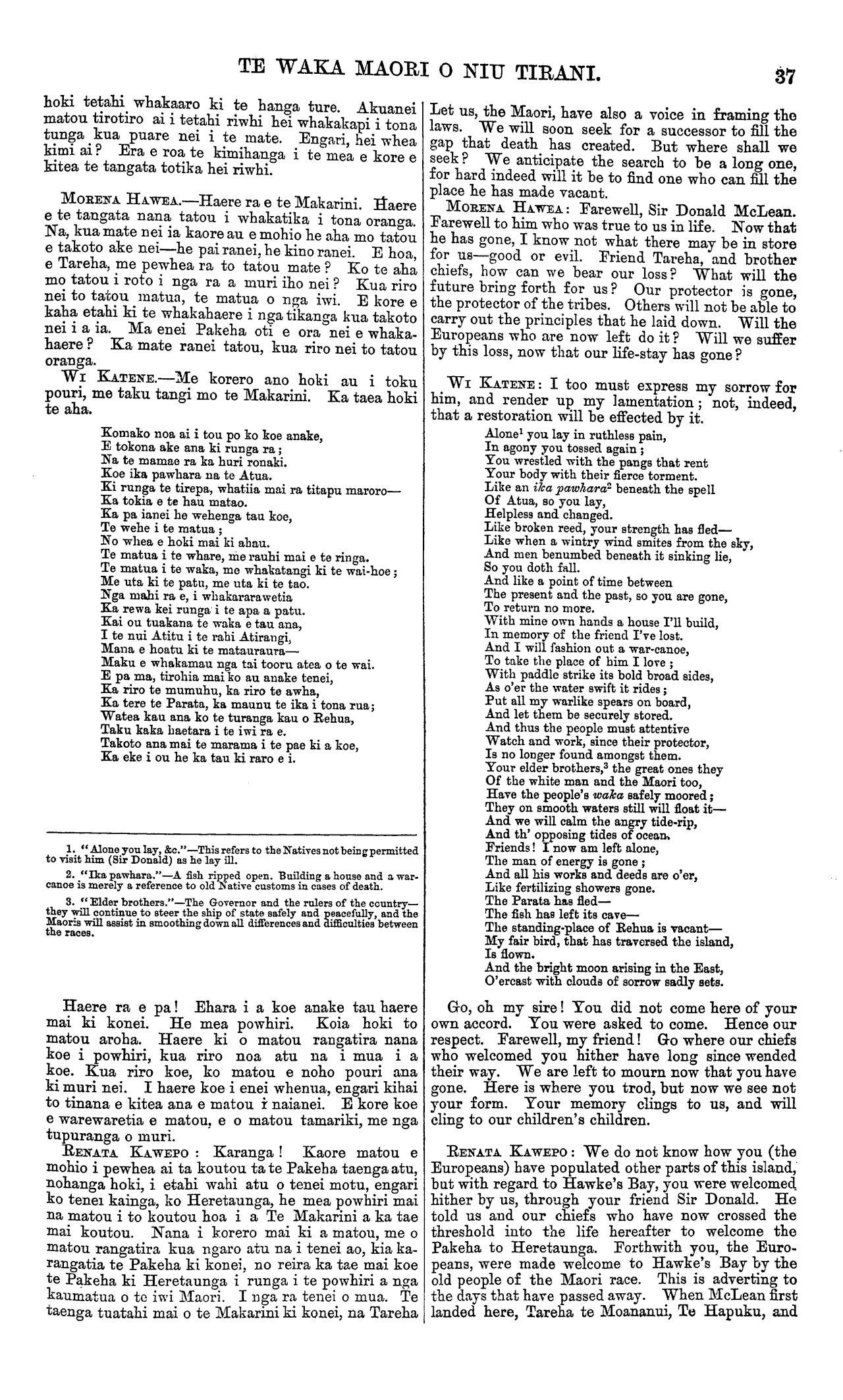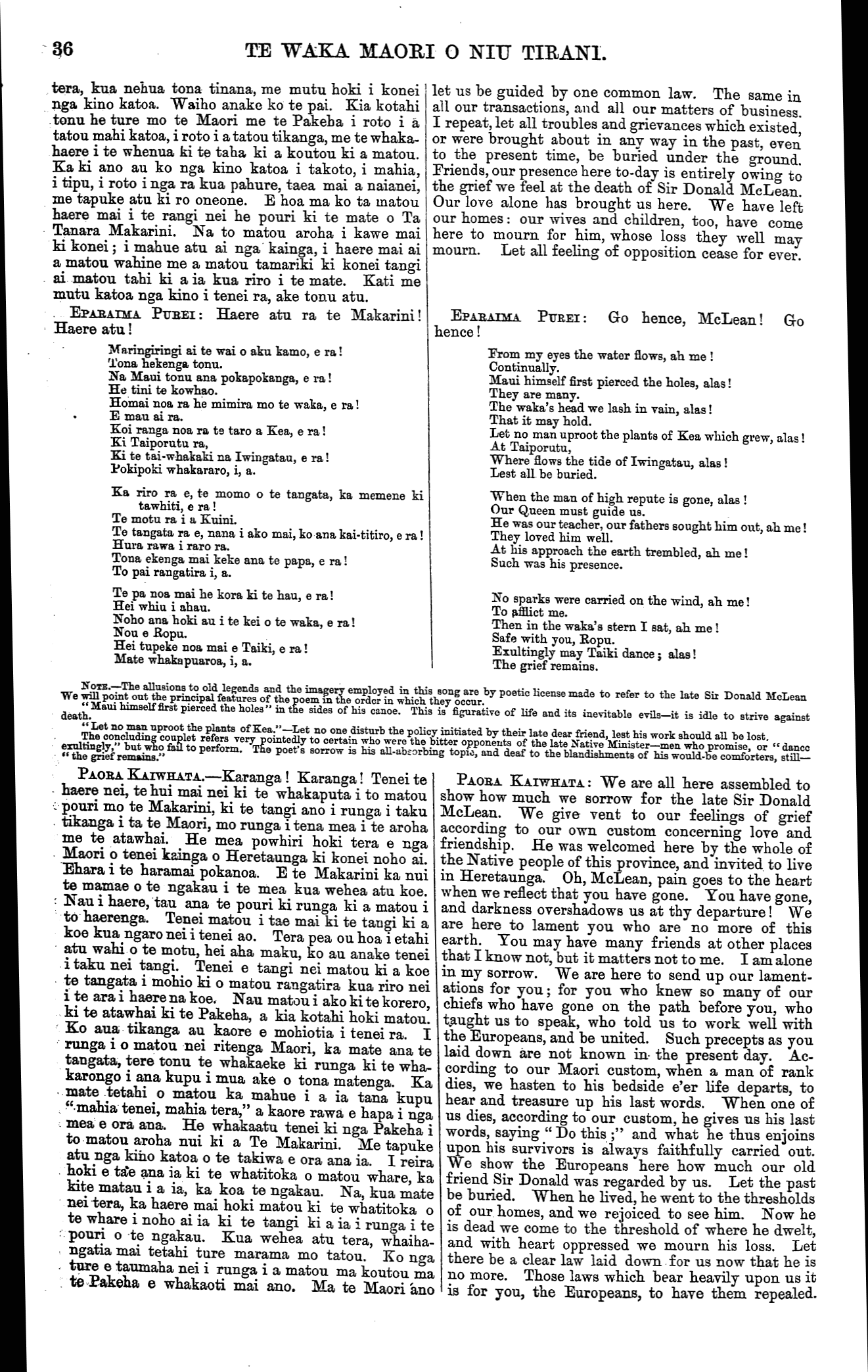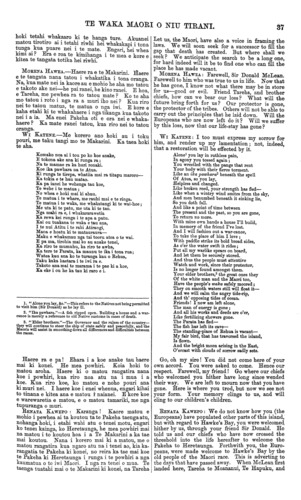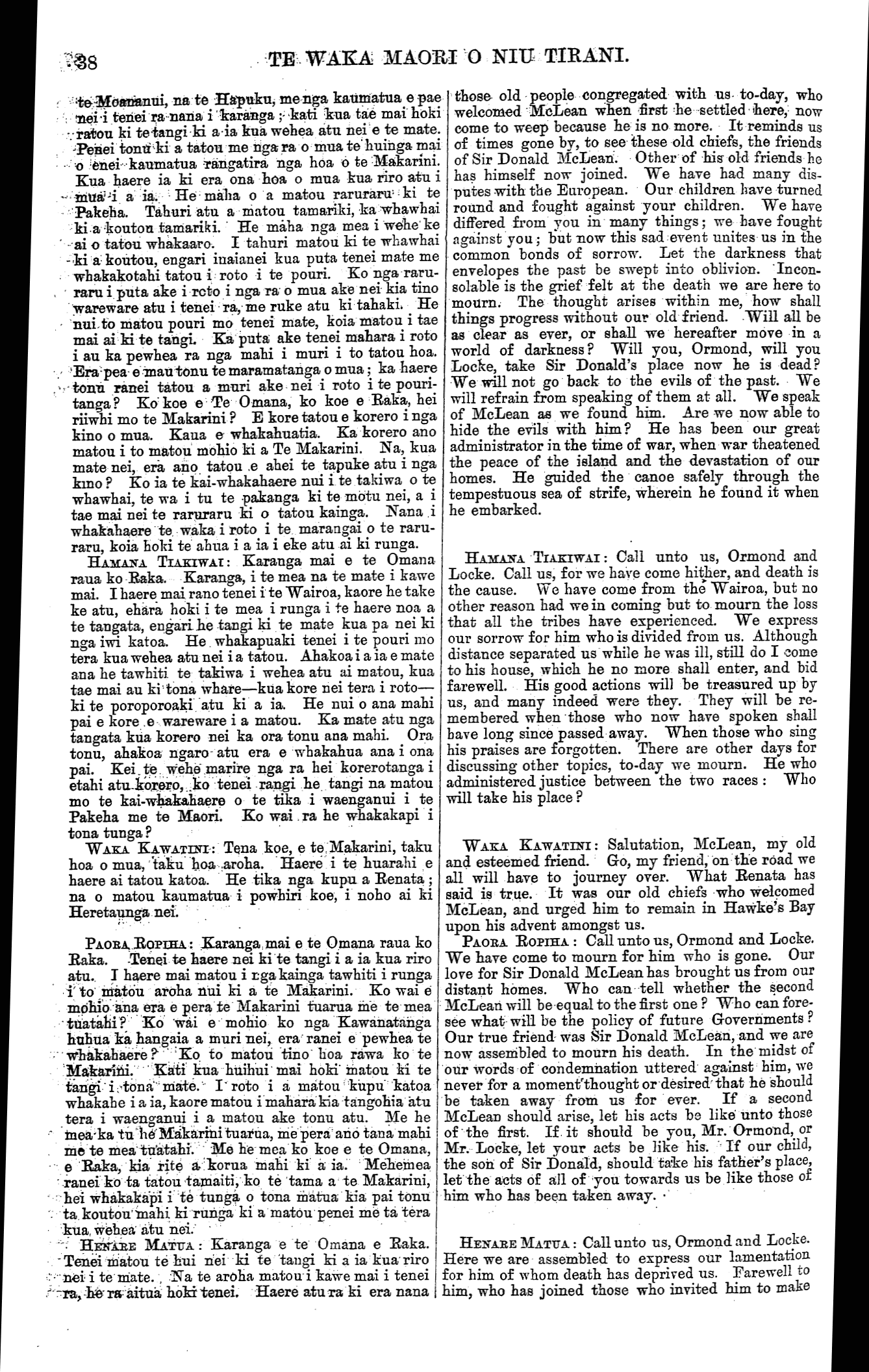 WAKA MAORI O NIU TIRANI. te Moananui, na te Hapuku me nga kaumatua e pae nei i tenei ra nana i karanga ; kati kua tae mai hoki ratou ki te tangi ki a ia kua wehea atu nei e te mate. Penei tonutia a tatou me nga ra o mua te huinga mai o enei kaumatua rangatira nga hoa 6 te Makarini. Kua haere ia ki era ona hoa o mua kua riro atu i mua i a ia. He maha o a matou raruraru ki te Pakeha. Tahuri atu a matou tamariki, ka whawhai ki a koutou tamariki. He maha nga mea i wehe ke ai o tatou whakaaro. I tahuri matou ki te whawhai ki a koutou, engari inaianei kua puta tenei mate me whakakotahi tatou i roto i te pouri. Ko nga raru- raru i puta ake i roto i nga ra o mua ake nei kia tino wareware atu i tenei ra, me ruke atu ki tahaki. He nui to matou pouri mo tenei mate, koia matou i tae mai ai ki te tangi. Ka puta ake tenei mahara i roto i au ka pewhea ra nga mahi i muri i to tatou hoa. Era pea e inati tonu te maramatanga o mua; ka haere tonu ranei tatou a muri ake nei i roto i te pouri- tanga? Ko koe e Te Omana, ko koe e Raka, hei riiwhi mo te Makarini ? E kore tatou e korero i nga kino o mua. Kaua e whakahuatia. Ka korero ano matou i to matou mohio ki a Te Makarini. Na, kua mate nei, era ano tatou ,e ahei te tapuke atu i nga kino ? Ko ia te kai-whakahaere nui i te takiwa o te whawhai, te wa i tu te pakanga ki te motu nei, a i tae mai nei te raruraru ki o tatou kainga. Nana i whakahaere te waka i roto i te marangai o te raru- raru, koia hoki te alma i a ia i eke atu ai ki runga. HAMANA TIAKIWAI : Karanga mai e te Omana raua ko Raka. Karanga, i te mea na te mate i kawe mai. I haere mai rano tenei i te Wairoa, kaore he take ke atu, ehara hoki i te mea i runga i te haere noa a te tangata, engari, he tangi ki te mate kua pa nei ki nga iwi katoa. He whakapuaki tenei i te pouri mo tera kua wehea atu nei i a tatou. Ahakoa i a ia e mate ana he tawhiti, te takiwa i wehea atu ai matou, kua tae mai au ki tona whare—kiia kore nei tera i roto— ki te poroporoaki atu ki a ia. He nui o ana mahi pai e kore , e wareware i a matou. Ka mate atu nga tangata kua korero nei ka ora tonu ana mahi. Ora tonu, ahakoa ngaro atu era e whakahua ana i ona pai. Kei te wehe marire nga ra hei korerotanga i etahi atu-korero ko tenei rangi he tangi na matou mo te kai-whakahaere o te tika i waenganui i te Pakeha me te Maori. Ko wai ra he whakakapi i tona tunga? WAKA KAWATINI: Tena koe, e te Makarini, taku hoa o mua, taku hoa aroha. Haere i te huarahi e haere ai tatou katoa. He tika nga kupu a Renata ; na o matou kaumatua i powhiri koe, i noho ai ki Heretaunga nei. PAORA ROPIHA : Karanga mai e te Omana raua ko Raka. -Tenei te haere nei ki te tangi i a ia kua riro atu. I haere mai matou i nga kainga tawhiti i runga i to matou aroha nui ki a te Makarini. Ko wai e mohio ana era e pera te Makarini tuarua me te mea tuatahi? Ko wai e mohio ko nga Kawanatanga huhua ka hangaia a muri nei, era ranei e pewhea te whakahaere? Ko to matou tino hoa rawa ko te Makarini. Kati kua huihui mai hoki matou ki te tangi i tona mate. I roto i a matou kupu katoa whakahe i a ia, kaore matou i mahara kia tangohia atu tera i waenganui i a matou ake tonu atu. Me he mea ka tu he Makarini tuarua, me pera ano tana mahi me te mea tuatahi. Me he mea ko koe e te Omana, e Raka, kia rite korua mahi ki a ia. Mehemea ranei ko ta tatou tamaiti, ko te tama a te Makarini, hei whakakapi i te tunga o tona matua kia pai tonu ta koutou mahi ki runga ki a matou penei me ta tera kua wehea atu nei. HENARE MATUA : Karanga e te Omana e Raka. Tenei matou te hui nei ki te tangi ki a ia kua riro nei i te mate. , Na te aroha matou i kawe mai i tenei ra, he ra aitua hoki tenei. Haere atu ra ki era nana those old people congregated with us to-day, who welcomed McLean when first he settled here, now come to weep because he is no more. It reminds us of times gone by, to see these old chiefs, the friends of Sir Donald McLean. Other of his old friends he has himself now joined. We have had many dis- putes with the European. Our children have turned round and fought against your children. We have differed from you in many things; we have fought against you; but now this sad event unites us in the common bonds of sorrow. Let the darkness that envelopes the past be swept into oblivion. Incon- solable is the grief felt at the death we are here to mourn. The thought arises within me, how shall things progress without our old friend. Will all be as clear as ever, or shall we hereafter move in a world of darkness? Will you, Ormond, will you Locke, take Sir Donald's place now he is dead? We will not go back to the evils of the past. We will refrain from speaking of them at all. We speak of McLean as we found him. Are we now able to hide the evils with him? He has been our great administrator in the time of war, when war theatened the peace of the island and the devastation of our homes. He guided the canoe safely through the tempestuous sea of strife, wherein he found it when he embarked. HAMANA TIAKIWAI : Call unto us, Ormond and Locke. Call us, for we have come hither, and death is the cause. We have come from the Wairoa, but no other reason had we in coming but to mourn the loss that all the tribes have experienced. We express our sorrow for him who is divided from us. Although distance separated us while he was ill, still do I come to his house, which he no more shall enter, and bid farewell. His good actions will be treasured up by us, and many indeed were they. They will be re- membered when those who now have spoken shall have long since passed away. When those who sing his praises are forgotten. There are other days for discussing other topics, to-day we mourn. He who administered justice between the two races : Who will take his place ? WAKA KAWATINI: Salutation, McLean, my old and esteemed friend. Go, my friend, on the road we all will have to journey over. What Renata has said is true. It was our old chiefs who welcomed McLean, and urged him to remain in Hawke's Bay upon his advent amongst us.