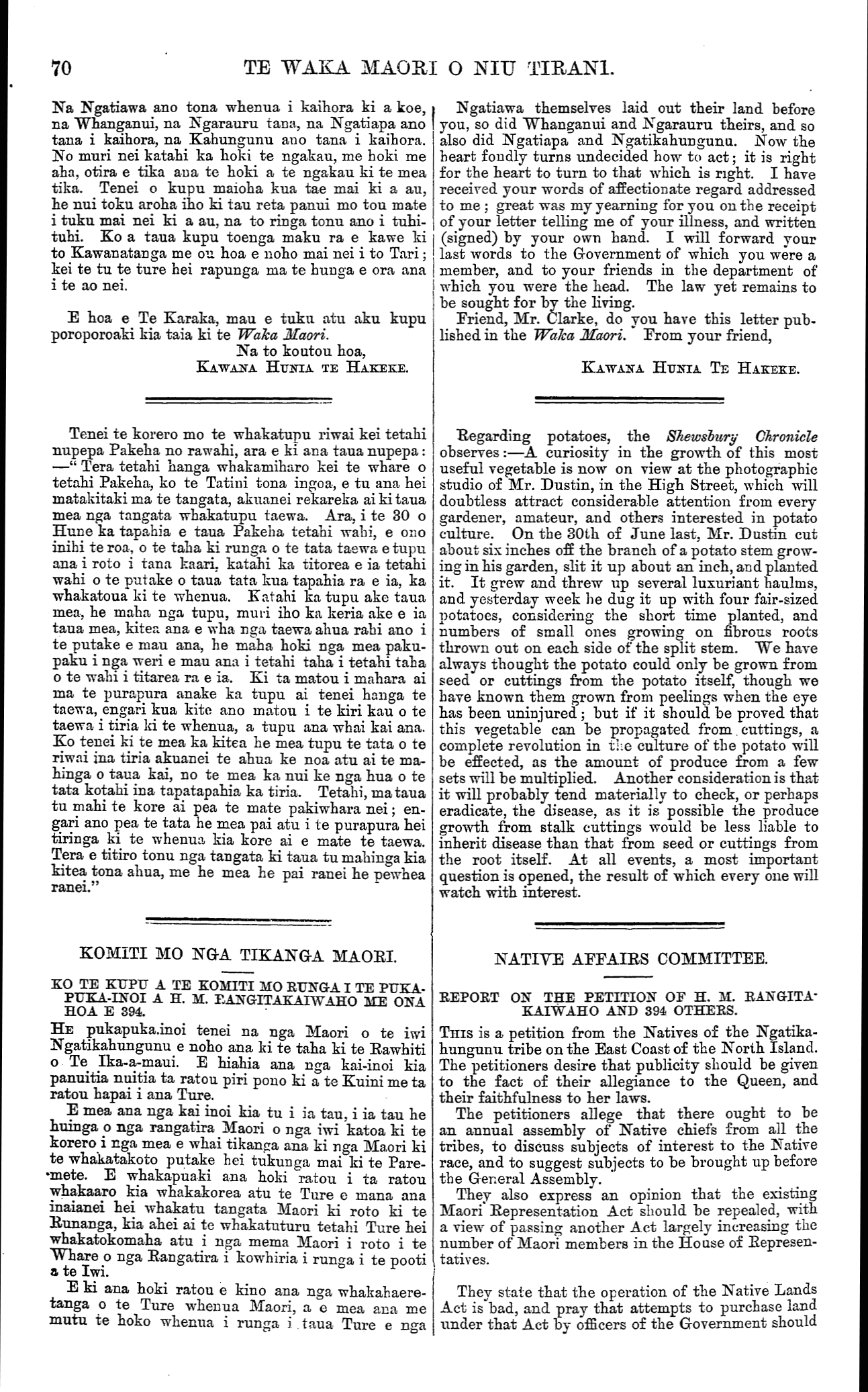 TE WAKA MAORI O NIU TIRANI. Na Ngatiawa ano tona whenua i kaihora ki a koe, na Whanganui, na Ngarauru tana, na Ngatiapa ano tana i kaihora, na Kahungunu ano tana i kaihora. No muri nei katahi ka hoki te ngakau, me hoki me ata, otira e tika aua te hoki a te ngakau ki te mea tika. Tenei o kupu maioha kua tae mai ki a au, he nui toku aroha iho ki tau reta panui mo tou mate i tuku mai nei ki a au, na to ringa tonu ano i tuhi- tuhi. Ko a taua kupu toenga maku ra e kawe ki to Kawanatanga me ou hoa e noho mai nei i to Tari; kei te tu te ture hei rapunga ma te hunga e ora ana i te ao nei. E hoa e Te Karaka, mau e tuku atu aku kupu poroporoaki kia taia ki te Waka Maori. Na to koutou hoa, KAWANA HUNIA TE HAKEKE. Tenei te korero mo te whakatupu riwai kei tetahi nupepa Pakeha no rawahi, ara e ki ana taua nupepa: —" Tera tetahi hanga whakamiharo kei te whare o tetahi Pakeha, ko te Tatini tona ingoa, e tu ana hei matakitaki ma te tangata, akuanei rekareka ai ki taua mea nga tangata whakatupu taewa. Ara, i te 30 o Hune ka tapahia e taua Pakeha tetahi wahi, e ono inihi te roa, o te taha ki runga o te tata taewa e tupu ana i roto i tana kaari, katahi ka titorea e ia tetahi wahi o te putake o taua tata kua tapahia ra e ia, ka whakatoua ki te whenua. Katahi ka tupu ake taua mea, he inaha nga tupu, muri iho ka keria ake e ia taua mea, kitea ana e wha nga taewa ahua rahi ano i te putake e mau ana, he maha hoki nga mea paku- paku i nga weri e mau ana i tetahi taha i tetahi taha o te wahi i titarea ra e ia. Ki ta matou i mahara ai ma te purapura anake ka tupu ai tenei hanga te taewa, engari kua kite ano matou i te kiri kau o te taewa i tiria ki te whenua, a tupu ana whai kai ana. Ko tenei ki te mea ka kitea he mea tupu te tata o te riwai ina tiria akuanei te ahua ke noa atu ai te ma- hinga o taua kai, no te mea ka nui ke nga hua o te tata kotahi ina tapatapahia ka tiria. Tetahi, ma taua tu mahi te kore ai pea te mate pakiwhara nei; en- gari ano pea te tata he mea pai atu i te purapura hei tiringa ki te whenua kia kore ai e mate te taewa. Tera e titiro tonu nga tangata ki taua tu mahinga kia kitea tona ahua, me he mea he pai ranei he pewhea ranei." KOMITI MO NGA TIKANGA MAORI. KO TE KUPU A TE KOMITI MO RUNGA I TE PUKA- PUKA-INOI A H. M. RANGITAKAIWAHO ME ONA HOA E 394. HE pukapuka.inoi tenei na nga Maori o te iwi Ngatikahungunu e noho ana ki te taha ki te Rawhiti o Te Ika-a-maui. E hiahia ana nga kai-inoi kia panuitia nuitia ta ratou piri pono ki a te Kuini me ta ratou hapai i ana Ture. E mea ana nga kai inoi kia tu i ia tau, i ia tau he huinga o nga rangatira Maori o nga iwi katoa ki te korero i nga mea e whai tikanga ana ki nga Maori ki te whakatakoto putake hei tukunga mai ki te Pare- mete. E whakapuaki ana hold ratou i ta ratou whakaaro kia whakakorea atu te Ture e mana ana inaianei hei whakatu tangata Maori ki roto ki te Runanga, kia ahei ai te whakatuturu tetahi Ture hei whakatokomaha atu i nga mema Maori i roto i te Whare o nga Rangatira i kowhiria i runga i te pooti a te Iwi. E ki ana hoki ratou e kino ana nga whakahaere- tanga o te Ture whenua Maori, a e mea ana me mutu te hoko whenua i runga i taua Ture e nga Ngatiawa themselves laid out their land before you, so did Whanganui and Ngarauru theirs, and so also did Ngatiapa and Ngatikahungunu. Now the heart fondly turns undecided how to act; it is right for the heart to turn to that which is right. I have received your words of affectionate regard addressed to me ; great was my yearning for you on the receipt of your letter telling me of your illness, and written (signed) by your own hand. I will forward your last words to the Government of which you were a member, and to your friends in the department of which you were the head. The law yet remains to be sought for by the living. Friend, Mr. Clarke, do you have this letter pub- lished in the Waka Maori. From your friend, KAWANA HUNIA TE HAKEKE. Regarding potatoes, the Shewsbury Chronicle observes:—A curiosity in the growth of this most useful vegetable is now on view at the photographic studio of Mr. Dustin, in the High Street, which will doubtless attract considerable attention from every gardener, amateur, and others interested in potato culture. On the 30th of June last, Mr. Dustin cut about six inches off the branch of a potato stem grow- ing in his garden, slit it up about an inch, and planted it. It grew and threw up several luxuriant haulms, and yesterday week he dug it up with four fair-sized potatoes, considering the short time planted, and numbers of small, ones growing on fibrous roots thrown out on each side of the split stem. We have always thought the potato could only be grown from seed or cuttings from the potato itself, though we have known them grown from peelings when the eye has been uninjured; but if it should be proved that this vegetable can be propagated from. cuttings, a complete revolution in the culture of the potato will be effected, as the amount of produce from a few sets will be multiplied. Another consideration is that it will probably tend materially to check, or perhaps eradicate, the disease, as it is possible the produce growth from stalk cuttings would be less liable to inherit disease than that from seed or cuttings from the root itself. At all events, a most important question is opened, the result of which every one will watch with interest. NATIVE AFFAIRS COMMITTEE. REPORT ON THE PETITION OF H. M. RANGITA- KAIWAHO AND 394 OTHERS. THIS is a petition from the Natives of the Ngatika- hungunu tribe on the East Coast of the North Island. The petitioners desire that publicity should be given to the fact of their allegiance to the Queen, and their faithfulness to her laws. The petitioners allege that there ought to be an annual assembly of Native chief's from all the tribes, to discuss subjects of interest to the Native race, and to suggest subjects to be brought up before the General Assembly. They also express an opinion that the existing Maori* Representation Ac