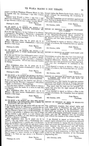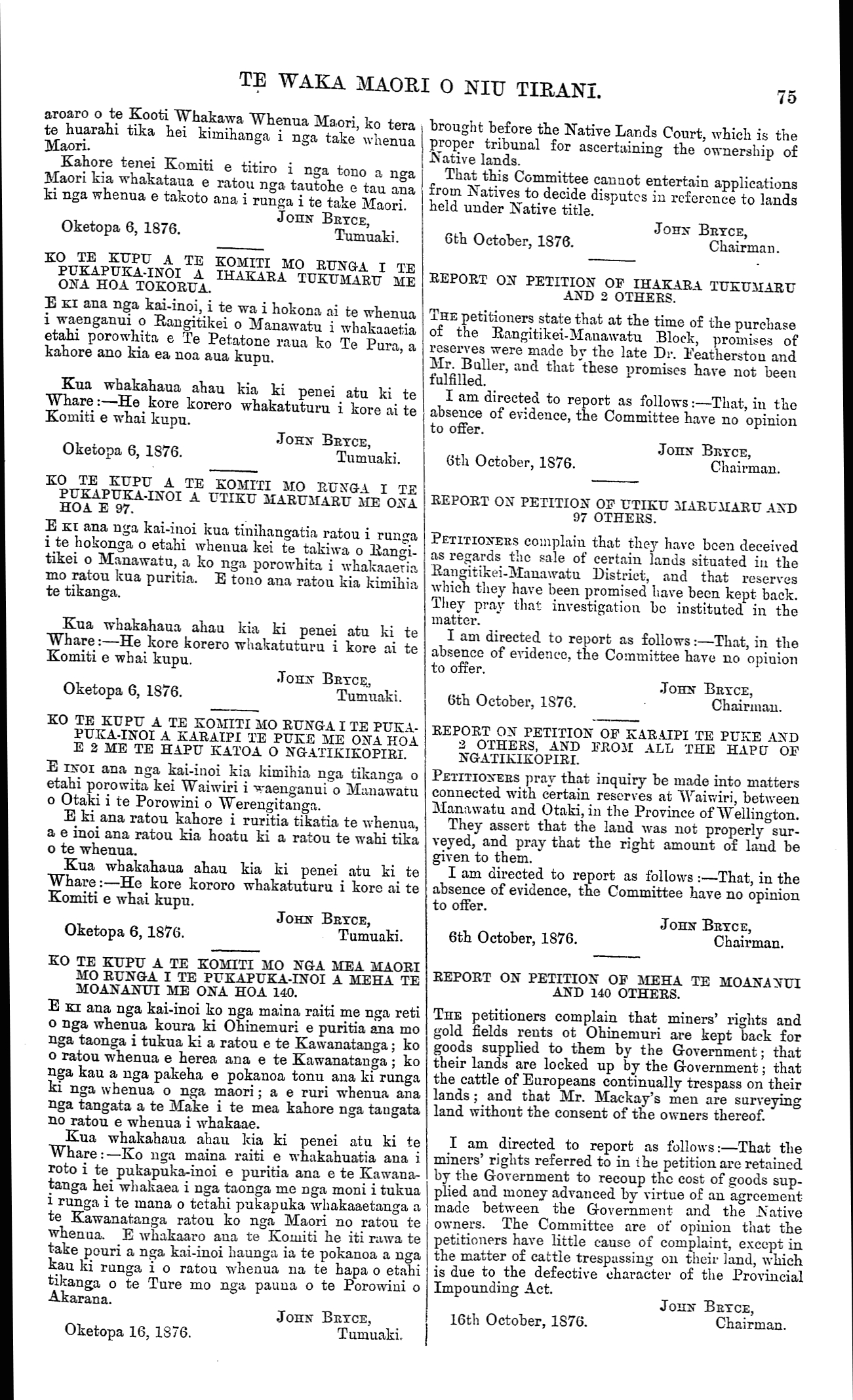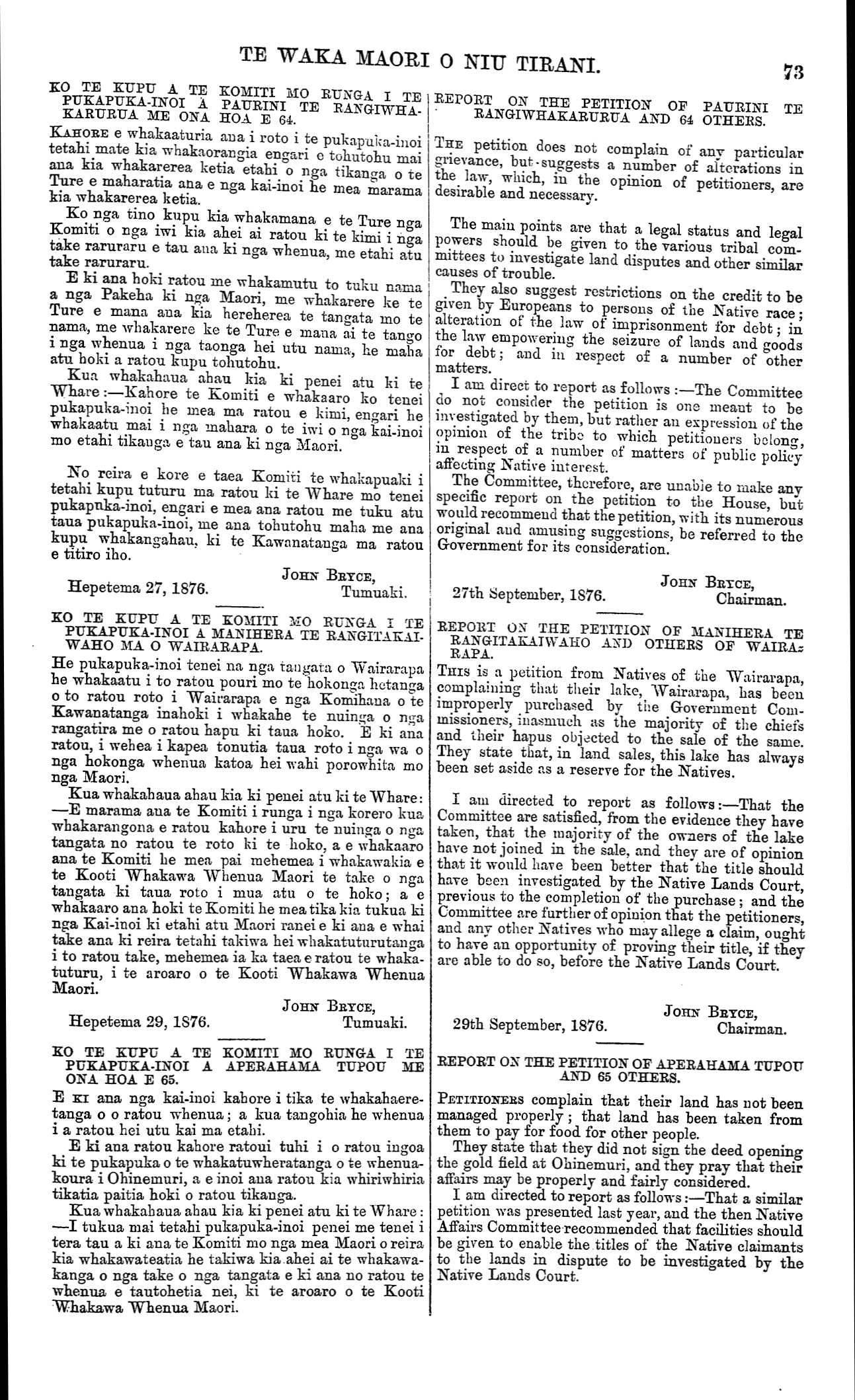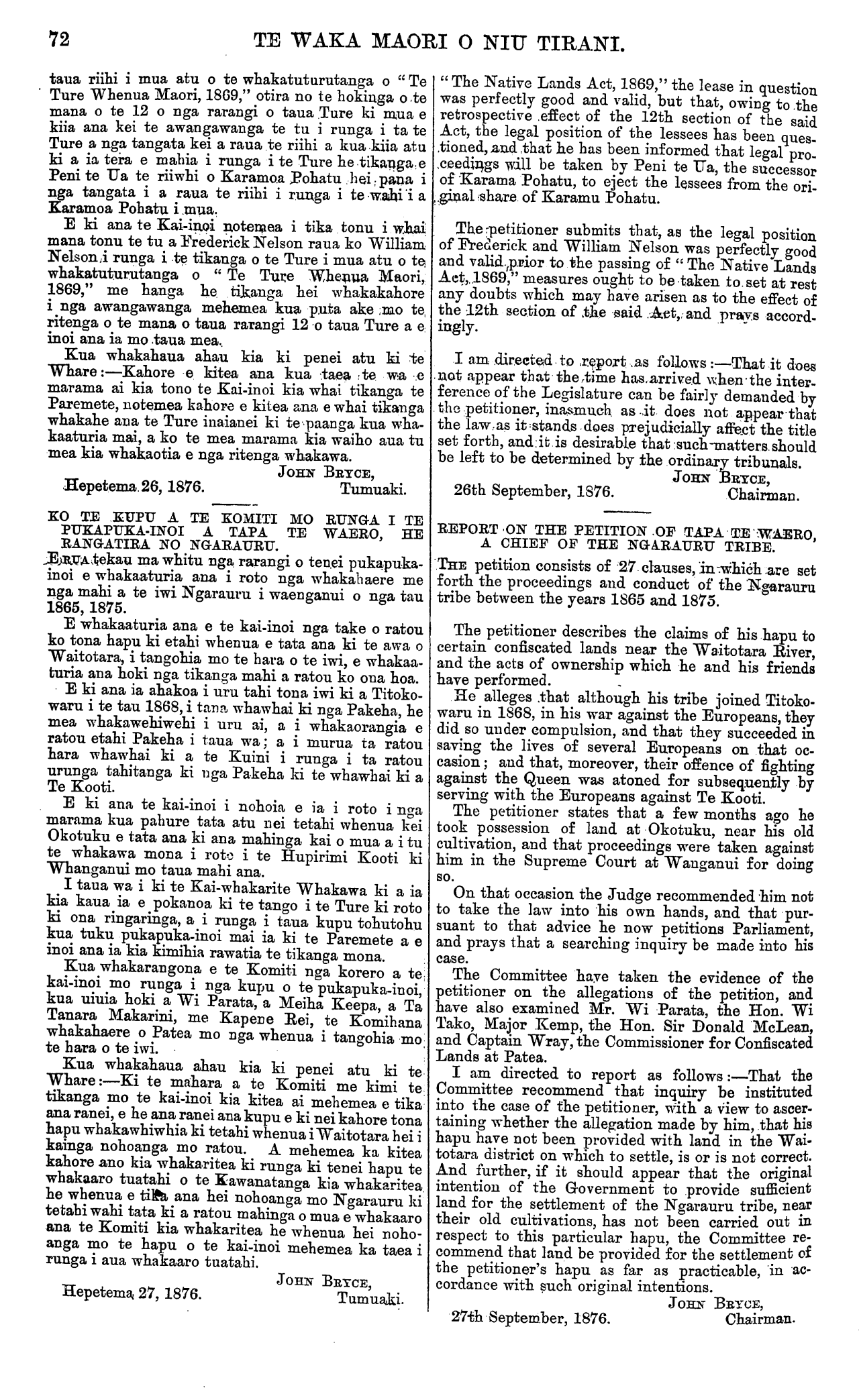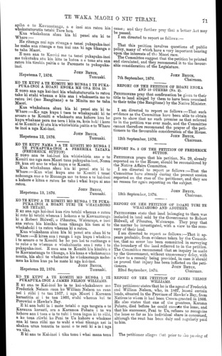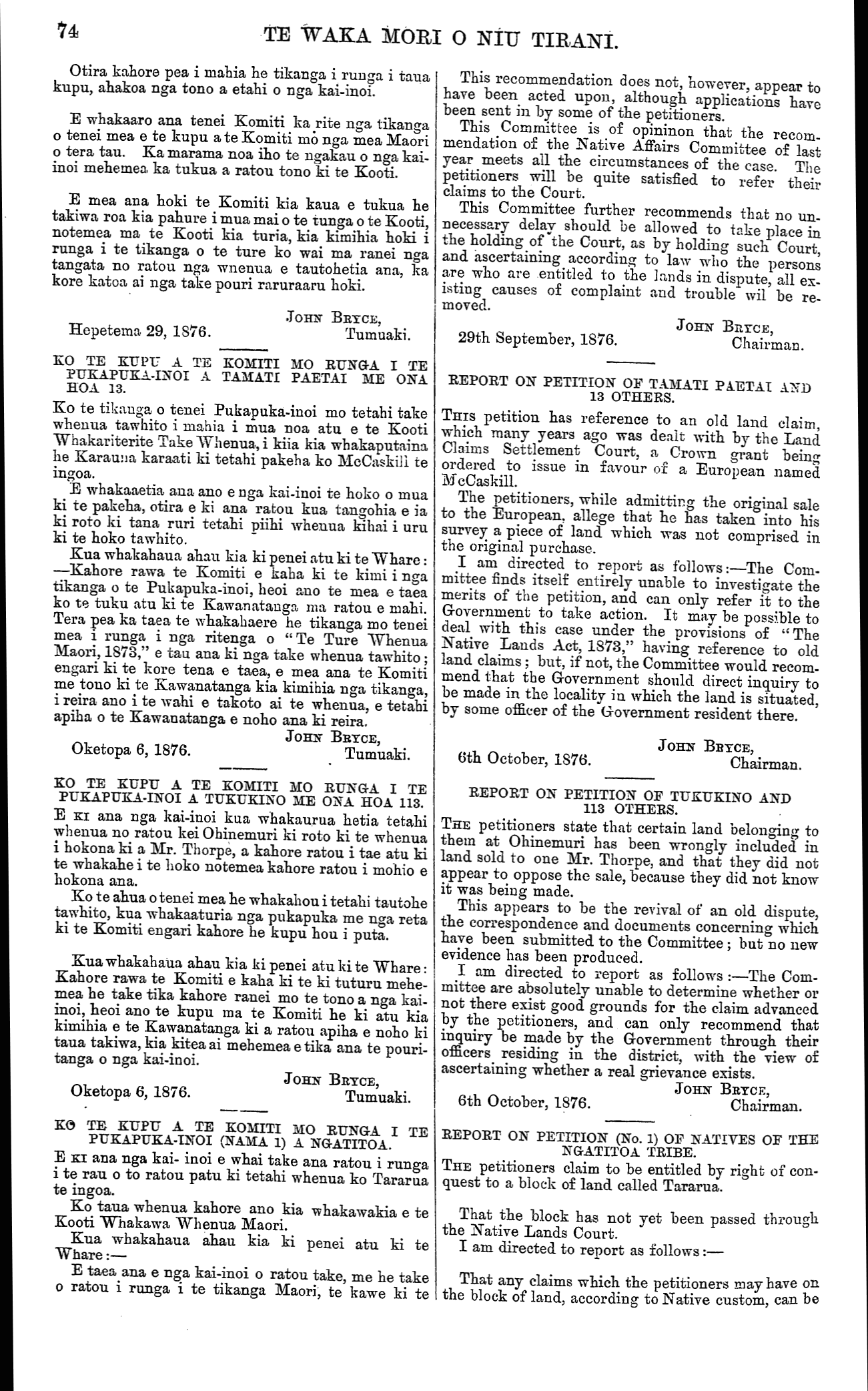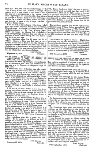 TE WAKA MAORI O NIU TIRANI. KO TE KUPU A TE KOMITI MO RUNGA I TE PUKAPUKA-INOI A PAURINI TE RANGIWHA- KARURUA ME ONA HOA E 64. KAHORE e whakaaturia ana i roto i te pukapuka-inoi tetahi mate kia whakaorangia engari e tohutohu mai ana kia whakarerea ketia etahi o nga tikanga o te Ture e maharatia ana e nga kai-inoi he mea marama kia whakarerea ketia. Ko nga tino kupu kia whakamana e te Ture nga Komiti o nga iwi kia ahei ai ratou ki te kimi i nga take raruraru e tau aua ki nga whenua, me etahi atu take raruraru. E ki ana hoki ratou me whakamutu to tuku nama a nga Pakeha ki nga Maori, me whakarere ke te Ture e mana aua kia hereherea te tangata mo te nama, me whakarere ke te Ture e inana ai te tango i nga whenua i nga taonga hei utu nama, he maha atu hoki a ratou kupu tohutohu. Kua whakahaua ahau kia ki penei atu ki te Whare:—Kahore te Komiti e whakaaro ko tenei pukapuka-inoi he mea ma ratou e kimi, engari he whakaatu mai i nga mahara o te iwi o nga kai-inoi mo etahi tikanga e tau ana ki nga Maori. No reira e kore e taea Komiti te whakapuaki i tetahi kupu tuturu ma ratou ki te Whare mo tenei pukapnka-inoi, engari e mea ana ratou me tuku atu taua pukapuka-inoi, me ana tohutohu maha me ana kupu whakangahau, ki te Kawanatanga ma ratou e titiro iho. JOHN BRYCE, Hepetema 27, 1876.Tumuaki. KO TE KUPU A TE KOMITI MO RUNGA I TE PUKAPUKA-INOI A MANIHERA TE RANGITAKAI- WAHO MA O WAIRARAPA. He pukapuka-inoi tenei na nga tangata o Wairarapa he whakaatu i to ratou pouri mo te hokonga hetanga o to ratou roto i Wairarapa e nga Komihana o te Kawanatanga inahoki i whakahe te nuinga o nga rangatira me o ratou hapu ki taua hoko. E ki ana ratou, i wehea i kapea tonutia taua roto i nga wa o nga hokonga whenua katoa hei wahi porowhita mo nga Maori. Kua whakahaua ahau kia ki penei atu ki te Whare: —E marama aua te Komiti i runga i nga korero kua whakarangona e ratou kahore i uru te nuinga o nga tangata no ratou te roto ki te hoko, a e whakaaro ana te Komiti he mea pai mehemea i whakawakia e te Kooti Whakawa Whenua Maori te take o nga tangata ki taua roto i mua atu o te hoko; a e whakaaro ana hoki te Komiti he mea tika kia tukua ki nga Kai-inoi ki etahi atu Maori ranei e ki ana e whai take ana ki reira tetahi takiwa hei whakatuturutanga i to ratou take, mehemea ia ka taea e ratou te whaka- tuturu, i te aroaro o te Kooti Whakawa Whenua Maori. JOHN BRYCE, Hepetema 29, 1876.Tumuaki. KO TE KUPU A TE KOMITI MO RUNGA I TE PUKAPUKA-INOI A APERAHAMA TUPOU ME ONA HOA E 65. E KI ana nga kai-inoi kahore i tika te whakahaere- tanga o o ratou whenua; a kua tangohia he whenua i a ratou hei utu kai ma etahi. E ki ana ratou kahore ratou i tuhi i o ratou ingoa ki te pukapuka o te whakatuwheratanga o te whenua- koura i Ohinemuri, a e inoi aua ratou kia whiriwhiria tikatia paitia hoki o ratou tikanga. Kua whakahaua ahau kia ki penei atu ki te Whare: —I tukua mai tetahi pukapuka-inoi penei me tenei i tera tau a ki ana te Komiti mo nga mea Maori o reira kia whakawateatia he takiwa kia.ahei ai te whakawa- kanga o nga take o nga tangata e ki ana no ratou te whenua e tautohetia nei, ki te aroaro o te Kooti Whakawa Whenua Maori. REPORT ON THE PETITION OF PAURINI TE RANGIWHAKARURUA AND 64 OTHERS. THE petition does not complain of any particular grievance, but suggests a number of alterations in the law, which, in the opinion of petitioners, are desirable and necessary. The main points are that a legal status and legal powers should be given to the various tribal com- mittees to investigate land disputes and other similar causes of trouble. They also suggest restrictions on the credit to be given by Europeans to persons of the Native race; alteration of the law of imprisonment for debt; in the law empowering the seizure of lands and goods for debt; and in respect of a number of other matters. I am direct to report as follows :—The Committee do not consider the petition is one meant to be investigated by them, but rather an expression of the opinion of the tribe to which petitioners belong, in respect of a number of matters of public policy affecting Native interest. The Committee, therefore, are unable to make any specific report on the petition to the House, but would recommend that the petition, with its numerous original and amusing suggestions, be referred to the Government for its consideration. JOHN BRYCE, 27th September, 1876.Chairman. REPORT ON THE PETITION OF MANIHERA TE RANGITAKAIWAHO AND OTHERS OF WAIRA RAPA. THIS is a petition from Natives of the Wairarapa, complaining that their lake, Wairarapa, has been improperly purchased by the Government Com- missioners, inasmuch as the majority of the chiefs and their hapus objected to the sale of the same. They state that, in land sales, this lake has always been set aside as a reserve for the Natives. I am directed to report as follows:—That the Committee are satisfied, from the evidence they have taken, that the majority of the owners of the lake have not joined in the sale, and they are of opinion that it would have been better that the title should have been investigated by the Native Lands Court, previous to the completion of the purchase; and the Committee are further of opinion that the petitioners, and any other Natives who may allege a claim, ought to have an opportunity of proving their title, if they are able to do so, before the Native Lands Court. JOHN BRYCE, 29th September, 1876.Chairman. REPORT ON THE PETITION OF APERAHAMA TUPOU AND 65 OTHERS. PETITIONERS complain that their land has not been managed properly; that land has been taken from them to pay for food for other people. They state that they did not sign the deed opening the gold field at Ohinemuri, and they pray that their affairs may be properly and fairly considered. I am directed to report as follows:—That a similar petition was presented last year, and the then Native Affairs Committee recommended that facilities should be given to enable the titles of the Native claimants to the lands in dispute to b