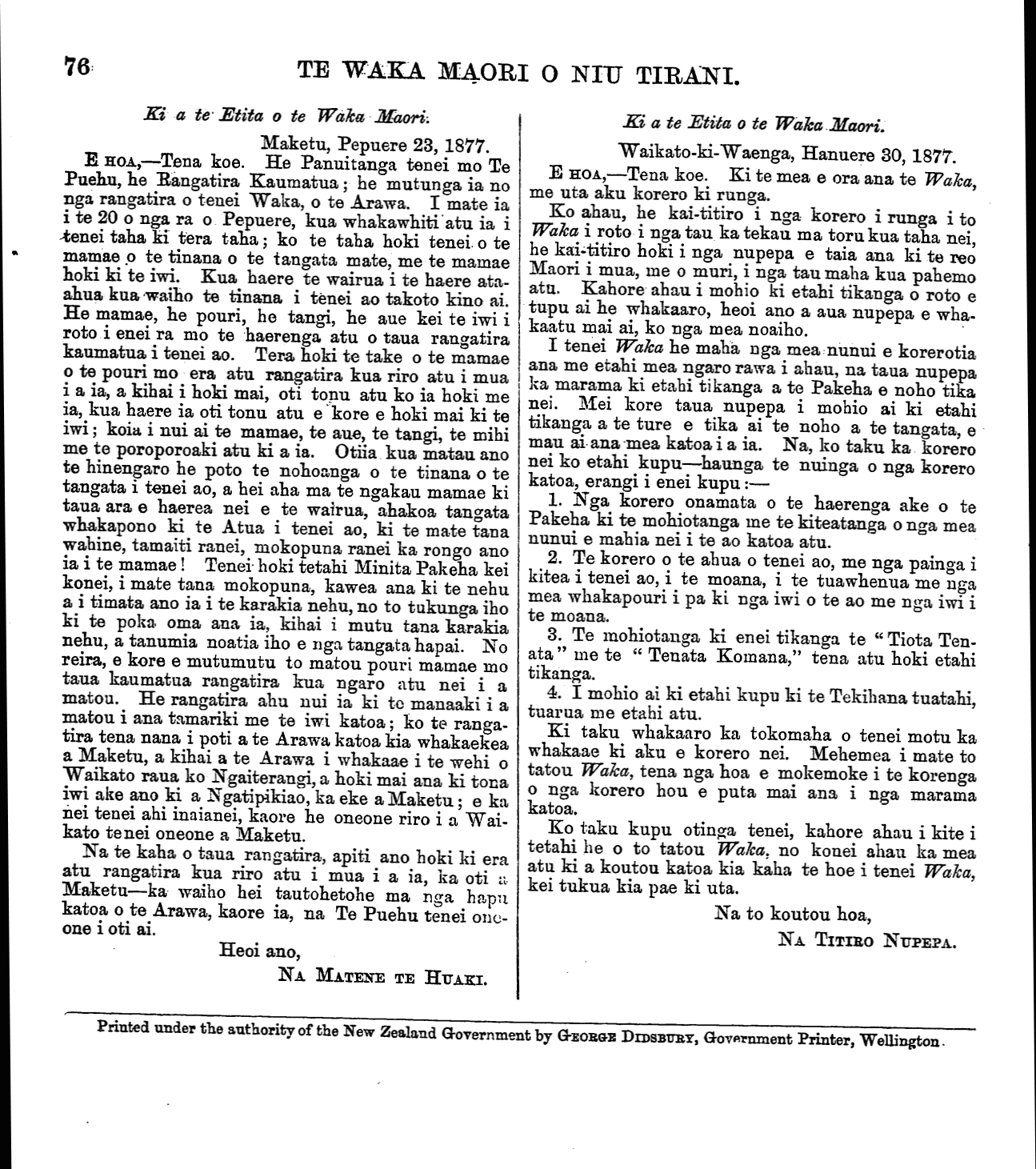 76 TE WAKA MAORI O NIU TIRANI. Ki a te Etita o te Waka Maori. Maketu, Pepuere 23, 1877. E HOA,—Tena koe. He Panuitanga tenei mo Te Puehu, he Rangatira Kaumatua; he mutunga ia no nga rangatira o tenei Waka, o te Arawa. I mate ia i te 20 o nga ra o Pepuere, kua whakawhiti atu ia i tenei taha ki tera taha; ko te taha hoki tenei o te mamae o te tinana o te tangata mate, me te mamae hoki ki te iwi. Kua haere te wairua i te haere ata- ahua kua waiho te tinana i tenei ao takoto kino ai. He mamae, he pouri, he tangi, he aue kei te iwi i roto i enei ra mo te haerenga atu o taua rangatira kaumatua i tenei ao. Tera hoki te take o te mamae o te pouri mo era atu rangatira kua riro atu i mua i a ia, a kihai i hoki mai, oti tonu atu ko ia hoki me ia, kua haere ia oti tonu atu e kore e hoki mai ki te iwi; koia i nui ai te mamae, te aue, te tangi, te mihi me te poroporoaki atu ki a ia. Otiia kua matau ano te hinengaro he poto te nohoanga o te tinana o te tangata i tenei ao, a hei aha ma te ngakau mamae ki taua ara e haerea nei e te wairua, ahakoa tangata whakapono ki te Atua i tenei ao, ki te mate tana wahine, tamaiti ranei, mokopuna ranei ka rongo ano ia i te mamae! Tenei hoki tetahi Minita Pakeha kei konei, i mate tana mokopuna, kawea ana ki te nehu a i timata ano ia i te karakia nehu, no to tukunga iho ki te poka oma ana ia, kihai i mutu tana karakia nehu, a tanumia noatia iho e nga tangata hapai. No reira, e kore e mutumutu to matou pouri mamae mo taua kaumatua rangatira kua ngaro atu nei i a matou. He rangatira aha nui ia ki to manaaki i a matou i ana tamariki me te iwi katoa; ko te ranga- tira tena nana i poti a te Arawa katoa kia whakaekea a Maketu, a kihai a te Arawa i whakaae i te wehi o Waikato raua ko Ngaiterangi, a hoki mai ana ki tona iwi ake ano ki a Ngatipikiao, ka eke a Maketu; e ka nei tenei ahi inaianei, kaore he oneone riro i a Wai- kato tenei oneone a Maketu. Na te kaha o taua rangatira, apiti ano hoki ki era atu rangatira kua riro atu i mua i a ia, ka oti a Maketu—ka waiho hei tautohetohe ma nga hapu katoa o te Arawa, kaore ia, na Te Puehu tenei one- one i oti ai. Heoi ano, NA MATENE TE HUAKI. Ki a te Etita o te Waka Maori. Waikato-ki-Waenga, Hanuere 30, 1877. E HOA,—Tena koe. Ki te mea e ora ana te Waka, me uta aku korero ki runga. Ko ahau, he kai-titiro i nga korero i runga i to Waka i roto i nga tau ka tekau ma toru kua taha nei, he kai-titiro hoki i nga nupepa e taia ana ki te reo Maori i mua, me o muri, i nga tau maha kua pahemo atu. Kahore ahau i mohio ki etahi tikanga o roto e tupu ai he whakaaro, heoi ano a aua nupepa e wha- kaatu mai ai, ko nga mea noaiho. I tenei Waka he maha nga mea nunui e korerotia ana me etahi mea ngaro rawa i ahau, na taua nupepa ka marama ki etahi tikanga a te Pakeha e noho tika nei. Mei kore taua nupepa i mohio ai ki etahi tikanga a te ture e tika ai te noho a te tangata, e mau ai ana mea katoa i a ia. Na, ko taku ka korero nei ko etahi kupu—haunga te nuinga o nga korero katoa, erangi i enei kupu:— 1. Nga korero onamata o te haerenga ake o te Pakeha ki te mohiotanga me te kiteatanga o nga mea nunui e mahia nei i te ao katoa atu. 2. Te korero o te ahua o tenei ao, me nga painga i kitea i tenei ao, i te moana, i te tuawhenua me nga mea whakapouri i pa ki nga iwi o te ao me nga iwi i te moana. 3. Te mohiotanga ki enei tikanga te " Tiota Ten- ata " me te " Tenata Komana," tena atu hoki etahi tikanga. 4. I mohio ai ki etahi kupu ki te Tekihana tuatahi, tuarua me etahi atu. Ki taku whakaaro ka tokomaha o tenei motu ka whakaae ki aku e korero nei. Mehemea i mate to tatou Waka, tena nga hoa e mokemoke i te korenga o nga korero hou e puta mai ana i nga marama katoa. Ko taka kupu otinga tenei, kahore ahau i kite i tetahi he o to tatou Waka, no konei ahau ka mea atu ki a koutou katoa kia kaha te hoe i tenei Waka, kei tukua kia pae ki uta. Na to koutou hoa, NA TITIRO NUPEPA. Printed under the authority of the New Zealand Government by GEORGE DIDSBURY, Government Printer, Wellington -