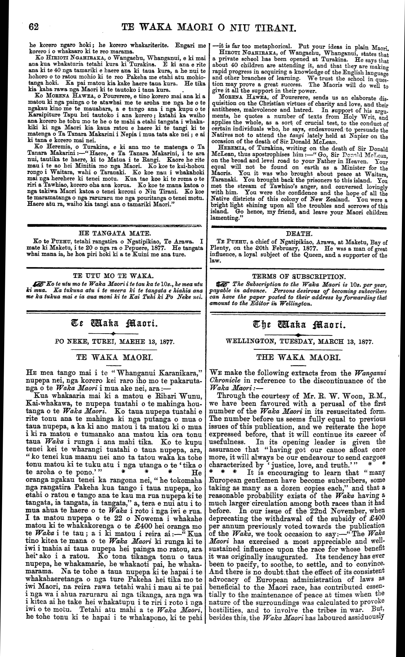 62 TE WAKA MAORI O NIU TIRANI. he korero ngaro hoki; he korero whakariterite. Engari me korero i o whakaaro ki te reo marama. Ko HIRIOTI NGAHIRAKA, o Wangaehu, Whanganui, e ki mai ana kua whakaturia tetahi kura ki Turakina. E ki ana e rite ana ki te 40 nga tamariki e haere ana ki taua kura, a he nui te hohoro o to ratou mohio ki te reo Pakeha me etahi atu mohio- tanga hoki. Ka pai matou kia kake haere taua kura. He tika kia kaha rawa nga Maori ki te tautoko i taua kura. Ko MORENA HAWEA, o Pourerere, e tino korero mai ana ki a matou ki nga painga o te atawhai me te aroha me nga he o te ngakau kino me te mauahara, a e tango ana i nga kupu o te Karaipiture Tapu hei tautoko i ana korero; katahi ka waiho ana korero he tohu mo te he o te mahi a etahi tangata i whaka- kiki ki nga Maori kia kaua ratou e haere ki te tangi ki te matenga o Ta Tanara Makarini i Nepia i mua tata ake nei ; e ai ki tana e korero mai nei. Ko Heremia, o Turakina, e ki ana mo te matenga o Ta Tanara Makarini :—" Haere, e Ta Tanara Makarini, i te ara nui, tautika te haere, ki to Matua i te Rangi. Kaore he rite mau i te ao hei Minitia mo nga Maori. Ko koe te kai-hohou rongo i Waitara, wahi o Taranaki. Ko koe nau i whakahoki mai nga herehere ki tenei motu. Kua tae koe ki te roma o te riri a Tawhiao, korero oha ana korua. Ko koe te mana katoa o nga takiwa Maori katoa o tenei koroni o Niu Tirani. Ko koe te maramatanga o nga raruraru me nga pouritanga o tenei motu. Haere atu ra, waiho kia tangi ana o tamariki Maori." HE TANGATA MATE. Ko te PUEHU, tetahi rangatira o Ngatipikiao, Te Arawa. I mate ki Maketu, i te 20 o nga ra o Pepuere, 1877. He tangata whai mana ia, he hoa piri hoki ki a te Kuini me ana ture. TE UTU MO TE WAKA. Ko te utu mo te Waka Maori i te tau ka te 10s., he mea utu ki mua. Ka tukuna atu i te meera ki te tangata e hiahia ana me ka tukua mai e ia aua moni ki te Kai Tuhi ki Po Neke nei. TE WAKA MAORI. PO NEKE, TUREI, MAEHE 13, 1877. TE WAKA MAORI. HE mea tango mai i te "Whanganui Karanikara," nupepa nei, nga korero kei raro iho mo te pakaruta- nga o te Waka Maori i mua ake nei, ara:— Kua whakaaria mai ki a matou e Rihari Wunu, Kai-whakawa, te nupepa tuatahi o te mahinga hou- tanga o te Waka Maori. Ko taua nupepa tuatahi e rite tonu ana te mahinga ki nga putanga o mua o taua nupepa, a ka ki ano matou i ta matou ki o mua i ki ra matou e tumanako ana matou kia ora tonu taua Waka i runga i ana mahi tika. Ko te kupu tenei kei te wharangi tuatahi o taua nupepa, ara, " ko tenei kua maanu nei ano ta tatou waka ka tohe tonu matou ki te tuku atu i nga utanga o te ' tika o te aroha o te pono.' " * ** He oranga ngakau tenei ka rangona nei, " he tokomaha nga rangatira Pakeha kua tango i taua nupepa, ko etahi o ratou e tango ana te kau ma rua nupepa ki te tangata, ia tangata, ia tangata," a, tera e nui atu i to mua ahua te haere o te Waka i roto i nga iwi e rua. I ta matou nupepa o te 22 o Nowema i whakahe matou ki te whakakorenga o te £400 hei oranga mo te Waka i te tau; a i ki matou i reira ai:—" Kua tino kitea te mana o te Waka Maori ki runga ki te iwi i mahia ai taua nupepa hei painga mo ratou, ara hei ako i a ratou. Ko tona tikanga tonu o taua nupepa, he whakamarie, he whakaoti pai, he whaka- marama. Na te tohe a taua nupepa ki te hapai i te whakahaeretanga o nga ture Pakeha hei tika mo te iwi Maori, na reira rawa tetahi wahi i mau ai te pai i nga wa i ahua raruraru ai nga tikanga, ara nga wa i kitea ai he take hei whakatupu i te riri i roto i nga iwi o te motu. Tetahi atu mahi a te Waka Maori, he tohe tonu ki te hapai i te whakapono, ki te pehi —it is far too metaphorical. Put your ideas in plain Maori. HIROTI NGAHIRAKA, of Wangaehu, Whanganui, states that a private school has been opened at Turakina. He says that about 40 children are attending it, and that they are making rapid progress in acquiring a knowledge of the English language and other branches of learning. We trust the school in ques- tion may prove a great success. The Maoris will do well to give it all the support in their power. MORENA HAWEA, of Pourerere, sends us an elaborate dis- quisition on the Christian virtues of charity and love, and their antitheses, malevolence and hatred. In support of his argu- ments, he quotes a number of texts from Holy Writ, and applies the whole, as a sort of crucial test, to the conduct of certain individuals who, he says, endeavoured-to persuade the Natives not to attend the tangi lately held at Napier on the occasion of the death of Sir. Donald McLean. HEREMIA, of Turakina, writing on the death of Sir Donald McLean, thus apostrophises him :—" Go, Sir Donald McLean, on the broad and level road to your Father in Heaven. Your equal will not be found on earth as a Minister for the Maoris. You it was who brought about peace at Waitara, Taranaki. You brought back the prisoners to this island. You met the stream of Tawhiao's anger, and conversed lovingly with him. You were the confidence and the hope of all the Native districts of this colony of New Zealand. You were a bright light shining upon all the troubles and sorrows of this island. Go hence, my friend, and leave your Maori children lamenting." DEATH. TE PUEHU, a chief of Ngatipikiao, Arawa, at Maketu, Bay of Plenty, on the 20TH February, 1877. He was a man of great influence, a loyal subject of the Queen, and a supporter of the law. TERMS OF SUBSCRIPTION. The Subscription to the Waka Maori is 10s. per year, payable in advance. Persons desirous of becoming subscribers can have the paper posted to their address by forwarding that amount to the Editor in Wellington. THE WAKA MAORI. WELLINGTON, TUESDAY, MARCH 13, 1877. THE WAKA MAORI. WE make the following extracts from the Wanganui Chronicle in reference to the discontinuance of the Waka Maori:— Through the courtesy of Mr. R. W. Woon, R.M., we have been favoured with a perusal of the first number of the Waka Maori in its resuscitated form. The number before us seems fully equal to previous issues of this publica