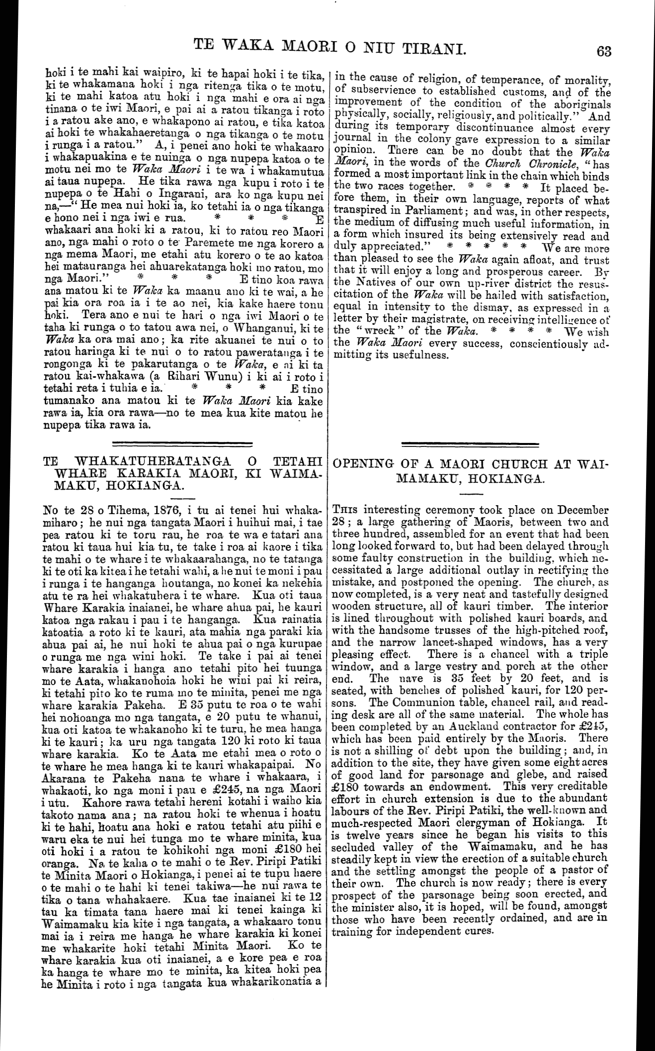 TE WAKA MAORI O NIU TIRANI. 63 hoki i te mahi kai waipiro, ki te hapai hoki i te tika, ki te whakamana hoki i nga ritenga tika o te motu, ki te mahi katoa atu hoki i nga mahi e ora ai nga tinana o te iwi Maori, e pai ai a ratou tikanga i roto i a ratou ake ano, e whakapono ai ratou, e tika katoa ai hoki te whakahaeretanga o nga tikanga o te motu i runga i a ratou." A, i penei ano hoki te whakaaro i whakapuakina e te nuinga o nga nupepa katoa o te motu nei mo te Waka Maori i te wa i whakamutua ai taua nupepa. He tika rawa nga kupu i roto i te nupepa o te Hahi o Ingarani, ara ko nga kupu nei na,—" He mea nui hoki ia, ko tetahi ia o nga tikanga e hono nei i nga iwi e rua. * * * E whakaari ana hoki ki a ratou, ki to ratou reo Maori ano, nga mahi o roto o te Paremete me nga korero a nga mema Maori, me etahi atu korero o te ao katoa hei matauranga hei ahuarekatanga hoki mo ratou, mo nga Maori." * * * E tino koa rawa ana matou ki te Waka ka maanu ano ki te wai, a he pai kia ora roa ia i te ao nei, kia kake haere tonu hoki. Tera ano e nui te hari o nga iwi Maori o te taha ki runga o to tatou awa nei, o Whanganui, ki te Waka ka ora mai ano; ka rite akuanei te nui o to ratou haringa ki te nui o to ratou paweratanga i te rongonga ki te pakarutanga o te Waka, e ai ki ta ratou kai-whakawa (a Rihari Wunu) i ki ai i roto i tetahi reta i tuhia e ia. * * * E tino tumanako ana matou ki te Waka Maori kia kake rawa ia, kia ora rawa—no te mea kua kite matou he nupepa tika rawa ia. TE WHAKATUHERATANGA O TETAHI WHARE KARAKIA MAORI, KI WAIMA- MAKU, HOKIANGA.. No te 28 o Tihema, 1876, i tu ai tenei hui whaka- miharo ; he nui nga tangata Maori i huihui mai, i tae pea ratou ki te toru rau, he roa te wa e tatari ana ratou ki taua hui kia tu, te take i roa ai kaore i tika te mahi o te whare i te whakaarahanga, no te tatanga ki te oti ka kitea i he tetahi wahi, a he nui te moni i pau i runga i te hanganga houtanga, no konei ka nekehia atu te ra hei whakatuhera i te whare. Kua oti taua Whare Karakia inaianei, he whare ahua pai, he kauri katoa nga rakau i pau i te hanganga. Kua rainatia katoatia a roto ki te kauri, ata mahia nga paraki kia ahua pai ai, he nui hoki te alma pai o nga kurupae o runga me nga wini hoki. Te take i pai ai tenei whare karakia i hanga ano tetahi pito hei tuunga mo te Aata, whakanohoia hoki he wini pai ki reira, ki tetahi pito ko te ruma mo te minita, penei me nga whare karakia Pakeha. E 35 putu te roa o te wahi hei nohoanga mo nga tangata, e 20 putu te whanui, kua oti katoa te whakanoho ki te turu, he mea hanga ki te kauri; ka uru nga tangata 120 ki roto ki taua whare karakia. Ko te Aata me etahi mea o roto o te whare he mea hanga ki te kauri whakapaipai. No Akarana te Pakeha nana te whare i whakaara, i whakaoti, ko nga moni i pau e £245, na nga Maori i utu. Kahore rawa tetahi hereni kotahi i waiho kia takoto nama ana; na ratou hoki te whenua i hoatu ki te hahi, hoatu ana hoki e ratou tetahi atu piihi e I waru eka te nui hei tunga mo te whare minita, kua oti hoki i a ratou te kohikohi nga moni £180 hei oranga. Na te kaha o te mahi o te Rev. Piripi Patiki te Minita Maori o Hokianga, i penei ai te tupu haere o te mahi o te hahi ki tenei takiwa—he nui rawa te tika o tana whakahaere. Kua tae inaianei ki te 12 tau ka timata tana haere mai ki tenei kainga ki Waimamaku kia kite i nga tangata, a whakaaro tonu mai ia i reira me hanga he whare karakia ki konei me whakarite hoki tetahi Minita Maori. Ko te whare karakia kua oti inaianei, a e kore pea e roa ka hanga te whare mo te minita, ka kitea hoki pea he Minita i roto i nga tangata kua whakarikonatia a in the cause of religion, of temperance, of morality, of subservience to established customs, and of the improvement of the condition of the aboriginals physically, socially, religiously, and politically." And during its temporary discontinuance almost every journal in the colony gave expression to a similar opinion. There can be no doubt that the Waka Maori, in the words of the Church Chronicle, " has formed a most important link in the chain which binds the two races together. * * * * It placed be- fore them, in their own language, reports of what transpired in Parliament; and was, in other respects, the medium of diffusing much useful information, in a form which insured its being extensively read and duly appreciated." We are more than pleased to see the Waka again afloat, and trust that it will enjoy a long and prosperous career. By the Natives of our own up-river district the resus- citation of the Waka will be hailed with satisfaction, equal in intensity to the dismay, as expressed in a letter by their magistrate, on receiving intelligence of the " wreck" of the Waka. * * * * We wish the Waka Maori every success, conscientiously ad- mitting its usefulness. OPENING OF A MAORI CHURCH AT WAI- MAMAKU, HOKIANGA. THIS interesting ceremony took place on December 28 ; a large gathering of Maoris, between two and three hundred, assembled for an event that had been long looked forward to, but had been delayed through some faulty construction in the building, which ne- cessitated a large additional outlay in rectifying the mistake, and postponed the opening. The church, as now completed, is a very neat and tastefully designed wooden structure, all of kauri timber. The interior is lined throughout with polished kauri boards, and with the handsome trusses of the high-pitched roof, and the narrow lancet-shaped windows, has a very pleasing effect. There is a chancel with a triple window, and a large vestry and. porch at the other end. The nave is 35 feet by 20 feet, and is seated, with benches of polished kauri, for 120 per- sons. The Communion table, chancel rail, and read- ing desk are all of the same material. The whole has been completed by au Auckland contractor for £245, which has been paid entirely by the Maoris. There is not a shilling of debt upon the building; and, in addition to the site, they have given some eight acres of good land for pars