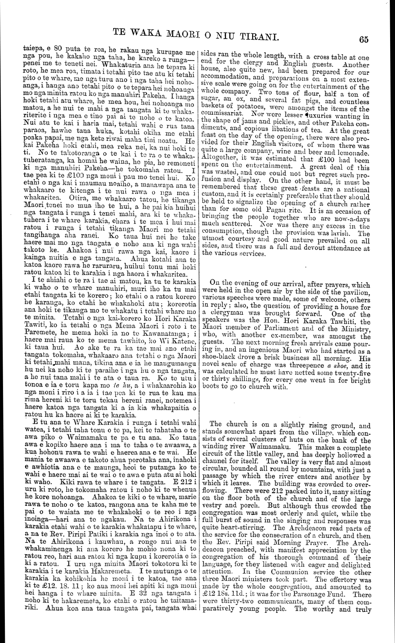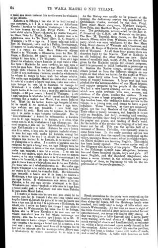 TE WAKA MAORI O NIU TIRANI. e mahi ana ratou inaianei kia mohio rawa ka whakatu ! ai hei Minita. Kahore a te Pihopa i tae ake ki te hui i te nui o ana raruraru, a i a ia e ngaro ana na Ahirikona Karaka i karakia te karakia whakatapu i te whare, ko tona tuarua ko te Rev. Piripi Patiki. I reira hoki etahi minita Maori tokotoru, ko Matiu Taupaki, ko Hare Peka ko Matiu Kapa. I haere mai a te Ahirikona raua ko Te Tuati (Rev. E. C. Stuart), i Waimate i te 26 o nga ra. I haere tahi mai hoki a Rev. M. Taupaki, i ahu mai ia i Paihia, Pewhairangi, 15 maero te mataratanga atu i Te Waimate, tutaki ana i a ratou ko Rev. Hare Peka—te rikona Maori o te Waimate, o Ohaeawae, raua ko Rev. M. Kapa, o Kaikohe, 10 maero te mamao atu o taua kainga ki tera taha o Te Waimate. Kua oti i nga Maori te whakatu whare karakia ki enei wahi e wha. Ko tera i Kaikohe he mea tawhito, ko nga mea e toru he mea hou. Kua hoatu e nga Maori o Kaikohe tetahi piihi whenua ki te hahi, e waru eka te nui, £150 te utu mehemea i hokona, meake ka whakaturia he whare ki runga ki taua wahi hei whare minita. He maha nga rangatira Maori me etahi atu i uru mai ki roto ki a matou e haere mai ana, i ahu mai ratou i nga kainga tu tata ki te huarahi, te taenga ki Whirinaki i te ahiahi kua tae matou nga tangata haere hoiho ki te rua te kau ; moe iho matou ki tenei kainga—e 40 pea maero i konei ki Waimate. I oti i nga tangata te whakatu tetahi teneti nui hei whare moenga mo a matou hoa Maori, kua maoa hoki te kai. Muri iho ka huihui katoa nga tangata ki roto ki te teneti ki te karakia, kiki rawa i nga tane, nga wahine me nga tamariki, i uru hoki nga manuhiri ki roto. Hari ana te ngakau te kitenga atu i te maha o nga tangata taitamariki. Ko te ' Kai-whakaako ' o konei he taitamariki, e karakia aua ia ki nga tangata o te kainga, a e ahua whai mana ana ia ki te whakahaere i nga tikanga pai. Ko enei tangata, e kiia nei he ' Kai-whakaako,' ko ratou nga Kai-karakia o te hahi. Kahore he utu e hoatu ana ki a ratou, a koa ana te ngakau inahoki ehara i te mea kei nga wiki anake ka karakia, erangi kei nga ra katoa i te ata i te ahiahi ka karanga i nga tangata kia huihui ki te karakia, ki te korero tahi i te pukapuka o te Atua. I a matou e karakia ana ka rangona te pere e tangi ana, na nga Pikopo tera, he torutoru noaiho o ratou e toe ana inaianei, i mua he maha nga tangata i uru ki a ratou. I te ata ka karakia ano matou, muri iho ka timata ano to matou haere; e tu ana tetahi .kura o te Kawanatanga i te taha o te huarahi, e 26 nga tamariki Maori e noho ana ki taua kura e whakaakona ana ki te reo Pakeha. No naia tata nei i whakatuheratia ai. He maha nga kupu whakapai a te mahita mo nga tamariki, he kaha no ratou ki te mahi, he atanoho hoki. He tokomaha nga tamariki e haere ana ki te kura i te takiwa o Hokianga, e tae ana pea ratou ki te 300—nga tane me nga kotiro. E whakaakona ana ratou ki te reo Pakeha, a he nui nga korero whakapai a te Kai- Whakawa mo ratou—inahoki e kite ana ia i nga hua o tenei mahi pai; e whakaaro nui ana taua Pakeha ki nga kura Maori katoa. I a matou e haere ana ka uru mai ano etahi ki to matou ope, ko te huarahi i ahu atu i ma tetahi awa kopiko haere ai, katahi ka puta ki te one ka haere ma tera a tae noa ki te rae i te ngutuawa o Hokianga, ka whati atu i reira ka haere ma runga i nga puke e tata ana ki Waimamaku ka heke iho ki te kainga Kitea atu te Whare Karakia e tu mai ana me te whare manuhiri kua tu hei whare nohoanga mo matou; kua tae to matou ope i konei ki te 50. E iri mai ana te kara i runga i tetahi rakau tiketike, ko nga tangata o te kainga e tatari ana ki a matou, e tu mai ana i roto i tetahi wahi kua oti te taiepa mo te hui nei, te tatanga atu ka karanga ratou Haere mai I whakaturia, te whare manuihiri ki te taha o te As the Bishop was unable to be present at the opening, the dedicatory service was conducted by Archdeacon Clarke, assisted by the Rev. Piripi. Three other ; Maori clergymen, Matthew Taupaki, Hare Peka, and Matthew Kapa, took part in the ser- vice. The Archdeacon, accompanied by the Rev. E. C. Stuart of the C.M.S., left Waimate on the 26th. The Rev. M. Taupaki, from Paihia, on the Bay of Islands, fifteen miles from Waimate, was also of the party, which was soon reinforced by the Rev. Hare Peka, Maori deacon of Waimate and Ohaeawae, and the Rev. M. Kapa of Kaikohe, ten miles on the other side of Waimate. At all these four places there are churches built by the Maoris. That at Kaikohe is an old building, the other three are new. Eight acres of excellent land, worth £150, has lately been given by the Kaikohe people for church purposes, and it is proposed to build forthwith a parsonage on it. Besides the Native clergy, several chiefs and others joined us from the different villages on our route, so that when we halted for the night at Whiri- naki, some forty miles from Waimate, we were a troop of twenty horsemen. A large tent had been pitched for the accommodation of our Maori friends, and supper prepared by the people of the village. We had a very hearty evening service in the tent, which was quite crowded with men, women, and children of the place, besides the visitors. It was pleasing to see a large proportion of young people. The teacher here, who ordinarily holds service in the village, is a young man, and seems to have a good influence. These " teachers," as they are commonly called, are the Lay Readers of the Maori Church. Their office is purely honorary, and happily it is not only on Sundays, but daily, morning and evening, that they perform their duty of assembling the people for prayer and praise, and reading of God's word. In the middle of the service the ringing of a bell was heard not far off. This was the service bell of a remnant of Roman Catholics, who formerly were in some force here. In the early morning service was again held, and then the expedition proceeded up the valley, passing a Government school at which twenty- six Maori children are learning English. This school has been latel
