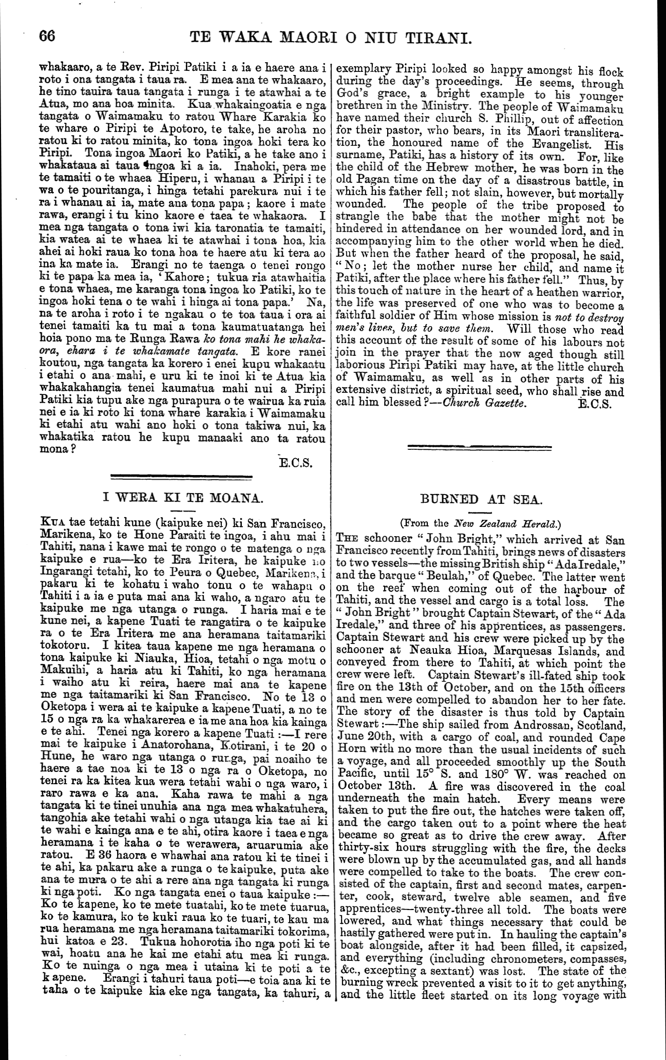 66 TE WAKA MAORI O NIU TIRANI. whakaaro, a te Rev. Piripi Patiki i a ia e haere ana i roto i ona tangata i taua ra. E mea ana te whakaaro, he tino tauira taua tangata i runga i te atawhai a te Atua, mo ana hoa minita. Kua whakaingoatia e nga tangata o Waimamaku to ratou Whare Karakia ko te whare o Piripi te Apotoro, te take, he aroha no ratou ki to ratou minita, ko tona ingoa hoki tera ko Piripi. Tona ingoa Maori ko Patiki, a he take ano i whakataua ai taua ingoa ki a ia. Inahoki, pera me te tamaiti o te whaea Hiperu, i whanau a Piripi i te wa o te pouritanga, i hinga tetahi parekura nui i te ra i whanau ai ia, mate aua tona papa ; kaore i mate rawa, erangi i tu kino kaore e taea te whakaora. I mea nga tangata o tona iwi kia taronatia te tamaiti, kia watea ai te whaea ki te atawhai i tona hoa, kia ahei ai hoki raua ko tona hoa te haere atu ki tera ao ina ka mate ia. Erangi no te taenga o tenei rongo ki te papa ka mea ia, ' Kahore; tukua ria atawhaitia e tona whaea, me karanga tona ingoa ko Patiki, ko te ingoa hoki tena o te wahi i hinga ai tona papa.' Na, na te aroha i roto i te ngakau o te toa taua i ora ai tenei tamaiti ka tu mai a tona kaumatuatanga hei hoia pono ma te Runga Rawa ko tona mahi he whaka- ora, ehara, i te whakamate tangata. E kore ranei koutou, nga tangata ka korero i enei kupu whakaatu i etahi o ana mahi, e uru ki te inoi ki te Atua kia whakakahangia tenei kaumatua mahi nui a Piripi Patiki kia tupu ake nga purapura o te wairua ka ruia nei e ia ki roto ki tona whare karakia i Waimamaku ki etahi atu wahi ano hoki o tona takiwa nui, ka whakatika ratou he kupu manaaki ano ta ratou mona ? E.C.S. I WERA KI TE MOANA. KUA tae tetahi kune (kaipuke nei) ki San Francisco, Marikena, ko te Hone Paraiti te ingoa, i ahu mai i Tahiti, nana i kawe mai te rongo o te matenga o nga kaipuke e rua—ko te Era Iritera, he kaipuke no Ingarangi tetahi, ko te Peura o Quebec, Marikena i pakaru ki te kohatu i waho tonu o te wahapu o Tahiti i a ia e puta mai ana ki waho, a ngaro atu te kaipuke me nga utanga o runga. I haria mai e te kune nei, a kapene Tuati te rangatira o te kaipuke ra o te Era Iritera me ana heramana taitamariki tokotoru. I kitea taua kapene me nga heramana o tona kaipuke ki Niauka, Hioa, tetahi o nga motu o Makuihi, a haria atu ki Tahiti, ko nga heramana i waiho atu ki reira, haere mai ana te kapene me nga taitamariki ki San Francisco. No te 13 o Oketopa i wera ai te kaipuke a kapene Tuati, a no te 15 o nga ra ka whakarerea e ia me ana hoa kia kainga e te ahi. Tenei nga korero a kapene Tuati :—I rere mai te kaipuke i Anatorohana, Kotirani, i te 20 o Hune, he waro nga utanga o runga, pai noaiho te haere a tae noa ki te 13 o nga ra o Oketopa, no tenei ra ka kitea kua wera tetahi wahi o nga waro, i raro rawa e ka ana. Kaha rawa te mahi a nga tangata ki te tinei unuhia ana nga mea whakatuhera, tangohia ake tetahi wahi o nga utanga kia tae ai ki te wahi e kainga ana e te ahi, otira kaore i taea e nga heramana i te kaha o te werawera, aruarumia ake ratou. E 36 haora e whawhai ana ratou ki te tinei i te ahi, ka pakaru ake a runga o te kaipuke, puta ake ana te mura o te ahi a rere ana nga tangata ki runga ki nga poti. Ko nga tangata enei o taua kaipuke :— Ko te kapene, ko te mete tuatahi, ko te mete tuarua, ko te kamura, ko te kuki raua ko te tuari, te kau ma rua heramana me nga heramana taitamariki tokorima, hui katoa e 23. Tukua hohorotia iho nga poti ki te wai, hoata ana he kai me etahi atu mea ki runga. Ko te nuinga o nga mea i utaina ki te poti a te kapene. Erangi i tahuri taua poti—e toia ana ki te taha o te kaipuke kia eke nga tangata, ka tahuri, a exemplary Piripi looked so happy amongst his flock during the day's proceedings. He seems, through God's grace, a bright example to his younger brethren in the Ministry. The people of Waimamaku have named their church S. Phillip, out of affection for their pastor, who bears, in its Maori translitera- tion, the honoured name of the Evangelist. His surname, Patiki, has a history of its own. For, like the child of the Hebrew mother, he was born in the old Pagan time on the day of a disastrous battle, in which his father fell; not slain, however, but mortally wounded. The people of the tribe proposed to strangle the babe that the mother might not be hindered in attendance on her wounded lord, and in accompanying him to the other world when he died. But when the father heard of the proposal, he said, " No; let the mother nurse her child, and name it Patiki, after the place where his father fell." Thus, by this touch of nature in the heart of a heathen warrior, the life was preserved of one who was to become a faithful soldier of Him whose mission is not to destroy men's lives,, but to save them. Will those who read this account of the result of some of his labours not join in the prayer that the now aged though still laborious Piripi Patiki may have, at the little church of Waimamaku, as well as in other parts of his extensive district, a spiritual seed, who shall rise and all him blessed ?—Church Gazette.E.C.S. BURNED AT SEA. (From the New Zealand Herald.) THE schooner " John Bright," which arrived at San Francisco recently from Tahiti, brings news of disasters to two vessels—the missing British ship " Adalredale," and the barque " Beulah," of Quebec. The latter went on the reef when coming out of the harbour of Tahiti, and the vessel and cargo is a total loss. The John Bright" brought Captain Stewart, of the " Ada Iredale," and three of his apprentices, as passengers. Captain Stewart and his crew were picked up by the schooner at Neauka Hioa, Marquesas Islands, and conveyed from there to Tahiti, at which point the crew were left. Captain Stewart's ill-fated ship took fire on the 13th of October, and on the 15th officers and men were compelled to abandon her to her fate. The story of the disaster is thus told by Captain Stewart:—The ship sailed from Androssan, Scotland, June 20th, with a cargo of coal, and rounded Cape Horn with