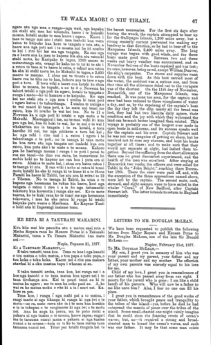 TE WAKA MAORI O NIU TIRANI. ngaro atu nga mea o runga—nga wati, nga kapahu me etahi atu mea hei tohutohu haere i te huarahi moana, kotahi anake te mea kaore i ngaro. Kaore i taea te tango mai ano i etahi mea inahoki kua wera katoa te kaipuke kua kore te tangata e tata atu, a haere ana nga poti nei i te moana nui he iti noaiho te kai i riro hei kai ma nga tangata. Ka ono nga ra e haere ana ka mea te kapene kia ahu atu ratou ki etahi motu, ko Karipako te ingoa, 1200 maero te mataratanga atu, erangi he kaha no te tai ki te aki i a ratou te taea ai te haere ki reira, a tahuri ana ratou ka ahu ki etahi motu ke, ko Makuihi te ingoa, e 2,400 maero te mamao. I ahua pai te timata o to ratou haere roa he tika no te hau, hohoro ana te tere o nga poti e toru. E toru wiki e haere ana katahi ka ahua kino te moana, he tupuhi, a no te 8 o Nowema ka tahuri tetahi o nga poti ka ngaro, kotahi te tangata o runga i mate—ko to kamura o te kaipuke. Ko nga kai me etahi atu o nga mea i utaina ki taua poti i ngaro katoa i te tuhuritanga. I utaina te nuinga o te wai maori ki taua poti, a he mate nui tenei mo ratou, kua iti noaiho te wai hei inu. No te 11 o Nowema ka u nga poti ki tetahi o nga motu o te Makuihi. Marenganui i tae, no te mea wahi iti kua pau nga kai, kua iti hoki te wai, ko te nui o te wai i whakaritea mo ia tangata i te ra kotahi, e toru karaihe iti nei, me nga pihikete e toru hei kai ; ko nga rohi i riro mai i a ratou i ngaro i te tahuritanga o te poti; no te taenga ki taua motu ka koa rawa atu nga tangata nei inahoki kua ora ratou, kua puta ake i te mate o te moana. Kahore pea he haerenga moana i runga i te poti i penei te roa me tenei—he tino roa rawa, he manawanui he mohio hoki no te kapene me ona hoa i puta ora ai ratou. Ahakoa te mate kai, i ahua ora katoa ratou i te taenga ki uta. E rua wiki i noho ai ratou ki tenei motu katahi ka eke ki runga ki te kune ki a te Hone Paraiti ka haere ki Tahiti, tae atu ana ki reira i te 12 o Tihema. No te taenga ki Tahiti, ka utua e te kapene nga heramana ka tukua kia haere, heoi nga tangata o ratou i riro i a ia ko nga taitamariki tokotoru kua korerotia i runga ake nei. Ko te mete tuarua, ko te kuki raua ko te tuari me nga heramana tokowaru, i mea ka eke ratou ki runga ki tetahi kaipuke patu weera o Marikena. Ko Kapene Tuati e hoki ana ki Ingarangi inaianei tonu. HE RETA RI A TAKURAHI MAKARINI. KUA kiia mai kia panuitia atu e matou enei reta a Meiha Ropata raua ko Henare Potae ki a Takurahi Makarini, tama a Ta Tanara Makarini kua mate nei:— Nepia, Pepuere 21, 1877. KI A TAKURAHI MAKARINI,— E taku tamaiti, tena koe. Tena ra koe i nga kanohi o tou matua o toku matua, o tou papa o toku papa, o tou koka o toku koka. Kaore nei e rite ana mahara atawhai ki a oku maatua tupu i whanau ai au. E taku tamaiti aroha, tena koe, kei runga nei i a koe nga kanohi o to taua matua kua ngaro nei i to taua tirohanga atu. Kei te pouri tenei au ki te matua ka ngaro ; me te mea ka noho pani au. A, ko wai ra he matua moku e rite ki a ia i muri nei. Ka- hore ra pea. Tena koe, i runga i nga mahi pai a to matua, i rangi marie ai nga tikanga ki runga ki nga iwi o te motu—ae ra, mate rawa ake ia i te mea kua horahia e ia te takapau o te rangimarie ki nga iwi o te motu nei. Ana ka anga ka parau, ma te poho ririki e pakaru ai nga tuatea o te moana, kaore rapea; engari ma te tarauma nunui mana e pakaru ai nga tuatea nunui o te moana—koia ra ia ko to taua matua taua tarauma nunui nei. Tenei pea tetahi tangata kei te the barest necessaries. For the first six days after leaving the wreck, the captain attempted to bear up for the Gallipagos Islands, 1,200 miles away, but a strong westerly current prevented his making any headway in that direction, so he had to bear off to the Marquesas Islands, 2,400 miles away. The long voyage was begun with good winds, and the three boats made good time. Between two and three weeks out heavy weather was encountered, and on November 3rd one of the boats capsized and was lost; its crew, however, being saved, except William Dunver, the ship's carpenter. The stores and supplies went down with the boat. As this boat carried most of the water, the accident was a serious one, and from that time all the allowance doled out to the voyagers was of the shortest. On the 11th day of November, Donnevick, one of the Marquesas Islands, was reached. It was none too soon, for the captain and crew had been reduced to three wineglasses of water a day, and as, by the capsizing of the captain's boat the day they left the ship nearly all the bread was lost, they had but two biscuits daily apiece, their condition and the joy with which they welcomed the land can be much better imagined than related. This voyage is probably oue of the longest ever made in open boats in mid-ocean, and its success speaks well for the captain and his crew. Captain Stewart said he was not very sanguine of getting on shore, but he resolved not to miss any chances, and kept his boats together at all times; and to make sure that they would not separate at night, had lashed them to- gether. Beyond the suffering from the short allowance there was no great discomfort experienced, and the health of the men was excellent. After staying at Donnevick two weeks, the officers and crew sailed for Tahiti in the "John Bright,", reaching there Decem- ber 12th. There the crew were paid off, and, with the exception of the three apprentices named above, were left by the captain. The second mate, cook, steward, and eight seamen were to have sailed in the whaler " Coral," of New Bedford, after Captain Stewart left. The latter intends to return to England immediately. LETTERS TO MR. DOUGLAS McLEAN. WE have been requested to publish the following letters from Major Ropata and Henare Potae to Mr. Douglas McLean, son of the late Sir Donald McLean:— Napier, February 21st, 1877. To MR. DOUGLAS McLEAN,— My son, I greet you in memory of him who was your parent and my parent, your father and my father, your mother 