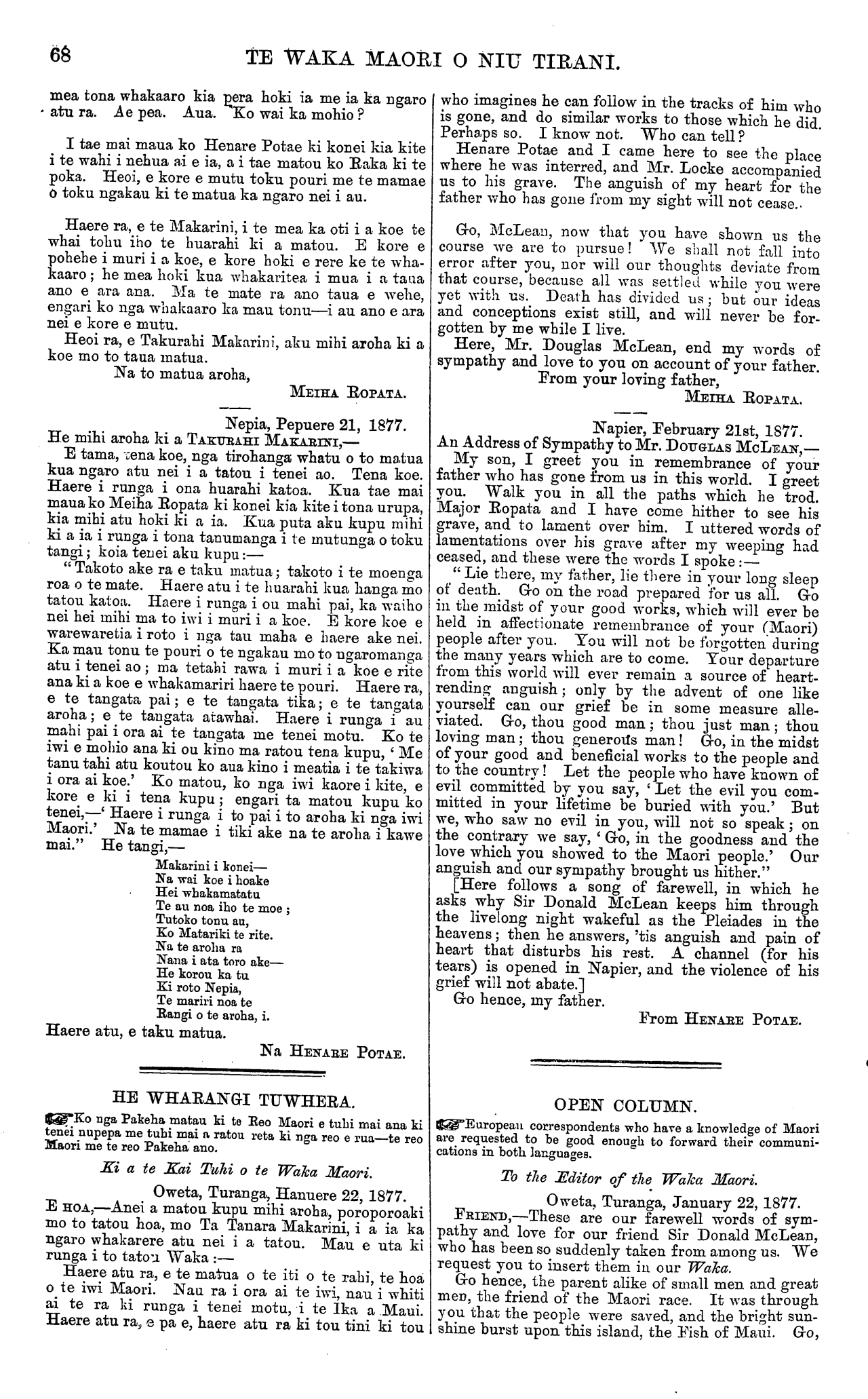 WAKA MAORI O NIU TIRANI. mea tona whakaaro kia pera hoki ia me ia ka ngaro atu ra. Ae pea. Aua. Ko wai ka mohio ? I tae mai maua ko Henare Potae ki konei kia kite i te wahi i nehua ai e ia, a i tae matou ko Raka ki te poka. Heoi, e kore e mutu toku pouri me te mamae O toku ngakau ki te matua ka ngaro nei i au. Haere ra, e te Makarini, i te mea ka oti i a koe te whai tohu iho te huarahi ki a matou. E kore e pohehe i muri i a koe, e kore hoki e rere ke te wha- kaaro ; he mea hoki kua whakaritea i mua i a taua ano e ara ana. Ma te mate ra ano taua e wehe, engari ko nga whakaaro ka mau tonu—i au ano e ara nei e kore e mutu. Heoi ra, e Takurahi Makarini, aku inihi aroha ki a koe mo to taua matua. Na to matua aroha, MEIHA ROPATA. Nepia, Pepuere 21, 1877. He mihi aroha ki a TAKURAHI MAKARINI,— E tama, tena koe, nga tirohanga whatu o to matua kua ngaro atu nei i a tatou i tenei ao. Tena koe. Haere i runga i ona huarahi katoa. Kua tae mai maua ko Meiha Ropata ki konei kia kite i tona urupa, kia mihi atu hoki ki a ia. Kua puta aka kupu mihi ki a ia i runga i tona tanumanga i te mutunga o toku tangi; koia tenei aku kupu:— " Takoto ake ra e taku matua; takoto i te moenga roa o te mate. Haere atu i te huarahi kua hanga mo tatou katoa. Haere i runga i ou mahi pai, ka waiho nei hei mihi ma to iwi i muri i a koe. E kore koe e warewaretia i roto i nga tau inaha e haere ake nei. Ka mau tonu te pouri o te ngakau mo to ngaromanga atu i tenei ao ; ma tetahi rawa i muri i a koe e rite ana ki a koe e whakamariri haere te pouri. Haere ra, e te tangata pai; e te tangata tika; e te tangata aroha; e te tangata atawhai. Haere i runga i au mahi pai i ora ai te tangata me tenei motu. Ko te iwi e mohio ana ki ou kino ma ratou tena kupu, ' Me tanu tahi atu koutou ko aua kino i meatia i te takiwa i ora ai koe.' Ko matou, ko nga iwi kaore i kite, e kore e ki i tena kupu; engari ta matou kupu ko tenei,—' Haere i runga i to pai i to aroha ki nga iwi Maori.' Na te mamae i tiki ake na te aroha i kawe mai." He tangi,— Makarini i konei— Na wai koe i hoake Hei whakamatatu Te au noa iho te moe ; Tutoko tonu au, Ko Matariki te rite. Na te aroha ra Nana i ata toro ake— He korou ka tu Ki roto Nepia, Te mariri noa te Rangi o te aroha, i. Haere atu, e taku matua. Na HENARE POTAE. HE WHARANGI TUWHERA. Ko nga Pakeha matau ki te Reo Maori e tuhi mai ana ki tenei nupepa me tuhi mai ft ratou reta ki nga reo e rua—te reo Maori me te reo Pakeha ano. Ki a te Kai Tuhi o te Waka Maori. Oweta, Turanga, Hanuere 22, 1877. E HOA,—Anei a matou kupu mihi aroha, poroporoaki mo to tatou hoa, mo Ta Tanara Makarini, i a ia ka ngaro whakarere atu nei i a tatou. Mau e uta ki runga i to tatou Waka :— Haere atu ra, e te matua o te iti o te rahi, te hoa o te iwi Maori. Nau ra i ora ai te iwi, nau i whiti ai te ra ki runga i tenei motu, i te Ika a Maui. Haere atu ra, e pa e, haere atu ra ki tou tini ki tou who imagines he can follow in the tracks of him who is gone, and do similar works to those which he did. Perhaps so. I know not. Who can tell? Henare Potae and I came here to see the place where he was interred, and Mr. Locke accompanied us to his grave. The anguish of my heart for the father who has gone from my sight will not cease. Go, McLean, now that you have shown us the course we are to pursue! We shall not fall into error after you, nor will our thoughts deviate from that course, because all was settled while you were yet with us. Death has divided us; but our ideas and conceptions exist still, and will never be for- gotten by me while I live. Here, Mr. Douglas McLean, end my words of sympathy and love to you on account of your father. Prom your loving father, MEIHA ROPATA. Napier, February 21st, 1877. An Address of Sympathy to Mr. DOUGLAS McLEAN,— My son, I greet you in remembrance of your father who has gone from us in this world. I greet you. Walk you in all the paths which he trod. Major Ropata and I have come hither to see his grave, and to lament over him. I uttered words of lamentations over his grave after my weeping had ceased, and these were the words I spoke:— "Lie there, my father, lie there in your long sleep of death. Go on the road prepared for us all. Go in the midst of your good works, which will ever be held in affectionate remembrance of your (Maori) people after you. You will not be forgotten during the many years which are to come. Tour departure from this world will ever remain a source of heart- rending anguish; only by the advent of one like yourself can our grief be in some measure alle- viated. Go, thou good man; thou just man; thou loving man; thou generous man! Go, in the midst of your good and beneficial works to the people and to the country! Let the people who have known of evil committed by you say, ' Let the evil you com- mitted in your lifetime be buried with you.' But we, who saw no evil in you, will not so speak; on the contrary we say, ' Go, in the goodness and the love which you showed to the Maori people.' Our anguish and our sympathy brought us hither." [Here follows a song of farewell, in which he asks why Sir Donald McLean keeps him through the livelong night wakeful as the Pleiades in the heavens; then he answers, 'tis anguish and pain of heart that disturbs his rest. A channel (for his tears) is opened in Napier, and the violence of his grief will not abate.] Go hence, my father. From HENARE POTAE. OPEN COLUMN. European correspondents who have a knowledge of Maori are requested to be good enough to forward their communi- cations in both languages. To the Editor of the Waka Maori. Oweta Turanga, January 22, 1877. FRIEND,—These are our farewell words of sym- pathy and love for our friend Sir Donald McLean, who has been so suddenly taken from among us. We request you to insert them in our Waka. Go hence, the parent alike of small men and great men, the friend of the Maori race. It was through you that the people were saved, and the bright sun- shine burst upon this island, the Fish o