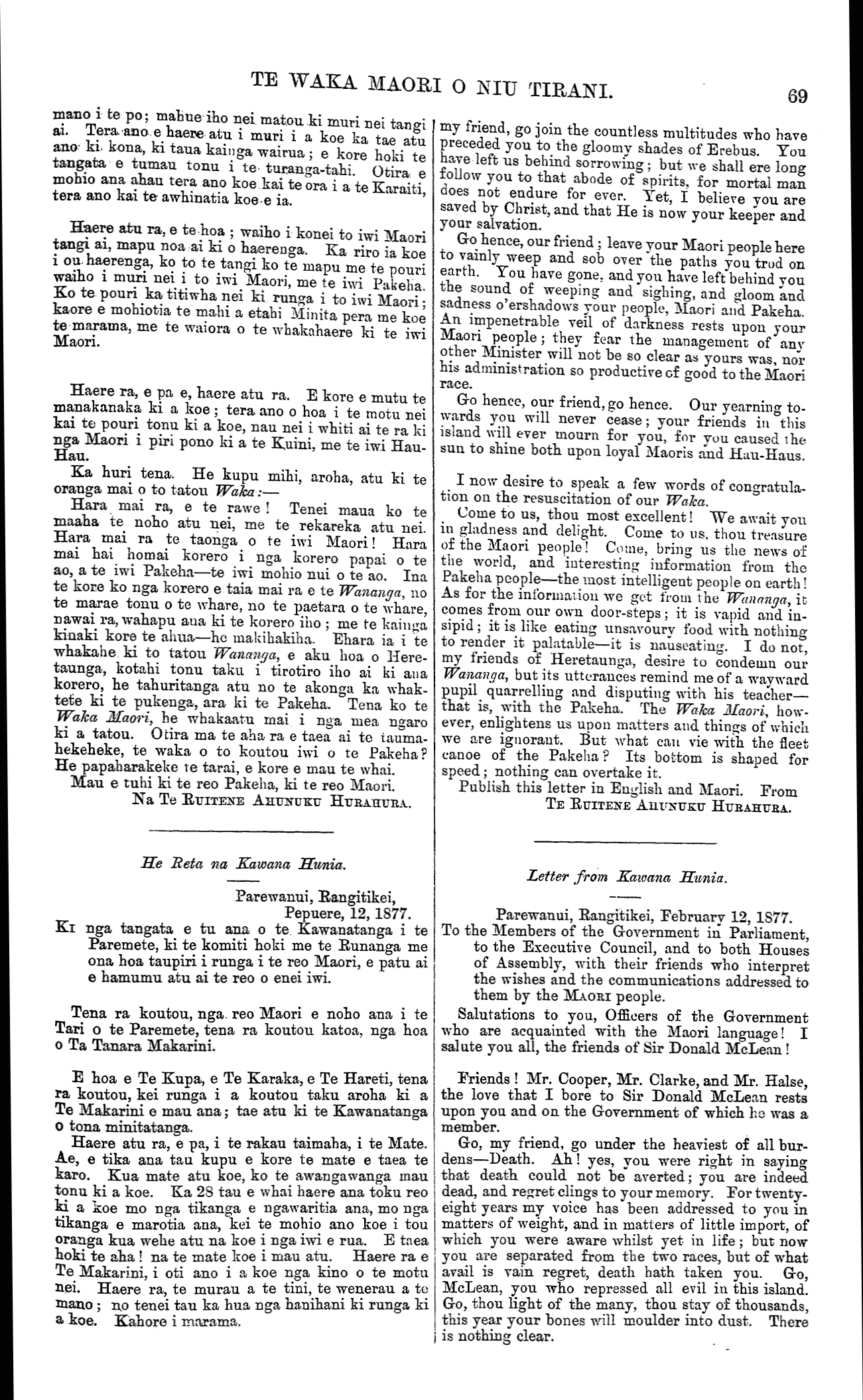 TE WAKA MAORI O NIU TIRANI. 69 mano i te po; mahue iho nei matou ki muri nei tangi ai. Tera ano e haere atu i muri i a koe ka tae atu ano ki. kona, ki taua kainga wairua ; e kore hoki te tangata e tumau tonu i te turanga-tahi. Otira e mohio ana ahau tera ano koe.kai te ora i a te Karaiti, tera ano kai te awhinatia koe e ia. Haere atu ra, e te hoa ; waiho i konei to iwi Maori tangi ai, mapu noa ai ki o haerenga. Ka riro ia koe i ou. haerenga, ko to te tangi ko te mapu me te pouri waiho i muri nei i to iwi Maori, me te iwi Pakeha. Ko te pouri ka titiwha nei ki runga i to iwi Maori; kaore e mohiotia te mahi a etahi Minita pera me koe te marama, me te waiora o te whakahaere ki te iwi Maori. Haere ra, e pa e, haere atu ra. E kore e mutu te manakanaka ki a koe; tera ano o hoa i te motu nei kai te pouri tonu ki a koe, nau nei i whiti ai te ra ki nga Maori i piri pono ki a te Kuini, me te iwi Hau- Hau. Ka huri tena. He kupu mihi, aroha, atu ki te oranga mai o to tatou Wahi:— Hara mai ra, e te rawe ! Tenei maua ko te maaha te noho atu nei, me te rekareka atu nei. Hara mai ra te taonga o te iwi Maori! Hara mai hai homai korero i nga korero papai o te ao, a te iwi Pakeha—te iwi mohio nui o te ao. Ina te kore ko nga korero e taia mai ra e te Wananga, no te marae tonu o te whare, no te paetara o te whare, nawai ra, wahapu ana ki te korero iho ; me te kainga kinaki kore te ahua—he makihakiha. Ehara ia i te whakahe ki to tatou Wananga, e aku hoa o Here- taunga, kotahi tonu taku i tirotiro iho ai ki ana korero, he tahuritanga atu no te akonga ka whak- tete ki te pukenga, ara ki te Pakeha. Tena ko te Waka Maori, he whakaatu mai i nga mea ngaro ki a tatou. Otira ma te aha ra e taea ai te tauma- hekeheke, te waka o to koutou iwi o te Pakeha? He papaharakeke te tarai, e kore e mau te whai. Mau e tuhi ki te reo Pakeha, ki te reo Maori. Na Te RUITENE AHUNUKU HURAHURA. He Reta na Kawana Hunia. Parewanui, Rangitikei, Pepuere, 12,1877. Ki nga tangata e tu ana o te Kawanatanga i te Paremete, ki te komiti hoki me te Runanga me ona hoa taupiri i runga i te reo Maori, e patu ai e hamumu atu ai te reo o enei iwi. Tena ra koutou, nga. reo Maori e noho ana i te Tari o te Paremete, tena ra koutou katoa, nga hoa o Ta Tanara Makarini. E hoa e Te Kupa, e Te Karaka, e Te Hareti, tena ra koutou, kei runga i a koutou taku aroha ki a Te Makarini e mau ana; tae atu ki te Kawanatanga o tona minitatanga. Haere atu ra, e pa, i te rakau taimaha, i te Mate. Ae, e tika ana tau kupu e kore te mate e taea te karo. Kua mate atu koe, ko te awangawanga mau tonu ki a koe. Ka 28 tau e whai haere ana toku reo ki a koe mo nga tikanga e ngawaritia ana, mo nga tikanga e marotia aua, kei te mohio ano koe i tou oranga kua wehe atu na koe i nga iwi e rua. E taea hoki te aha ! na te mate koe i mau atu. Haere ra e Te Makarini, i oti ano i a koe nga kino o te motu nei. Haere ra, te murau a te tini, te wenerau a te mano ; no tenei tau ka hua nga hanihani ki runga ki a koe. Kahore i marama. my friend, go join the countless multitudes who have preceded you to the gloomy shades of Erebus. You have left us behind sorrowing; but we shall ere long follow you to that abode of spirits, for mortal man does not endure for ever. Yet, I believe you are saved by Christ, and that He is now your keeper and your salvation. Go hence, our friend ; leave your Maori people here to vainly weep and sob over "the paths you trod on earth. Tou have gone, and you have left behind you the sound of weeping and sighing, and gloom and sadness o'ershadows your people, Maori and Pakeha. An impenetrable veil of darkness rests upon your Maori people; they fear the management of any other Minister will not be so clear as yours was, nor his administration so productive of good to the Maori race. Go hence, our friend, go hence. Our yearning to- wards you will never cease; your friends in this island will ever mourn for you, for you caused the sun to shine both upon loyal Maoris and Hau-Haus. I now desire to speak a few words of congratula- tion on the resuscitation of our Waka. Come to us, thou most excellent! We await you in gladness and delight. Come to us. thou treasure of the Maori people! Come, bring us the news of the world, and interesting information from the Pakeha people—the most intelligent people ou earth! As for the information we get from the Wananga, it comes from our own door-steps; it is vapid and in- sipid ; it is like eating unsavoury food with nothing to render it palatable—it is nauseating. I do not, my friends of Heretaunga, desire to condemn our Wananga, but its utterances remind me of a wayward pupil quarrelling .and disputing with his teacher— that is, with the Pakeha. The Waka Maori, how- ever, enlightens us upon matters and things of which we are ignorant. But what can vie with the fleet canoe of the Pakeha ? Its bottom is shaped for speed; nothing can overtake it. Publish this letter in English and Maori. From TE RUITENE AHUNUKU HURAHURA. Letter from Kawana Hunia. Parewanui, Rangitikei, February 12, 1877. To the Members of the Government in Parliament, to the Executive Council, and to both Houses of Assembly, with their friends who interpret the wishes and the communications addressed to them by the MAORI people. Salutations to you, Officers of the Government who are acquainted with the Maori language! I salute you all, the friends of Sir Donald McLean ! Friends ! Mr. Cooper, Mr. Clarke, and Mr. Halse, the love that I bore to Sir Donald McLean rests upon you and on the Government of which ho was a member. Go, my friend, go under the heaviest of all bur- dens—Death. Ah! yes, you were right in saying that death could not be averted; you are indeed dead, and regret clings to your memory. For twenty- eight years my voice has been addressed to you in matters of weight, and in matters of little import, of which you were aware whilst yet in life; but now you are separated from the two races, but of what avail is vain regret, death hath taken you. Go, Mc
