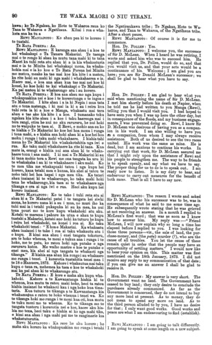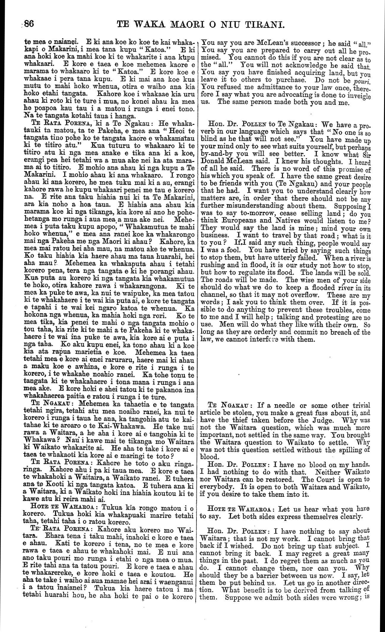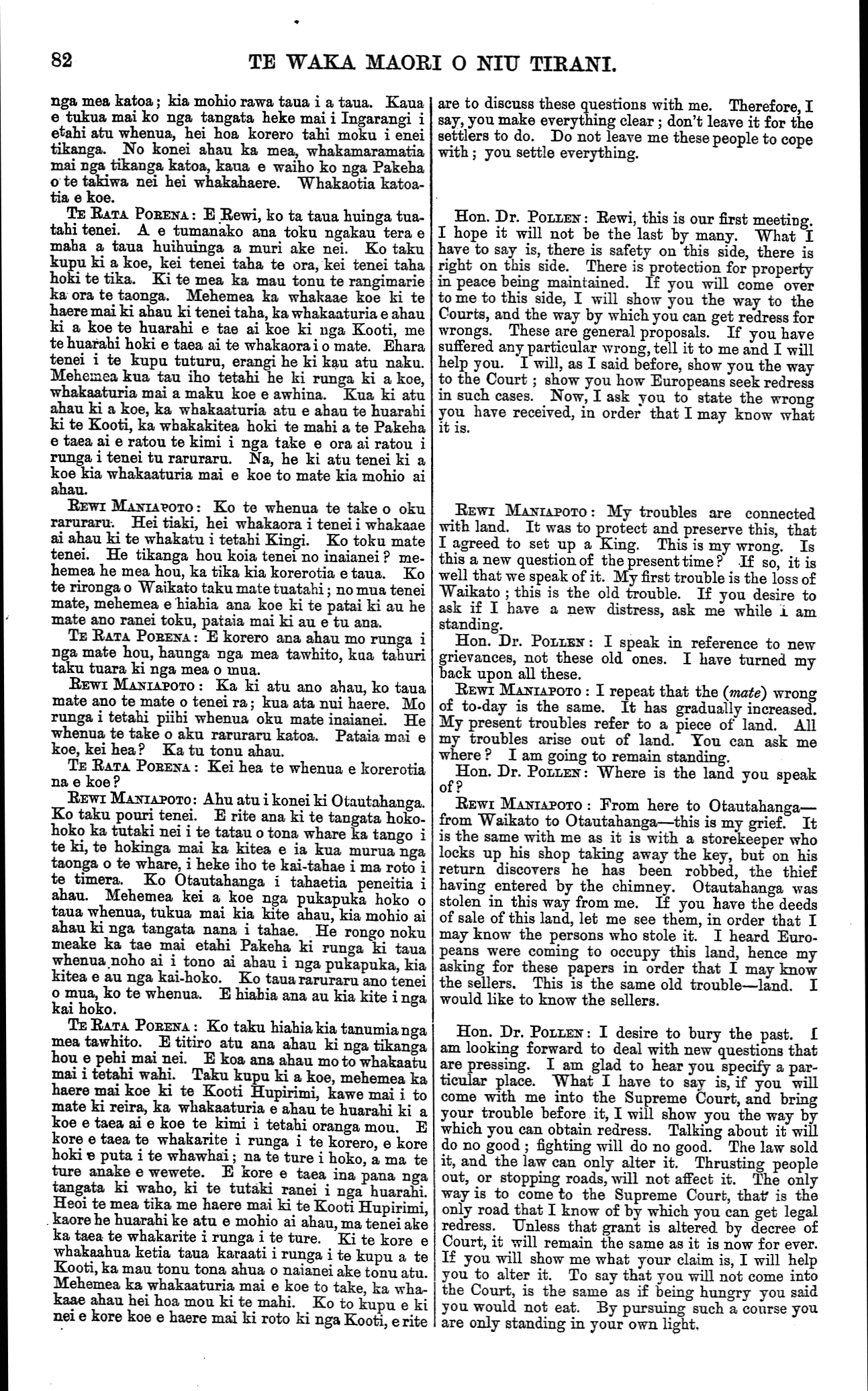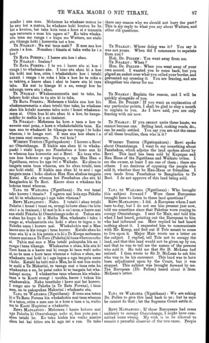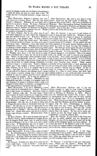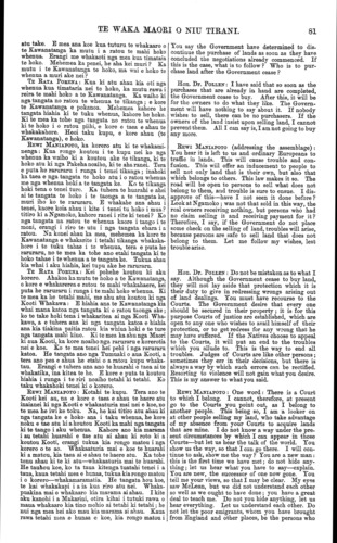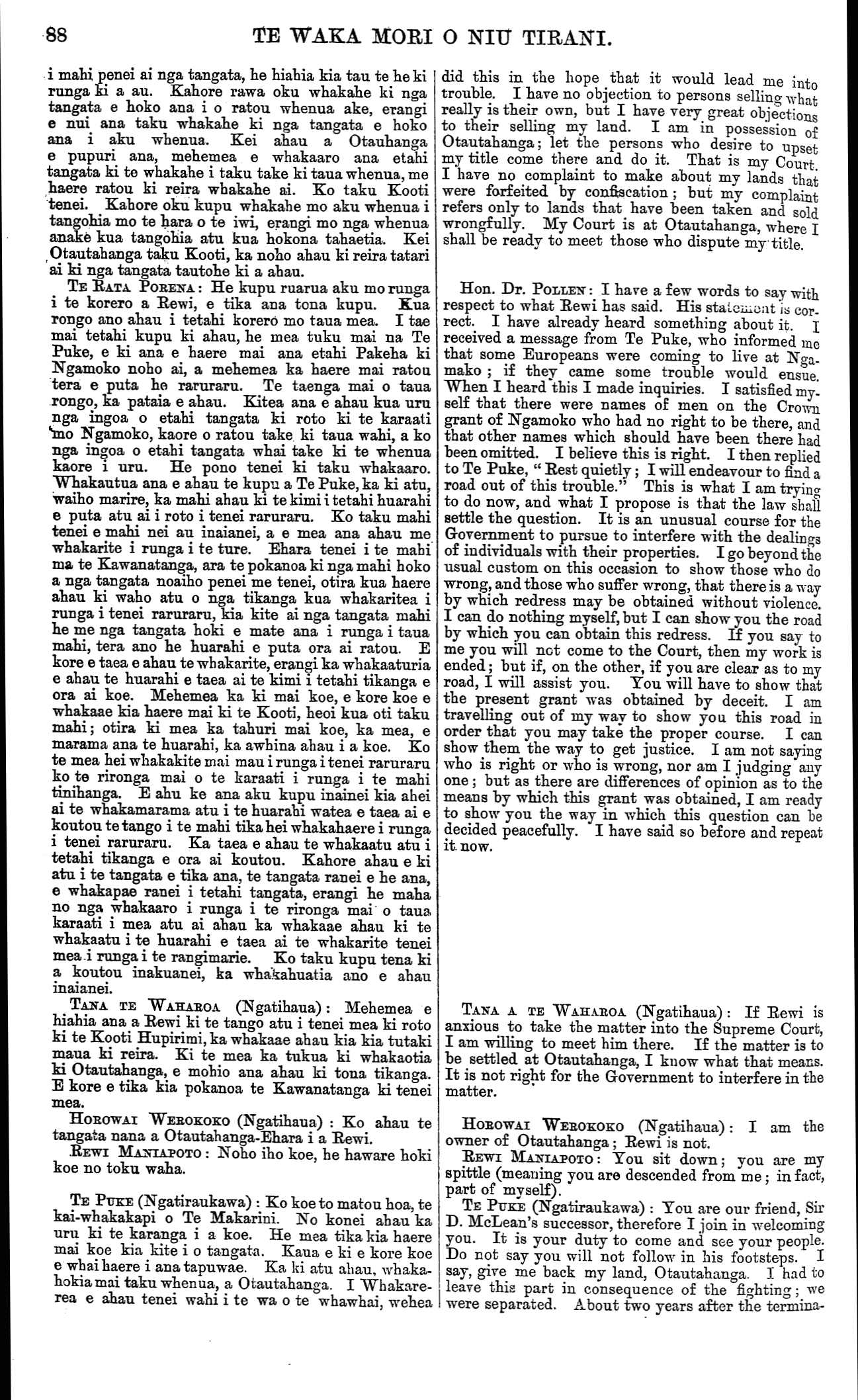 TE WAKA MAORI O NIU TIRANI. 83 ana ki te tangata e mate ana i te hiakai, te hoatutanga i tetahi kai mana ka mea ia e kore ahau e kai. E tutaki aua koe i te huarahi marama i runga i tena tu mahi. REWI MANIAPOTO : Kahore e marama taku hua- rahi haere ki a koutou Kooti. Kei hea nga kupu tuatahi a Makarini. Mehemea ko aua kupu ena e korerotia na, kaua e hunaa. Te kupu a Tawhiao ki Waitomo. Kua rite ranei nga take i korerotia e Te Makarini raua ko Tawhiao ki Waitomo ki Kaipiha ? Kia rongo matou i tena, mehemea kua oti. Katahi ka marama te huarahi ki te Kooti. TE RATA PORENA: Ka ki atu ahau, kua ki atu hoki ahau inakuanei, ko taku hiahia kia whakarerea nga mea tawhito ki muri i au. Kua riro a Waikato, kua riro atu i nga tangata nana. E kore e taea te whakahoki ata, tetahi eka kotahi ranei. Kia mohio koe, he kuare noaiho te korero mo tena, no te mea e kore rawa e taea. Mehemea i puta taku hiahia kia whakahokia, kaore e taea. Mehemea kua riro katoa te whenua a tetahi tangata a e hiahia ana ia ki tetahi piihi hei kainga mona, tena e hoatu, otira ko Waikato kua riro. Ki te mea ka whakamutua tenei korero mo Waikato tena tatou e tae tata atu ki te rangi- marie e hiahiatia nei e tatou, ka tae atu ki te mutu- nga. Ehara i au taua mahi, i kitea peneitia e ahau, e kore e taea te whakarereke, kua oti. Otira kaua e waiho ko tenei hei take e kore ai koe e haere mai ki o matou Kooti kimi ai i tetahi tikanga whakahoki i to whenua i runga i o matou ture. Kaore e whakara- ngona ana e nga tangata a koutou panui kati i te hoko whenua; na te turi o ou tangata ake ki aua panui i tupu ake ai a koutou raruraru. E kore e oti nga take ki te whenua, nga tikanga ranei, i runga i aua panui a koutou, erangi mau e kawe mai nga whenua ki raro ki o matou ture kia rite ai nga take o ia tangata o ia tangata. Ki te mea ka peneitia e kore e puta he he ki a koutou. Mehemea ka ata whakaritea nga take o ia hapu, o ia tangata ranei, ki nga whenua, i te aroaro o te katoa e kore e taea e te tangata te hoko tahae i te whenua a te tangata ke, ka mutu nga raruraru e korerotia mai nei e koe. REWI MANIAPOTO : I ki mai a Makarini, e kore ahau e kaha ki te whakahoki atu i o kupu. E kore e taea e taku kotahi te whakaoti. Nau koia i kuhu te hoari ? Kahore, naku ake. Na taua kupu i haere mai ai matou ki konei i tenei wa, no runga ano i toku ture. E mea ana koe kia kawea atu o matou whenua ki raro ki te ture, ki ehea ture ? I kiia, tera e whakari- tea a Waikato i runga i te ture. E ahua ke ana a Otautahanga. He aha koe te ki mai ai, tukua mai te Kingi, kia ahei ai ahau te whakahoki tonu atu i to kupu ? He aha koe te ki mai ai, haere mai ki a te Kuini, homai te Kingi ki a matou. He aha koe te ki marama mai i o tikanga ? Kei mea koe ki te whaka- kuare i au. Kaore rawa ahau e tae atu ki te Kooti i runga i nga ritenga o naianei. Me haere ahau i waho o tena. TE RATA PORENA : Ki te mea ka haere mai koe ki te Kooti, e kore e pataia mehemea he tangata Kuini koe he tangata Kingi ranei, heoi te mea hei korero mau ko te tikanga o te he e kiia ana e koe e peehi ana i a koe. E whakahuatia ana ano te ingoa o te Kuini i roto i te Kooti, otira ehara i te mea e tono ana te tangata ki a te Kuini ki te Kingi ranei, erangi ki te ture, kei runga tera i te katoa. REWI MANIAPOTO : E kore e taea e ahau te haere atu. Ko Otautahanga ka waiho atu e ahau ki a koe whakaoti ai. Ko te tikanga mo te ture e kiia nei kei runga ake i a te Kuini, kaore aku hiahia ki te korero i tena mea. Ka whakautua pea taua kupu e tetahi tangata. TE NGAKAU : E hiahia ana ahau ki te patai atu ki a koe i etahi kupu. I hea te Kuini ? I ahu mai ia i hea ? Ka oti to whakautu i ena patai, tenei ano etahi. REWI MANIAPOTO : My road is not clear to your Court; where are the first words of McLean. If these are they, do not hide it. The word to Tawhiao at Waitomo. Have the questions between Tawhiaa and McLean, as discussed at Waitomo and Kaipiha, been settled ? Let us hear this; if that is settled first, the road to the Court will be clear. Hon. Dr. POLLEN : I say now—I said before—I want to keep the past behind me. Waikato is gone, it has gone from the owners, it cannot be returned, not a single acre of it. Tou had better understand it is folly to talk about that; that is impossible. I cannot return it if I wished. If any person who has been deprived of his lands should require a place to reside on it will be found for him, but Waikato is gone. We shall get much nearer the place we desire if we cease to talk about Waikato ; we shall then come to the end. It is not my work; I found it so; I cannot change it; it is finished. This is no reason why you should not seek to recover your property by our laws. Tour orders and panuis forbidding the sale of land have not been heeded; it is on account of the disregard of your own people to these orders that your troubles have arisen. These panuis (notices) will not settle titles or land questions, but do you bring the lands under our laws in order that every person's interest may be defined. If this is done, no wrong can be inflicted. If each tribe or section of a tribe or every person had their land publicly defined, no one could sell what was not his, and the wrong you complain of would cease. REWI MANIAPOTO: McLean said, "I am not strong enough to reply to your words; I cannot settle it myself" (probably refers to what Sir Donald said to Tawhiao, at Waitomo, in 1875). Was it you who sheathed the sword ?—No, it was I. It is in consequence of this order that we have arrived at the present time. It is in consequence of my law. What laws do you want our lands to be under ? It was said that Waikato should be settled in accor- dance with the laws. Otautahanga is different. Why don't you say, " Give up the King," so that I may reply to you at once ? Why not say, " Come to the Queen, give up the King "; why not tell me clearly what you mean ? Do not try to cajole me. I cannot go into the Court under the present cir- cumstances ; I must do without that. Hon. Dr. POLL