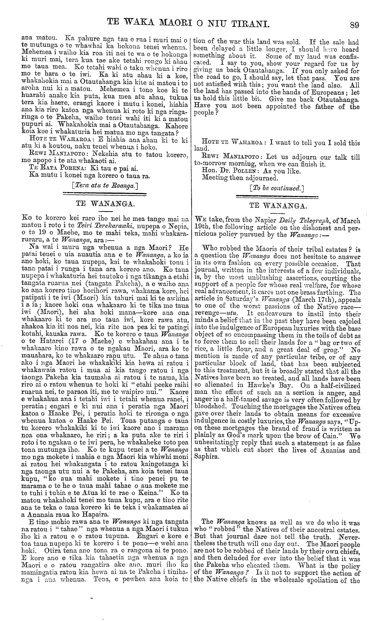 TE WAKA MAORI O NIU TIRANI. 89 ana matou. Ka pahure nga tau e rua i muri mai o te mutunga o te whawhai ka hokona tenei whenua. Mehemea i waiho kia roa iti nei te wa o te hokonga ki muri mai, tera kua tae ake tetahi rongo ki ahau mo taua mea. Ko tetahi wahi o taku whenua i riro mo te hara o te iwi. Ka ki atu ahau ki a koe, whakahokia mai a Otautahanga kia kite ai matou i to aroha nui ki a matou. Mehemea i tono koe ki te huarahi anake kia puta, kua mea atu ahau, tukua tera kia haere, erangi kaore i mutu i konei, hiahia ana kia riro katoa nga whenua ki roto ki nga ringa- ringa o te Pakeha, waiho tenei wahi iti ki a matou pupuri ai. Whakahokia mai a Otautahanga. Kahore koia koe i whakaturia hei matua mo nga tangata ? HOTS TE WAHAROA: E hiahia ana ahau ki to ki atu ki a koutou, naku tenei whenua i hoko. REWI MANIAPOTO : Nekehia atu to tatou korero, mo apopo i te ata whakaoti ai. TE RATA PORENA: Ki tau e pai ai. Ka mutu i konei nga korero o taua ra. [Tera atu te TE WANANGA. Ko te korero kei raro iho nei he mea tango mai na matou i roto i te Teiri Terekarawhi, nupepa o Nepia, o te 19 o Maehe, mo te mahi teka, mahi whakara- ruraru, a te Wananga, ara:— Na wai i muru nga whenua a nga Maori? He patai tenei e uia auautia ana e te Wananga, a ko ia ano hoki, ko taua nupepa, kai te whakahoki tonu i tana patai i runga i tana ara korero ano. Ko tana nupepa i whakaturia hei tautoko i nga tikanga a etahi tangata ruarua nei (tangata Pakeha), a e waiho ana ko ana korero tino horihori rawa, whakama kore, hei patipati i te iwi (Maori) kia tahuri mai ki te awhina i a ia; kaore hoki ona whakaaro ki te tika mo taua iwi (Maori), hei aha hoki mana—kore ana ona whakaaro ki te ara mo taua iwi, kore rawa atu, ahakoa kia iti noa nei, kia rite noa pea ki te patingi kotahi, kauaka rawa. Ko te korero o taua Wananga o te Hatarei (17 o Maehe) e whakahau aua i te whakaaro kino rawa o te ngakau Maori, ara ko te mauahara, ko te whakaaro rapu utu. Te ahua o tana ako i nga Maori he whakakiki kia hewa ai ratou i whakawaia ratou i mua ai kia tango ratou i nga taonga Pakeha kia taumaha ai ratou i te nama, kia riro ai o ratou whenua te hoki ki " etahi peeke raihi ruarua nei, te paraoa iti, me te waipiro nui." Kaore e whakahua ana i tetahi iwi i tetahi whenua ranei, i peratia; engari e ki nui ana i peratia nga Maori katoa o Haake Pei, i peratia hoki te rironga o nga whenua katoa o Haake Pei. Tona putanga o taua tu korero whakakiki ki te iwi kaore ano i marama noa ona whakaaro, he riri; a ka puta ake te riri i roto i te ngakau o te iwi pera, he whakaheke toto pea tona mutunga iho. Ko te kupu tenei a te Wananga mo nga mokete i mahia e nga Maori kia whiwhi moni ai ratou hei whakangata i to ratou kaingotanga ki nga taonga utu nui a te Pakeha, ara koia tenei taua kupu, "ko aua mahi mokete i tino penei pu te marama o te he o taua mahi tahae o aua mokete me te tuhi i tuhia e te Atua ki te rae o Kema." Ko ta matou whakahoki tenei mo taua kupu, ara e tino rite ana te teka o taua korero ki te teka i whakamatea ai a Ananaia raua ko Hapaira. E tino mohio rawa ana te Wananga ki nga tangata na ratou i " tahae " nga whenua a nga Maori i tukua iho ki a ratou e o ratou tupuna. Engari e kore e toa taua nupepa ki te korero" i te pono—e wehi ana hold. Otira tena ano tona ra e rangona ai te pono. E kore ano e tika kia tahaetia nga whenua a nga Maori e o ratou rangatira ake ano, muri iho ka mamingatia ratou kia hewa ai ua te Pakeha i tiniha- nga i aua whenua. Tena, e pewhea ana koia te tion of the war this land was sold. If the sale had been delayed a little longer, I should have heard something about it. Some of my land was confis- cated. I say to you, show your regard for us by giving us back Otautahanga. If you only asked for the road to go, I should say, let that pass. Tou are not satisfied with this; you want the land also. All the land has passed into the hands of Europeans ; let us hold this little bit. Give me back Otautahanga. Have you not been appointed the father of the people ? HOTE TE WAHAROA : I want to tell you I sold this land. REWI MANIAPOTO : Let us adjourn our talk till to-morrow morning, when we can finish it. Hon. Dr. POLLEN: As you like. Meeting then adjourned. To be continued.] TE WANANGA. WE take, from the Napier Daily Telegraph, of March 19th, the following article on the dishonest and per- nicious policy pursued by the Wananga:— Who robbed the Maoris of their tribal estates ? is a question the Wananga does not hesitate to answer in its own fashion on every possible occasion. That journal, written in the interests of a few individuals, is, by the most unblushing assertions, courting the support of a people for whose real welfare, for whose real advancement, it cares not one brass farthing. The article in Saturday's Wananga (March 17th), appeals to one of the worst passions of the Native race— revenge—utu. It endeavours to instil into their minds a belief that in the past they have been cajoled into the indulgence of European luxuries with the base object of so encompassing them in the toils of debt as to force them to sell their lands for a " bag or two of rice, a little flour, and a great deal of grog." No mention is made of any particular tribe, or of any particular block of land, that has been subjected to this treatment, but it is broadly stated that all the Natives have been so treated, and all lands have been so alienated in Hawke's Bay. On a half-civilized man the effect of such au a sertion is anger, and anger in a half-tamed savage is very often followed by bloodshed. Touching the mortgages the Natives often gave over their lauds to obtain means for excessive indulgence in costly luxuries, the Wananga says, "Up- on these mortgages the brand of fraud is written as plainly as God's mark upon the brow of Cain." We unhesitatingly reply that such a statement is as false as that which cut short the lives of Ananias and Saphira. The Wananga knows as well as we do who it was who " robbed " the Natives of their ancestr
