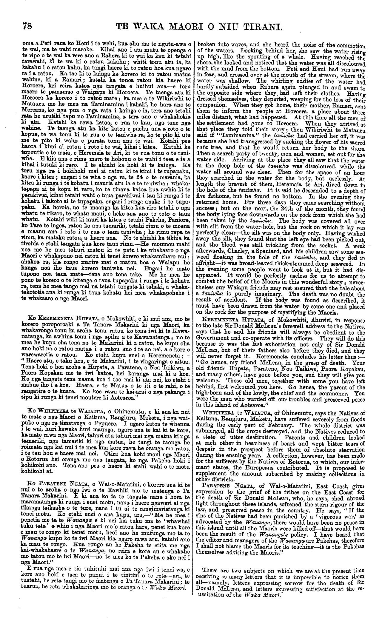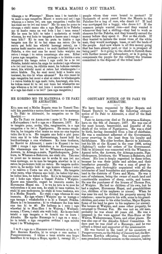 TE WAKA MAORI O NIU TIRANI. tikanga o te Wananga ? Ehara iana i te tautoko i te mahi a nga rangatira Maori e muru nui nei i nga whenua a o ratou iwi, ara nga rangatira i waiho hei kai-tiaki mo te iwi nui tonu ? Me he mea he pono te rironga o etahi mano eka a nga Maori ki te Pakeha mo te kaaho rama na wai koia i kai i taua rama? Me he mea he kiki te take i moketetia ai tetahi whenua, ko wai koia te tangata e haere ana i runga i taua kiki? Ki te mea ka puta te hiahia o nga tangata noa iho ki te kai rama ma ratou (ko ta ratou pai hoki ina whiwhi herengi ratou), na i matua mahi marire ratou i te mahi katikati hipi a te Pakeha, a riro mai ana he moni hoko waipiro ma ratou i runga i to ratou uauatanga ake ano. Kihai i pena nga rangatira. I te putanga o te hiahia o aua rangatira kia tango ratou i nga mahi he a te iwi Pakeha, katahi ratou ka anga ka mokete i nga whenua a te iwi nui tonu, ka riihitia ranei, ka hokona rawatia ranei, kia whiwhi moni ai ratou hei whakangata i o ratou hiahia. Na, ko enei moni hoki e hoatu ana inaianei, ka riro ki whea akuanei ? Ka riro ranei ki nga rangatira hei moni e ahei ai ratou te whakangata i o ratou hiahia ki nga mahi tutu, haurangi, aha noa, ka tukua ranei ki te iwi nui tonu hei whakarite mo nga whenua a te iwi nui tonu i murua noatia i mua ai e nga kai-tiaki o te iwi ? (ara nga rangatira.) HE KORERO MO TE MATENGA O TE PAKI TE AHIRAUIRI. KUA mea mai a Meiha Ropata raua ko Tamati Tau- tuhi kia perehitia e matou tenei korero mo te matenga o Te Paki te Ahirauiri, he rangatira no te Tai Rawhiti:— Ko TE PAKI TE AHIRAUIRI i mate ki Te Awarua- a-Kahupakaru i te 6 o nga ra o Hanuere, 1877. Ko te tangata pono, aroha, tika, rangimarire, ia o nga rangatira o te iwi o Ngatiporou. He momo ranga- tira ia, he tangata whai mana no mua no ona tupuna tuku iho ki a ia. He tangata ano hoki e piri pono tonu ana ki te taha Kawanatanga, kaore hoki he hurihurihanga o ona whakaaro. Ko tona tuakana, ko Rawiri te Ahirauiri, i mate i te Kopani i te tau 1866 i runga i nga whakahau a te Kawanatanga. He whanaunga ona kei te Whanau-a-Apanui, te Aowera, te Aitanga-a-mate, Ngatihokopaura, Irite- kura, te Whanau-a-Rakaiora, me etahi atu. Tau ana te pouri me te mamae me te aroha ki aua iwi mo tona matenga, no te mea he tangata atawhai ia ki a ratou he pu-korero hoki no ratou. He tangata mohio rawa ia, he mohio hoki ki nga korero whenua i roto i te takiwa o Uawa tae atu ki Motu. He tangata whai rawa, whai whenua ano hoki; he kahui hipi ana, he kahui kau, he kahui hoiho. Ko ia te tangata nana nei i hoko nga whare a Tamati Pokiha i Waipiro. Kaore ana tamariki, engari he iramutu anake, ko Horomona Hapai ma. I te wa ka tata ia te moe ka wehewehea e ia ana mea, ko etahi ki tana wahine, ko etahi ki ana mokopuna, ko etahi ki tona tuakana, ara ki a Meiha Ropata. Ko etahi o nga whenua ki ona iramutu. Ko nga whare i Waipiro me te toenga o nga taonga i whakahokia e ia ki a Tamati Pokiha. Ehara ia i te kaumatua; ki te whakaaro iho kua tata ona tau ki. te 40. He haihana ia i roto i nga whawhai ki te Hau-Hau i te Wairoa, i Waikare- moana, i Uawa, i etahi atu wahi hoki. Ko ia ano hoki tetahi o nga tangata o te komiti mo te kura i Akuaku. He upoko Runanga ia i nga ra o mua ; ko ia tetahi o nga rangatira awhina i nga minita hapai i te Whakapono. I te 9 o nga ra o Hanuere nei i tanumia ai ia, e te Rev. Raniera Kawhia, ki te urupa o ona matua i Pungawerewere. I tikina e taua minita ana kupu kauwhau ki te kupu a Hopa, upoko 1, rarangi 21,— people whom they were bound to protect? If thousands of acres passed from the Maoris to the Pakehas for a keg of rum, who drank it? If land was mortgaged for a buggy, who drove it ? If the common people wanted rum—and they wanted it whenever they had a shilling—they had to work as shearers for the Pakeha, and they honestly earned the money before they spent it. Not so the chiefs. If they wanted to imitate the worst vices of the white man, they would mortgage, lease, or sell the lands of the people. And now where is all this money going that has been already paid, or that is in prospect of being paid ? Is it going to the chiefs to furnish them with further means of debauchery, or is it going to compensate the people for the robbery the trustees committed in the disposal of the tribal lands ? OBITUARY NOTICE OF TE PAKI TE AHIRAUIRI WE have been requested by Major Ropata and Tamati Tautuhi to insert the following obituary notice of Te Paki te Ahirauiri, a chief of the East Coast:— PAKI te AHIRAUIRI died at Te Awarua-a-Kahupa- karu on the 6th of January, 1877. He was one of the most honest, benevolent, and peaceful of the chiefs of the tribes of Ngatiporou. He was a chief by birth, having descended from a line of chieftains. He was a consistent adherent of the Government, never swerving in the least from his loyalty and faithfulness. His elder brother, Rawiri te Ahirauiri, lost his life at the Kopani in the year 1866, acting (fighting?) under the orders of the Government. Paki te Ahirauiri was connected with the Whanau-a- Apanui tribe, the Aowera, the Aitanga-a-mate, Nga- tihokopaura, Iritekura, the Whanau-a-Rakaiora, and others. His loss is deeply regretted by these tribes, because he was their guide and adviser, and their benefactor generally. He was a man of great in- telligence, and thoroughly acquainted with all the intricacies of land boundaries and questions affecting land in the districts of Uawa and Motu. He was a man of substance, being the owner of much land and considerable numbers of sheep, cattle, and horses. He was the purchaser of the houses of Thomas Pox, of Waipiro. He had no children of his own, but he had a nephew, Horomona Hapai, and grandchildren (i.e., children of his nephews or nieces). When he was near his end he divided his property among his relations ; some he gave to his wife, some to his grand- children, and some to his elder brother, Major Ropata. Some of his land he gave to his nephews (or nieces). The houses at Waipiro, and some other proper