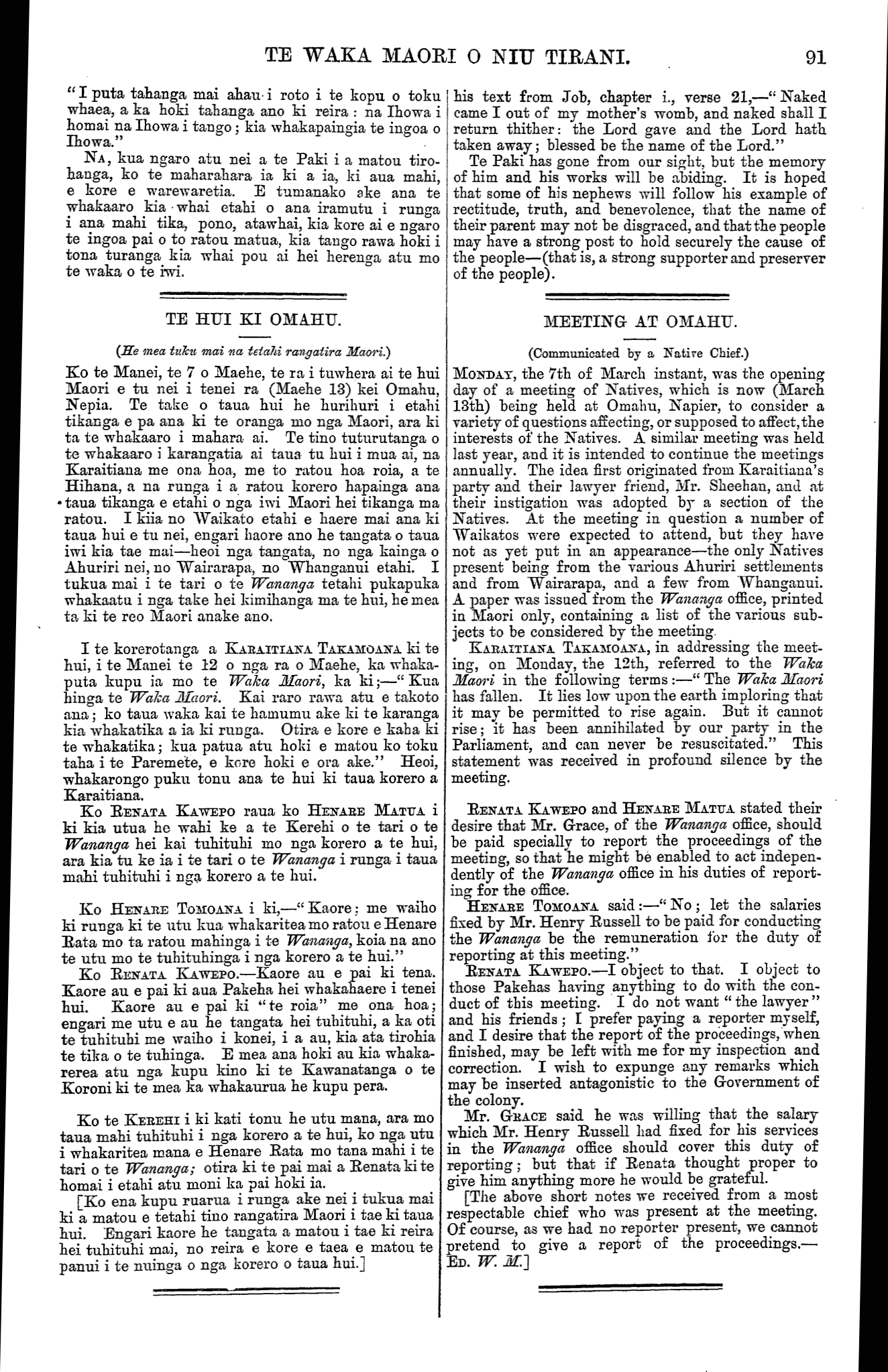TE WAKA MAORI O NIU TIRANI. 91 " I puta tahanga mai ahau i roto i te kopu o toku whaea, a ka hoki tahanga ano ki reira : na Ihowa i homai na Ihowa i tango ; kia whakapangia te ingoa o Ihowa." NA, kua ngaro atu nei a te Paki i a matou tiro- hanga, ko te maharahara ia ki a ia, ki aua mahi, e kore e warewaretia. E tumanako ake ana te whakaaro kia • whai etahi o ana iramutu i runga i ana mahi tika, pono, atawhai, kia kore ai e ngaro te ingoa pai o to ratou matua, kia tango rawa hoki i tona turanga kia whai pou ai hei herenga atu mo te waka o te iwi. TE HUI KI OMAHU. (He mea tuku mai na tetahi rangatira Maori.) Ko te Manei, te 7 o Maehe, te ra i tuwhera ai te hui Maori e tu nei i tenei ra (Maehe 13) kei Omahu, Nepia. Te take o taua hui he hurihuri i etahi tikanga e pa ana ki te oranga mo nga Maori, ara ki ta te whakaaro i mahara ai. Te tino tuturutanga o te whakaaro i karangatia ai taua tu hui i mua ai, na Karaitiana me ona hoa, me to ratou hoa roia, a te Hihana, a na runga i a ratou korero hapainga ana taua tikanga e etahi o nga iwi Maori hei tikanga ma ratou. I kiia no Waikato etahi e haere mai ana ki taua hui e tu nei, engari haore ano he tangata o taua iwi kia tae mai—heoi nga tangata, no nga kainga o Ahuriri nei, no Wairarapa, no Whanganui etahi. I tukua mai i te tari o te Wananga tetahi pukapuka whakaatu i nga take hei kimihanga ma te hui, he mea ta ki te reo Maori anake ano. I te korerotanga a KARAITIANA. TAKAMOANA ki te hui, i te Manei te 12 o nga ra o Maehe, ka whaka- puta kupu ia mo te Waka Maori, ka ki;—" Kua hinga te Waka Maori. Kai raro rawa atu e takoto ana; ko taua waka kai te hamumu ake ki te karanga kia whakatika a ia ki runga. Otira e kore e kaha ki te whakatika; kua patua atu hold e matou ko toku taha i te Paremete, e kore hoki e ora ake." Heoi, whakarongo puku tonu ana te hui ki taua korero a Karaitiana. Ko RENATA KAWEPO raua ko HENARE MATUA i ki kia utua he wahi ke a te Kerehi o te tari o te Wananga hei kai tuhituhi mo nga korero a te hui, ara kia tu ke ia i te tari o te Wananga i runga i taua mahi tuhituhi i nga korero a te hui. Ko HENARE TOMOANA i ki,—" Kaore; me waiho ki runga ki te utu kua whakaritea mo ratou e Henare Rata mo ta ratou mahinga i te Wananga, koia na ano te utu mo te tuhituhinga i nga korero a te hui." Ko RENATA KAWEPO.—Kaore au e pai ki tena. Kaore au e pai ki aua Pakeha hei whakahaere i tenei hui. Kaore au e pai ki "te roia" me ona hoa; engari me utu e au he tangata hei tuhituhi, a ka oti te tuhituhi me waiho i konei, i a au, kia ata tirohia te tika o te tuhinga. E mea ana hoki au kia whaka- rerea atu nga kupu kino ki te Kawanatanga o te Koroni ki te mea ka whakaurua he kupu pera. Ko te KEREHI i ki kati tonu he utu mana, ara mo taua mahi tuhituhi i nga korero a te hui, ko nga utu i whakaritea mana e Henare Rata mo tana mahi i te tari o te Wananga; otira ki te pai mai a Renata ki te homai i etahi atu moni ka pai hoki ia. [Ko ena kupu ruarua i runga ake nei i tukua mai ki a matou e tetahi tino rangatira Maori i tae ki taua hui. Engari kaore he tangata a matou i tae ki reira hei tuhituhi mai, no reira e kore e taea e matou te panui i te nuinga o nga korero o taua hui.] his text from Job, chapter i., verse 21,—" Naked came I out of my mother's womb, and naked shall I return thither: the Lord gave and the Lord hath taken away; blessed be the name of the Lord." Te Paki has gone from our sight, but the memory of him and his works will be abiding. It is hoped that some of his nephews will follow his example of rectitude, truth, and benevolence, that the name of their parent may not be disgraced, and that the people may have a strong post to hold securely the cause of the people—(that is, a strong supporter and preserver of the people). MEETING AT OMAHU. (Communicated by a Native Chief.) MONDAY, the 7th of March instant, was the opening day of a meeting of Natives, which is now (March 13th) being held at Omahu, Napier, to consider a variety of questions affecting, or supposed to affect, the interests of the Natives. A similar meeting was held last year, and it is intended to continue the meetings annually. The idea first originated from Karaitiana's party and their lawyer friend, Mr. Sheehan, and at their instigation was adopted by a section of the Natives. At the meeting in question a number of Waikatos were expected to attend, but they have not as yet put in an appearance—the only Natives present being from the various Ahuriri settlements and from Wairarapa, and a few from Whanganui. A paper was issued from the Wananga office, printed in Maori only, containing a list of the various sub- jects to be considered by the meeting. KARAITIANA TAKAMOANA, in addressing the meet- ing, on Monday, the 12th, referred to the Waka Maori in the following terms :—" The Waka Maori has fallen. It lies low upon the earth imploring that it may be permitted to rise again. But it cannot rise; it has been annihilated by our party in the Parliament, and can never be resuscitated." This statement was received in profound silence by the meeting. RENATA KAWEPO and HENARE MATUA stated their desire that Mr. Grace, of the Wananga office, should be paid specially to report the proceedings of the meeting, so that he might be enabled to act indepen- dently of the Wananga office in his duties of report- ing for the office. HENARE TOMOANA said:—" No ; let the salaries fixed by Mr. Henry Russell to be paid for conducting the Wananga be the remuneration for the duty of reporting at this meeting." RENATA KAWEPO.—I object to that. I object to those Pakehas having anything to do with the con- duct of this meeting. I do not want "the lawyer" and his friends ; I prefer paying a reporter myself, and I desire that the report of the proceedings, when finished, may be left with me for my inspection and correction. I wish to expunge any remarks which may be inserted antagonistic to the Government of the colony. Mr. GRACE said he was willing that the salary which Mr. Henry Russell had 