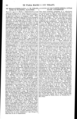 92 TE WAKA MAORI O NIU TIRANI, TE WHAKATUHERATANGA O TE WHARE KURA KI WAIREWA, KATAPERE. No te 6 o nga ra o Maehe i whakatuheratia ai nga whare mo te kura, ara te whare kura me te whare o te mahita, katahi ano ka oti aua whare te whakaara, ko nga moni i utua mo te hanganga e £358. Wha- karitea ana e nga Maori taua ra hei ra noa, karangatia hoki e ratou a ratou hoa Pakeha kia haere mai ki to ratou hui. No te taenga mai o Te Taka i te tahi o nga haora, ka huihui nga tangata ki waho o te whare ki te karanga i a ia; muri iho ka arahina atu nga tamariki i te whare tawhito ki te whare hou, te taenga ki reira, ka timata te mahi whakamatau i a ratou. I haere katoa mai nga Pakeha rangatira o te kainga kia kite i to ratou mahi, ko nga Maori kaore i uru katoa ki roto ki te whare, erangi i tu ki waho tonu o nga wini titiro atu ai ki roto. Nui atu te mohio o nga tamariki ki te reo Pakeha, ki te mahi whika, ki, te tuhituhi, ki te aha ki te aha, kotahi te kau ma tahi marama e whakaakona ana ratou, he mohio no te mahita ki te ako i penei ai te hohoro. I te mutunga o te mahi whakamatau a Te Taka i nga tamariki ka tu ia ki runga ki te whakapuaki i etahi kupu ki nga matua me nga tamariki, i mea, atu ia ki a ratou ka nui te koa o tona ngakau i runga i tenei mahi, inahoki e kitea ana te pai haere o tenei kura i to te mea tuatahi i whakatuheratia ra e ia i te tau 1859, kaore rawa nga tangata i whakaae i te tuatahi kia hanga he whare hou, he inaha nga tau i pehi ai ratou i taua mea, te take, kaore ratou i whakapono ki nga tikanga o te Kawanatanga i mea nei kia whakaturia he whare, kia akona nga tamariki. Erangi kua kite ratou inaianei i te kuare o taua mahi a ratou, a ko tona hiahia kia kaha nga matua ki te tuku i nga tamariki ki te kura i nga ra katoa kia tupu haere ai te pai o tenei kura. Ka mutu nga korero a Te Taka, ka tu a Irai te Hau, a Henare Taura, a te Rev. G. P. Mutu raua ko Rev. Koti te Rato ki te korero i etahi kupu, ko ta Henare Taura he karanga i nga hoa Pakeha. 1 te mutunga o a ratou korero ka tu a Te Buchan (Pakeha), ki te whakahoki atu i a ratou kupu karanga mo nga Pakeha i tae mai nei ki te hui. He maha nga mahi whaka- takaro i rite mo nga tamariki, erangi he putanga mai no te ua ka kino noaiho. I te ahiahi ka huihui katoa nga tangata ki roto ki te whare kura ki te kai ti, he mea ata whakapai a roto o te whare kia ahua ranga- tira ai. Ka mutu te kai, ka waiata nga tamariki ratou ko te mahita i etahi waiata Pakeha, korerotia ana hoki e Te Taka raua ko Te Piripi (Pakeha), etahi korero ahuareka i roto i etahi pukapuka. I te mutunga ka puta mai ano nga tangata ki waho, hanga ana tetahi whakapakoko hei ahua mo te Kuaretanga, he mea hanga ki te kakahu, hoatu ana he paura ki roto ka tahuna ki te ahi; tera atu hoki etahi mea whakatakaro i rite, erangi kaore i taea te whakaoti he kaha no te ua. Heoi, mutu ana i konei nga mahi o taua ra, a e toru umeretanga o te katoa ki a te Kuini, ka hoki ki o ratou kainga. No te ra i muri mai o te hui ka tirohia taua kura e te kai titiro kura ka hoatu nga tohu ki nga tamariki i puta. He pukapuka aua tohu, he mea homai na tetahi Pakeha, ko Coop tona ingoa. I reira hoki tetahi Pakeha ko Teuperena tona ingoa, kite ana ia i te mohio o nga tamariki, a he nui ana kupu whakapai mo ratou, homai ana e ia etahi pukapuka e wha hei hoatu ki nga tamariki mohio rawa, ko te utu i hoatu e ia mo aua mea £1. Kua homai hoki e etahi Pakeha tetahi kapa hiriwa hei hoatu ki te tamaiti mohio rawa o te kura, erangi kaore i whakataua, kua waiho ke mo tera whakama- tauranga hei reira whakarite ai, kua mea mai hoki a Te Coop ka homai e ia a taua wa etahi tohu ano kia toru (he pukapuka) hei tuku ki nga tamariki mohio. E hiahia nui ana matou kia penei tonu te whakaaro o nga Maori ki te tuku i a ratou tamariki ki te kura kia rite tonu ta ratou whakahaere i nga tikanga ki tenei kua oti nei te whakatuhera. OPENING OF THE NATIVE SCHOOL, LITTLE RIVER, CANTERBURY. THE school buildings, consisting of a schoolroom and master's house, which have just been erected, at a cost of £358, by Messrs. Greig Brothers, under Mr. Marley's superintendence, were formally opened on the 6th instant. The day was kept as a strict holiday by the Natives, who invited their European neighbours to be present, and provided a liberal spread for their refreshment. On the arrival of the Rev. J. W. Stack, who reached Little River about 1 o'clock, the Maoris drew up in front of the new buildings and welcomed him with cheers. The chil- dren, who were all remarkably well dressed, were then marched from the old schoolroom to the new, and the public examination commenced. All the principal English settlers in the neighbourhood were present, and those Natives who could not get in crowded round the windows. The progress made by the children in English, geography, arithmetic, and writing during the eleven months the school has been open was very creditable, and reflects the highest credit on Mr. Reeves, the master. At the close of the examination the Rev. J. Stack addressed the children and parents, expressing the pleasure it gave him to witness the improvement in their social condi- tion since he opened the first school in their village in 1859. For many years past they opposed the erection of a new schoolroom, because they distrusted the motives of the Government in offering to erect one, and to educate their children. They had now seen their folly, and he trusted that they would take care :o insure the success of the school by sending all their children, and sending them regularly. The company were then addressed by Eli Tehau, Henare Taura, who welcomed the Europeans, and by Rev. G. P. Mutu and Rev. Scott Rato. Mr. Buchan replied on behalf of the English present. The stormy after- noon rather spoiled the sports which followed the examination. A public tea meeting was held in the evening in the schoolroom, which was prettily deco- rated for the occasion. The tea was followed by an entertainment, which consisted of English songs and 