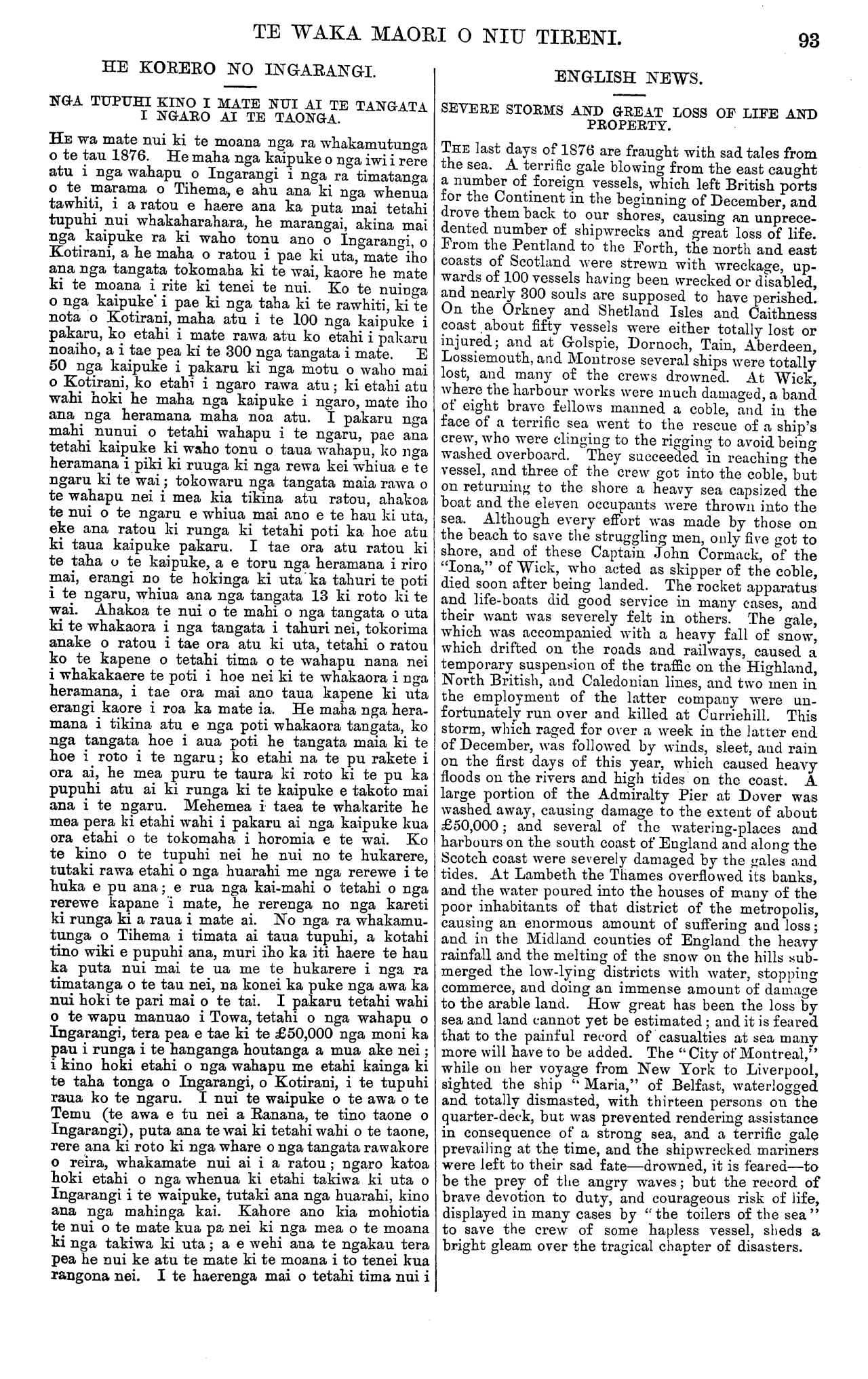 TE WAKA MAORI O NIU TIRENI. 93 HE KORERO NO INGARANGI. NGA TUPUHI KINO I MATE NUI AI TE TANGATA I NGARO AI TE TAONGA. HE wa mate nui ki te moana nga ra whakamutunga o te tau 1876. He maha nga kaipuke o nga iwi i rere atu i nga wahapu o Ingarangi i nga ra timatanga o te marama o Tihema, e ahu ana ki nga whenua tawhiti, i a ratou e haere ana ka puta mai tetahi tupuhi nui whakaharahara, he marangai, akina mai nga kaipuke ra ki waho tonu ano o Ingarangi, o Kotirani, a he maha o ratou i pae ki uta, mate iho ana nga tangata tokomaha ki te wai, kaore he mate ki te moana i rite ki tenei te nui. Ko te nuinga o nga kaipuke" i pae ki nga taha ki te rawhiti, ki te nota o Kotirani, maha atu i te 100 nga kaipuke i pakaru, ko etahi i mate rawa atu ko etahi i pakaru noaiho, a i tae pea ki te 300 nga tangata i mate. E 50 nga kaipuke i pakaru ki nga motu o waho mai o Kotirani, ko etahi i ngaro rawa atu; ki etahi atu wahi hoki he maha nga kaipuke i ngaro, mate iho ana nga heramana maha noa atu. I pakaru nga mahi nunui o tetahi wahapu i te ngaru, pae ana tetahi kaipuke ki waho tonu o taua wahapu, ko nga heramana i piki ki runga ki nga rewa kei whiua e te ngaru ki te wai; tokowaru nga tangata maia rawa o te wahapu nei i mea kia tikina atu ratou, ahakoa te nui o te ngaru e whiua mai ano e te hau ki uta, eke ana ratou ki runga ki tetahi poti ka hoe atu ki taua kaipuke pakaru. I tae ora atu ratou ki te taha o te kaipuke, a e toru nga heramana i riro mai, erangi no te hokinga ki uta ka tahuri te poti i te ngaru, whiua ana nga tangata 13 ki roto ki te wai. Ahakoa te nui o te mahi o nga tangata o uta ki te whakaora i nga tangata i tahuri nei, tokorima anake o ratou i tae ora atu ki uta, tetahi o ratou ko te kapene o tetahi tima o te wahapu nana nei i whakakaere te poti i hoe nei ki te whakaora i nga heramana, i tae ora mai ano taua kapene ki uta erangi kaore i roa ka mate ia. He maha nga hera- mana i tikina atu e nga poti whakaora tangata, ko nga tangata hoe i aua poti he tangata maia ki te hoe i roto i te ngaru; ko etahi na te pu rakete i ora ai, he mea puru te taura ki roto ki te pu ka pupuhi atu ai ki runga ki te kaipuke e takoto mai ana i te ngaru. Mehemea i taea te whakarite he mea pera ki etahi wahi i pakaru ai nga kaipuke kua ora etahi o te tokomaha i horomia e te wai. Ko te kino o te tupuhi nei he nui no te hukarere, tutaki rawa etahi o nga huarahi me nga rerewe i te huka e pu ana; e rua nga kai-mahi o tetahi o nga rerewe kapane i mate, he rerenga no nga kareti ki runga ki a raua i mate ai. No nga ra whakamu- tunga o Tihema i timata ai taua tupuhi, a kotahi tino wiki e pupuhi ana, muri iho ka iti haere te hau ka puta nui mai te ua me te hukarere i nga ra timatanga o te tau nei, ua konei ka puke nga awa ka nui hoki te pari mai o te tai. I pakaru tetahi wahi o te wapu manuao i Towa, tetahi o nga wahapu o Ingarangi, tera pea e tae ki te £50,000 nga moni ka pau i runga i te hanganga houtanga a mua ake nei; i kino hoki etahi o nga wahapu me etahi kainga ki te taha tonga o Ingarangi, o Kotirani, i te tupuhi raua ko te ngaru. I nui te waipuke o te awa o te Temu (te awa e tu nei a Ranana, te tino taone o Ingarangi), puta ana te wai ki tetahi wahi o te taone, rere ana ki roto ki nga whare o nga tangata rawakore o reira, whakamate nui ai i a ratou; ngaro katoa hoki etahi o nga whenua ki etahi takiwa ki uta o Ingarangi i te waipuke, tutaki ana nga huarahi, kino ana nga mahinga kai. Kahore ano kia mohiotia te nui o te mate kua pa nei ki nga mea o te moana ki nga takiwa ki uta; a e wehi ana te ngakau tera pea he nui ke atu te mate ki te moana i to tenei kua rangona nei. I te haerenga mai o tetahi tima nui i ENGLISH NEWS. SEVERE STORMS AND GREAT LOSS OF LIFE AND PROPERTY. THE last days of 1876 are fraught with sad tales from the sea. A terrific gale blowing from the east caught a number of foreign vessels, which left British ports for the Continent in the beginning of December, and drove them back to our shores, causing an unprece- dented number of shipwrecks and great loss of life. From the Pentland to the Forth, the north and east coasts of Scotland were strewn with wreckage, up- wards of 100 vessels having been wrecked or disabled, and nearly 300 souls are supposed to have perished. On the Orkney and Shetland Isles and Caithness coast about fifty vessels were either totally lost or injured; and at Golspie, Dornoch, Tain, Aberdeen, Lossiemouth, and Montrose several ships were totally lost, and many of the crews drowned. At Wick, where the harbour works were much damaged, a band of eight brave fellows manned a coble, and in the face of a terrific sea went to the rescue of a ship's crew, who were clinging to the rigging to avoid being washed overboard. They succeeded in reaching the vessel, and three of the crew got into the coble, but on returning to the shore a heavy sea capsized the boat and the eleven occupants were thrown into the sea. Although every effort was made by those on the beach to save the struggling men, only five got to shore, and of these Captain John Cormack, of the "lona," of Wick, who acted as skipper of the coble, died soon after being landed. The rocket apparatus and life-boats did good service in many cases, and their want was severely felt in others. The gale, which was accompanied with a heavy fall of snow, which drifted on the roads and railways, caused a temporary suspension of the traffic on the Highland, North British, and Caledonian lines, and two men in the employment of the latter company were un- fortunately run over and killed at Curriehill. This storm, which raged for over a week in the latter end of December, was followed by winds, sleet, and rain on the first days of this year, which caused heavy floods on the rivers and high tides on the coast. A large portion of the Admiralty Pier at Dover was washed away, causing damage to the extent of about £50,000; and several of the watering-places and harbours on the south coast of England and along the Scotch coast were severely damaged b