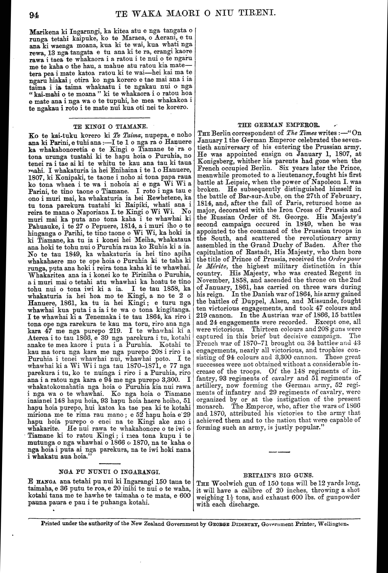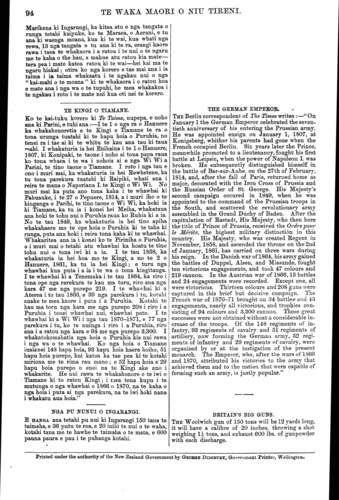 TE WAKA MAORI O NIU TIRENI. Marikena ki Ingarangi, ka kitea atu e nga tangata o runga tetahi kaipuke, ko te Maraea, o Aerani, e tu ana ki waenga moana, kua ki te wai, kua whati nga rewa, 13 nga tangata e tu ana ki te ra, erangi kaore rawa i taea te whakaora i a ratou i te nui o te ngaru me te kaha o the hau, a mahue atu ratou kia mate— tera pea i mate katoa ratou ki te wai—hei kai ma te ngaru hiakai; otira ko nga korero e tae mai ana i ia taima i ia taima whakaatu i te ngakau nui o nga " kai-mahi o te moana " ki te whakaora i o ratou hoa e mate ana i nga wa o te tupuhi, he mea whakakoa i te ngakau i roto i te mate nui kua oti nei te korero. TE KINGI O TIAMANE. Ko te kai-tuku korero ki Te Taima; nupepa, e noho ana ki Parini, e tuhi ana:—I te 1 o nga ra o Hanuere ka whakahonoretia e te Kingi o Tiamane te ra o tona urunga tuatahi ki te hapu hoia o Puruhia, no tenei ra i tae ai ki te whitu te kau ana tau ki taua mahi. I whakaturia ia hei Enihaina i te 1 o Hanuere, 1807, ki Konipaki, te taone i noho ai tona papa raua ko tona whaea i te wa i nohoia ai e nga Wi Wi a Parini, te tino taone o Tiamane. I roto i nga tau e ono i muri mai, ka whakaturia ia hei Rewhetene, ka tu tona parekura tuatahi ki Raipiki, whati ana i reira te mana o Naporiana I. te Kingi o Wi Wi. No muri mai ka puta ano tona kaha i te whawhai ki Pahuauke, i te 27 o Pepuere, 1814, a i muri iho o te hinganga o Parihi, te tino taone o Wi Wi, ka hoki ia ki Tiamane, ka tu ia i konei hei Meiha, whakataua ana hoki te tohu nui o Puruhia raua ko Ruhia ki a ia. No te tau 1849, ka whakaturia ia hei tino apiha whakahaere mo te ope hoia o Puruhia ki te taha ki runga, puta ana hoki i reira tona kaha ki te whawhai. Whakaritea ana ia i konei ko te Piriniha o Puruhia, a i muri mai o tetahi atu whawhai ka hoatu te tino tohu nui o tona iwi ki a ia. I te tau 1858, ka whakaturia ia hei hoa mo te Kingi, a no te 2 o Hanuere, 1861, ka tu ia hei Kingi; e turu nga whawhai kua puta i a ia i te wa o tona kingitanga. I te whawhai ki a Tenemaka i te tau 1864, ka riro i tona ope nga rarekura te kau ma toru, riro ana nga kara 47 me nga purepo 219. I te whawhai ki a Aterea i to tau 1866, e 39 nga parekura i tu, kotahi anake te mea kaore i puta i a Puruhia. Kotahi te kau ma toru nga kara me nga purepo 20$ i riro i a Puruhia i tenei whawhai nui, whawhai poto. I te whawhai ki a Wi Wi i nga tau 1870-1871, e 77 nga parekura i tu, ko te nuinga i riro i a Puruhia, riro ana i a ratou nga kara e 94 me nga purepo 3,300. I whakatokomahatia nga hoia o Puruhia kia nui rawa i nga wa o te whawhai. Ko nga hoia o Tiamane inaianei 148 hapu hoia, 93 hapu hoia haere hoiho, 51 hapu hoia purepo, hui katoa ka tae pea ki te kotahi miriona me te rima rau mano ; e 52 hapu hoia e 29 hapu hoia purepo o enei na te Kingi ake ano i whakarite. He nui rawa te whakahonore o te iwi o • Tiamane ki to ratou Kingi; i taea tona kupu i te mutunga o nga whawhai o 1866 o 1870, na te kaha o nga hoia i puta ai nga parekura, na te iwi hoki nana i whakatu aua hoia." NGA PU NUNUI O INGARANGI. E HANGA ana tetahi pu nui ki Ingarangi 150 taua te taimaha, e 36 putu te roa, e 20 inihi te nui o te waha, kotahi tana me te hawhe te taimaha o te mata, e 600 pauna paura e pau i te puhanga kotahi. THE GERMAN EMPEROR. THE Berlin correspondent of The Times writes :—" On January 1 the German Emperor celebrated the seven- tieth anniversary of his entering the Prussian army. He was appointed ensign on January 1, 1807, at Konigsberg, whither his parents had gone when the French occupied Berlin. Six years later the Prince, meanwhile promoted to a lieutenancy, fought his first battle at Leipsic, when the power of Napoleon I. was broken. He subsequently distinguished himself in the battle of Bar-sur-Aube. on the 27th of February, 1814, and, after the fall of Paris, returned home as major, decorated with the Iron Cross of Prussia and the Russian Order of St. George. His Majesty's second campaign occured in 1849, when he was appointed to the command of the Prussian troops in the South, and scattered the revolutionary army assembled in the Grand Duchy of Baden. After the capitulation of Rastadt, His Majesty, who then bore the title of Prince of Prussia, received the Ordrepour le Merite, the highest military distinction in this country. His Majesty, who was created Regent in November, 1858, and ascended the throne on the 2nd of January, 1861, has carried on three wars during his reign. In the Danish war of 1864, his army gained the battles of Duppel, Alsen, and Missunde, fought ten victorious engagements, and took 47 colours and 219 cannon. In the Austrian war of 1866,15 battles and 24 engagements were recorded. Except one, all were victorious. Thirteen colours and 20S guns were captured in this brief but decisive campaign. The French war of 1870-71 brought ou 34 battles and 43 engagements, nearly all victorious, and trophies con- sisting of 94 colours and 3,300 cannon. These great successes were not obtained without a considerable in- crease of the troops. Of the 148 regiments of in- fantry, 93 regiments of cavalry and 51 regiments of artillery, now forming the German army, 52 regi- ments of infantry and 29 regiments of cavalry, were organized by or at the instigation of the present monarch. The Emperor, who, after the wars of 1S66 and 1870, attributed his victories to the army that achieved them and to the nation that were capable of forming such an army, is justly popular." BRITAIN'S BIG GUNS. THE Woolwich gun of 150 tons will be 12 yards long, it will have a calibre of 20 inches, throwing a shot weighing 1½ tons, and exhaust 600 lbs. of gunpowder with each discharge. Printed under the authority of the New Zealand Government by GEORGE DIDSBURY, Government Printer, Wellington.