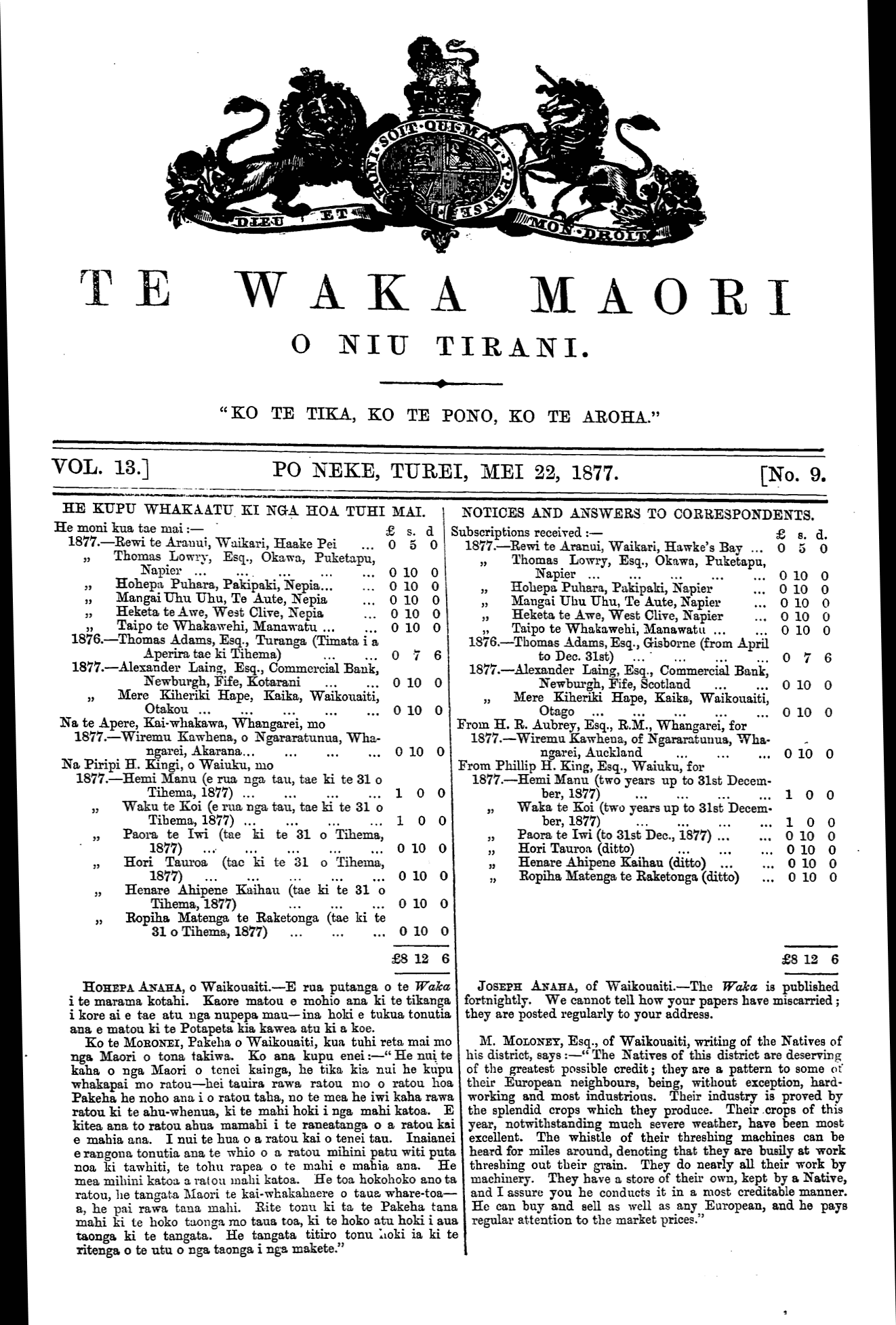 Te Waka Maori o Niu Tirani 1871-1877: Volume 13b, Number 9. 22 May 1877 |