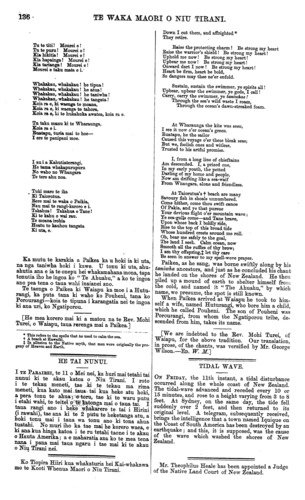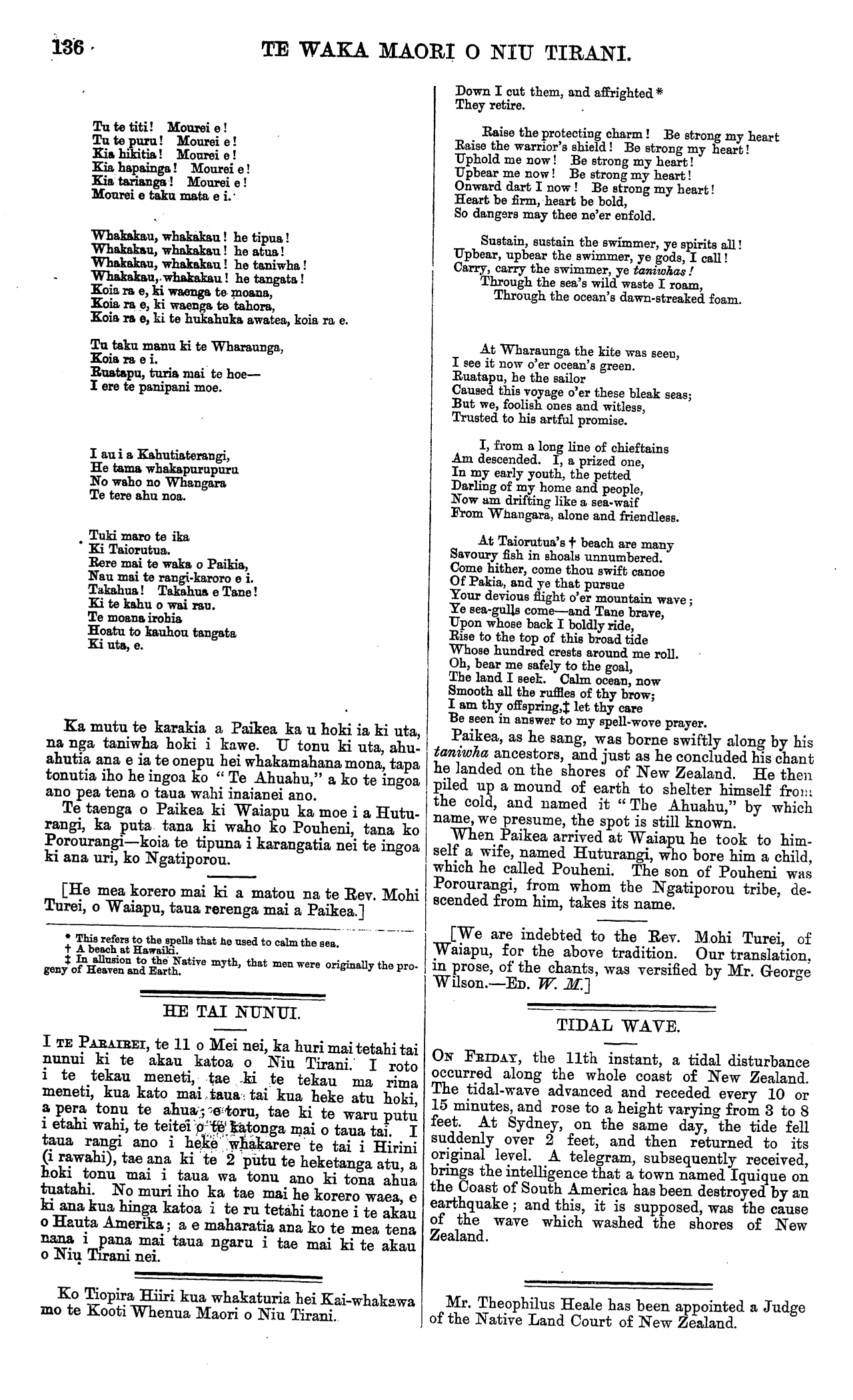 136 TE WAKA MAORI O NIU TIRANI. Tu te titi! Mourei e! Tu te puru! Mourei e! Kia hikitia! Mourei e! Kia hapainga! Mourei e! Kia tarianga! Mourei e! Mourei e taku mata e i! Whakakau, whakakau! he tipua! Whakakau, whakakau! he atua! Whakakau, whakakau! he taniwha! Whakakau, whakakau! he tangata! Koia ra e, ki waenga te moana, Koia ra e, ki waenga te tahora, Koia ra e, ki te hukahuka awatea, koia ra e. Tu taku manu ki te Wharaunga, Koia ra e i. Ruatapu, turia mai te hoe— I ere te panipani moe. I au i a Kahutiaterangi, He tama whakapurupuru No waho no Whangara Te tere aha noa. Tuki maro te ika Ki Taiorutua. Rere mai te waka o Paikia, Nau mai te rangi-karoro e i. Takahua! Takahua e Tane! Ki te kahu o wai rau. Te moana irohia Hoatu to kauhou tangata Ki uta, e. Ka mutu te karakia a Paikea ka u hoki ia ki uta, na nga taniwha hoki i kawe. U tonu ki uta, ahu- ahutia ana e ia te onepu hei whakamahana mona, tapa tonutia iho he ingoa ko " Te Ahuahu," a ko te ingoa ano pea tena o taua wahi inaianei ano. Te taenga o Paikea ki Waiapu ka moe i a Hutu- rangi, ka puta tana ki waho ko Pouheni, tana ko Porourangi—koia te tipuna i karangatia nei te ingoa ki ana uri, ko Ngatiporou. [He mea korero mai ki a matou na te Rev. Mohi Turei, o Waiapu, taua rerenga mai a Paikea.] This refers to the spells that he used to calm the sea. A beach at Hawaiki. In allusion to the Native myth, that men were originally the pro- geny of Heaven and Earth. HE TAI NUNUI. I TE PARAIREI, te 11 o Mei nei, ka huri mai tetahi tai nunui ki te akau katoa o Niu Tirani. I roto i te tekau meneti, tae -ki te tekau ma rima meneti, kua kato mai taua tai kua heke atu hoki, a pera tonu te ahua e toru, tae ki te waru putu i etahi wahi, te teitei o te katonga mai o taua tai. I taua rangi ano i heke whakarere te tai i Hirini (i rawahi), tae ana ki te 2 putu te heketanga atu, a hoki tonu mai i taua wa tonu ano ki tona ahua tuatahi. No muri iho ka tae mai he korero waea, e ki ana kua hinga katoa i te ru tetahi taone i te akau o Hauta Amerika; a e maharatia ana ko te mea tena nana i pana mai taua ngaru i tae mai ki te akau o Niu Tirani nei. Ko Tiopira Hiiri kua whakaturia hei Kai-whakawa mo te Kooti Whenua Maori o Niu Tirani. Down I cut them, and affrighted * They retire. Raise the protecting charm! Be strong my heart Raise the warrior's shield! Be strong my heart! Uphold me now! Be strong my heart! Upbear me now! Be strong my heart! Onward dart I now ! Be strong my heart! Heart be firm, heart be bold, So dangers may thee ne'er enfold. Sustain, sustain the swimmer, ye spirits all! Upbear, upbear the swimmer, ye gods, I call! Carry, carry the swimmer, ye taniwhas ! Through the sea's wild waste I roam, Through the ocean's dawn-streaked foam. At Wharaunga the kite was seen, I see it now o'er ocean's green. Ruatapu, he the sailor Caused this voyage o'er these bleak seas; But we, foolish ones and witless, Trusted to his artful promise. I, from a long line of chieftains Am descended. I, a prized one, In my early youth, the petted Darling of my home and people, Now am drifting like a sea-waif From Whangara, alone and friendless. At Taiorutua's beach are many Savoury fish in shoals unnumbered. Come hither, come thou swift canoe Of Pakia, and ye that pursue Your devious flight o'er mountain wave; Ye sea-gulls come—and Tane brave, Upon whose back I boldly ride, Rise to the top of this broad tide Whose hundred crests around me roll. Oh, bear me safely to the goal, The land I seek. Calm ocean, now Smooth all the ruffles of thy brow; I am thy offspring,! let thy care Be seen in answer to my spell-wove prayer. Paikea, as he sang, was borne swiftly along by his taniwha ancestors, and just as he concluded his chant he landed on the shores of New Zealand. He then piled up a mound of earth to shelter himself from the cold, and named it " The Ahuahu," by which name, we presume, the spot is still known. When Paikea arrived at Waiapu he took to him- self a wife, named Huturangi, who bore him a child, which he called Pouheni. The son of Pouheni was Porourangi, from whom the Ngatiporou tribe, de- scended from him, takes its name. [We are indebted to the Rev. M.ohi Turei, of Waiapu, for the above tradition. Our translation, in prose, of the chants, was versified by Mr. George Wilson.—ED. W. M.] TIDAL WAVE. ON FRIDAY, the 11th instant, a tidal disturbance occurred along the whole coast of New Zealand. The tidal-wave advanced and receded every 10 or 15 minutes, and rose to a height varying from 3 to 8 feet. At Sydney, on the same day, the tide fell suddenly over 2 feet, and then returned to its original level. A telegram, subsequently received, brings the intelligence that a town named Iquique on the Coast of South America has been destroyed by an earthquake; and this, it is supposed, was the cause of the wave which washed the shores of New Zealand. Mr. Theophilus Heale has been appointed a Judge of the Native Land Court of New Zealand.