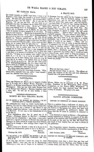 TE WAKA MAORI O NIU TIRANI. 137 HE TAMAITI MAIA. Ko tetahi tamaiti, no tetahi hapu hoia, i tonoa e te Kapene o tona hapu kia inumia e ia tetahi karaahi rama. Ka mea atu taua tamaiti, " He titotara ahau, e kore au e inu i te wai kaha." Ka ki atu ano te Kapene, " E! me inu ano koe. Po noa tenei ra e patupatu ana koe i te tarama, me te haere tonu hoki i te whenua; kaua koe e tohe. E inu ra." Tohe tonu taua tamaiti ra ki te whakakahore. Katahi ka tahuri atu te Kapene ra ki te Meiha, ka mea atu, " Kai te mataku ta tatou tamaiti ki te inu rama. E kore ia e toa tangata." Katahi ka ki ahuareka mai te Meiha ki taua tamaiti," E ta ! kai te whakapehapeha pea koe ki te tono a to rangatira?" Ka mea atu te tamaiti ra, " Kahore, kahore ano au kia turi noa ki nga tono o aku rangatira, engari e tohe tonu aua ahau i nga wa katoa kia tika aku mahi; otira e kore au e kai rama, kei te matau ahau he mea kino ia." Katahi ka karanga ahua riri atu te Meiha ki taua tamaiti, "E inu ra; kai te mohio hoki koe ki te mea ka taringa hoi te hoia ki nga tono a ona rangatira, ka whakamatea rawatia!" Ka maro tonu te titiro atu o nga karu o te tamaiti ki te kanohi o te apiha ra, ka mea atu, " E kara, na te waipiro toku papa i patu i mate ai, a i te wa i tu ai au ki te mahi hoia i ki tuturu atu au ki toku whaea, kore rawa au e pa ki tenei kai ki te rama; a ka tumau tonu au ki taua kupu i ki atu ra au ki a ia. Ka nui ano toku pouri ki te whakapehapehatanga oku ki a koe e tono nei, otira e kore au e takahi i te wairua o toku whaea, e kore au e whakahoki i taku kupu ki a ia." Na, ehara ranei tena tamaiti i te toa ? Kua mohio ia ki te kii i tena kupu KAHORE. Wha- kanui tonu, manaaki tonu aua apiha i taua tamaiti i muri iho, atawhai tonu ratou i a ia. PANUITANGA. TERA nga Paipera reo Maori, mo te tangata e hiahia ana ki te hoko, kei a Rihari Wunu, Tumuaki o te Komiti o te Hunga homai Paipera, kei te Tari Maori, Whanganui. Kua tae mai hoki etahi Paipera hou, na te Hunga tuku Paipera i Ranana, Ingarani, nana i tuku mai. Te utu mo te mea kotahi, e rima herengi. KOMITI MO NGA TIKANGA MAORI. KO TE KUPU A TE KOMITI MO RUNGA I TE PU- KAPUKA-INOI A TIMOTI ROPITINI. He pukapuka-inoi tenei na tetahi hawhe-kaihe no Akaroa, e ki ana ia e whai tikanga ana ki tetahi whe- nua e 50 eka te nui i hokona e nga Maori ki nga Pakeha, engari kua hokona i mua noa atu e te papa o te Kai-inoi. E inoi ana ia kia whakahokia ki a ia te 50 eka ra. Kua whakahaua ahau kia ki penei atu ki te Whare:—Notemea kahore te Kai-inoi i whakaatu korero mai hei whakakaha i nga kupu o tana puka- puka-inoi, i tae atu te kupu a te Komiti kia uiuia nga tikanga e te Taka, minita, ki runga tonu ki te whenua, engari ko te ritenga o taua muinga kihai i hapai i te Kai-inoi. Koia i kore ai te Komiti e kaha ki te ki atu ki te Whare kia whakaarohia paitia te inoi a te Kai-inoi. JOHN BRYCE, Oketopa 24, 1876.Tumuaki. KO TE KUPU A TE KOMITI MO RUNGA I TE PU- KAPUKA-INOI A HENARE TOMOANA ME ONA HOA E 33. E KI ana nga kai-inoi i haere atu ratou ko etahi tangata Maori i mua tata atu nei ki Heretaunga (Hastings) e tata ana ki Nepia ki te tuhituhi i o A BRAVE BOY. A drummer boy was asked by the Captain to drink a glass of rum. But he declined, saying, "I am a temperance boy, and do not taste strong drink." " But you must take some now," said the Captain, " you have been on duty all day, beating the drum, and marching, and now you must not refuse. I insist upon it." But the boy stood firm. The Captain then turned to the Major, and said, " Our little drummer is afraid to drink. He will never make a soldier." " How is this ?" said the Major, in a playful manner, " Do you refuse to obey orders ? " "Sir," said the boy, "I have never refused to obey orders, and have tried to do my duty as a soldier faithfully; but I must refuse to drink rum, for I know it would do me harm." "Then," said the Major, in a stern voice, in order to test his sincerity, " I command you to take a drink, and you know it is death to disobey orders!" The little boy, fixing his clear blue eyes on the officer, said, "Sir, my father died a drunkard, and when I entered the army I promised my mother that I would not taste a drop of rum; and I mean to keep my promise. I am sorry to disobey your orders, Sir; but I would rather suffer anything than disgrace my mother, and break my pledge." Was not that boy a hero ? He had learned when to say NO. The officers ad- mired the conduct of the boy, and ever afterwards treated him with great kindness. NOTICE. MAORI Bibles can be procured of R. W. Woon, Esq., President of the Whanganui Bible Society Committee, at the Native Office, Whanganui. A fresh supply has been received from the parent society in London. The price is 5s. each. NATIVE AFFAIRS COMMITTEE. REPORT ON PETITION OF TIMOTI ROPITINI. THIS is a petition from a half-caste of Akaroa, who alleges that he is entitled to 50 acres of land sold by the Natives to Europeans, but which had been long previously purchased by petitioner's father. He prays that the 50 acres in question be returned to them. I am directed to report as follows:—The petitioner having submitted no evidence in support of the alle- gations of his petition, this Committee caused inquiry to be made on the spot by the Rev. Mr. Stack, but the result of that inquiry has not been ia favour of the petitioner. The Committee cannot, therefore, recommend his prayer to the favourable consideration of the House. JOHN BRYCE, 24th October, 1876.Chairman. REPORT ON PETITION OF HENARE TOMOANA AND 33 OTHERS. PETITIONERS state that a short time ago they and other Natives went to Hastings, near Napier, to sign certain deeds, and that the reason they did not go