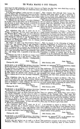 138 TE WAKA MAORI O NIU TIRANI. ratou ingoa ki etahi pukapuka, a ko te take i kore ai ratou e haere ki Nepia he wehi kei whakawaia ratou e te waipiro. E ki ana ratou ahakoa i inaha nga tono a to ratou roia a Te Hiana (Mr. Sheehan) kia haere atu he Kai- whakawa ki te titiro i te tuhituhinga o o ratou ingoa, kihai i taea, a no reira ka nui te raruraru me te mate i pa ki nga kai-inoi me etahi atu. E whakaatu ana nga kai-inoi i ta ratou whakaaro ko te take i kore ai nga apiha i tae ki Heretaunga he mea kia kore ai ratou (nga kai-inoi) e whiwhi ki te moni hei whakahaere i etahi whakawa i roto i te Hupirimi Kooti, a e tono ana ratou kia riria aua apiha mo taua mahi whakaporangi a ratou. Kua whakahaua ahau kia ki penei atu ki te Whare:—E mea ana " Te Ture Arai i nga tuku he i nga Whenua Maori, 1870," e pai ana ma te Kawana i roto i tona Runanga Whakahaere e whakatakoto etahi tikanga hei tohutohu ki nga Komihana Tiaki i runga i te ritenga o ta ratou mahi. E whakaaro ana te Komiti me whakaputa inaianei tonu he tikanga pera me panui ki te Kahiti. Mo runga i te mahi a nga Kai-whakawa Tuturu e titiro nei i nga tuhinga ingoa ki nga pukapuka i runga i nga tikanga o "Te Ture Whenua Maori, 1873," e whakaaro ana te Komiti me whakaputa he kupu tohutohu ki nga Kai-whakawa Tuturu kia titiro ratou i nga tuhituhinga ingoa ki nga pukapuka i nga wa, i nga kainga hoki, e panuitia ai kia kite ai te katoa. E whakaaro ana hoki te Komiti mo runga i tenei mea i whakahuatia nei e nga kai-inoi, i mahi nga Apiha i runga i nga kupu tohutohu i whakaputaina ki a ratou. JOHN BRYCE, Oketopa 25,1876.Tumuaki. KO TE KUPU A TE KOMITI MO RUNGA I TE PUKA- PUKA-INOI (NAMA 2) A NGATITOA (14 NGA INGOA.) Ko nga Kai-inoi no Ngatitoa, e ki ana ratou i te wa i hokona ai, i muri tata iho ranei o te wa i hokona ai, nga whenua e tata ana ki Poneke, i whakaaetia e Ta Hori Kerei kia rahuitia etahi whenua mo nga Maori, a kahore ano ki ea noa aua kupu whakaaeta- nga. Kua whakahaua ahau kia ki penei atu ki te Whare:—E pouri ana te Komiti notemea kahore ratou i whai taima ki te uiui i nga tikanga e taea ai e ratou te whakaputa i tetahi whakaaro ma ratou mo runga i nga kupu o tenei pukapuka-inoi. JOHN BRYCE, Oketopa 25, 1876.Tumuaki. KO TE KUPU A TE KOMITI MO RUNGA I TE PUKA- PUKA-INOI A RUIHA TEIRA ME ONA HOA E 3. HE pukapuka-inoi tenei na Ruiha Teira me ona hoa e 3 o te iwi o Taranaki, e ki ana ratou ko etahi o o ratou whenua e tata ana ki Taranaki kua riro mo te hara o te iwi, engari kahore ratou i uru ki te mau patu ki a te Kuini, e ki ana ratou kua whakaaetia e te Kawanatanga te tika o ta ratou tono, engari kahore ratou i whakaorangia. E tono ana ratou ki te Whare kia whakaorangia ratou. Kua whakahaua ahau kia ki penei atu ki te Whare:—E pouri ana te Komiti notemea kahore ratou i whai taima ki te uiui i nga tikanga e taea ai e ratou te whakaputa i tetahi whakaaro ma ratou mo runga i nga kupu o tenei pukapuka-inoi. JOHN BRYCE, Oketopa 25, 1876.Tumuaki. KO TE KUPU A TE KOMITI MO RUNGA I TE PUKA- PUKA-INOI (NAMA 4) A HIRINI TAIWHANGA ME ONA HOA E 70. E POURI ana nga kai-inoi mo te mahi a te Kooti Whakawa Whenua Maori i riro ai etahi whenua to Napier was that they were afraid they would be led astray by drink. They complain that although their lawyer, Mr. Sheehan, made many efforts to get a magistrate to come out to witness their signatures, those efforts failed, and that great inconvenience and loss resulted therefrom to the petitioners and others. The petitioners express an opinion that the officers did not attend at Hastings because they desired to prevent them (the petitioners) from becoming pos- sessed of money wherewith to try certain cases before the Supreme Court, and they urge that those officers should be reprimanded for behaving in such a maddening way. I am directed to report as follows :—" The Native Lands Frauds Prevention Act, 1870," provides that the Governor in Council may from time to time make regulations for the guidance of Trust Commissioners in the performance of their duties. The Committee is of opinion that such regulations should be at once issued and gazetted. That, in respect to the witnessing of deeds by Resident Magistrates, as required by "The Native Lands Act, 1873," the Committee is of opinion that general instructions should be given to Resident Magistrates to witness such deeds at fixed times and places, of which public notice should be given. The Committee is further of opinion that, in the case referred to by the petitioners, the officers concerned acted in accordance with their instructions. 25th October, 1876. JOHN BRYCE, Chairman. REPORT ON PETITION (No. 2) OF NGATITOA TRIBE (14 SIGNATURES). THE petitioners, who are members of the Ngatitoa tribe, allege that at or after the purchase of lands in the neighbourhood of Wellington, Sir George Grey promised that certain reserves should be made for the Natives, and that these promises have not been carried out. I am directed to report as follows:—The Com- mittee regret that the time at their disposal has not been sufficient to enable them to make such inquiries as would justify them in reporting an opinion on the subject-matter of this petition. JOHN BRYCE, 25th October, 1876.Chairman. REPORT ON PETITION OF RUIHA TEIRA AND 3 OTHERS. THIS is a petition from Ruiha Teira and 3 others, members of the Taranaki tribe. They state that some of their land near Taranaki has been confiscated, but that they took no part in the rebellion; and that the justice of their case has been acknowledged by the Government, but redress has not been afforded. They pray the House to give them relief. I am directed to report as follows:—The Com- mittee regret that the time at their disposal has not been sufficient to enable them to make such inquires as would justify them in reporting an opinion on the subject-matter of this petition. JOHN BRYCE, 25th October, 1876.Chairman. REPORT ON PETITION (No. 4) OF HIRINI TAI- WHANGA AND 70 OTHERS. THE petitioners complain of the action of 
