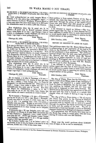 140 TE WAKA MAORI O NIU TIRANI. KO TE KUPU A TE KOMITI MO RUNGA I TE PUKA- PUKA-INOI A WIREMU PUATAATA ME ONA HOA E 5. Ko tenei pukapuka-inoi na etahi tangata Maori o Tokerau e ki ana ratou kua tinihangatia ratou i o ratou whenua e te Kooti Whakawa Whenua Maori, a e tono ana ratou kia utua ranei ratou ki te £50 moni kia whakahokia ranei ki a ratou 1,000 eka whenua. Kua whakahaua ahau kia ki penei atu ki te Whare:—E pouri ana te Komiti notemea kahore ratou i whai taima ki te uiui i nga tikanga e taea ai e ratou te whakaputa i tetahi whakaaro ma ratou mo runga i nga kupu o tenei pukapuka-inoi. JOHN BRYCE, Oketopa 25,1876.Chairman. KO TE KUPU A TE KOMITI MO RUNGA I TE PUKA- PUKA-INOI A ARIHI TE NAHU. E KI ana te Kai-inoi e mea ana a Mr. Henry Robert Russell (Henare Rata), kia riro i a ia tona whenua (to Arihi) kei Te Aute i te porowini o Haake Pei i runga i te kupu kua hokona e ia i te kai-inoi. E ki ana te kai-inoi i hokona tikatia e ia tetahi whenua ki a Te Keneroiho (Kinross) a ko te £1,700 i hoatu e Henare Rata ki a ia, i whakapaua atu ranei e ia hei utu mahi whakawa i Poneke e hara i te utu whenua, engari he mea kia noho tonu ai te kai-inoi i a Henare Rata, kei haere atu ki tetahi pakeha ke. Kua whakahaua ahau kia ki penei atu ki. te Whare:—E pouri ana te Komiti notemea kahore ratou i whai taima ki te uiui i nga tikanga e taea ai e ratou te whakaputa i tetahi whakaaro ma ratou mo runga i nga kupu o tenei pukapuka-inoi. JOHN BRYCE, Oketopa 25,1876.Tumuaki. Ko te nupepa o te taha ki Tauranga e ki ana:— " Kotahi te tamaiti tane o te Arawa, te kau ma rima ona tau, i tahuri i tona hoenga atu i te Puna ki Rangawai i te wiki kua taha ake nei. E hoe ana ko ia anake i runga i tona waka, a ngaro noa iho ana, e maharatia ana kua mate pea ia i te wai. Kua mea nga Maori kia whakamutua e ratou te hi ika i taua wahi, ka pa ra ano kia kitea tona tinana, kia whai takiwa roa ranei e mohiotia ai e kore e kitea." Ko te nupepa o Tauranga e ki ana:—E korerotia ana he nui te pai o te witi a nga Maori i Matapihi. E mahi ana tenei ki te patu, a e kite tonu ana i te pai o te witi i te putanga mai i roto i te mihini, e taimaha rawa ana hoki. Kotahi te poti tomo i te witi i kawea mai ki te taone i te Taitei kua taha ake nei, a i hokona katoatia ki te rima herengi me te hikipene mo te puhera. E korerotia ana e 36 nga kaipuke, rewa tahi nei, kua tahuri i te Moana ki te taha Raki (be moana kai te taha whakarua o Ingarani) i roto i etahi tupuhi i mua tata ake nei. E 215 nga tangata i mate i runga i aua kaipuke ; mahue ana ki te ao e 88 nga wahine pouaru, e 200 nga tamariki pani. Ko te huka e mahia ana i te ao katoa i roto i te tau kotahi, ia tau ia tau, hui katoa e tae ana ki te rua miriona, kotahi rau e wha te kau mano tana. REPORT ON PETITION OF WIREMU PUATAATA AND 5 OTHERS. THIS petition is from certain Natives of the Bay of Islands, who state that they have been " done out of their land", through the action of the Native Lands Court, and pray either that £50 should be paid to them in cash, or that 1,000 acres should be restored to them. I am directed to report as follows:—The Com- mittee regret that the time at their disposal has not been sufficient to enable them to make such inquiries as would justify them in reporting an opinion on the subject-matter of this petition. JOHN BRYCE, 25th October, 1876.Chairman. REPORT ON PETITION OF ARIHI TE NAHU. THE petitioner states that Mr. Henry Robert Russell is endeavouring to get possession of her land at Te Aute, in the Province of Hawke's Bay, alleging that he had purchased it from petitioner. The petitioner however alleges that she sold some land properly to Mr. Kinross, and that £1,700 which Mr. Russell gave her, or rather expended on costs of legal pro- ceedings in Wellington, was not in payment for land, but to induce petitioner to stay with Mr. Russell, and not to go to other Europeans. I am directed to report as follows:—The Com- mittee regret that the time at their disposal has not been sufficient to enable them to make such inquiries as would justify them in reporting an opinion oa the subject-matter of this petition. JOHN BRYCE, 25th October, 1876.Chairman. The Say of Plenty Times has the following:—"A Native youth about fifteen years of age, belonging to the Arawas, was capsized in a canoe while going from Te Puna to Rangawai, one day last week. He was paddling by himself, and has not been seen since, and is supposed to have been drowned. The Natives about the locality have agreed not to fish near the spot until the body is found, or a certain time elapsed when all hopes of finding it may be given up." The Bay of Plenty Times states :—" By all reports the wheat crop grown by the Natives at Matapihi has turned out excellently well. Threshing is being proceeded with by degrees, and as each lot is passed through the machine, the result proves that the grain is heavy and the quality of the best. We are in- formed that a boat-load brought to town on Thursday changed hands at five shillings and sixpence a bushel." • It is ascertained that 36 smacks have been lost in the North Sea, owing to recent gales, with 215 lives, leaving 88 widows and over 200 children. Every year the world produces about 2,140,000 tons of sugar, so far as can be ascertained. Printed under the authority of the New Zealand Government by GEORGE DIDSBURY, Government Printer, Wellington.