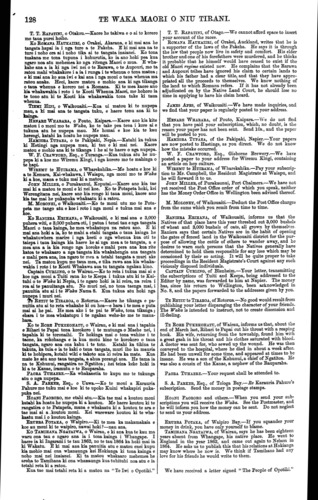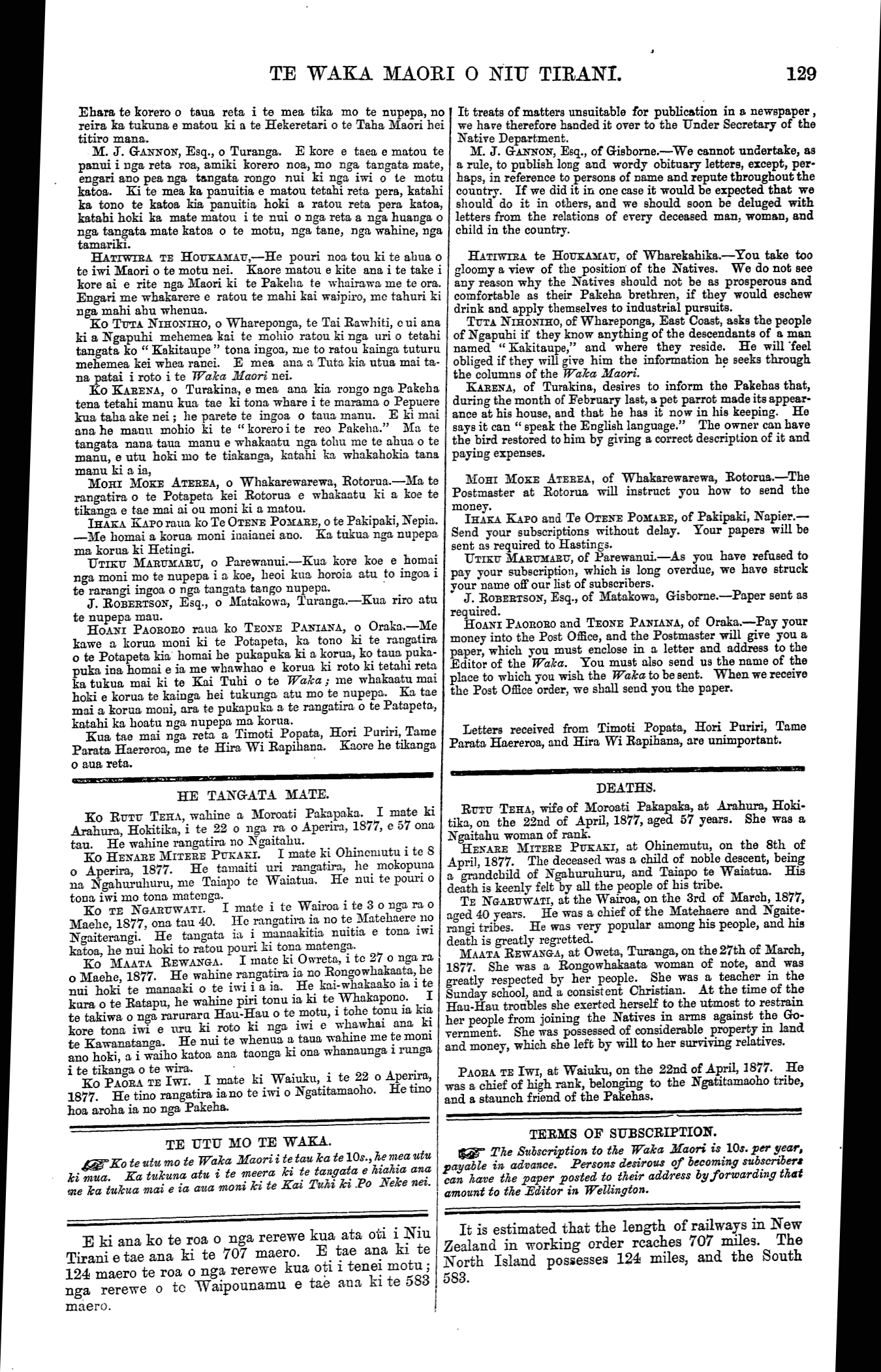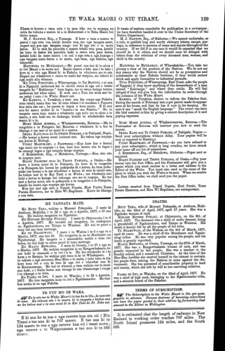 TE WAKA MAORI O NIU TIRANI.129 Ehara te korero o taua reta i te mea tika mo te nupepa no reira ka tukuna e matou ki a te Hekeretari o te Taha Maori hei titiro mana. M. J. GANNON, Esq., o Turanga. E kore e taea e matou te panui i nga reta roa, amiki korero noa, mo nga tangata mate engari ano pea nga tangata rongo nui ki nga iwi o te motu katoa. Ki te mea ka panuitia e matou tetahi reta pera, katahi ka tono te katoa kia panuitia hoki a ratou reta pera katoa, katahi hoki ka mate matou i te nui o nga reta a nga huanga o nga tangata mate katoa o te motu, nga tane, nga wahine, nga tamariki. HATIWIRA TE HOUKAMAU,—He pouri noa tou ki te ahua o te iwi Maori o te motu nei. Kaore matou e kite ana i te take i kore ai e rite nga Maori ki te Pakeha te whairawa me te ora. Engari me whakarere e ratou te mahi kai waipiro, me tahuri ki nga mahi ahu whenua. Ko TUTA NIHONIHO, o Whareponga, te Tai Rawhiti, e ui ana ki a Ngapuhi mehemea kai te mohio ratou ki nga uri o tetahi tangata ko " Kakitaupe " tona ingoa, rae to ratou kainga tuturu mehemea kei whea ranei. E mea ana a Tuta kia utua mai ta- na patai i roto i te Waka Maori nei. Ko KARENA, o Turakina, e mea ana kia rongo nga Pakeha tena tetahi manu kua tae ki tona whare i te marama o Pepuere kua taha ake nei ; he parete te ingoa o taua manu. E ki mai ana he manu mohio ki te " korero i te reo Pakeha." Ma te tangata nana taua manu e whakaatu nga tohu me te ahua o te manu, e utu hoki mo te tiakanga, katahi "ka whakahokia tana manu ki a ia, MOHI MOKE ATEREA, o Whakarewarewa, Rotorua,—Ma te rangatira o te Potapeta kei Rotorua e whakaatu ki a koe te tikanga e tae mai ai ou moni ki a matou. IHAKA KAPO raua ko Te OTENE POMARE, o te Pakipaki, Nepia. —Me homai a korua moni inaianei ano. Ka tukua nga nupepa ma korua ki Hetingi. UTIKU MARUMARU, o Parewanui.—Kua kore koe e homai nga moni mo te nupepa i a koe, heoi kua horoia atu to ingoa i te rarangi ingoa o nga tangata tango nupepa. J. ROBERTSON, Esq., o Matakowa, Turanga.—Kua riro atu te nupepa mau. HOANI PAORORO raua ko TEONE PANIANA, o Oraka.—Me kawe a korua moni ki te Potapeta, ka tono ki te rangatira o te Potapeta kia homai he pukapuka ki a korua, ko taua puka- puka ina homai e ia me whawhao e korua ki roto ki tetahi reta ka tukua mai ki te Kai Tuhi o te Waka; me whakaatu mai hoki e korua te kainga hei tukunga atu mo te nupepa. Ka tae mai a korua moni, ara te pukapuka a te rangatira o te Patapeta, katahi ka hoatu nga nupepa ma korua. Kua tae mai nga reta a Timoti Popata, Hori Puriri, Tame Parata Haereroa, me te Hira Wi Rapihana. Kaore he tikanga o aua reta. HE TANGATA MATE. Ko RUTU TEHA, wahine a Moroati Pakapaka. I mate ki Arahura, Hokitika, i te 22 o nga ra o Aperira, 1877, e 57 ona tau. He wahine rangatira no Ngaitahu. Ko HENARE MITERE PUKAKI. I mate ki Ohinemutu i te 8 o Aperira, 1877. He tamaiti uri rangatira, he mokopuna na Ngahuruhuru, me Taiapo te Waiatua. He nui te pouri o tona iwi nao tona matenga. Ko TE NGARUWATI. I mate i te Wairoa i te 3 o nga ra o Maehe, 1877, ona tau 40. He rangatira ia no te Matehaere no Ngaiterangi. He tangata ia i manaakitia nuitia e tona iwi katoa, he nui hoki to ratou pouri ki tona matenga. Ko MAATA REWANGA. I mate ki Oweta, i te 27 o nga ra o Maehe, 1877. He wahine rangatira ia no Rongo whakaata, he nui hoki te manaaki o te iwi i a ia. He kai-whakaako ia i te kura o te Ratapu, he wahine piri tonu ia ki te Whakapono. I te takiwa o nga raruraru Hau-Hau o te motu, i tohe tonu ia kia kore tona iwi e uru ki roto ki nga iwi e whawhai ana ki te Kawanatanga. He nui te whenua a taua wahine me te moni ano hoki, a i waiho katoa ana taonga ki ona whanaunga i runga i te tikanga o te wira. Ko PAORA TE IWI. I mate ki Waiuku, i te 22 o Aperira, 1877. He tino rangatira ia no te iwi o Ngatitamaoho. He tino hoa aroha ia no nga Pakeha. TE UTU MO TE WAKA. Ko te utu mo te Waka Maori i te tau ka te 10s., he mea utu ki mua. Ka tukuna atu i te meera ki te tangata e hiahia ana me ka tukua mai e ia aua moni ki te Kai Tuhi ki Po Neke nei. E ki ana ko te roa o nga rerewe kua ata oti i Niu Tirani e tae ana ki te 707 maero. E tae ana ki te 124 maero te roa o nga rerewe kua oti i tenei motu; nga rerewe o te Waipounamu e tae aua ki te 583 maero. It treats of matters unsuitable for publication in a newspaper we have therefore handed it over to the Under Secretary of the Native Department. M. J. GANNON, Esq., of Gisborne.—We cannot undertake, as a rule, to publish long and wordy obituary letters, except, per- haps, in reference to persons of name and repute throughout the country. If we did it in one case it would be expected that we should do it in others, and we should soon be deluged with letters from the relations of every deceased man, woman, and child in the country. HATIWIRA te HOUKAMAU, of Wharekahika.—You take too gloomy a view of the position of the Natives. We do not see any reason why the Natives should not be as prosperous and comfortable as their Pakeha brethren, if they would eschew drink and apply themselves to industrial pursuits. TUTA NIHONIHO, of Whareponga, East Coast, asks the people of Ngapuhi if they know anything of the descendants of a man named "Kakitaupe," and where they reside. He will feel obliged if they will give him the information he seeks through the columns of the Waka Maori. KARENA, of Turakina, desires to inform the Pakehas that, during the month of February last, a pet parrot made its appear- ance at his house, and that he has it now in his keeping. He says it can " speak the English language." The owner can have the bird restored to him by giving a correct description of it and paying expenses. MOHI MOKE ATEREA, of Whakarewarewa, Rotorua.—The Postmaster at Rotorua will instruct you how to send the money. IHAKA KAPO and Te OTENE POMARE, of Pakipaki, Napier.— Send your subscriptions without delay. Your papers will be sent as required to Hastings. UTIKU MARUMARU, of Parewanui.—As you have refused to pay your subscription, which is long overdue, we have s
