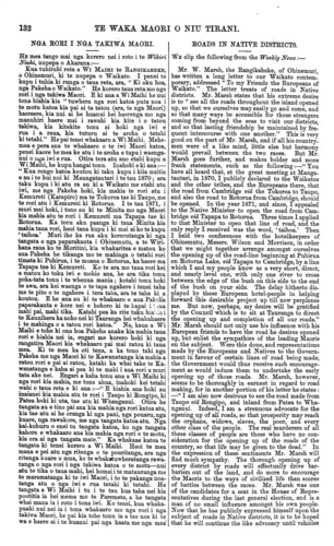 132 TE WAKA MAORI O NIU TIRANI. NGA RORI I NGA TAKIWA MAORI. HE mea tango mai nga korero nei i roto i te Wikiri Niuhi, nupepa o Akarana:— Kua tuhituhi reta a WI MAIHI te RANGIKAHEKE, o Ohinemuri, ki te nupepa o Waikato. I penei te kupu i tuhia ki runga o taua reta, ara, " Ki oku hoa, nga Pakeha o Waikato." He korero taua reta mo nga rori i nga takiwa Maori. E ki ana a Wi Maihi he nui tona hiahia kia " tuwhera nga rori katoa puta noa i te motu katoa kia pai ai ta tatou (ara, ta nga Maori) haereere, kia nui ai he huanui hei haerenga mo nga manuhiri haere mai i rawahi kia kite i o tatou takiwa, kia kitekite tonu ai hoki nga iwi e rua i a raua, kia tuturu ai te aroha o tetahi ki tetahi." He pai tenei whakaaro a Wi Maihi. Mehe- mea e pera ana te whakaaro o te iwi Maori katoa, penei kaore he mea ke atu i te aroha e tupu i waenga- nui o nga iwi e rua. Otira tera atu ano etahi kupu a Wi Maihi, he kupu hangai tonu. Inahoki e ki ana:— " Kua rongo katoa koutou ki taku kupu i kiia nuitia e au i te hui nui ki Maungatautari i te tau 1870; ara taku kupu i ki atu ra au ki a Waikato me etahi atu iwi, me nga Pakeha hoki, kia mahia te rori atu i Kemureti (Karapiro) ma te Tokoroa tae ki Taupo, me te rori atu i Kemureti ki Rotorua. I te tau 1871, i muri mai hoki, i tono au ki te Minita mo nga Maori kia mahia atu te rori i Kemureti ma Tapapa tae ki Rotorua. Ka toru aku paanga ki taua Minita kia mahia taua rori, heoi tana kupu i ki mai ai ko te kupu 'taihoa.' Muri iho ka rua aku korerotanga ki nga tangata o nga paparakauta i Ohinemutu, a te Wiri- hana raua ko te Moritini, kia whakaritea e matou ko aua Pakeha he tikanga mo te mahinga o tetahi rori timata ki Puhirua, i te moana o Rotorua, ka haere ma Tapapa tae ki Kemureti. Ko te ara mo taua rori kei a matou ko toku iwi e mohio ana, he ara tika tonu poka-tata tonu i te whenua mania; kotahi tonu hoki te awa, ara kei waenga o te tapa ngahere i tenei taha me te pito o te ngahere i tera taha, ara te taha ki a koutou. E he ana au ki te whakaaro o aua Pakeha paparakauta e kore nei e hohoro ki te hapai i 1 taua mahi pai, mahi tika. Katahi pea ka rite taku hiahia i te Kaunihera ka noho nei ki Tauranga hei whakahaere i te mahinga o a tatou rori katoa." Na, kaua a Wi Maihi e tone ki ona hoa Pakeha anake kia mahia taua rori e hiahia nei ia, engari me korero hoki ki nga rangatira Maori kia whakaaro pai mai ratou ki taua mea. Ki te mea ka oti tena, a ka tono tahi nga Pakeha me nga Maori ki te Kawanatanga kia mahia a ratou rori e pai ai ratou, katahi ka whai take te Ka- wanatanga e kaha ai pea ki te mahi i aua rori a muri tata ake nei. Engari e kaha tonu ana a Wi Maihi ki nga rori kia mahia, me tona ahua, inahoki kei tetahi wahi o taua reta e ki ana :—" E hiahia ana hoki au inaianei kia mahia atu te rori i Taupo ki Rongipo, ki Patea hoki ki uta, tae atu ki Whanganui. Otira he tangata au e tino pai ana kia mahia nga rori katoa atu, kia tae atu ai he oranga ki nga pani, nga pouaru, nga kuare, nga rawakore, me nga tangata katoa atu. Nga kai-kohuru o enei tu tangata katoa, ko nga tangata kahore e whakaaro ana kia mahia nga rori o te motu, kia ora ai nga tangata mate." Ka whakaae katoa te tangata ki tenei korero a Wi Maihi. Heoi te mea mana e pei atu nga ritenga o te pouritanga, ara nga ritenga kuare o mua, ko te whakatuwheratanga rawa- tanga o nga rori i nga takiwa katoa o te motu—nui atu te tika o taua mahi, hei homai i te matauranga me te maramatanga ki te iwi Maori, i to te pakanga noa- tanga atu o nga iwi e rua tetahi ki tetahi. He tangata a Wi Maihi i tu i te tau kua taha nei kia pootitia ia hei mema mo te Paremete, a he tangata whai mana ia i roto i tona iwi. Ko tenei, kua whaka- puaki nui nei ia i tona whakaaro mo nga rori i nga takiwa Maori, he pai kia tohe tonu ia a tae noa ki te wa e haere ai i te huanui pai nga kaata me nga mea ROADS IN NATIVE DISTRICTS. WE clip the following from the Weekly News:— Mr. W. Marsh, the Rangikaheke, of Ohinemuri, has written a long letter to our Waikato contem- porary, addressed " To my Friends the Europeans of Waikato." The letter treats of roads in Native districts. Mr. Marsh states that his extreme desire is to " see all the roads throughout the island opened up, so that we ourselves may easily go and come, and so that many ways be accessible for those strangers coming from beyond the seas to visit our districts, and so that lasting friendship be maintained by fre- quent intercourse with one another." This is very good on the part of Mr. Marsh, and if all his country- men were of a like mind, little else but harmony would prevail between the two races. But Mr. Marsh goes further, and makes bolder and more frank statements, such as the following:—" Tou have all heard that, at the great meeting at Manga- tautari, in 1870, I publicly declared to the Waikatos and the other tribes, and the Europeans there, that the road from Cambridge via the Tokoroa to Taupo, and also the road to Rotorua from Cambridge, should be opened. In the year 1871, and since, I appealed to the Native Minister to open the road from Cam- bridge via Tapapa to Rotorua. Three times I applied to that Minister to open that line of road, and the only reply I received was the word, 'taihoa.' Then I held two conferences with the hotelkeepers of Ohinemutu, Messrs. Wilson and Morrison, in order that we might together arrange amongst ourselves the opening up of the road-line beginning at Puhirua on Rotorua Lake, via Tapapa to Cambridge, by a line which I and my people know as a very short, direct, and nearly level one, with only one river to cross between the edge of the bush on this side to the end of the bush on your side. The delay Hitherto dis- played by these European hotel-people in helping forward this desirable project up till now perplexes me. But now, perhaps, my desire will be gratified by the Council which is to sit at Tauranga to direct the opening up and completion of all our roads." Mr. Marsh should not only use his influence with his European friends t