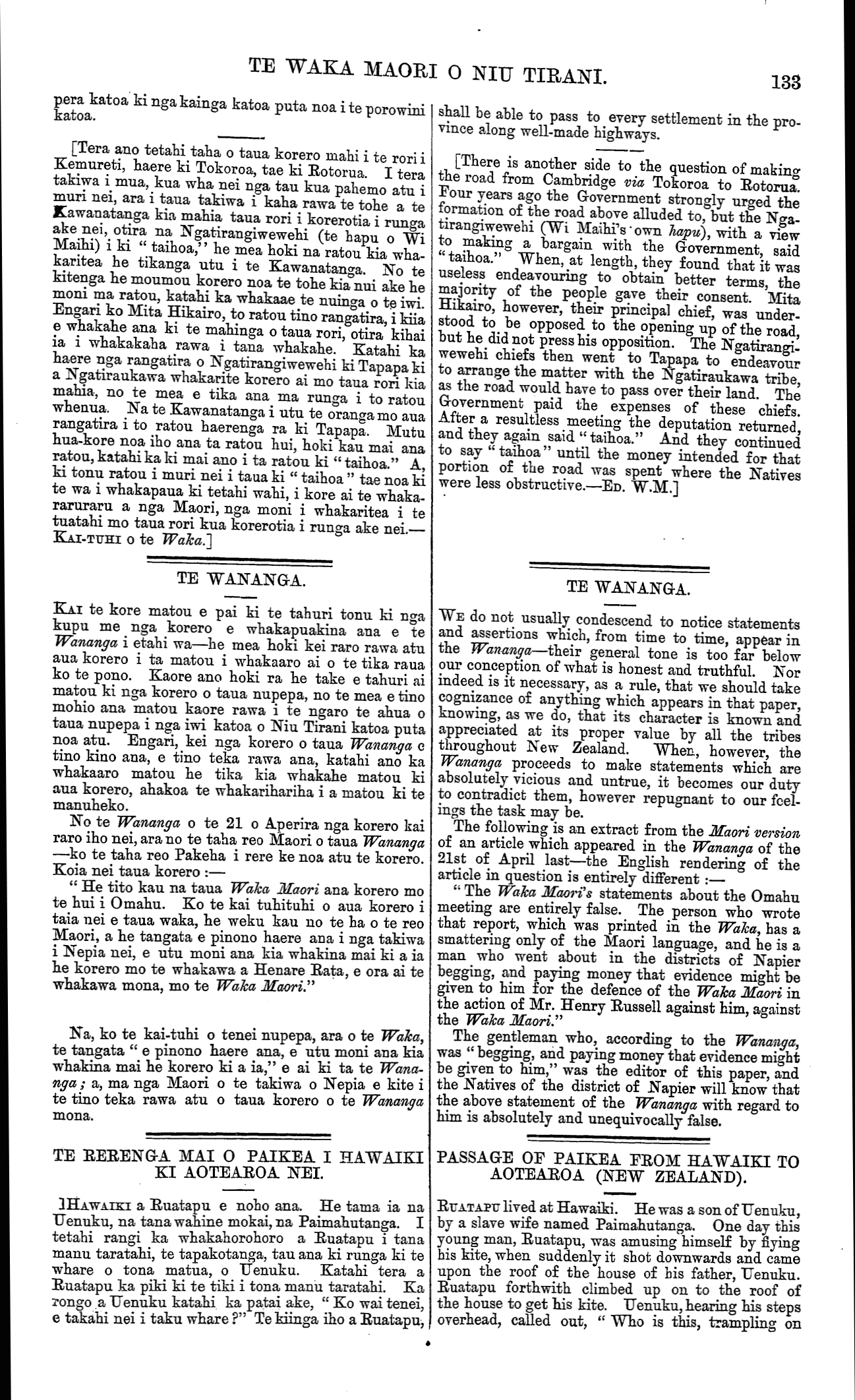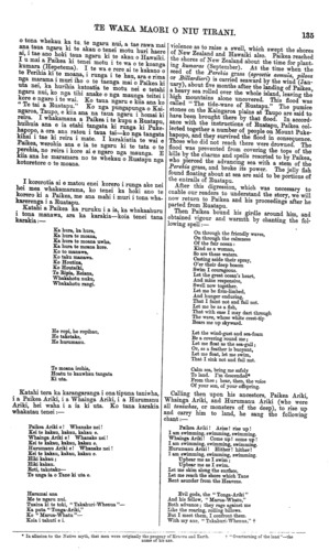 TE WAKA MAORI O NIU TIRANI. 133 pera katoa ki nga kainga katoa puta noa i te porowini katoa. [Tera ano tetahi taha o taua korero mahi i te rori i Kemureti, haere ki Tokoroa, tae ki Rotorua. I tera takiwa i mua, kua wha nei nga tau kua pahemo atu i muri nei, ara i taua takiwa i kaha rawa te tohe a te Kawanatanga kia mahia taua rori i korerotia i runga ake nei, otira na Ngatirangiwewehi (te hapu o Wi Maihi) i ki " taihoa,'' he mea hoki na ratou kia wha- karitea he tikanga utu i te Kawanatanga. No te kitenga he moumou korero noa te tohe kia nui ake he moni ma ratou, katahi ka whakaae te nuinga o te iwi. Engari ko Mita Hikairo, to ratou tino rangatira, i kiia e whakahe ana ki te mahinga o taua rori, otira kihai ia i whakakaha rawa i tana whakahe. Katahi ka haere nga rangatira o Ngatirangiwewehi ki Tapapa ki a Ngatiraukawa whakarite korero ai mo taua rori kia mahia, no te mea e tika ana ma runga i to ratou whenua. Na te Kawanatanga i utu te oranga mo aua rangatira i to ratou haerenga ra ki Tapapa. Mutu hua-kore noa iho ana ta ratou hui, hoki kau mai ana ratou, katahi ka ki mai ano i ta ratou ki " taihoa." A, ki tonu ratou i muri nei i taua ki " taihoa " tae noa ki te wa i whakapaua ki tetahi wahi, i kore ai te whaka- raruraru a nga Maori, nga moni i whakaritea i te tuatahi mo taua rori kua korerotia i runga ake nei.— KAI-TUHI o te Waka.] TE WANANGA. KAI te kore matou e pai ki te tahuri tonu ki nga kupu me nga korero e whakapuakina ana e te Wananga i etahi wa—he mea hoki kei raro rawa atu aua korero i ta matou i whakaaro ai o te tika raua ko te pono. Kaore ano hoki ra he take e tahuri ai matou ki nga korero o taua nupepa, no te mea e tino mohio ana matou kaore rawa i te ngaro te ahua o taua nupepa i nga iwi katoa o Niu Tirani katoa puta noa atu. Engari, kei nga korero o taua Wananga e tino kino ana, e tino teka rawa ana, katahi ano ka whakaaro matou he tika kia whakahe matou ki aua korero, ahakoa te whakarihariha i a matou ki te manuheko. No te Wananga o te 21 o Aperira nga korero kai raro iho nei, ara no te taha reo Maori o taua Wananga —ko te taha reo Pakeha i rere ke noa atu te korero. Koia nei taua korero :— " He tito kau na taua Waka Maori ana korero mo te hui i Omahu. Ko te kai tuhituhi o aua korero i taia nei e taua waka, he weku kau no te ha o te reo Maori, a he tangata e pinono haere ana i nga takiwa i Nepia nei, e utu moni ana kia whakina mai ki a ia he korero mo te whakawa a Henare Rata, e ora ai te whakawa mona, mo te Waka Maori." Na, ko te kai-tuhi o tenei nupepa, ara o te Waka, te tangata " e pinono haere ana, e utu moni ana kia whakina mai he korero ki a ia," e ai ki ta te Wana- nga ; a, ma nga Maori o te takiwa o Nepia e kite i te tino teka rawa atu o taua korero o te Wananga mona. TE RERENGA MAI O PAIKEA I HAWAIKI KI AOTEAROA NEI. HAWAIKI a Ruatapu e noho ana. He taina ia na Uenuku, na tana wahine mokai, na Paimahutanga. I tetahi rangi ka whakahorohoro a Ruatapu i tana manu taratahi, te tapakotanga, tau ana ki runga ki te whare o tona matua, o Uenuku. Katahi tera a Ruatapu ka piki ki te tiki i tona manu taratahi. Ka rongo a Uenuku katahi ka patai ake, " Ko wai tenei, e takahi nei i taku whare ?" Tekiinga iho a Ruatapu, shall be able to pass to every settlement in the pro- vince along well-made highways. [There is another side to the question of making the road from Cambridge via Tokoroa to Rotorua. Four years ago the Government strongly urged the formation of the road above alluded to, but the Nga- tirangiwewehi (Wi Maihi's own hapu), with a view to making a bargain with the Government, said "taihoa." When, at length, they found that it was useless endeavouring to obtain better terms, the majority of the people gave their consent. Mita Hikairo, however, their principal chief, was under- stood to be opposed to the opening up of the road, but he did not press his opposition. The Ngatirangi- wewehi chiefs then went to Tapapa to endeavour to arrange the matter with the Ngatiraukawa tribe, as the road would have to pass over their land. The Government paid the expenses of these chiefs. After a resultless meeting the deputation returned, and they again said "taihoa." And they continued to say " taihoa" until the money intended for that portion of the road was spent where the Natives were less obstructive.—ED. W.M.] TE WANANGA. WE do not usually condescend to notice statements and assertions which, from time to time, appear in the Wananga—their general tone is too far below our conception of what is honest and truthful. Nor indeed is it necessary, as a rule, that we should take cognizance of anything which appears in that paper, knowing, as we do, that its character is known and appreciated at its proper value by all the tribes throughout New Zealand. When, however, the Wananga proceeds to make statements which are absolutely vicious and untrue, it becomes our duty to contradict them, however repugnant to our feel- ings the task may be. The following is an extract from the Maori version of an article which appeared in the Wananga of the 21st of April last—the English rendering of the article in question is entirely different :— " The Waka Maori's statements about the Omahu meeting are entirely false. The person who wrote that report, which was printed in the Waka, has a smattering only of the Maori language, and he is a man who went about in the districts of Napier begging, and paying money that evidence might be given to him for the defence of the Waka Maori in the action of Mr. Henry Russell against him, against the Waka Maori" The gentleman who, according to the Wananga, was " begging, and paying money that evidence might be given to him," was the editor of this paper, and the Natives of the district of Napier will know that the above statement of the Wananga with regard to him is absolutely and unequivocally false. PASSAGE OF PAIKEA PROM HAWAIKI TO AOTEAROA (NEW ZEALAND). RUATAPU lived at Hawaiki. He was a son of Uenuku, by a slave wife named Paimahutanga. One day
