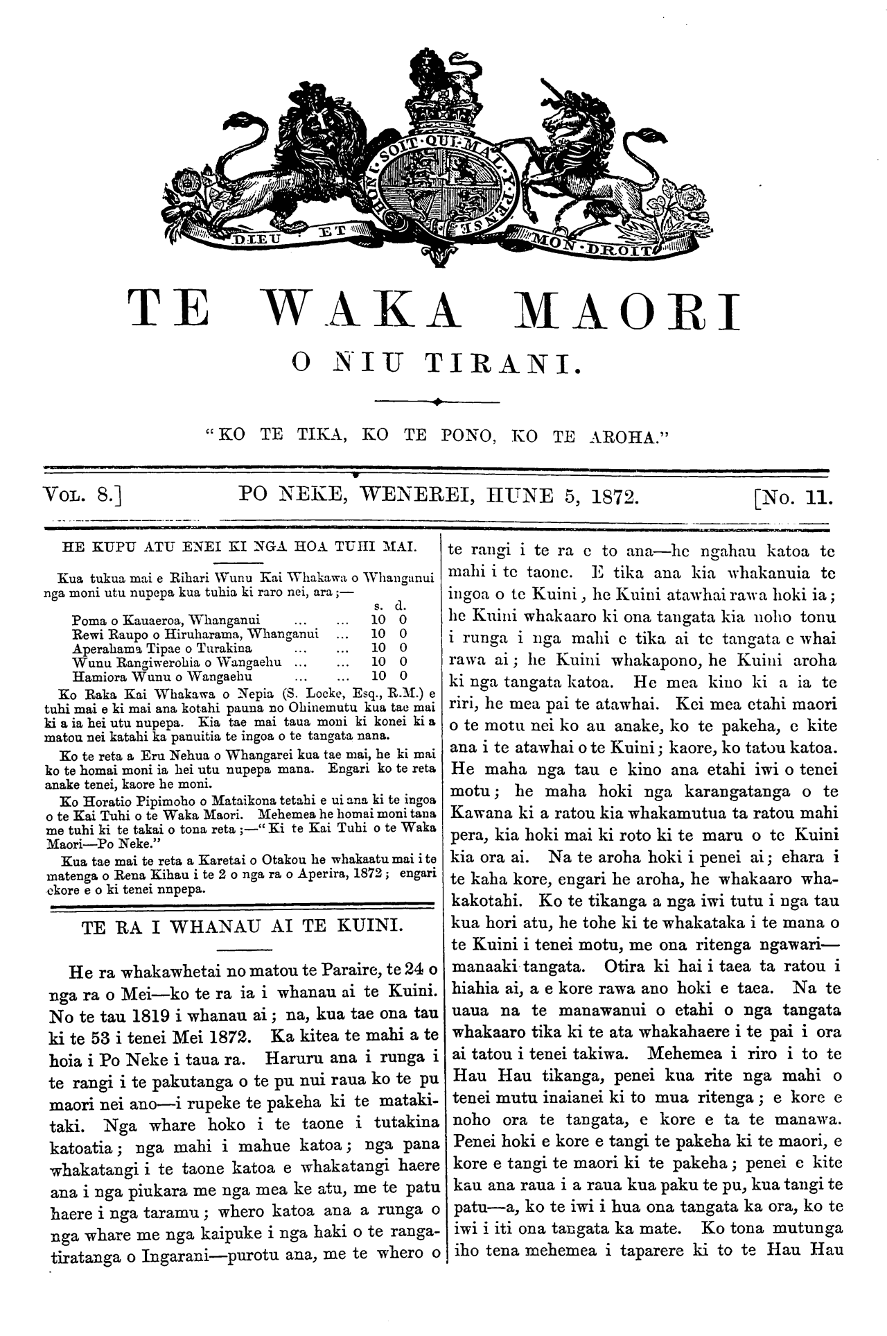 Te Waka Maori o Niu Tirani 1871-1877: Volume 8, Number 11. 05 June 1872 |