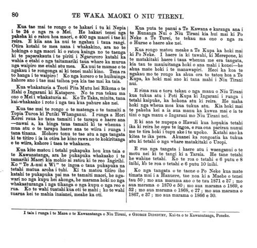 80 TE WAKA MAORI O NIU TIRENI. Kua tae mai te rongo o te hakari i tu ki Nepia i te 24 o nga ra o Mei. He hakari tenei nga pakeha ki o ratou hoa maori, e 400 nga maori i tae ki reira. E kiia ana ka nui te ngahau i taua rangi. Otira kotahi te mea nana i whakakino, ara no te hokinga o nga maori ki o ratou kainga no te taenga ki te paparakauta i te piriti i Ngaruroro katahi ka wahia e etahi o nga taitamariki taua whare ka murua nga waipiro me etahi atu mea. Ka nui te mamae o te ngakau i te rongonga ai ki tenei mahi kino. Tena ra to hanga i te waipiro! Ko nga korero o te huihuinga kahore ano i tae mai taihoa pea kia tae mai ka taia. Kua whakaturia a Teoti Pita Mutu hei Rikona o te Hahi o Ingarani ki Katapere. No te rua tekau ma ono o Mei i whakaturia ai. Ko Te Taka, minita, tana kai-whakaako i roto i nga tau kua pahure ake nei. Kua tae mai te rongo o te matenga o te tamaiti a Topia Turoa ki Putiki Whanganui. I runga a Hori Kerei raua ko taua tamaiti i te tarapu e haere ana —nawai a, ka hinga taua tamaiti ki te whenua i mua atu o te tarapu haere ana te wiira i runga i tana tinana. Hohoro tonu te tae atu a nga tangata ki te titiro i ia ia otira he kino rawa no te kokiritanga e te wiira, kahore i taea te whakaora. Kua kite matou i tetahi pukapuka hou kua taia e te Kawanatanga, ara he pukapuka whakaako i te tamariki Maori kia mohio ai ratou ki te reo Ingirihi. Ko " Te A-nui a Wi " te ingoa o taua pukapuka na tetahi matua aroha i tuhi. Ki ta matou titiro iho katahi te pukapuka pai ma te tamaiti maori, he nga- wari no nga kupu hei akonga, he marama hoki no nga whakaaturanga i nga tikanga o nga kupu o nga reo e rua. Ko te wahi tuatahi kua oti te mahi; ko te wahi tuarua kei te mahia inaianei, meake ka oti. Kua puta te panui a Te Kawana e karanga ana i te Runanga Nui o Niu Tirani kia hui mai ki Po Neke a Te Turei, te tekau ma ono o nga ra o Hurae e haere ake nei. Kua rongo matou meake a Te Kupa ka hoki mai ki Po Neke. I haere ia ki tawahi, ki Merepone, ki te matakitaki haere i taua whenua me era tangata, kia tau te mauiuitanga hoki o ana mahi i konei—he ahua mate hoki i te manawapiri. Heoi ka koa te ngakau mo te rongo ka ahua ora to tatou hoa a Te Kupa, ka hoki mai ano ki tana mahi i Niu Tirani nui. E rima rau e toru tekau o nga manu o Niu, Tirani kua tukua atu i Poti Kupa ki Ingarani i runga i tetahi kaipuke, ka hokona atu ki reira. He maha hoki nga wheua moa kua tukua atu. Kia hoki mai te pakeha kei a ia aua manu ka kawea mai e ia te tini o nga manu o Ingarani mo Niu Tirani nei. E ki ana te nupepa o Hawaii kua hopukia tetahi ika ki reira he oopu te ingoa, e rua ona parirau nunui me te tira hoki i tupu ake i te upoko. Katahi ano ka kitea te ika pera. Akuanei ka rongoatia ka tukua atu ki tetahi o nga whare matakitaki o Uropi. E rua nga tangata i haere atu i waenganui o te motu nei ki te tangi ki a Taraia. He tane tetahi he wahine tetahi. Ko te roa o tetahi e 6 putu e 8 inihi, ko te roa o tetahi e 6 putu 10 inihi. Ko nga tangata o te taone o Po Neke kua mate timata mai i a Hanuere, tae noa ki a Maehe o tenei tau 50 ; mo aua marama ano o te tau 1871 e 37 ; mo aua marama o 1870 e 50; mo aua marama o 1869, e 52 ; mo aua marama o 1868, e 27 ; mo aua marama o 1867, e 37 ; mo aua marama o 1866 e 3O.