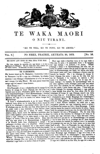 Te Waka Maori o Niu Tirani 1871-1877: Volume 8, Number 16. 30 August 1872 |