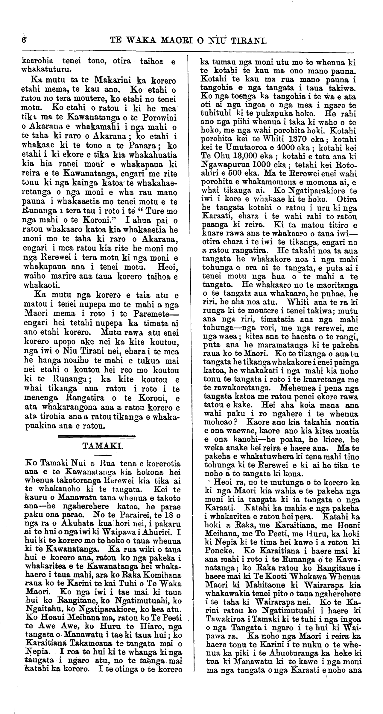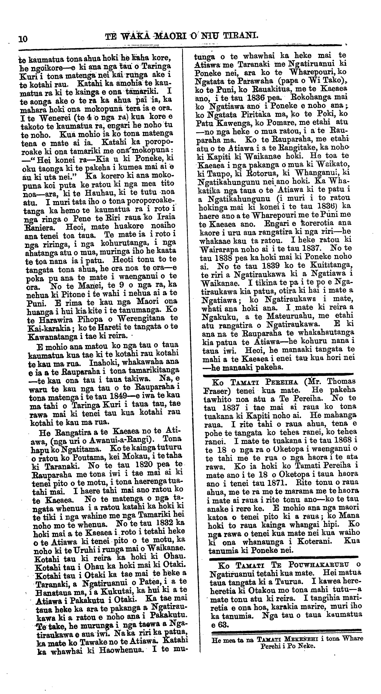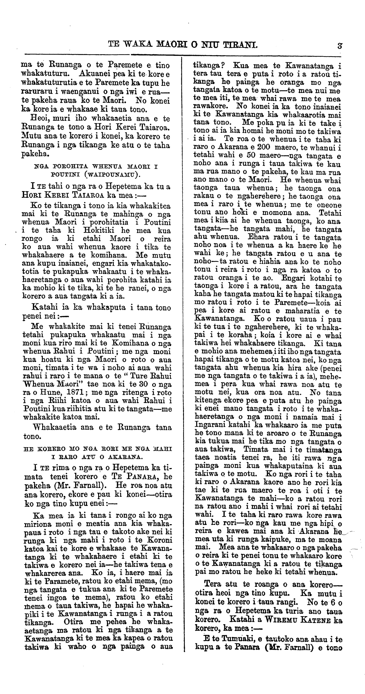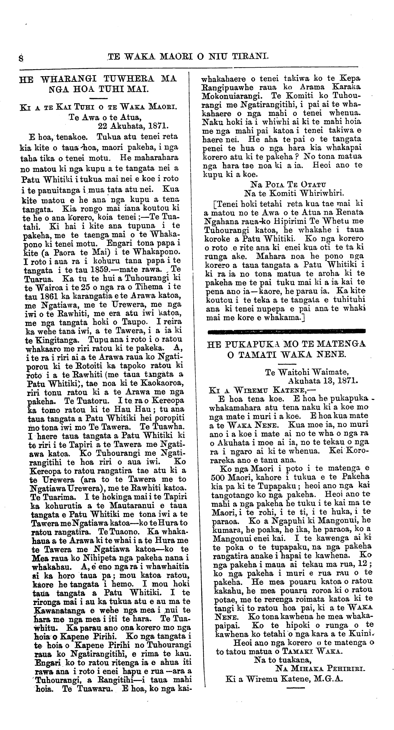 TE WAKA MAORI O NIU TIRANI. HE WHARANGI TUWHERA MA NGA HOA TUHI MAI. KI A TE KAI TUHI O TE WAKA MAORI. Te Awa o te Atua, 22 Akuhata, 1871. E hoa, tenakoe. Tukua atu tenei reta kia kite o taua hoa, maori pakeha, i nga taha tika o tenei motu. He maharahara no matou ki nga kupu a te tangata nei a Patu Whitiki i tukua mai nei e koe i roto i te panuitanga i mua tata atu nei. Kua kite matou e he ana nga kupu a tena tangata. Kia rongo mai iana koutou ki te he o ana korero, koia tenei;—Te Tua- tahi. Ki hai i kite ana tupuna i te pakeha, me te taenga mai o te Whaka- pono ki tenei motu. Engari tona papa i kite (a Paora te Mai) i te Whakapono. I roto i aua ra i kohura tana papa i te tangata i te tau 1859.—mate rawa. Te Tuarua. Ka tu te hui a Tuhourangi ki te Wairoa i te 25 o nga ra o Tihema i te tau 1861 ka karangatia e te Arawa katoa, me Ngatiawa, me te Urewera, me nga iwi o te Rawhiti, me era ata iwi katoa, me nga tangata hoki o Taupo. I reira ka wehe tana iwi, a te Tawera, i a ia ki te Kingitanga. Tupa ana i roto i o ratou whakaaro me riri ratou ki te pakeka. A, i te ra i TUI ai a te Arawa raua ko Ngati- porou ki te Rotoiti ka tapoko ratou ki roto i a te Rawhiti (me taua tangata a Patu Whitiki), tae noa ki te Kaokaoroa, riri tonu ratou ki a te Arawa me nga pakeha. Te Tuatoru. I te ra o Kereopa ka tomo ratou ki te Hau Hau; tu ana taua tangata a Patu Whitiki hei poropiti mo tona iwi mo Te Tawera. Te Tuawha. I haere taua tangata a Patu Whitiki ki he riri i te Tapiri a te Tawera me Ngati- awa katoa. Ko Tuhourangi me Ngati- rangitihi te hoa riri o aua iwi. Ko Kereopa to ratou rangatira tae atu ki a te Urewera (ara to te Tawera me to Ngatiawa Urewera), me te Rawhiti katoa. Te Tuarima. I te hokinga mai i te Tapiri ka kohurutia a te Mautaranui e taua tangata e Patu Whitiki me tona iwi a te Tawera me Ngatiawa katoa—ko te Hura to ratou rangatira. Te Tuaono. Ka whaka- haua a te Arawa ki te whai i a te Hura me te Tawera me Ngatiawa katoa—ko te Mea raua ko Nihipeta nga pakeha nana i whakahau. A, e ono nga ra i whawhaitia ai ka horo taua pa; mou katoa ratou, kaore he tangata i hemo. I mou hoki taua tangata a Patu Whitiki. I te rironga mai i au ka tukua atu e au ma te Kawanatanga e wehe nga mea i nui te hara me nga mea i iti te hara. Te Tua- whitu. Ka parau ano ona korero mo nga hoia o Kapene Pirihi. Ko nga tangata i te hoia o Kapene Pirihi no Tuhourangi raua ko Ngatirangitihi, e rima te kau. Engari ko to ratou ritenga ia e ahua iti rawa ana i roto i enei hapu e rua —ara a Tuhourangi, a Rangitihi—i taua mahi hoia. Te Tuawaru. E hoa, ko nga kai- whakahaere o tenei takiwa ko te Kepa Rangipuawhe raua ko Arama Karaka Mokonuiarangi. Te Komiti ko Tuhou- rangi me Ngatirangitihi, i pai ai te wha- kahaere o nga mahi o tenei whenua. Naku hoki ia i whiwhi ai ki te mahi hoia me nga mahi pai katoa i tenei takiwa e haere nei. He aha te pai o te tangata penei te hua o nga hara kia whakapai korero atu ki te pakeha? No tona matua nga hara tae noa ki a ia. Heoi ano te kupu ki a koe. Na POIA TE OTATU Na te Komiti Whiriwhiri. [Tenei hoki tetahi reta kua tae mai ki a matou no te Awa o te Atua na Renata Ngahana raua-ko Hipirimi Te Whetu me Tuhourangi katoa, he whakahe i taua koroke a Patu Whitiki. Ko nga korero o roto e rite ana ki enei kua oti te ta ki runga ake. Mahara noa he pono nga korero a taua tangata a Patu Whitiki i ki ra ia no tona matua te aroha ki te pakeha me te pai tuku mai ki a ia kai te pena ano ia—kaore, he parau ia. Ka kite koutou i te teka a te tangata e tuhituhi ana ki tenei nupepa e pai ana te whaki mai me kore e whakama.] HE PUKAPUKA MO TE MATENGA O TAMATI WAKA NENE. Te Waitohi Waimate, Akuhata 13, 1871. KI A WIREMU KATENE,— E hoa tena koe. E hoa he pukapuka whakamahara atu tena naku ki a koe mo nga mate i muri i a koe. E hoa kua mate a te WAKA NENE. Kua moe ia, no muri ano i a koe i mate ai no te wha o nga ra o Akuhata i moe ai ia, no te tekau o nga ra i ngaro ai ki te whenua. Kei Koro- rareka ano e tanu ana. Ko nga Maori i poto i te matenga e 500 Maori, kahore i tukua e te Pakeha kia pa ki te Tupapaku; heoi ano nga kai tangotango ko nga pakeha. Heoi ano te mahi a nga pakeha he tuku i te kai ma te Maori, i te rohi, i te ti, i te huka, i te paraoa. Ko a Ngapuhi ki Mangonui, he kumara, he poaka, he ika, he paraoa, ko a Mangonui enei kai. I te kawenga ai ki te poka o te tupapaku, na nga pakeha rangatira anake i hapai te kawhena. Ko nga pakeha i maua ai tekau ma rua, 12; ko nga pakeha i muri e rua rau o te pakeha. He mea pouaru katoa o ratou kakahu, he mea pouaru roroa ki o ratou potae, me te rerenga roimata katoa ki te tangi ki to ratou hoa pai, ki a te WAKA. NENE. Ko tona kawhena he mea whaka- paipai. Ko te hipoki o runga o te kawhena ko tetahi o nga kara a te Kuini. Heoi ano nga korero o te matenga o to tatou matua o TAMAKI WAKA. Na to tuakana, NA MIHAKA PEHIRIRI. Ki a Wiremu Katene, M.G.A.
