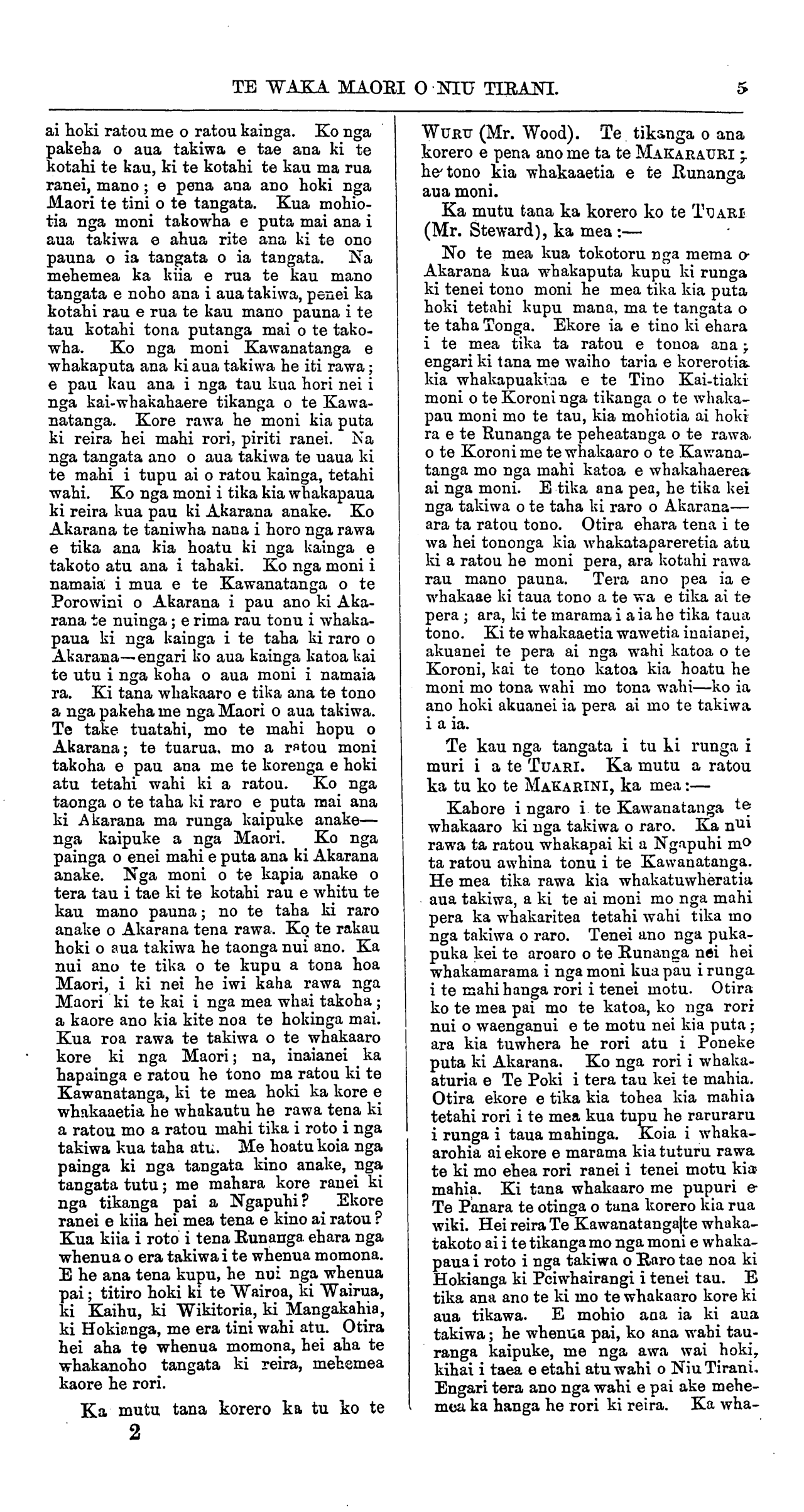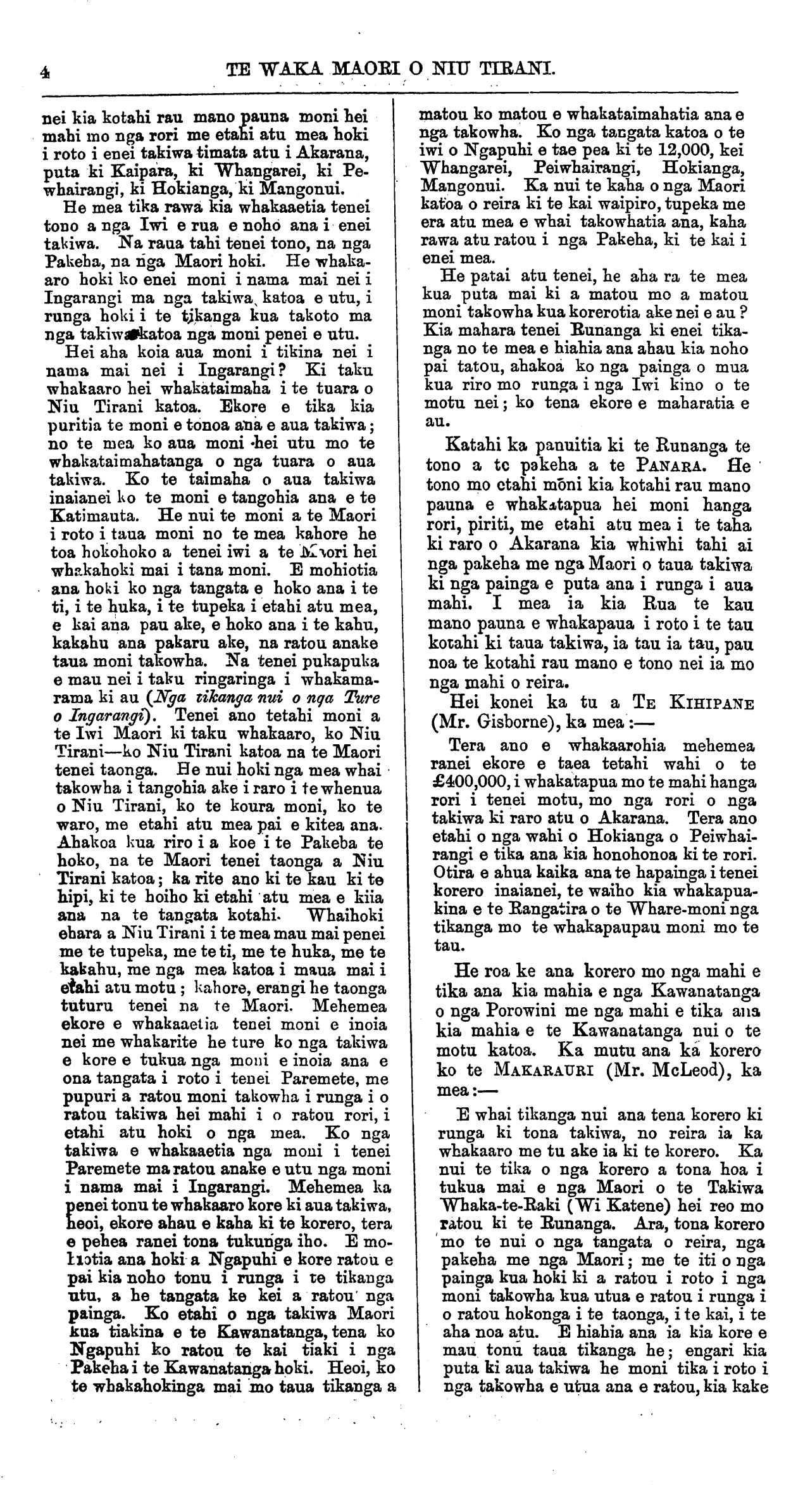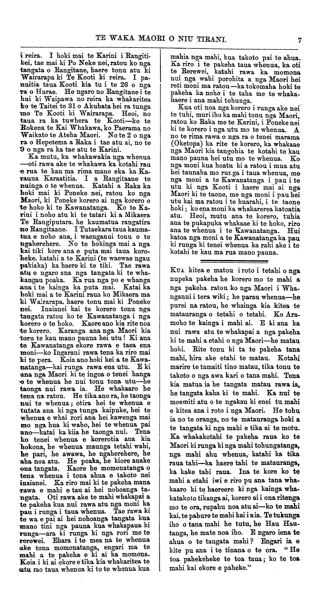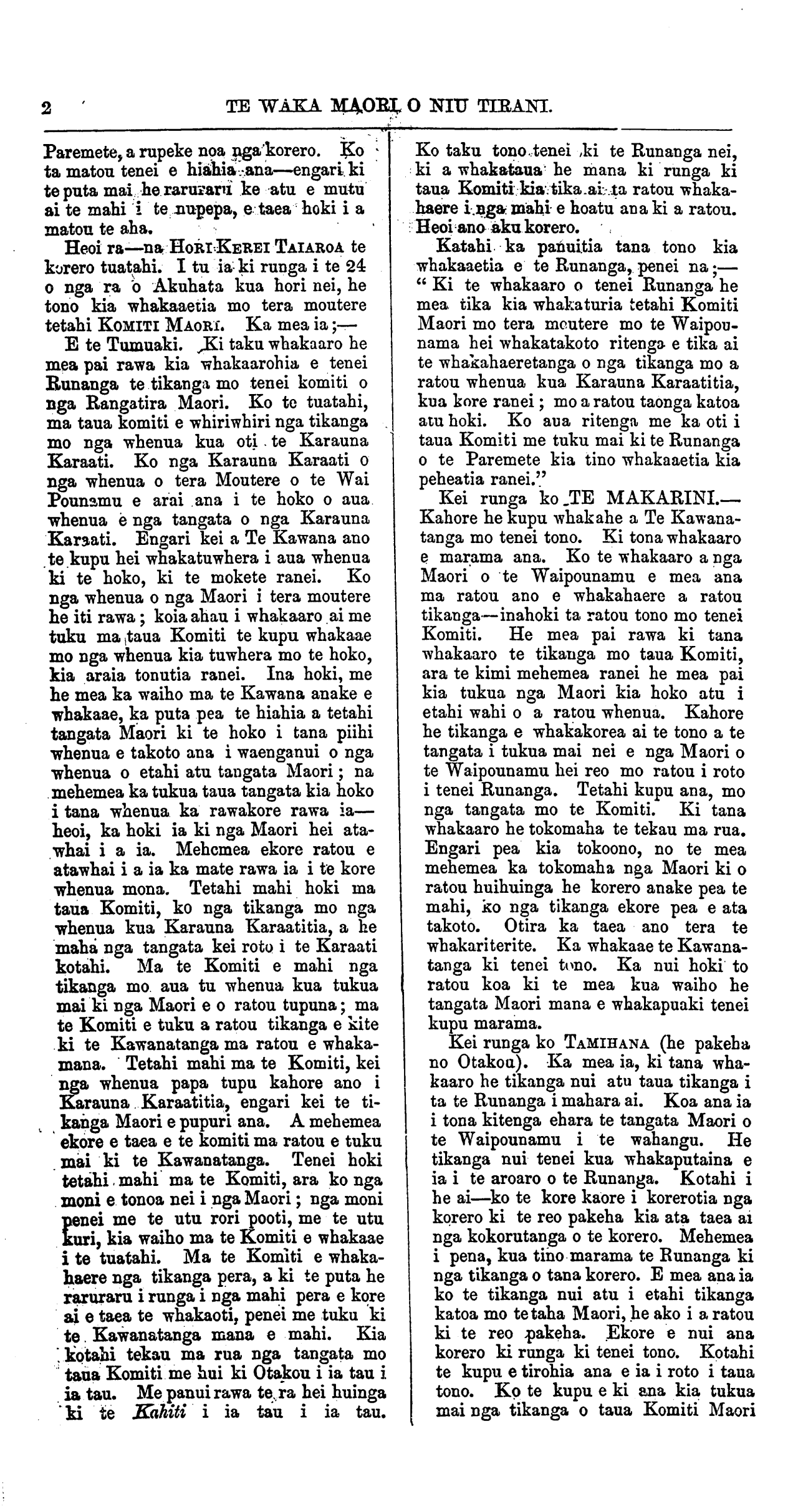TE WAKA MAORI O NIU TIRANI. HE WHARANGI TUWHERA MA NGA HOA TUHI MAI. KI A TE KAI TUHI O TE WAKA MAORI. Te Awa o te Atua, 22 Akuhata, 1871. E hoa, tenakoe. Tukua atu tenei reta kia kite o taua hoa, maori pakeha, i nga taha tika o tenei motu. He maharahara no matou ki nga kupu a te tangata nei a Patu Whitiki i tukua mai nei e koe i roto i te panuitanga i mua tata atu nei. Kua kite matou e he ana nga kupu a tena tangata. Kia rongo mai iana koutou ki te he o ana korero, koia tenei;—Te Tua- tahi. Ki hai i kite ana tupuna i te pakeha, me te taenga mai o te Whaka- pono ki tenei motu. Engari tona papa i kite (a Paora te Mai) i te Whakapono. I roto i aua ra i kohura tana papa i te tangata i te tau 1859.—mate rawa. Te Tuarua. Ka tu te hui a Tuhourangi ki te Wairoa i te 25 o nga ra o Tihema i te tau 1861 ka karangatia e te Arawa katoa, me Ngatiawa, me te Urewera, me nga iwi o te Rawhiti, me era ata iwi katoa, me nga tangata hoki o Taupo. I reira ka wehe tana iwi, a te Tawera, i a ia ki te Kingitanga. Tupa ana i roto i o ratou whakaaro me riri ratou ki te pakeka. A, i te ra i TUI ai a te Arawa raua ko Ngati- porou ki te Rotoiti ka tapoko ratou ki roto i a te Rawhiti (me taua tangata a Patu Whitiki), tae noa ki te Kaokaoroa, riri tonu ratou ki a te Arawa me nga pakeha. Te Tuatoru. I te ra o Kereopa ka tomo ratou ki te Hau Hau; tu ana taua tangata a Patu Whitiki hei poropiti mo tona iwi mo Te Tawera. Te Tuawha. I haere taua tangata a Patu Whitiki ki he riri i te Tapiri a te Tawera me Ngati- awa katoa. Ko Tuhourangi me Ngati- rangitihi te hoa riri o aua iwi. Ko Kereopa to ratou rangatira tae atu ki a te Urewera (ara to te Tawera me to Ngatiawa Urewera), me te Rawhiti katoa. Te Tuarima. I te hokinga mai i te Tapiri ka kohurutia a te Mautaranui e taua tangata e Patu Whitiki me tona iwi a te Tawera me Ngatiawa katoa—ko te Hura to ratou rangatira. Te Tuaono. Ka whaka- haua a te Arawa ki te whai i a te Hura me te Tawera me Ngatiawa katoa—ko te Mea raua ko Nihipeta nga pakeha nana i whakahau. A, e ono nga ra i whawhaitia ai ka horo taua pa; mou katoa ratou, kaore he tangata i hemo. I mou hoki taua tangata a Patu Whitiki. I te rironga mai i au ka tukua atu e au ma te Kawanatanga e wehe nga mea i nui te hara me nga mea i iti te hara. Te Tua- whitu. Ka parau ano ona korero mo nga hoia o Kapene Pirihi. Ko nga tangata i te hoia o Kapene Pirihi no Tuhourangi raua ko Ngatirangitihi, e rima te kau. Engari ko to ratou ritenga ia e ahua iti rawa ana i roto i enei hapu e rua —ara a Tuhourangi, a Rangitihi—i taua mahi hoia. Te Tuawaru. E hoa, ko nga kai- whakahaere o tenei takiwa ko te Kepa Rangipuawhe raua ko Arama Karaka Mokonuiarangi. Te Komiti ko Tuhou- rangi me Ngatirangitihi, i pai ai te wha- kahaere o nga mahi o tenei whenua. Naku hoki ia i whiwhi ai ki te mahi hoia me nga mahi pai katoa i tenei takiwa e haere nei. He aha te pai o te tangata penei te hua o nga hara kia whakapai korero atu ki te pakeha? No tona matua nga hara tae noa ki a ia. Heoi ano te kupu ki a koe. Na POIA TE OTATU Na te Komiti Whiriwhiri. [Tenei hoki tetahi reta kua tae mai ki a matou no te Awa o te Atua na Renata Ngahana raua-ko Hipirimi Te Whetu me Tuhourangi katoa, he whakahe i taua koroke a Patu Whitiki. Ko nga korero o roto e rite ana ki enei kua oti te ta ki runga ake. Mahara noa he pono nga korero a taua tangata a Patu Whitiki i ki ra ia no tona matua te aroha ki te pakeha me te pai tuku mai ki a ia kai te pena ano ia—kaore, he parau ia. Ka kite koutou i te teka a te tangata e tuhituhi ana ki tenei nupepa e pai ana te whaki mai me kore e whakama.] HE PUKAPUKA MO TE MATENGA O TAMATI WAKA NENE. Te Waitohi Waimate, Akuhata 13, 1871. KI A WIREMU KATENE,— E hoa tena koe. E hoa he pukapuka whakamahara atu tena naku ki a koe mo nga mate i muri i a koe. E hoa kua mate a te WAKA NENE. Kua moe ia, no muri ano i a koe i mate ai no te wha o nga ra o Akuhata i moe ai ia, no te tekau o nga ra i ngaro ai ki te whenua. Kei Koro- rareka ano e tanu ana. Ko nga Maori i poto i te matenga e 500 Maori, kahore i tukua e te Pakeha kia pa ki te Tupapaku; heoi ano nga kai tangotango ko nga pakeha. Heoi ano te mahi a nga pakeha he tuku i te kai ma te Maori, i te rohi, i te ti, i te huka, i te paraoa. Ko a Ngapuhi ki Mangonui, he kumara, he poaka, he ika, he paraoa, ko a Mangonui enei kai. I te kawenga ai ki te poka o te tupapaku, na nga pakeha rangatira anake i hapai te kawhena. Ko nga pakeha i maua ai tekau ma rua, 12; ko nga pakeha i muri e rua rau o te pakeha. He mea pouaru katoa o ratou kakahu, he mea pouaru roroa ki o ratou potae, me te rerenga roimata katoa ki te tangi ki to ratou hoa pai, ki a te WAKA. NENE. Ko tona kawhena he mea whaka- paipai. Ko te hipoki o runga o te kawhena ko tetahi o nga kara a te Kuini. Heoi ano nga korero o te matenga o to tatou matua o TAMAKI WAKA. Na to tuakana, NA MIHAKA PEHIRIRI. Ki a Wiremu Katene, M.G.A.