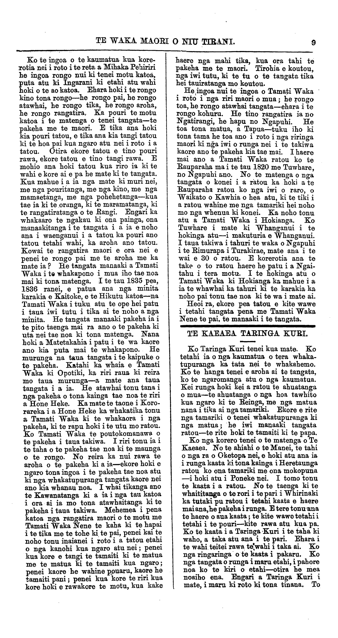 TE WAKA MAORI O NIU TIRANI. Ko te ingoa o te kaumatua kua kore- rotia nei i roto i te reta a Minaka Pehiriri he ingoa rongo nui ki tenei motu katoa, puta atu ki Ingarani ki etahi atu wahi hoki o te ao katoa. Ehara hoki i te rongo kino tona rongo—he rongo pai, he rongo atawhai, he rongo tika, he rongo aroha, he rongo rangatira, Ka pouri te motu katoa i te matenga o tenei tangata—te pakeha me te maori. E tika ana hoki kia pouri tatou, e tika ana kia tangi tatou ki te hoa pai kua ngaro atu nei i roto i a tatou. Otira ekore tatou e tino pouri rawa, ekore tatou e tino tangi rawa. E mohio ana hoki tatou kua riro ia ki te wahi e kore ai e pa he mate ki te tangata. Kua mahue i a ia nga mate ki muri nei, me nga pouritanga, me nga kino, me nga mamaetanga, me nga pohehetanga—kua tae ia ki te oranga, ki te maramatanga, ki te rangatiratanga o te Rangi. Engari ka whakaaro te ngakau ki ona painga, ona manaakitanga i te tangata i a ia e noho ana i waenganui i a tatou ka pouri ano tatou tetahi wahi, ka aroha ano tatou. Kowai te rangatira maori e ora nei e penei te rongo pai me te aroha me ka mate ia? He tangata manaaki a Tamati Waka i to whakapono i mua iho tae noa mai ki tona matenga. I te tau 1835 pea, 1836 ranei, e patua ana nga minita karakia e Kaitoke, e te Hikutu katoa—na Tamati Waka i tuku atu te ope hei patu i taua iwi tutu i tika ai te noho a nga minita. He tangata manaaki pakeha ia i te pito taenga mai ra ano o te pakeha ki uta nei tae noa ki tona matenga. Nana hoki a Matetakahia i patu i te wa kaore ano kia puta mai te whakapono. He murunga na taua tangata i te kaipuke o te pakeha. Katahi ka whaia e Tamati Waka ki Opotiki, ka riri raua ki reira mo taua murunga—a mate ana taua tangata i a ia. He atawhai tonu tana i nga pakeha o tona kainga tae noa te riri a Hone Heke. Ka mate te taone i Koro- rareka i a Hone Heke ka whakatika tonu a Tamati Waka ki te whakaora i nga pakeha, ki te rapu hoki i te utu mo ratou. Ko Tamati Waka te poutokomanawa o te pakeha i taua takiwa. I TITI tonu ia i te taha o te pakeha tae noa ki te maunga o te rongo. No reira ka nui rawa te aroha o te pakeha ki a ia—ekore hoki e ngaro tona ingoa i te pakeha tae noa atu ki nga whakatupuranga tangata kaore nei ano kia whanau noa. I whai tikanga ano te Kawanatanga ki a ia i nga tau katoa i ora ai ia mo tona atawhaitanga ki te pakeha i taua takiwa. Mehemea i pena katoa nga rangatira maori o te motu me Tamati Waka Nene te kaha ki te hapai i te tika me te tohe ki te pai, penei kai te noho tonu inaianei i roto i a tatou etahi o nga kanohi kua ngaro atu nei; penei kua kore e tangi te tamaiti ki te matua me te matua ki te tamaiti kua ngaro; penei kaore he wahine pouaru, kaore he tamaiti pani; penei kua kore te riri kua kore hoki e rawakore te motu, kua kake haere nga mahi tika, kua ora tahi te pakeha me te maori. Tirohia e koutou, nga iwi tutu, ki te tu o te tangata tika hei tauiratanga mo koutou. He, ingoa nui te ingoa o Tamati Waka i Toto i nga riri maori o mua; he rongo toa, he rongo atawhai tangata—ehara i te rongo kohuru. He tino rangatira ia no Ngatirangi, he hapu no Ngapuhi. He toa tona matua, a Tapua—tuku iho ki tona tama he toa ano i Toto i nga riringa maori ki nga iwi o runga nei i te takiwa kaore ano te pakeha kia tae mai. I haere mai ano a Tamati Waka Tatou ko te Rauparaha ma i te tau 1820 me Tuwhare, no Ngapuhi ano. No te matenga o nga tangata o konei i a ratou ka hoki a te Rauparaha Tatou ko nga iwi o raro, o Waikato o Kawhia o hea atu, ki te tiki i a ratou wahine me nga tamariki hei noho mo nga whenua ki konei. Ka noho tonu atu a Tamati Waka i Hokianga. Ko Tuwhare i mate ki Whanganui i te hokinga atu—i makuturia e Whanganui. I taua takiwa i tahuri te waka o Ngapuhi i te Rimurapa i Turakirae,, mate ana i te wai e 30 o Tatou. E korerotia ana te take o to Tatou haere he patu i a Ngai- tahu i tera motu. I te hokinga atu o Tamati Waka ki Hokianga ka mahue i a ia te whawhai ka tahuri ki te karakia ka noho pai tonu tae noa ki te wa i mate ai. Heoi ra, ekore pea tatou e kite wawe i tetahi tangata pena me Tamati Waka Nene te pai, te manaaki i te tangata. TE KAEAEA TARINGA KURI. Ko Taringa Kuri tenei kua mate. Ko tetahi ia o nga kaumatua o tera whaka- tupuranga ka tata nei te whakahemo. Ko te hanga tenei e aroha ai te tangata, ko te ngaromanga atu o nga kaumatua. Kei runga hoki kei a Tatou he ahuatanga o mua—te ahuatanga o nga hoa tawhito kua ngaro ki te Reinga, me nga matua nana i tika ai nga tamariki. Ekore e rite nga tamariki o tenei whakatupuranga ki nga matua; he iwi manaaki tangata ratou.—te rite hoki te tamaiti ki te papa. Ko nga korero tenei o te matenga o Te Kaeaea. No te ahiahi o te Manei, te tahi o nga ra o Oketopa nei, e hoki atu ana ia i runga kaata ki tona kainga i Heretaunga Tatou ko ona tamariki me ona mokopuna —i hoki atu i Poneke nei. I tomo tonu te kaata i a ratou. No te taenga ki te whaititanga o te rori i te pari i Whirinaki ka tutaki pu ratou i tetahi kaata e haere mai ana, he pakeha i runga. E tere tonu ana te haere o aua kaata; te kite wawe tetahi i tetahi i te pouri—kite rawa atu kua pa. Ko te kaata i a Taringa Kuri i te taha ki waho, a taka atu ana i te pari. Ehara i te wahi teitei rawa te wahi i taka ai. Ko nga ringaringa o te kaata i pakaru. Ko nga tangata o runga i maru etahi, i pahore noa ko te kiri o etahi—otira he mea noaiho ena. Engari a Taringa Kuri i mate, i maru ki roto ki tona tinana. To