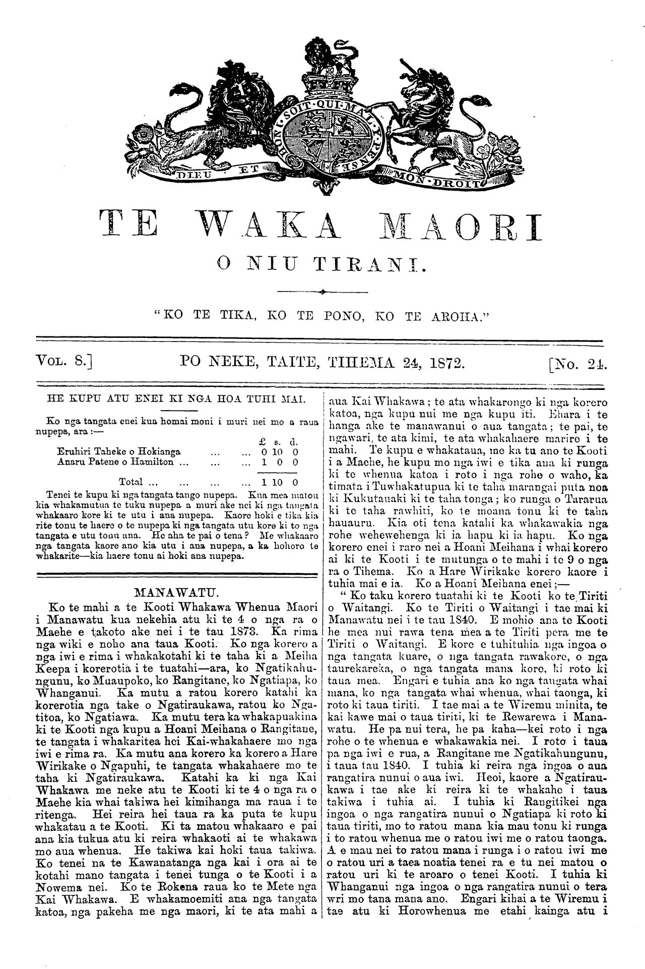 Te Waka Maori o Niu Tirani 1871-1877: Volume 8, Number 24. 24 December 1872 |