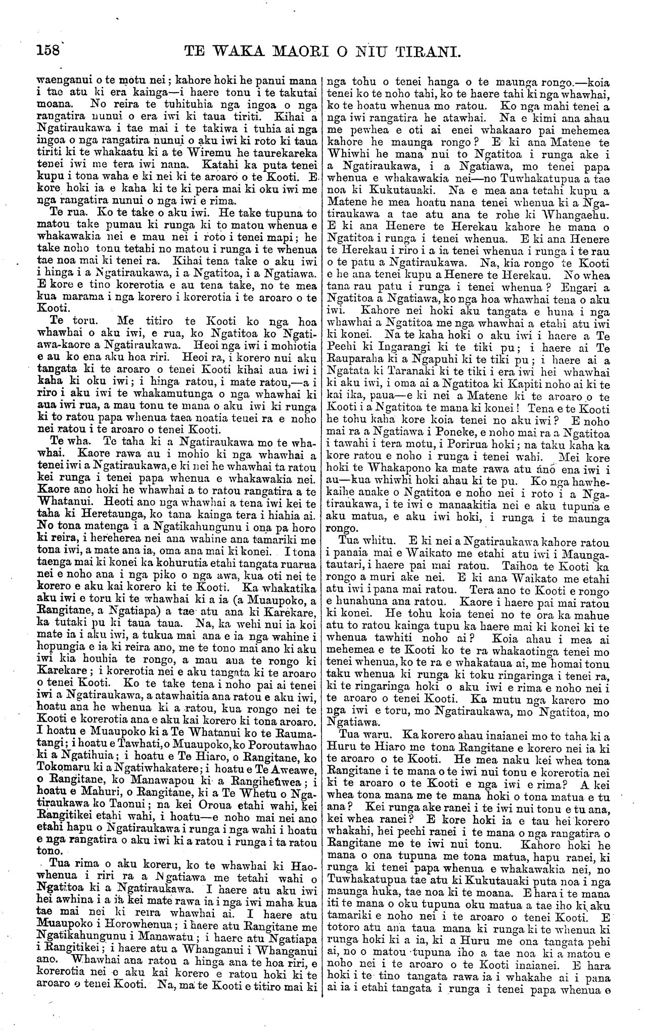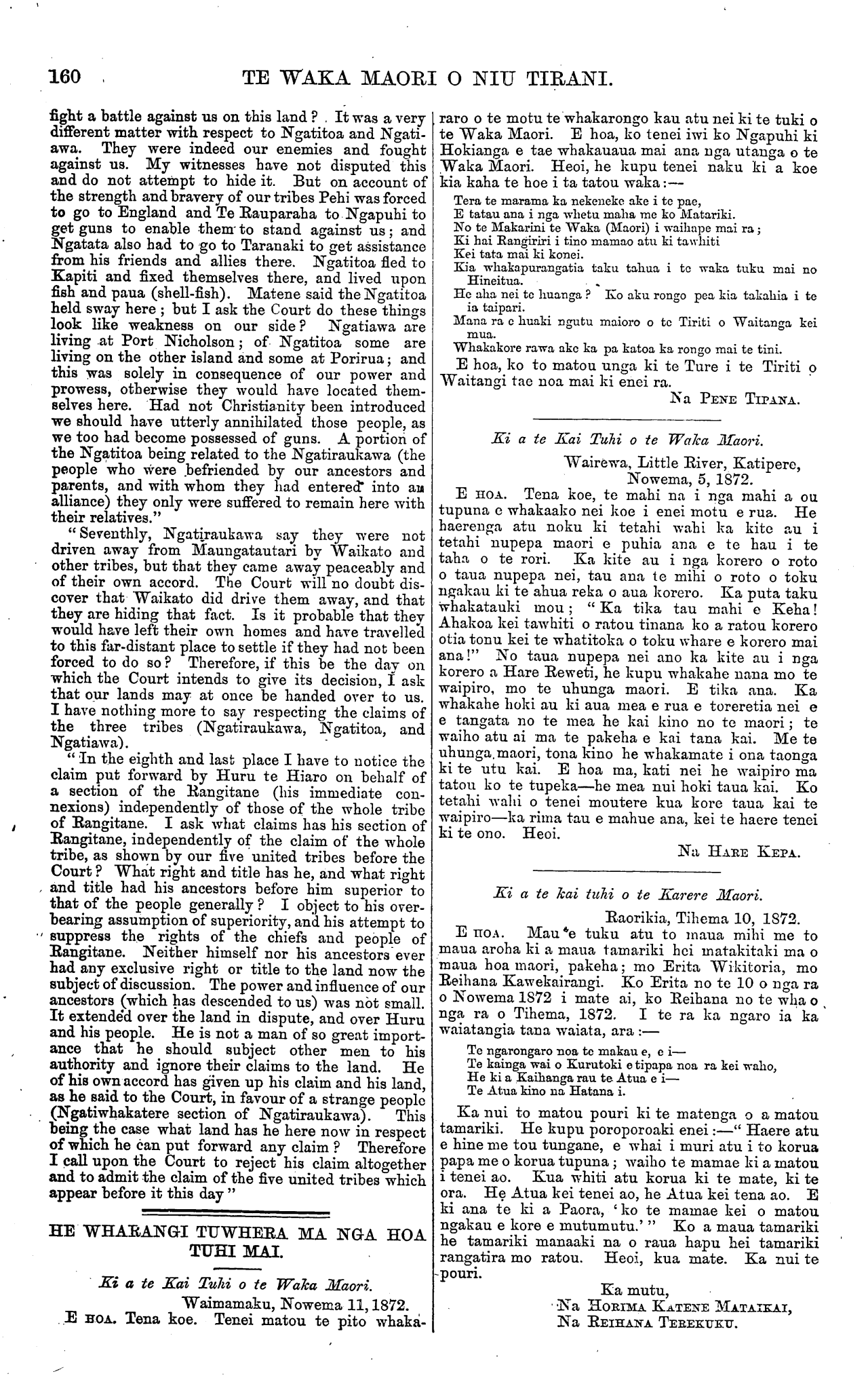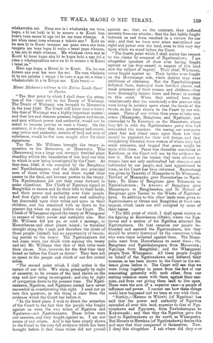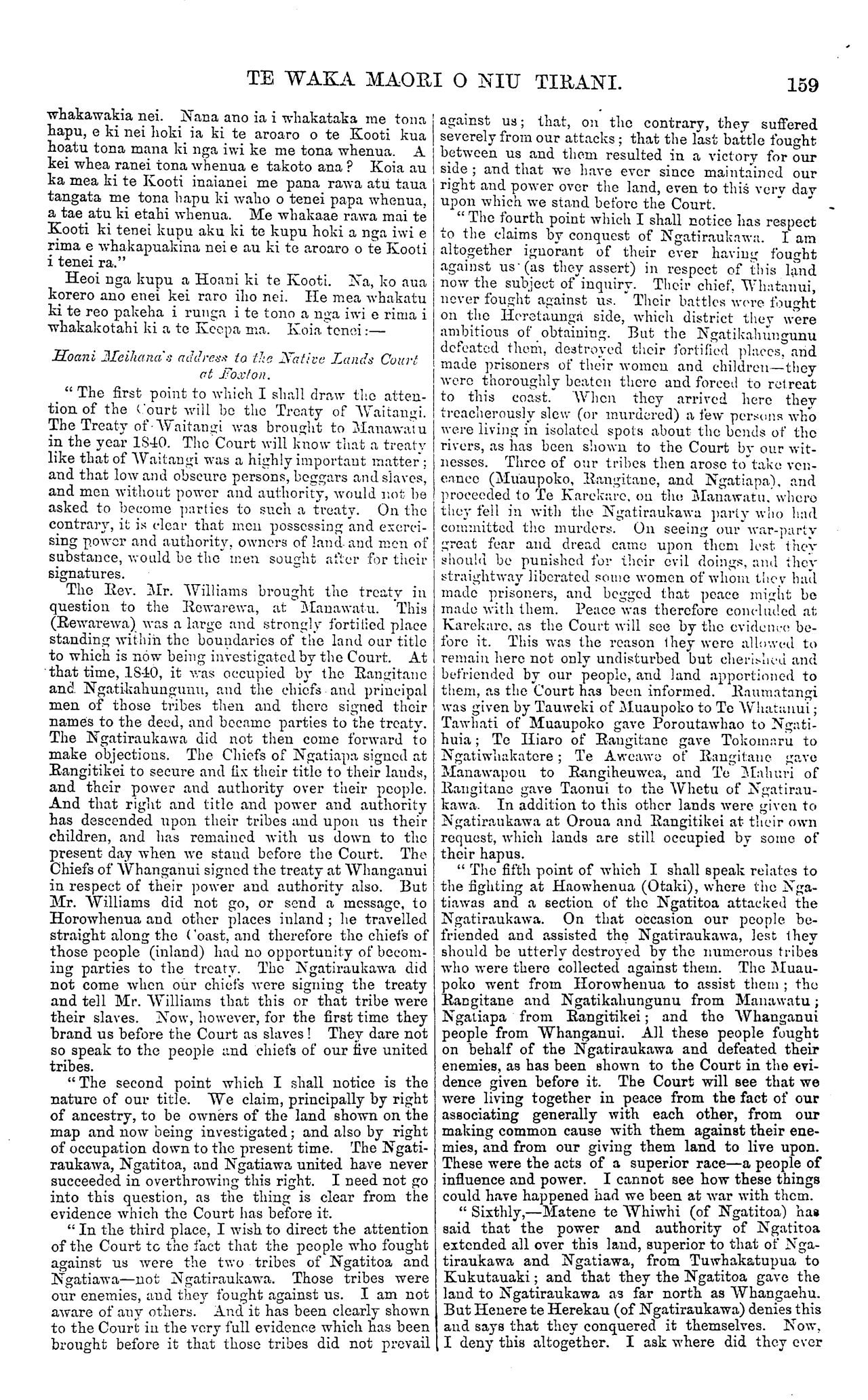 158 TE WAKA MAORI O NIU TIRANI. waenganui o te motu nei; kahore hoki he panui mana i tae atu ki era kainga—i haere tonu i te takutai moana. No reira te tuhituhia nga ingoa o nga rangatira nunui o era iwi ki taua tiriti. Kihai a Ngatiraukawa i tae mai i te takiwa i tuhia ai nga ingoa o nga rangatira nunui o aku iwi ki roto ki taua tiriti ki te whakaatu ki a te Wiremu he taurekareka tenei iwi me tera iwi nana. Katahi ka puta tenei kupu i tona waha e ki nei ki te aroaro o te Kooti. E kore hoki ia e kaha ki te ki pera mai ki oku iwi me nga rangatira nunui o nga iwi e rima. Te rua. Ko te take o aku iwi. He take tupuna to matou take pumau ki runga ki to matou whenua e whakawakia nei e mau nei i roto i tenei mapi; he take noho tonu, tetahi no matou i runga i te whenua tae noa mai ki tenei ra. Kihai tena take o aku iwi i hinga i a Ngatiraukawa, i a Ngatitoa, i a Ngatiawa. E kore e tino korerotia e au tena take, no te mea kua marama i nga korero i korerotia i te aroaro o te Kooti. Te toru. Me titiro te Kooti ko nga hoa whawhai o aku iwi, e rua, ko Ngatitoa ko Ngati- awa-kaore a Ngatiraukawa. Heoi nga iwi i mohiotia e au ko ena aku hoa riri. Heoi ra, i korero nui aku tangata ki te aroaro o tenei Kooti kihai aua iwi i kaha ki oku iwi; i hinga ratou, i mate ratou,—a i riro i aku iwi te whakamutunga o nga whawhai ki aua iwi rua, a mau tonu te mana o aku iwi ki runga ki to ratou papa whenua taea noatia tenei ra e noho nei ratou i te aroaro o tenei Kooti. Te wha. Te taha ki a Ngatiraukawa mo te wha- whai. Kaore rawa au i mohio ki nga whawhai a tenei iwi a Ngatiraukawa, e ki :nei he whawhai ta ratou kei runga i tenei papa whenua e whakawakia nei. Kaore ano hoki he whawhai a to ratou rangatira a te Whatanui. Heoti ano nga whawhai a tena iwi kei te taha ki Heretaunga, ko tana kainga tera i hiahia ai. No tona matenga i a Ngatikahungunu i ona pa horo ki reira, i hereherea nei ana wahine ana tamariki me tona iwi, a mate ana ia, oma ana mai ki konei. I tona taenga mai ki konei ka kohurutia etahi tangata ruarua nei e noho ana i nga piko o nga awa, kua oti nei te korero e aku kai korero ki te Kooti. Ka whakatika aku iwi e toru ki te whawhai ki a ia (a Muaupoko, a Rangitane, a Ngatiapa) a tae atu ana ki Karekare, ta tutaki pu ki taua taua. Na, ka wehi nui ia koi mate ia i aku iwi, a tukua mai ana e ia nga wahine i hopungia e ia 1d reira ano, me te tono mai ano ki aku iwi kia houhia te rongo, a mau aua te rongo ki Karekare ; i korerotia nei e aku tangata ki te aroaro o tenei Kooti. Ko te take tena i noho pai ai tenei iwi a Ngatiraukawa, a atawhaitia ana ratou e aku iwi, hoatu ana he whenua ki a ratou, kua rongo nei te Kooti e korerotia ana e aku kai korero ki tona aroaro. I hoatu e Muaupoko ki a Te Whatanui ko te Rauma- tangi; i hoatu e Tawhati, o Muaupoko, ko Poroutawhao ki a Ngatihuia; i hoatu e Te Hiaro, o Rangitane, ko Tokomaru ki a Ngatiwhakatere; i hoatu e Te Aweawe, o Rangitane, ko Manawapou ki a Rangiheuwea; i hoatu e Mahuri, o Rangitane, ki a Te Whetu o Nga- tiraukawa ko Taonui; na kei Oroua etahi wahi, kei Rangitikei etahi wahi, i hoatu—e noho mai nei ano etahi hapu o Ngatiraukawa i runga i nga wahi i hoatu e nga rangatira o aku iwi ki a ratou i runga i ta ratou tono. Tua rima o aku korero, ko te whawhai ki Hao- whenua i riri ra a Ngatiawa me tetahi wahi o Ngatitoa ki a Ngatiraukawa. I haere atu aku iwi hei awhina i a ia kei mate rawa ia i nga iwi maha kua tae mai nei ki reira whawhai ai. I haere atu Muaupoko i Horowhenua; i haere atu Rangitane me Ngatikahungunu i Manawatu ; i haere atu Ngatiapa i Rangitikei; i haere atu a Whanganui i Whanganui ano. Whawhai ana ratou a hinga ana te hoa riri, e korerotia nei e aku kai korero e ratou hoki ki te aroaro o tenei Kooti. Na, mai te Kooti e titiro mai ki nga tohu o tenei hanga o te maunga rongo.—koia tenei ko te noho tahi, ko te haere tahi ki nga whawhai, ko te hoatu whenua mo ratou. Ko nga mahi tenei a nga iwi rangatira he atawhai. Na e kimi ana ahau me pewhea e oti ai enei whakaaro pai mehemea kahore he maunga rongo ? E ki ana Matene te Whiwhi he mana nui to Ngatitoa i runga ake i a Ngatiraukawa, i a Ngatiawa, mo tenei papa whenua e whakawakia nei—no Tuwhakatupua a tae noa ki Kukutauaki. Na e mea ana tetahi kupu a Matene he mea hoatu nana tenei whenua ki a Nga- tiraukawa a tae atu ana te rohe ki Whangaehu. E ki ana Henere te Herekau kahore he mana o Ngatitoa i runga i tenei whenua. E ki ana Henere te Herekau i riro i a ia tenei whenua i runga i te rau o te patu a Ngatiraukawa. Na, kia rongo te Kooti e he ana tenei kupu a Henere te Herekau. No whea tana rau patu i runga i tenei whenua ? Engari a Ngatitoa a Ngatiawa, ko nga hoa whawhai tena o aku iwi. Kahore nei hoki aku tangata e huna i nga whawhai a Ngatitoa me nga whawhai a etahi atu iwi ki konei. Na te kaha hoki o aku iwi i haere a Te Peehi ki Ingarangi ki te tiki pu; i haere ai Te Rauparaha ki a Ngapuhi ki te tiki pu ; i haere ai a Ngatata ki Taranaki ki te tiki i era iwi hei whawhai ki aku iwi, i oma ai a Ngatitoa ki Kapiti noho ai ki te kai ika, paua—e ki nei a Matene ki te aroaro o te Kooti i a Ngatitoa te mana ki konei ! Tena e te Kooti he tohu kaha kore koia tenei no aku iwi ? E noho mai ra a Ngatiawa i Poneke, e noho mai ra a Ngatitoa i tawahi i tera motu, i Porirua hoki; na taku kaha ka kore ratou e noho i runga i tenei wahi. Mei kore hoki te Whakapono ka mate rawa atu ano ena iwi i au—kua whiwhi hoki ahau ki te pu. Ko nga hawhe- kaihe anake o Ngatitoa e noho nei i roto i a Nga- tiraukawa, i te iwi e manaakitia nei e aku tupuria e aku matua, e aku iwi hoki, i runga i te maunga rongo. Tua, whitu. E ki nei a Ngatiraukawa kahore ratou, i panaia mai e Waikato me etahi atu iwi i Maunga- tautari, i haere pai mai ratou. Taihoa te Kooti ka rongo a muri ake nei. E ki ana Waikato me etahi atu iwi i pana mai ratou. Tera ano te Kooti e rongo e hunahuna ana ratou. Kaore i haere pai mai ratou ki konei. He tohu koia tenei no te ora ka mahue atu to ratou kainga tupu ka haere mai ki konei ki te whenua 