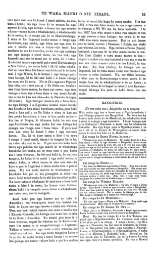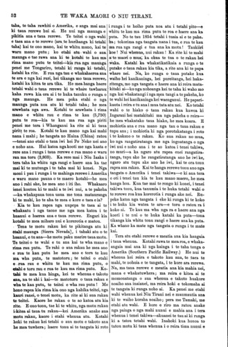 TE WAKA MAORI O NIU TIRANI. KO TE TIKA, KO TE PONO, KO TE AROHA.' VOL. 8.] PO NEKE, WENEREI, MAEHE 6, 1872. [No. 7. HE MONI ENEI KUA RIRO MAI HEI UTU MO TE NUPEPA. Na Kerei Te Panau, o Manawatu ... . 10 hereni. Na Hoani Amorangi, o Manawatu ... 10 hereni. Na Hoani Meihana, o Manawatu ... 10 hereni. Na Huru Te Hiaro, o Manawatu ... 10 hereni. Ka tika hoki te utu mo te Kai-mahi." I KI matou i tetahi nupepa i mua tata atu nei kia korerotia e matou nga korero o nga rerewe o Amerika me etahi atu whenua. Koia tenei ka korerotia nei i tenei nupepa. He maha rapea nga rerewe kei Amerika i tenei takiwa. I mua, i te wa e kore ana taua hanga te rerewe ki reira, kaore i tino whai rawa taua whenua—kaore i rite ki to tenei takiwa. Na te rerewe hoki i whakatuwhera nga whenua i puta ai nga whakaaro me nga mahi a te tangata i reira, i rangatira ai hoki tera kainga. No te tau 1830 i timata ai te hanga rerewe i taua whenua; tae rawa ki te tau 1847 kua mua mano e ono rau (5, 600) maero te roa o nga rerewe kua oti me ka huia; tae ki te tau 1857 kua oti ano kotahi te kau ma waru mano (18, 000) maero—hui ki era kua oti ke atu ra, ka rua ai te kau ma toru mano e ono rau (23, 600) maero te roa o nga rerewe kua oti i taua kainga. 1 tenei takiwa kua tae ki te 45, 000 maero. Engari kotahi marire te rerewe roa rawa o taua whenua; he mea mahi mai i "Niu Iaaka (New York), he taone nui kei te takutai i tera taha, to taha ki Iuropi; he mea mahi atu hoki i Tana Paraana- hiko (San Francisco), he taone nui ano kei te takutai i tenei taha, te taha ki tenei moana, tutaki rawa te mahi ki waenganui o te whenua— te roa o taua rerewe e toru mano, e toru rau e toru te kau ma waru (3, 338) maero. Ka haere mai nga taonga me nga meera o Ingarani ka u ki Niu Iaaka i tera taha, katahi ka utaina ki te rerewe ka haere tonu mai ki Tana Paraanahiko i tenei taha; kei reira ka utaina ki runga ki nga tima nui o Amerika e rerere mai nei ki Po Neke, ki Akarana, ka kawea atu hoki ki etahi atu motu kei tenei pito o te ao. Te utu mo te tana taonga me ka mauria ki runga ki taua rerewe, i tetahi pito puta noa ki tetahi pito, kai te kotahi te kau ma whitu (£17) pauna mo nga mea taimaha—ara, nga rino, nga mata, nga mea pohatu, me nga mea pera; mo nga mea mama, me nga mea e pakaru e kino ki te kore e ata tiakina, kai te toru te kau ma rua (£32) pauna mo te tana—ara nga mea hiraka, nga mea karaihe, nga tingara pu, me nga mea pera. I timataria te mahinga atu o taua rerewe i Hakeremeto (Sacramento), he taone i tenei taha, te taha ki a tatou nei, i te 8 o nga ra o Hanuere 1863 (Central Pacific); i timataria te mahinga mai i tera taha, te taha ki Iuropi, i roto i nga ra o Tihema 1863 (Union Pacific)—a no te 15 o nga ra o Mei 1869 I; a oti, ka tutaki mai ki tenei ki tetahi taone nui ki waenganui pu o te whenua, ko Okitene te ingoa (Ogden). Tera etahi rerewe no nga taone o tera