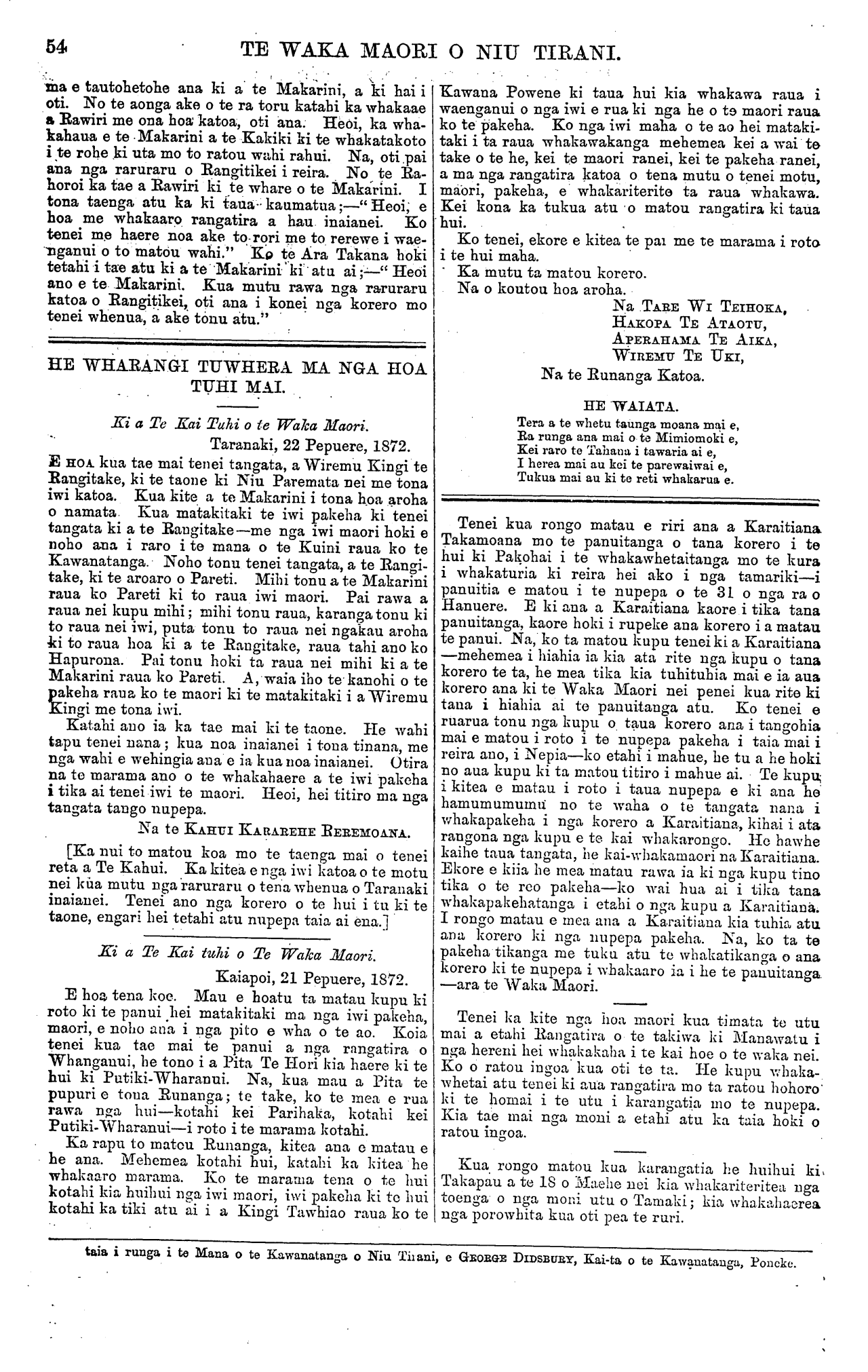 54 TE WAKA MAORI O NIU TIRANI. ma e tautohetohe ana ki a te Makarini, a ki hai i oti. No te aonga ake o te ra toru katahi ka whakaae a Rawiri me ona hoa katoa, oti ana. Heoi, ka wha- kahaua e te Makarini a te Kakiki ki te whakatakoto i te rohe ki uta mo to ratou wahi rahui. Na, oti pai ana nga raruraru o Rangitikei i reira. No te Ra- horoi ka tae a Rawiri ki te whare o te Makarini. I tona taenga atu ka ki taua- kaumatua;—" Heoi, e hoa me whakaaro rangatira a hau inaianei. Ko tenei me haere noa ake to rori me to rerewe i wae- nganui o to matou wahi." Ke te Ara Takana hoki tetahi i tae atu ki a te Makarini ki atu ai;—" Heoi ano e te Makarini. Kua mutu rawa nga raruraru katoa o Rangitikei, oti ana i konei nga korero mo tenei whenua, a ake tonu atu." HE WHARANGI TUWHERA MA NGA HOA TUHI MAI. Ei a Te Eai Tuhi o te Waka Maori. Taranaki, 22 Pepuere, 1872. E HOA kua tae mai tenei tangata, a Wiremu Kingi te Rangitake, ki te taone ki Niu Paremata nei me tona iwi katoa. Kua kite a to Makarini i tona hoa aroha o namata Kua matakitaki te iwi pakeha ki tenei tangata ki a te Rangitake—me nga iwi maori hoki e noho ana i raro i te mana o te Kuini raua ko te Kawanatanga. Noho tonu tenei tangata, a te Rangi- take, ki te aroaro o Pareti. Mihi tonu a te Makarini raua ko Pareti ki to raua iwi maori Pai rawa a raua nei kupu mihi; mihi tonu raua, karanga tonu ki to raua nei iwi, puta tonu to raua nei ngakau aroha ki to raua hoa ki a te Rangitake, raua tahi ano ko Hapurona. Pai tonu hoki ta raua nei mihi ki a te Makarini raua ko Pareti. A, waia iho te kanohi o te pakeha raua ko te maori ki te matakitaki i a Wiremu Kingi me tona iwi. Katahi ano ia ka tae mai ki te taone. He wahi tapu tenei nana; kua noa inaianei i toua tinana, me nga wahi e wehingia aua e ia kua noa inaianei. Otira na to marama ano o te whakahaere a te iwi pakeha i tika ai tenei iwi te maori. Heoi, hei titiro ma nga tangata tango nupepa. Na te KAHUI KARAREHE REREMOANA. [Ka nui to matou koa mo te taenga mai o tenei reta a Te Kahui. Ka kitea e nga iwi katoa o te motu nei kua mutu nga raruraru o tena whenua o Taranaki inaianei. Tenei ano nga korero o te hui i tu ki te taone, engari hei tetahi atu nupepa taia ai ena.] Ei a Te Eai tuhi o Te Waka Maori. Kaiapoi, 21 Pepuere, 1872. E hoa tena koe. Mau e hoatu ta matau kupu ki roto ki te panui hei matakitaki ma nga iwi pakeha, maori, e noho ana i nga pito e wha o te ao. Koia, tenei kua tae mai te panui a nga rangatira o Whanganui, he tono i a Pita Te Hori kia haere ki te hui ki Putiki-Wharanui. Na, kua mau a Pita te pupuri e toua Runanga; to take, ko te mea e rua rawa nga hui—kotahi kei Parihaka, kotahi kei Putiki-Wharanui—i roto i te marama kotahi. Ka rapu to matou Runanga, kitea ana o matau e he ana. Mehemea kotahi hui, katahi ka kitea he whakaaro marama. Ko te marama tena o to hui kotahi kia huihui nga iwi maori, iwi pakeha ki to hui kotahi ka tiki atu ai i a Kingi Tawhiao raua ko te Kawana Powene ki taua hui kia whakawa raua i waenganui o nga iwi e rua ki nga he o te maori raua ko te pakeha. Ko nga iwi maha o te ao hei mataki- taki i ta raua whakawakanga mehemea kei a wai te take o te he, kei te maori ranei, kei te pakeha ranei, a ma nga rangatira katoa o tena mutu o tenei motu, maori, pakeha, e whakariterite ta raua whakawa. Kei kona ka tukua atu o matou rangatira ki taua hui. Ko tenei, ekore e kitea te pai me te marama i Toto i te hui maha. Ka mutu ta matou korero. Na o koutou hoa aroha. Na TARE WI TEIHOKA, HAKOPA. TE ATAOTU, APERAHAMA TE AIKA, WIREMU TE UKI, Na te Runanga Katoa. HE WAIATA. Tera a te wheku taunga moana mai e, Ea runga ana mai o te Mimiomoki e, Kei raro te Tahana i tawaria ai e, I herea mai au kei te pare waiwai e, Tukua mai au ki te reti whakama e. Tenei kua rongo matau e TITI ana a Karaitiana. Takamoana mo te panuitanga o tana korero i te hui ki Pakohai i te whakawhetaitanga mo te kura i whakaturia ki reira hei ako i nga tamariki—i panuitia e matou i te nupepa o te 31 o nga ra o Hanuere. E ki ana a Karaitiana kaore i tika tana panuitanga, kaore hoki i rupeke ana korero i a matau te panui. Na, ko ta matou kupu tenei ki a Karaitiana —mehemea i hiahia ia kia ata rite nga kupu o tana korero te ta, he mea tika kia tuhituhia mai e ia aua korero ana ki te Waka Maori nei penei kua rite ki taua i hiahia ai te panuitanga atu. Ko tenei e ruarua tonu nga kupu o taua korero ana i tangohia mai e matou i roto i te nupepa pakeha i taia mai i reira ano, i Nepia—ko etahi i mahue, he tu a he hoki no aua kupu ki ta matou titiro i mahue ai. Te kupu; i kitea e matau i roto i taua nupepa e ki ana he hamumumumu no te waha o te tangata nana i whakapakeha i nga korero a Karaitiana, kihai i ata rangona nga kupu e te kai whakarongo. He hawhe kaihe taua tangata, he kai-whakamaori na Karaitiana. Ekore e kiia he mea matau rawa ia ki nga kupu tino tika o te reo pakeha —ko wai hua ai i tika tana whakapakehatanga i etahi o nga kupu a Karaitiana. I rongo matau e mea ana a Karaitiana kia tuhia atu ana korero ki nga nupepa pakeha. Na, ko ta te pakeha tikanga me tuku atu to whakatikanga o ana korero ki te nupepa i whakaaro Ia i he te panuitanga —ara te Waka Maori. Tenei ka kite nga hoa maori kua timata te utu mai a etahi Rangatira o te takiwa ki Manawatu i nga hereni hei whakakaha i te kai hoe o te waka nei. Ko o ratou ingoa kua oti te ta. He kupu v, whaka- whetai atu tenei ki aua rangatira mo ta ratou hohoro ki te homai i te utu i karangatia mo te nupepa. Kia tae mai nga moni a etahi atu ka taia hoki o Kua rongo matou kua karangatia he huihui ki Takapau a te 18 o Maehe noi kia whakariteritea nga toenga o nga moni utu o Tamaki; kia whakahaerea nga porowhita kua oti pea te ruri. taia i runga i te Mana o te Kawanatanga o Niu Tirani, e GEORGE DIDSBURY, Kai-ta o te Kawanatanga, Poneke.